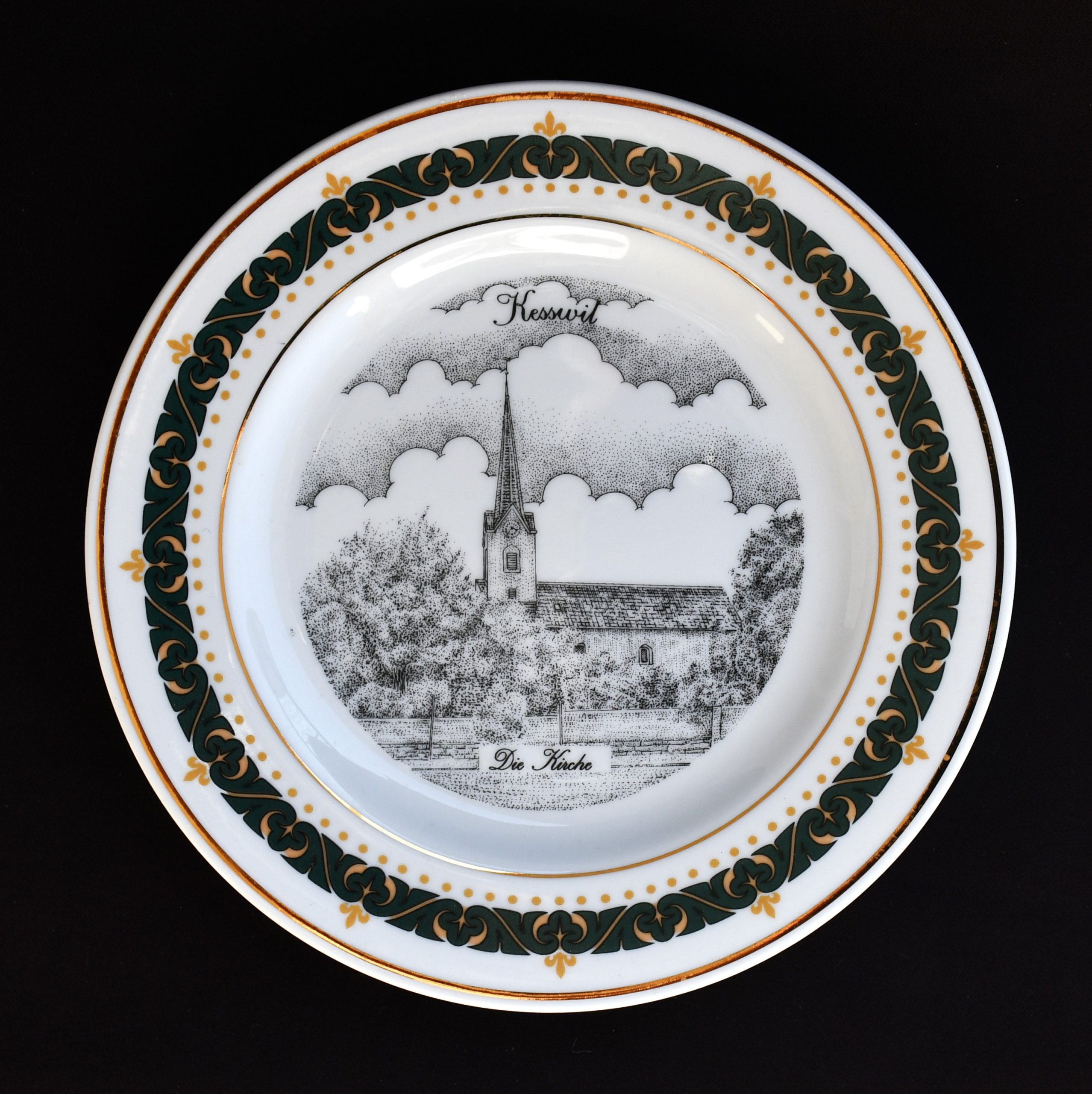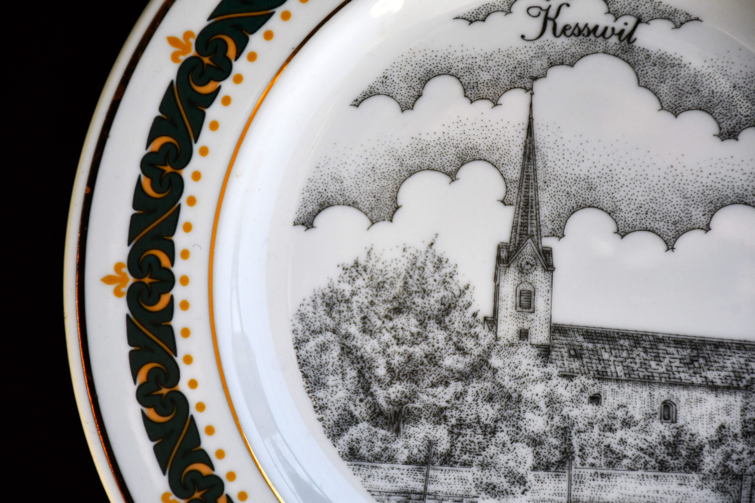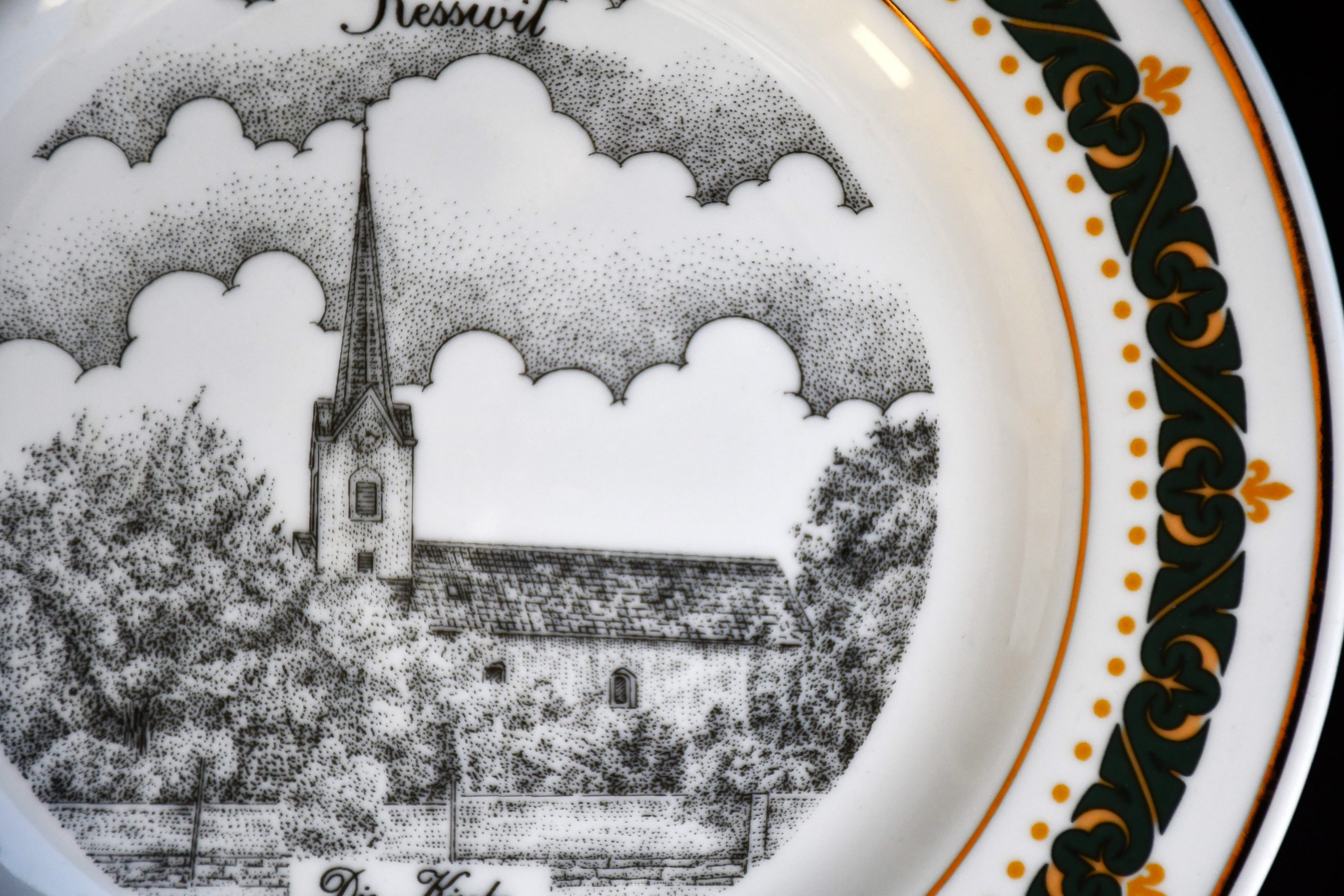 Впечатляваща графична декорация с изображение на църквата в Kesswil. (Kesswil е община в кантона Thurgau.) Декор в три цвята и злато.