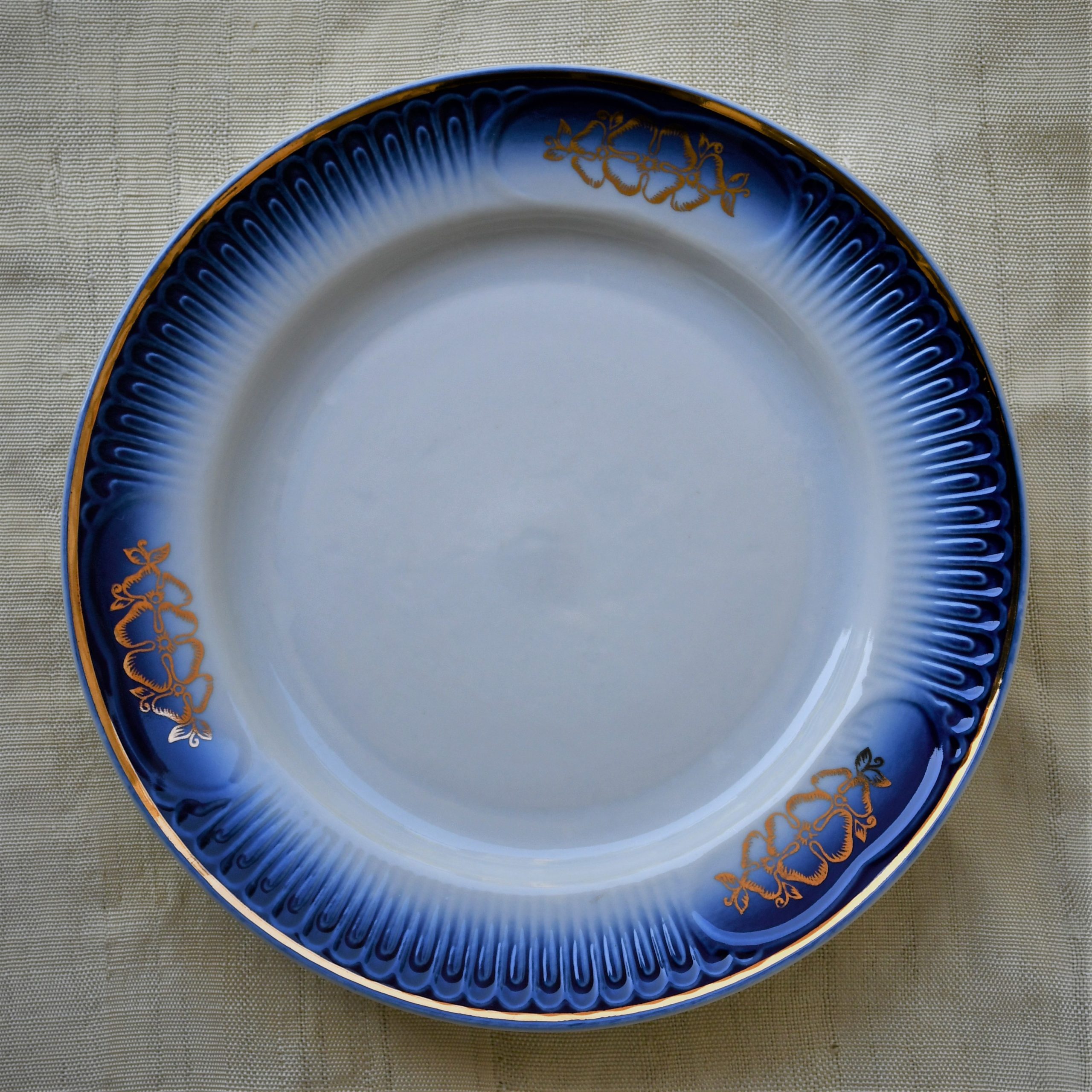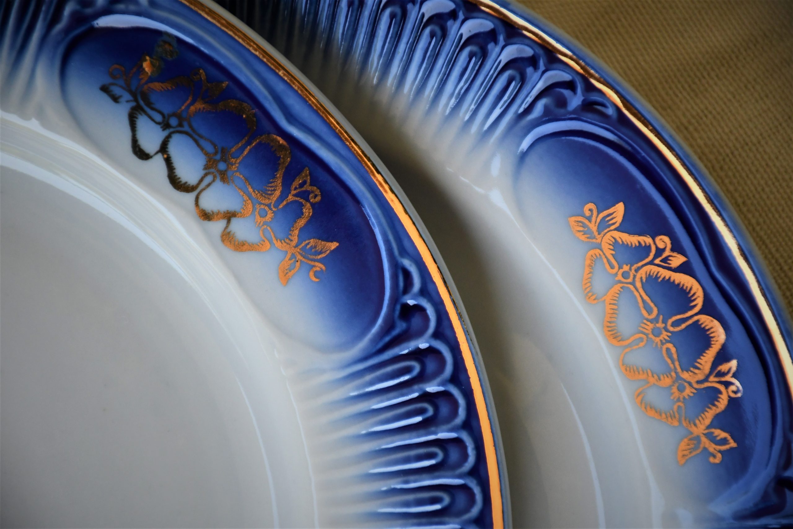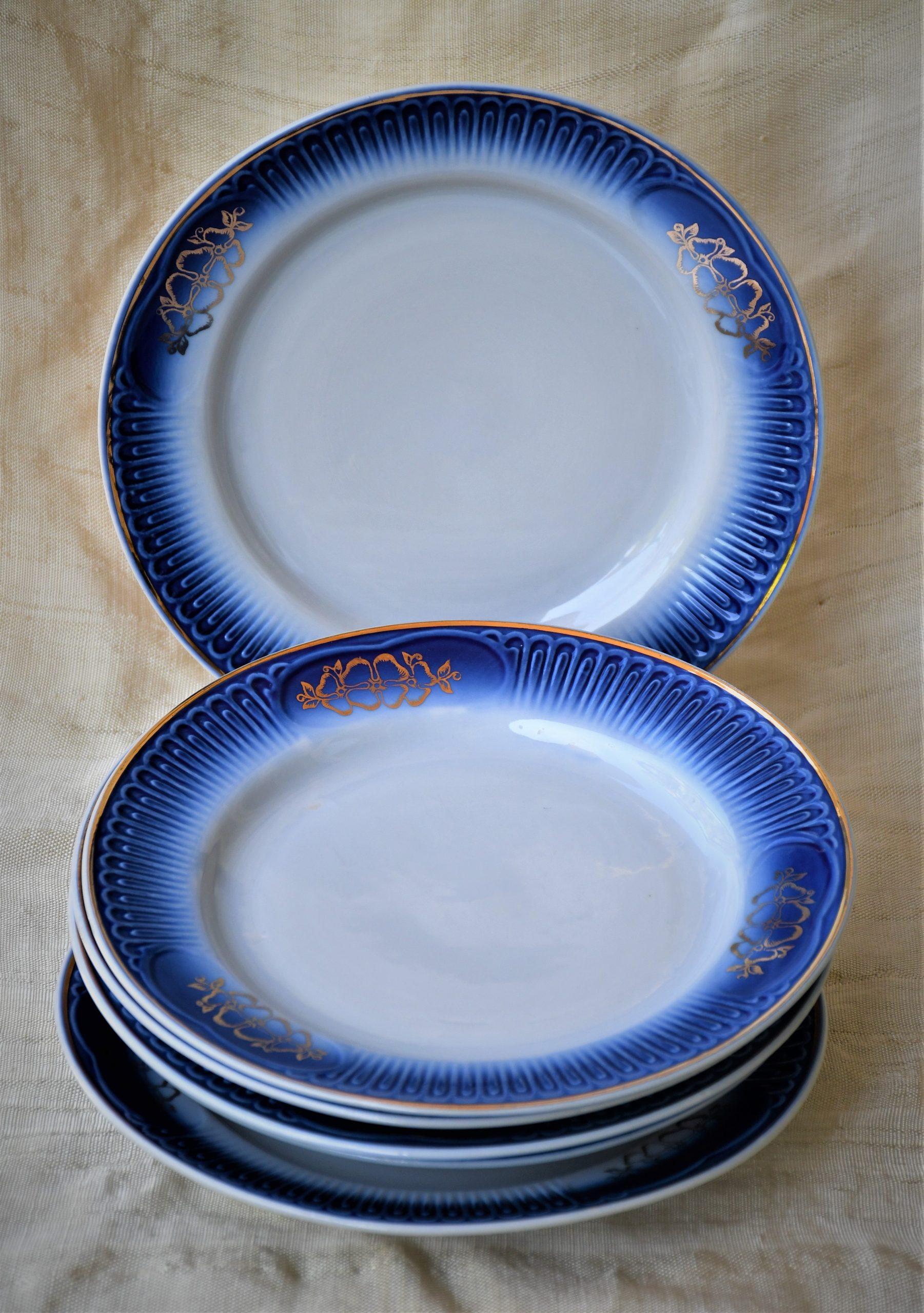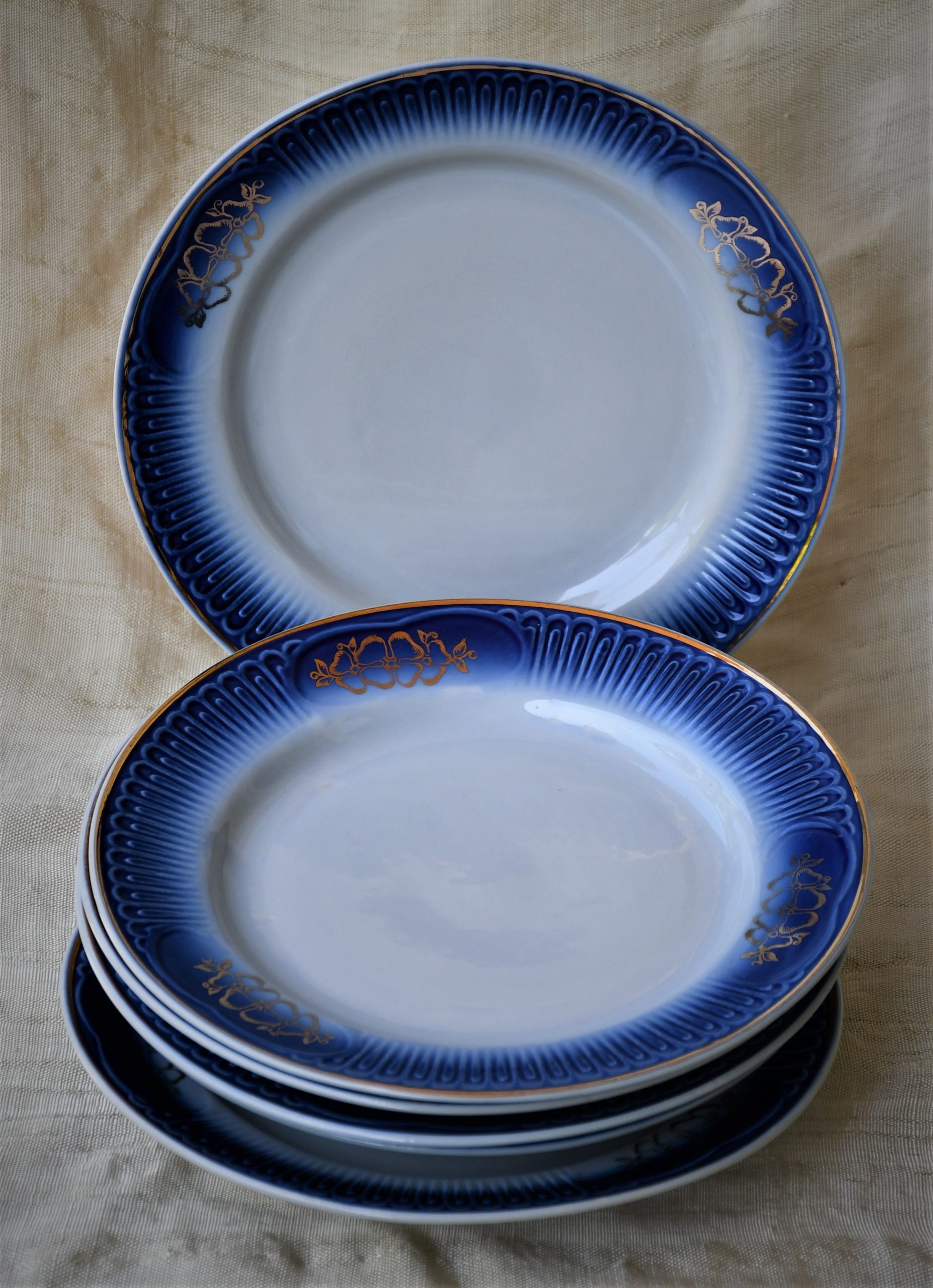 Бели, с кобалтова яка околовръст, с флорални елементи в златно. Много добре запазени, с незначителни следи от времето. Малък чип от долната страна на едната чиния -незначителен. Пълна комплектация от 6 чинии. Диаметър 20 cm. Тегло 280 g./бр.