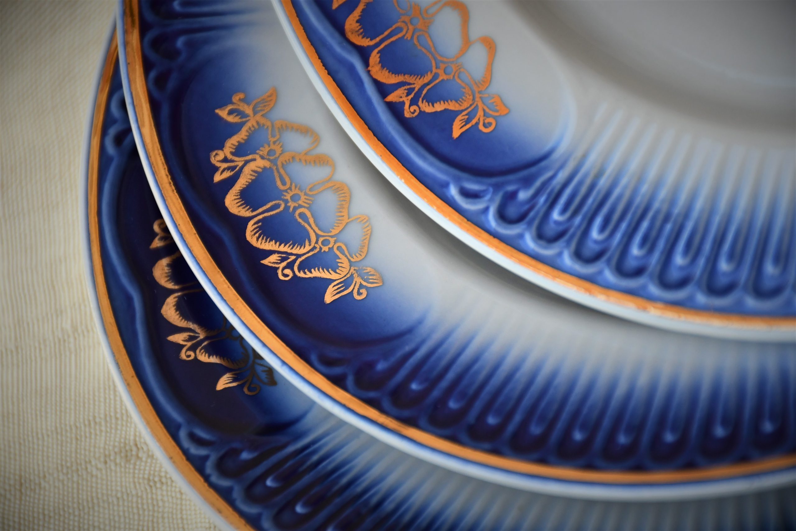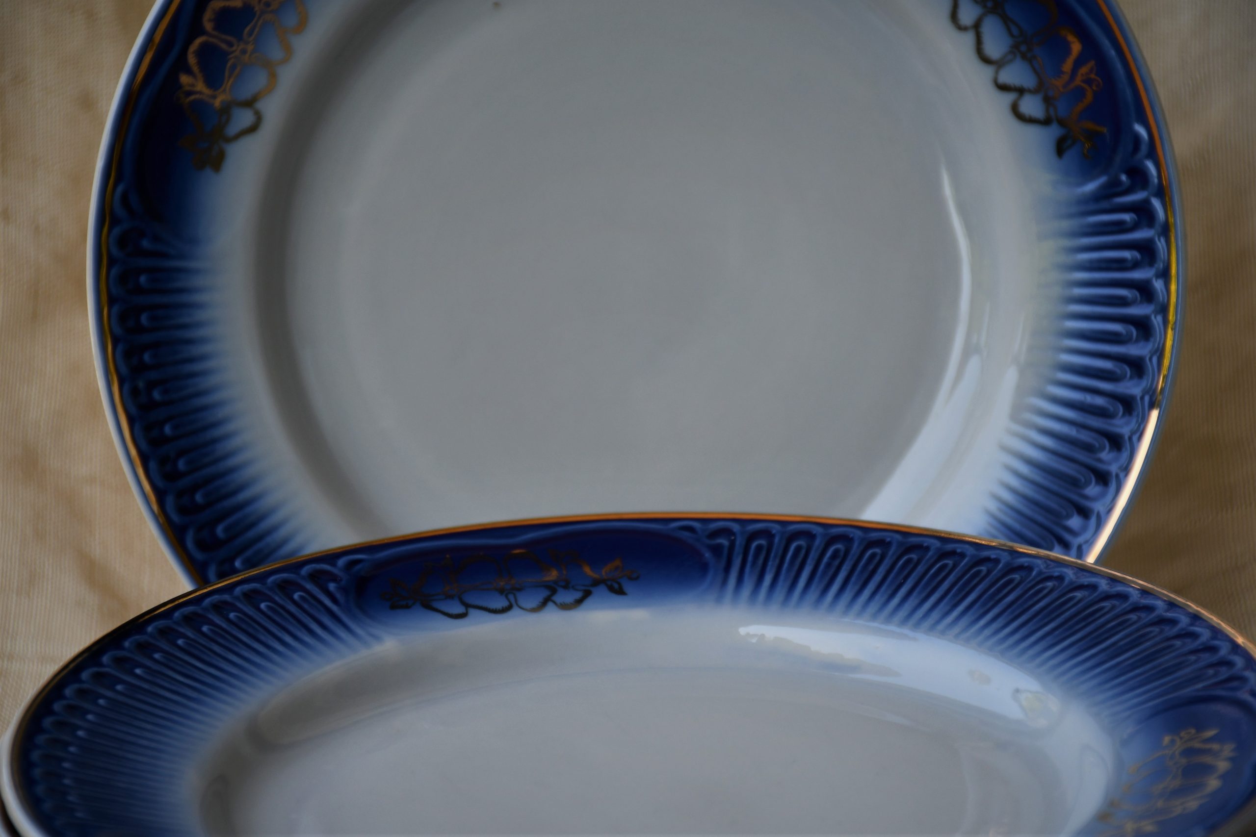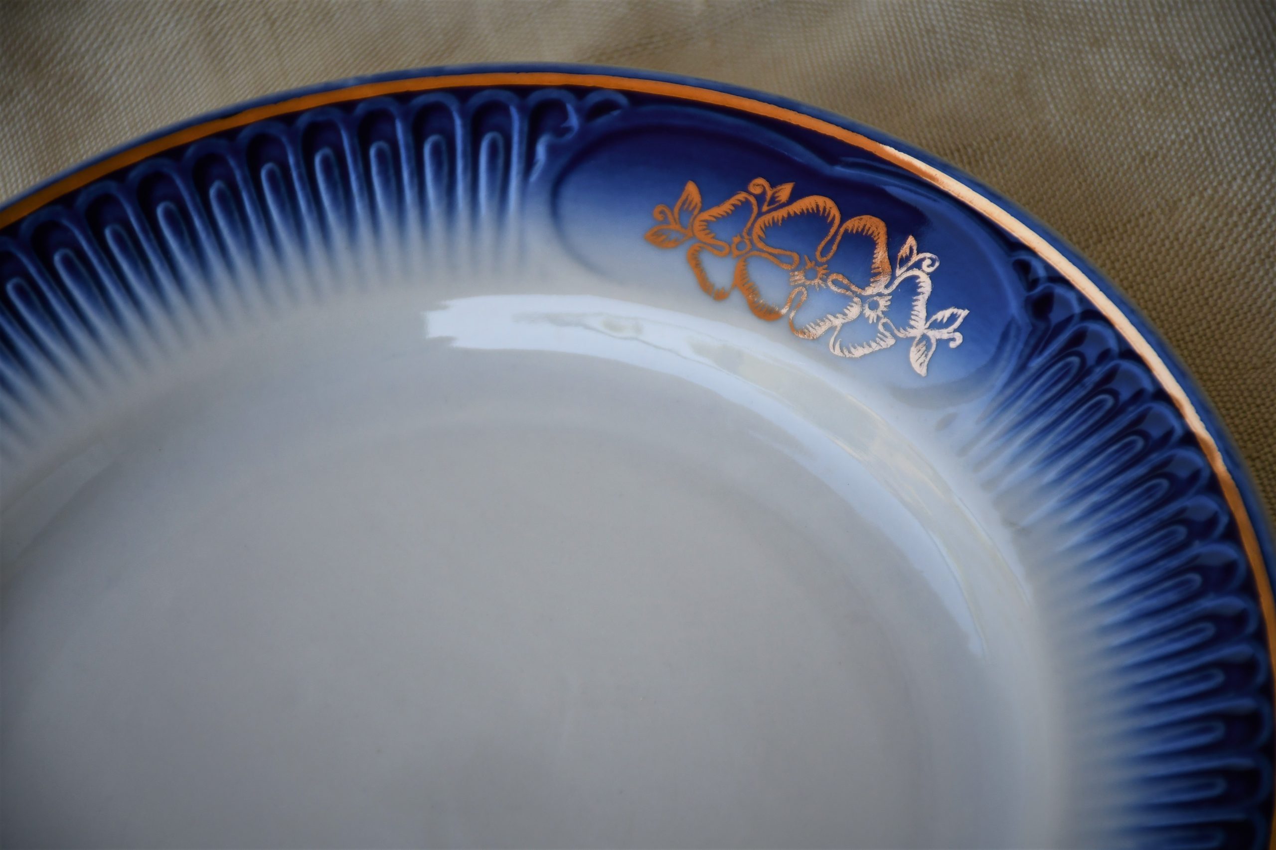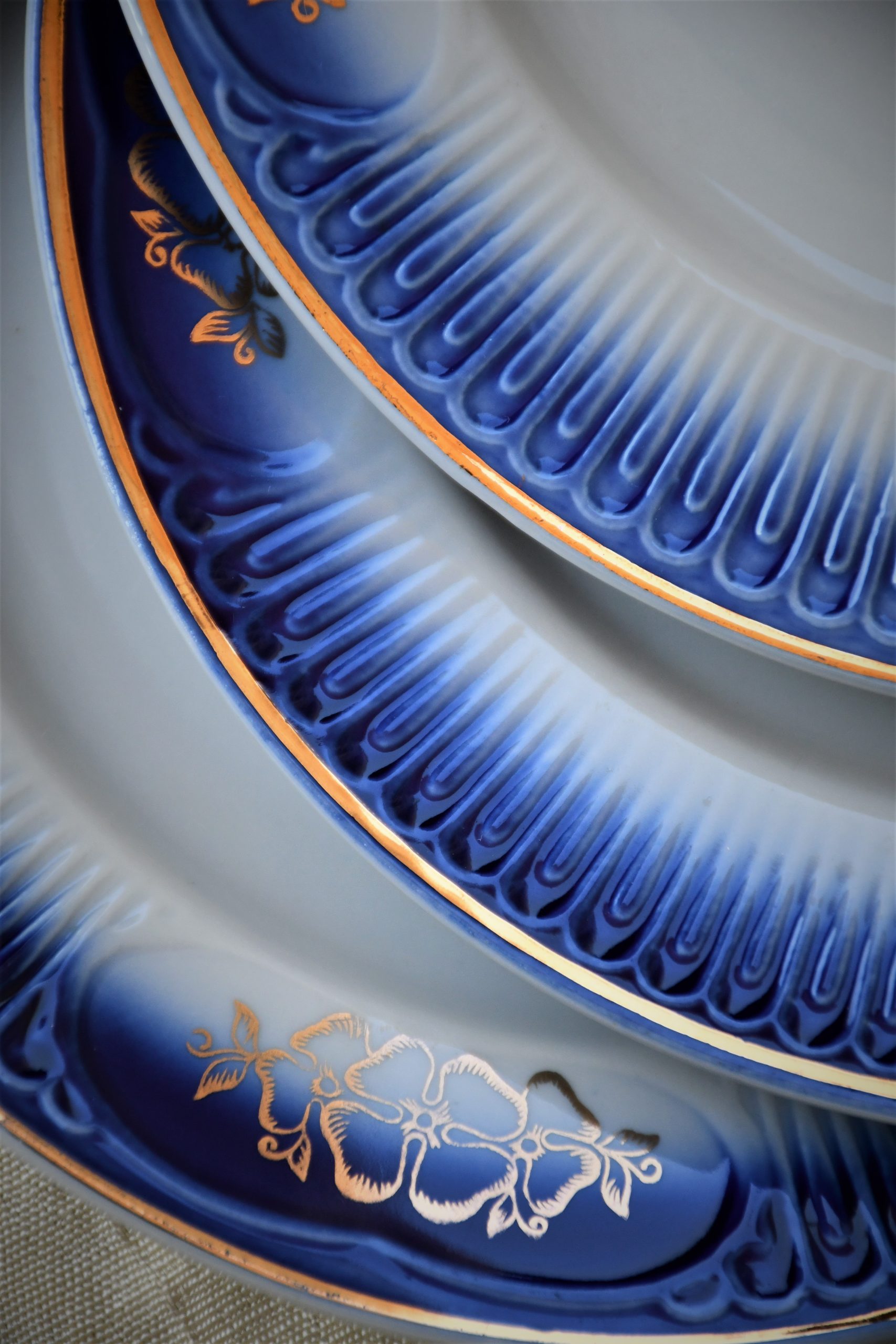 Бели, с кобалтова яка околовръст, с флорални елементи в златно. Много добре запазени, с незначителни следи от времето. Малък чип от долната страна на едната чиния -незначителен. Пълна комплектация от 6 чинии. Диаметър 20 cm. Тегло 280 g./бр.