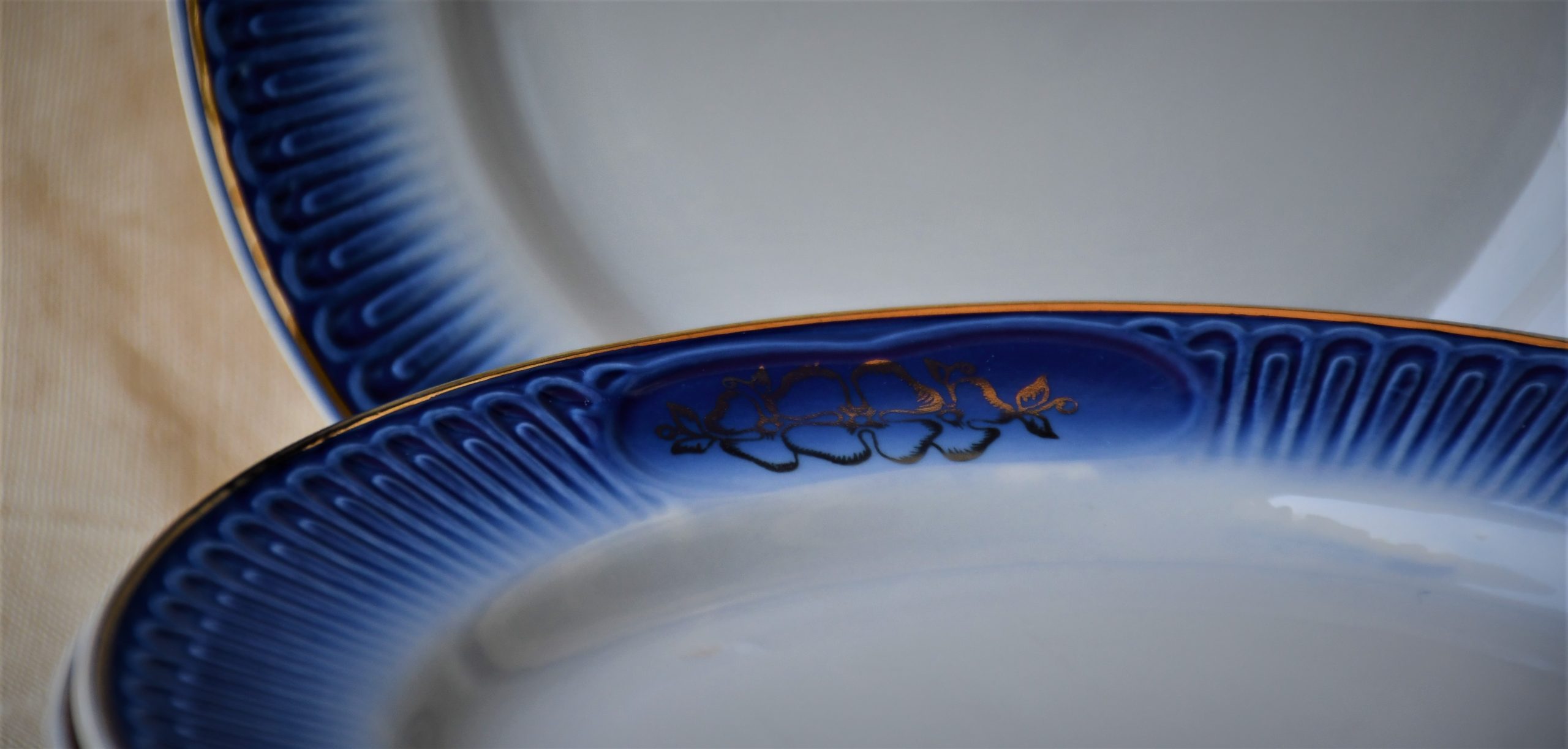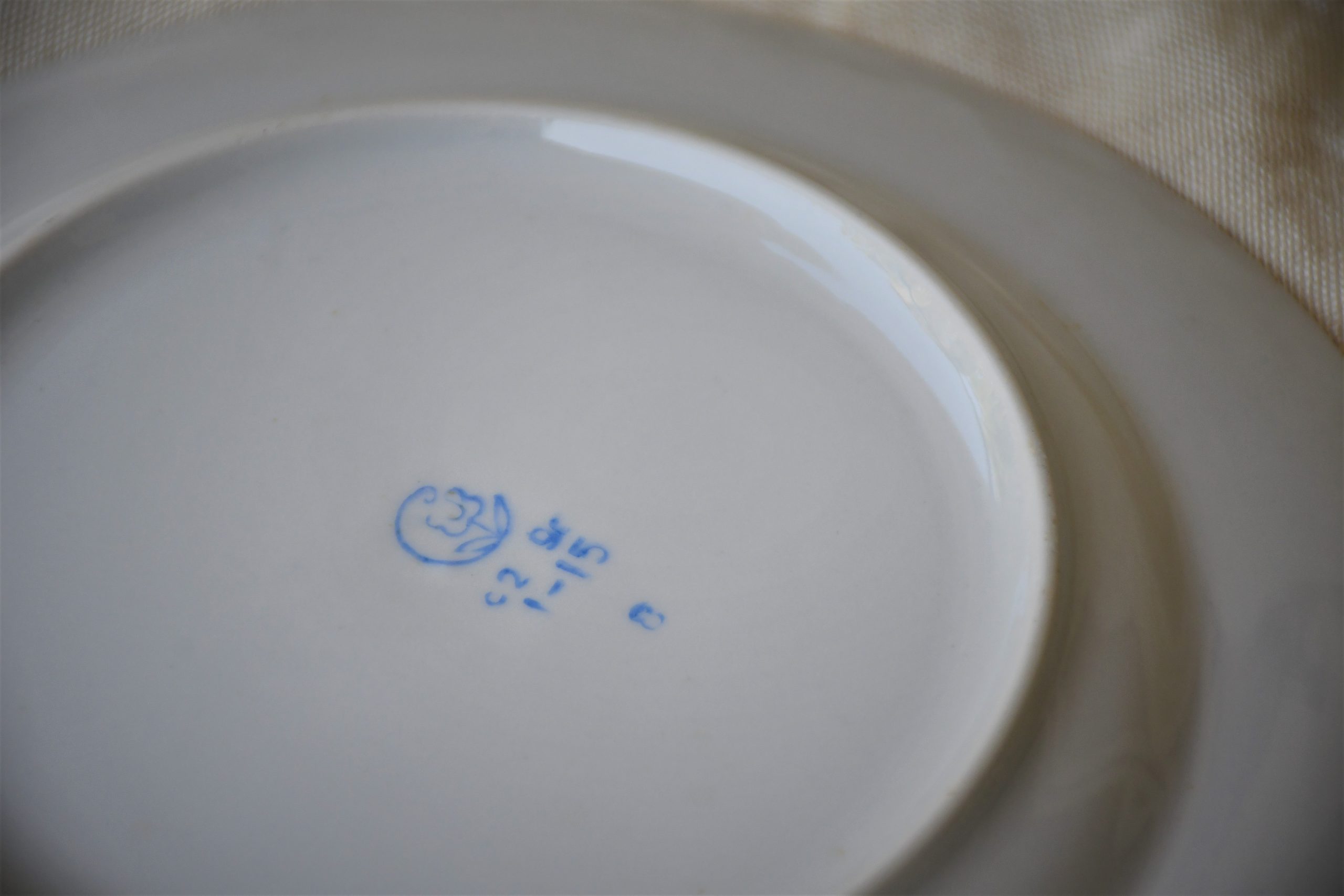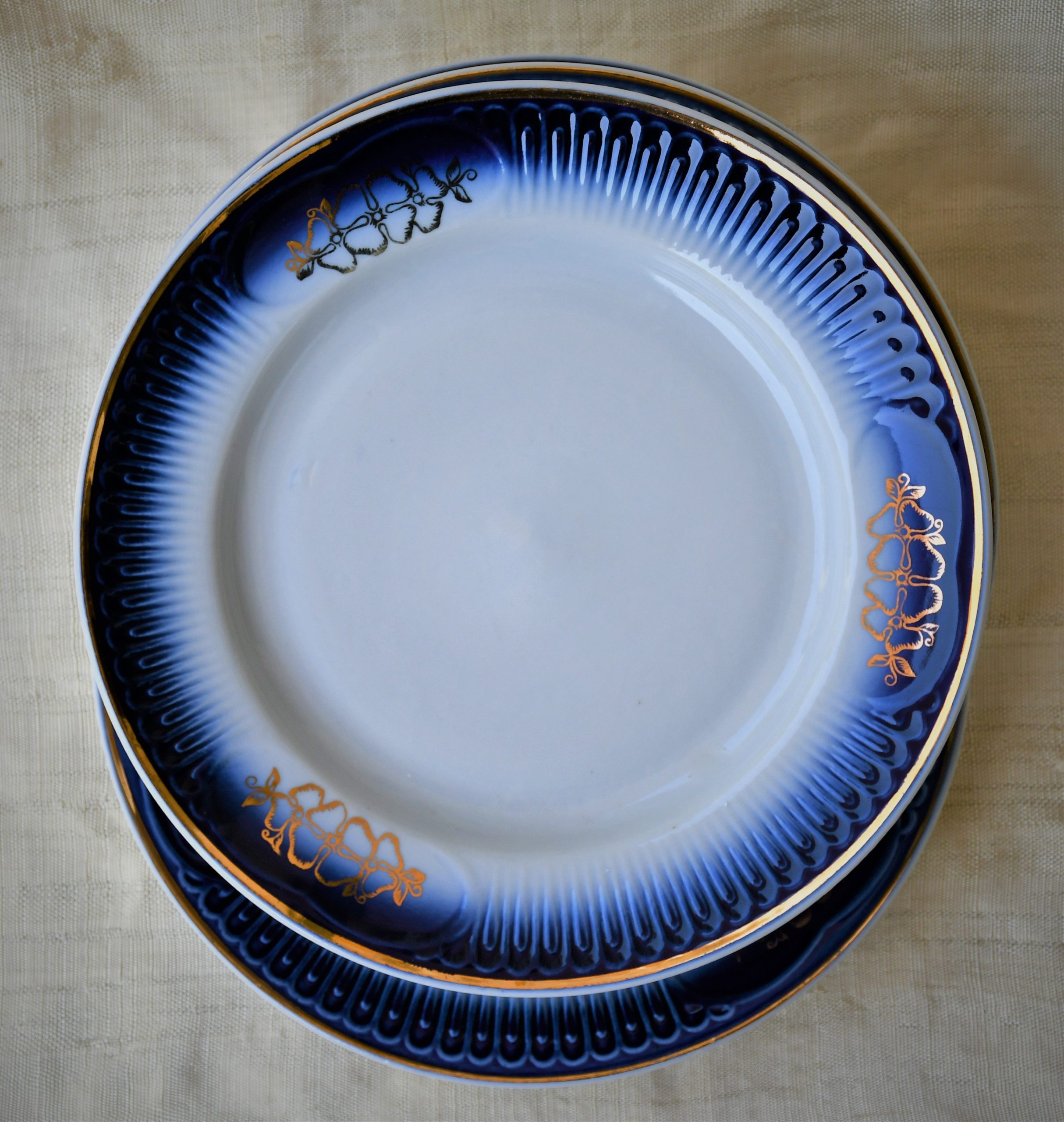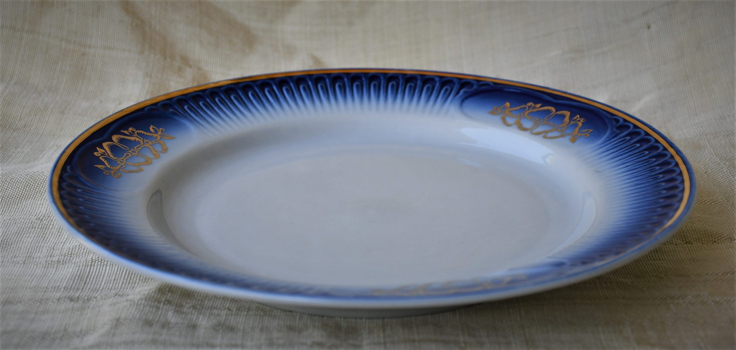 Бели, с кобалтова яка околовръст, с флорални елементи в златно. Много добре запазени, с незначителни следи от времето. Малък чип от долната страна на едната чиния -незначителен. Пълна комплектация от 6 чинии. Диаметър 20 cm. Тегло 280 g./бр.