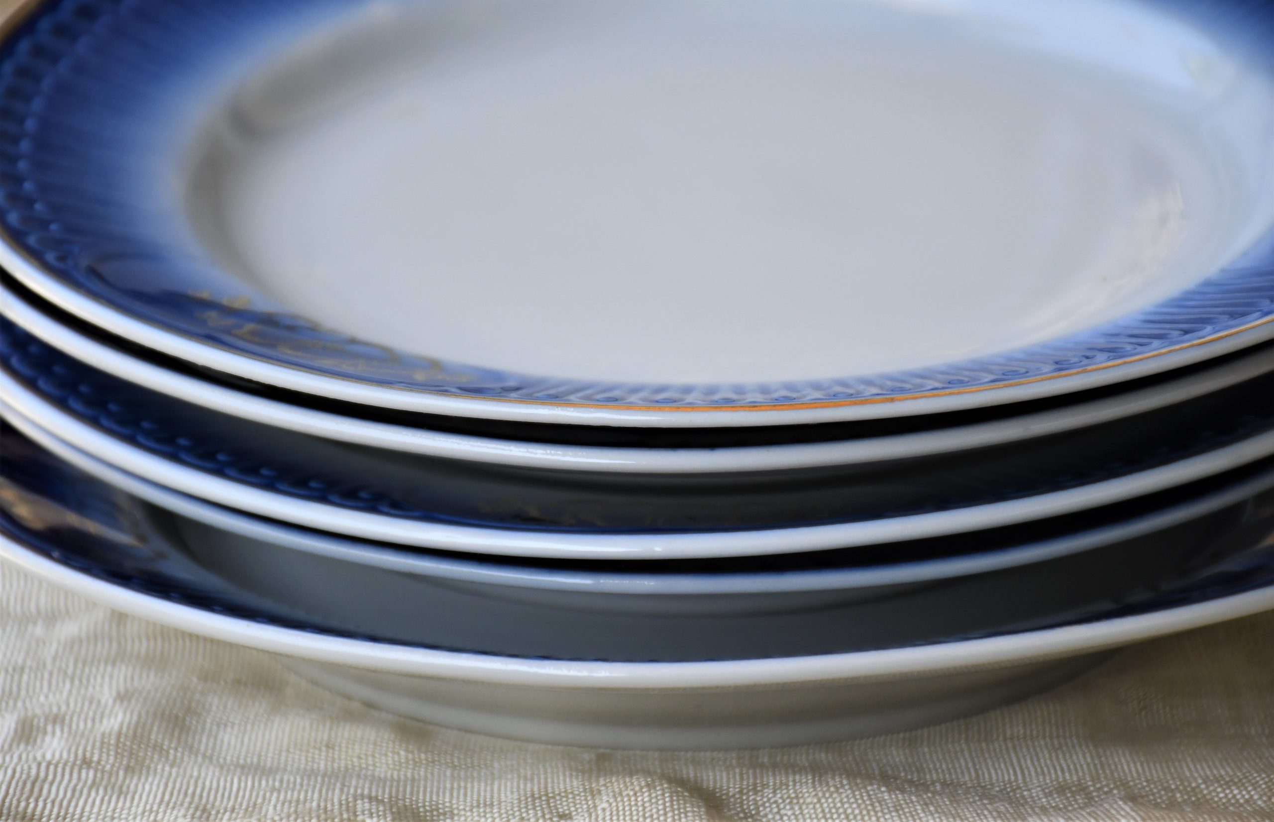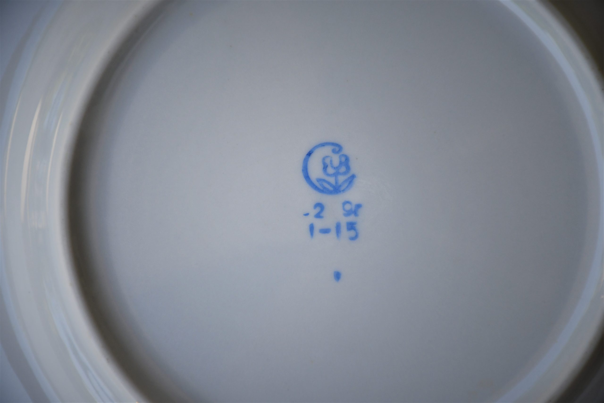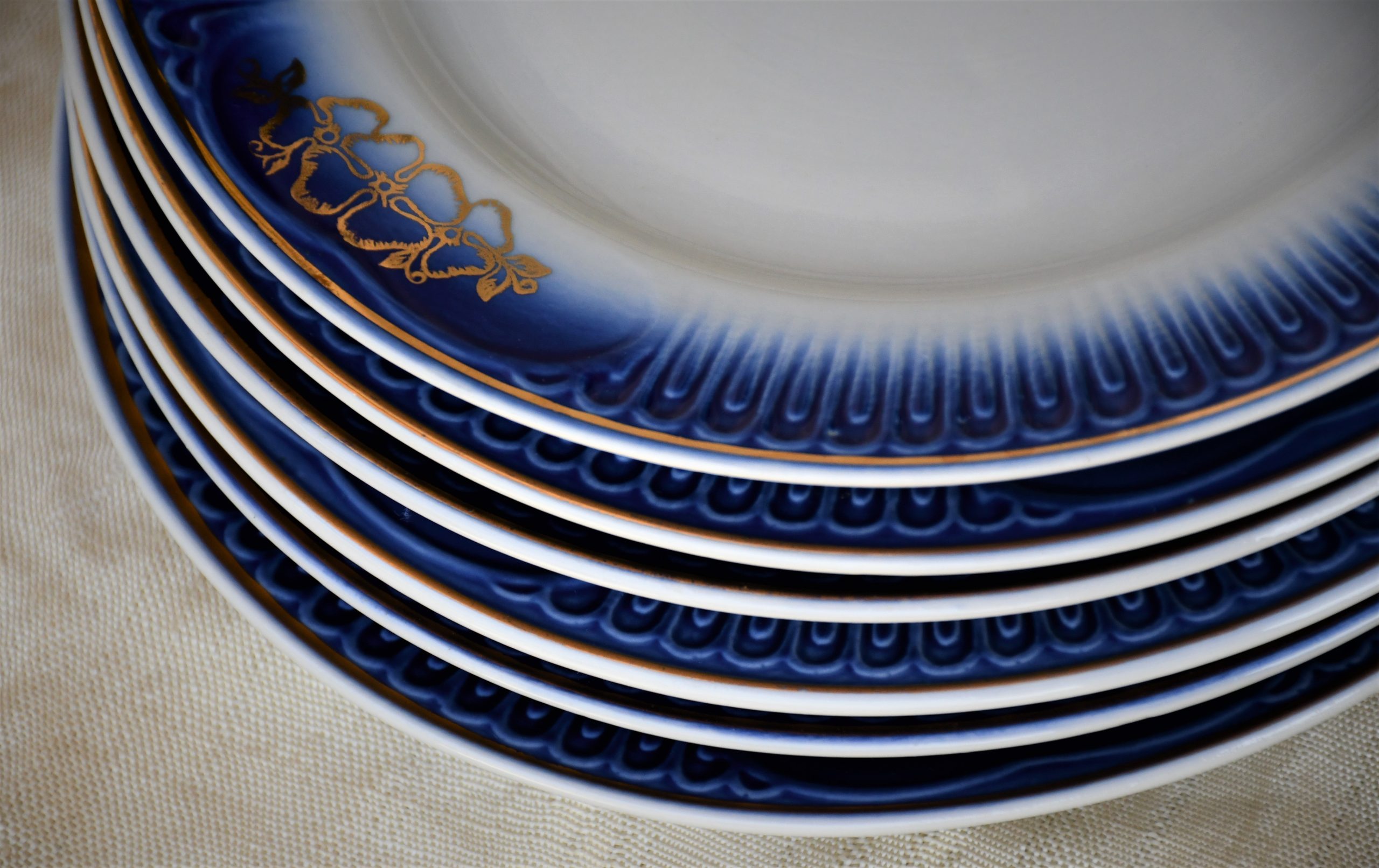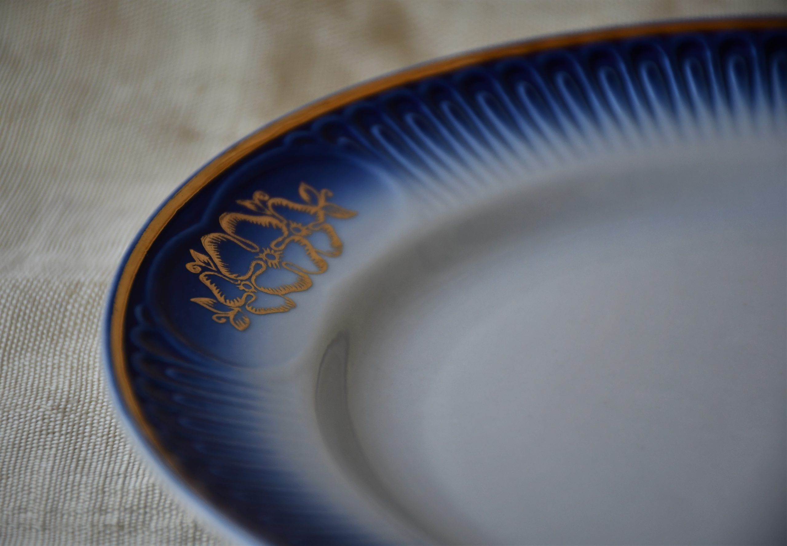 Бели, с кобалтова яка околовръст, с флорални елементи в златно. Много добре запазени, с незначителни следи от времето. Малък чип от долната страна на едната чиния -незначителен. Пълна комплектация от 6 чинии. Диаметър 20 cm. Тегло 280 g./бр.