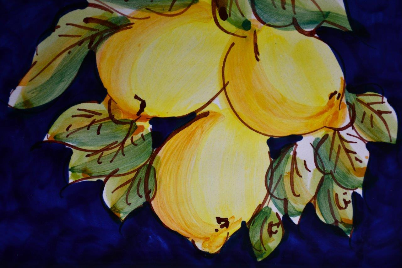 Фантастичен флорален дизайн с узрели лимони в центъра на композицията. Отлично владеене на занаята, типично за сицилианската школа в керамиката. Сред най-добрите екземпляри в тази област.