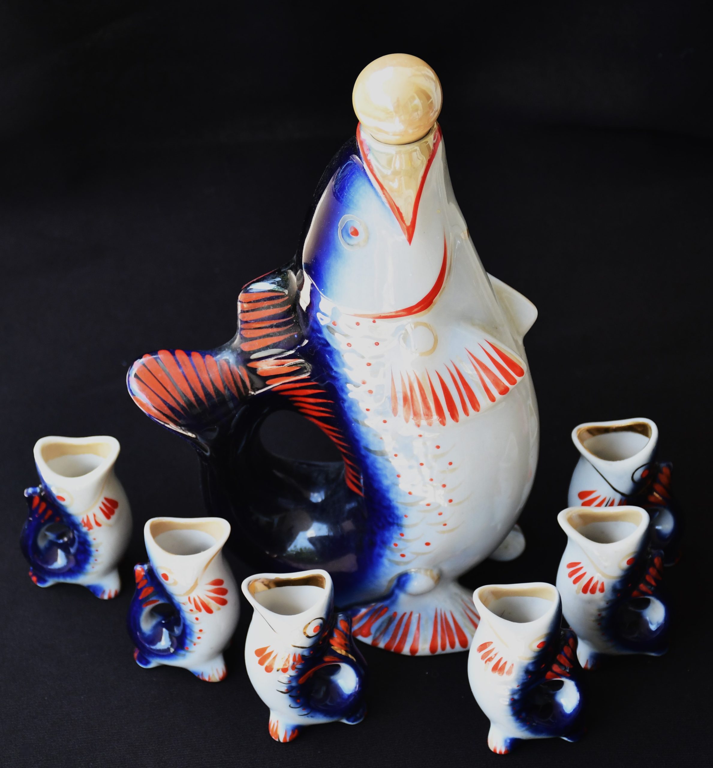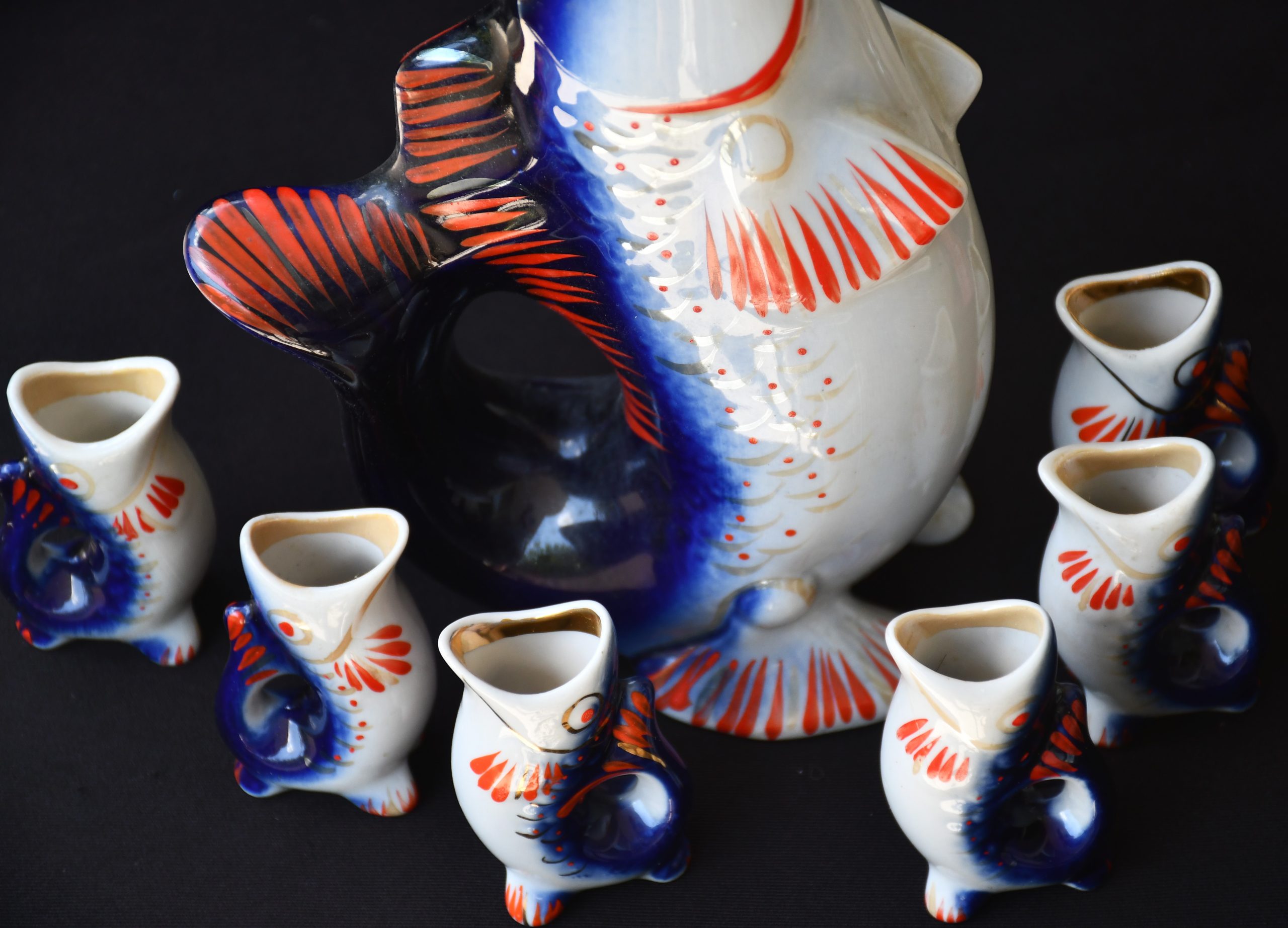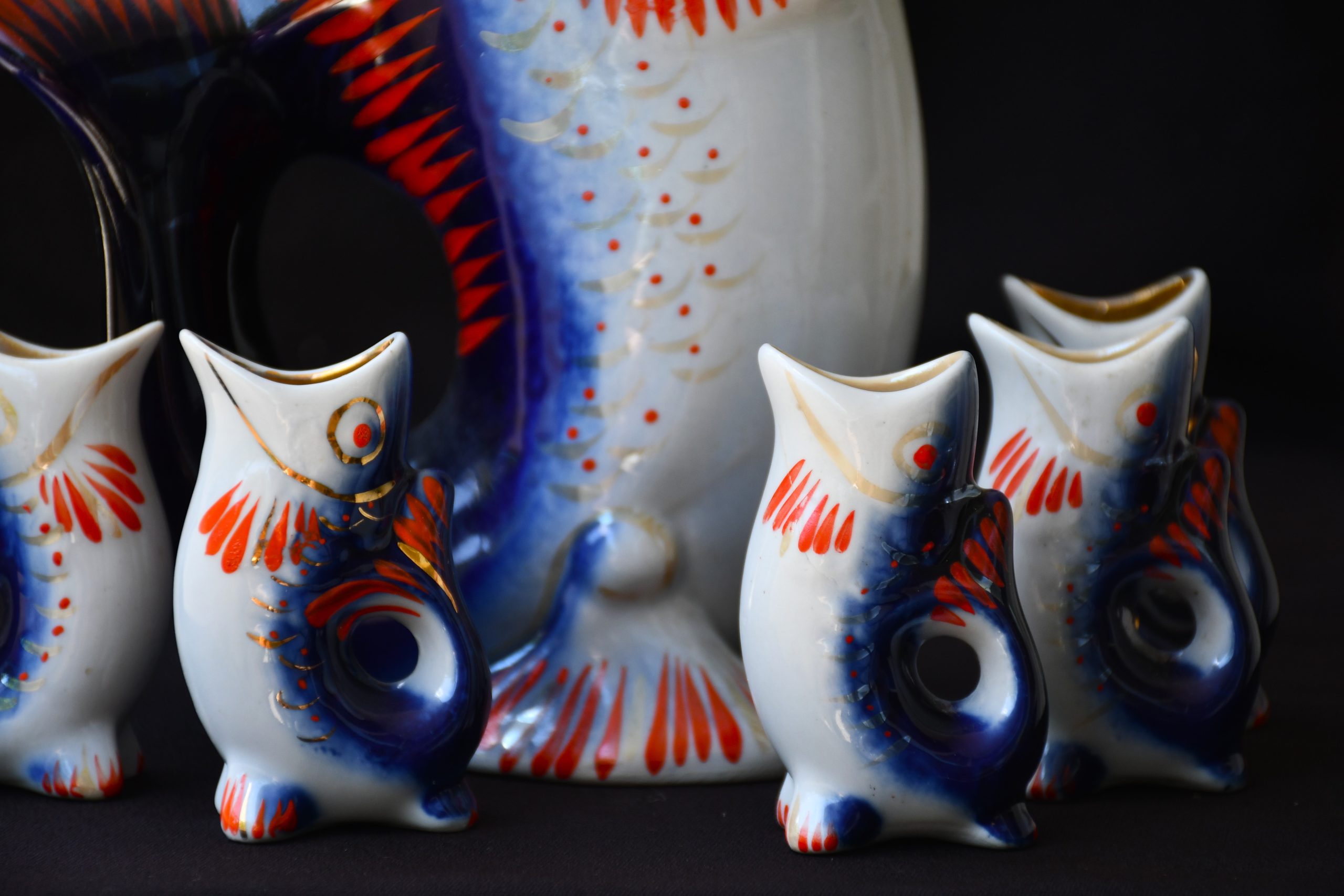 Чудноват сервиз за водка, по-скоро скулптура или произведение на изкуството, отколкото бутилка и шот-чаши. В стила на Съветското Art Deco. Ръчно рисувани в три цвята.
