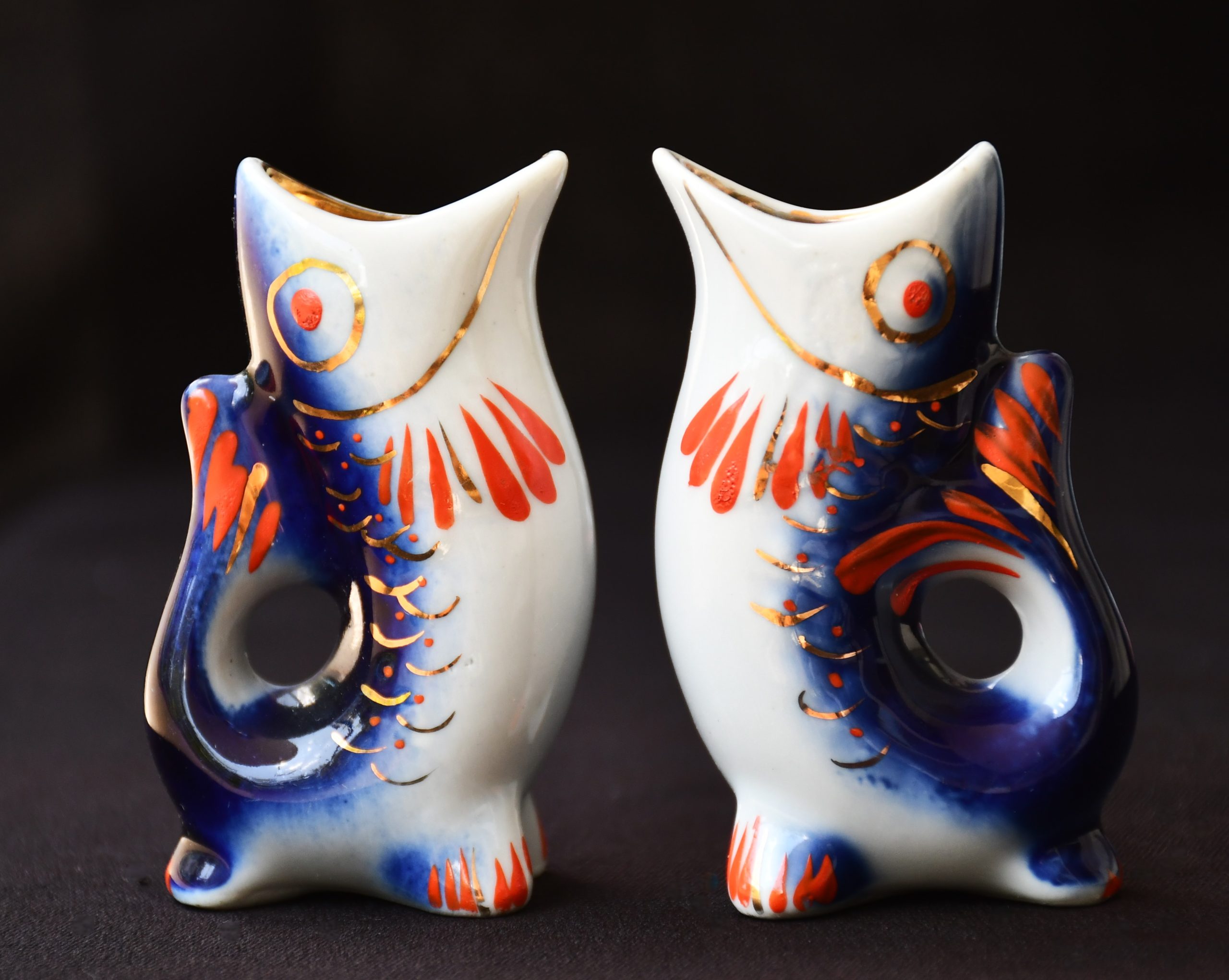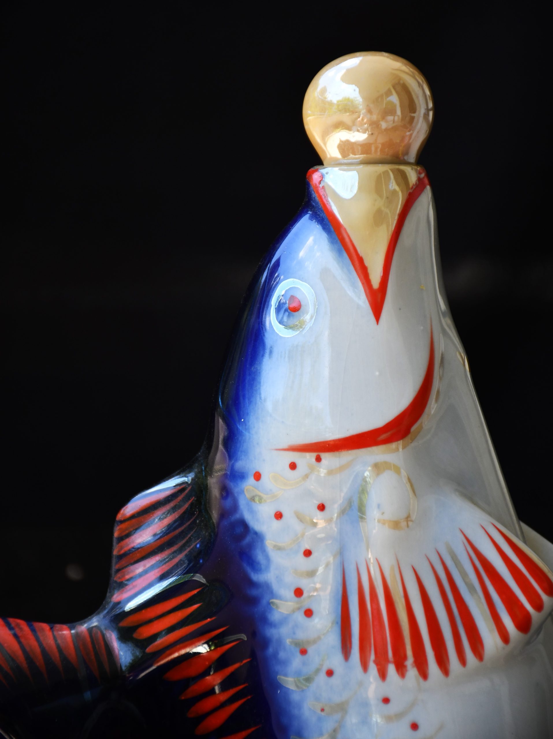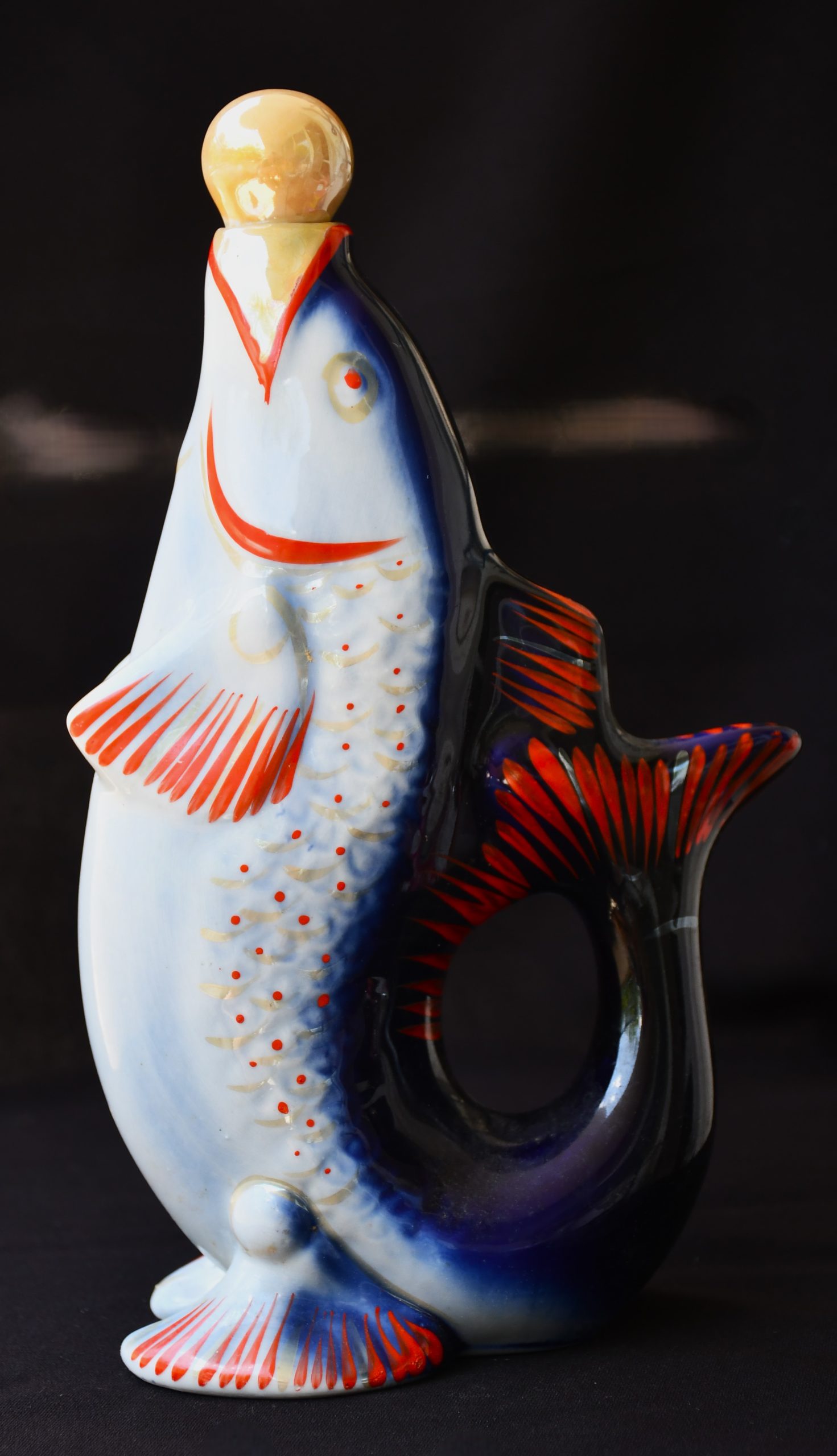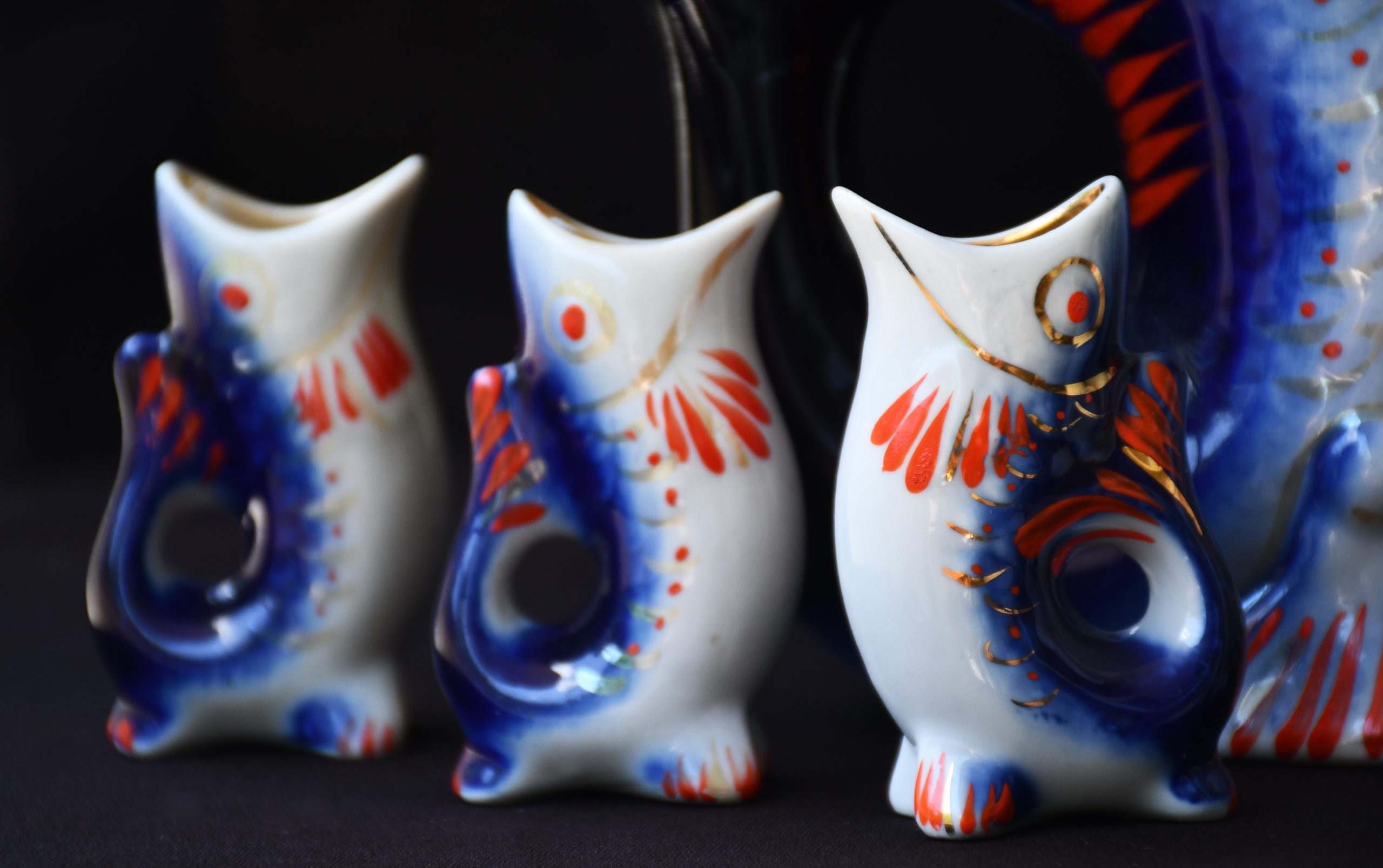 Чудноват сервиз за водка, по-скоро скулптура или произведение на изкуството, отколкото бутилка и шот-чаши. В стила на Съветското Art Deco. Ръчно рисувани в три цвята.