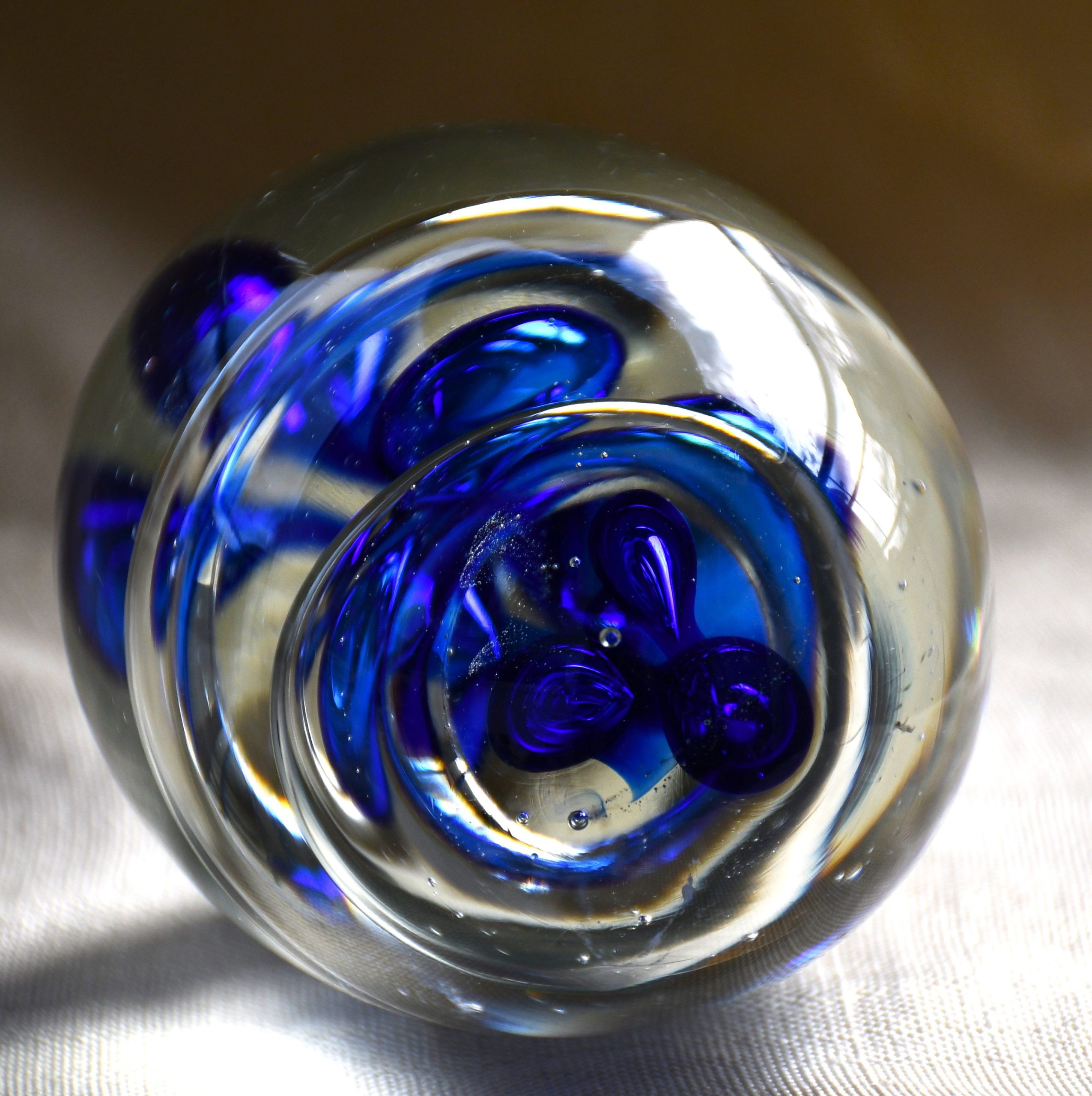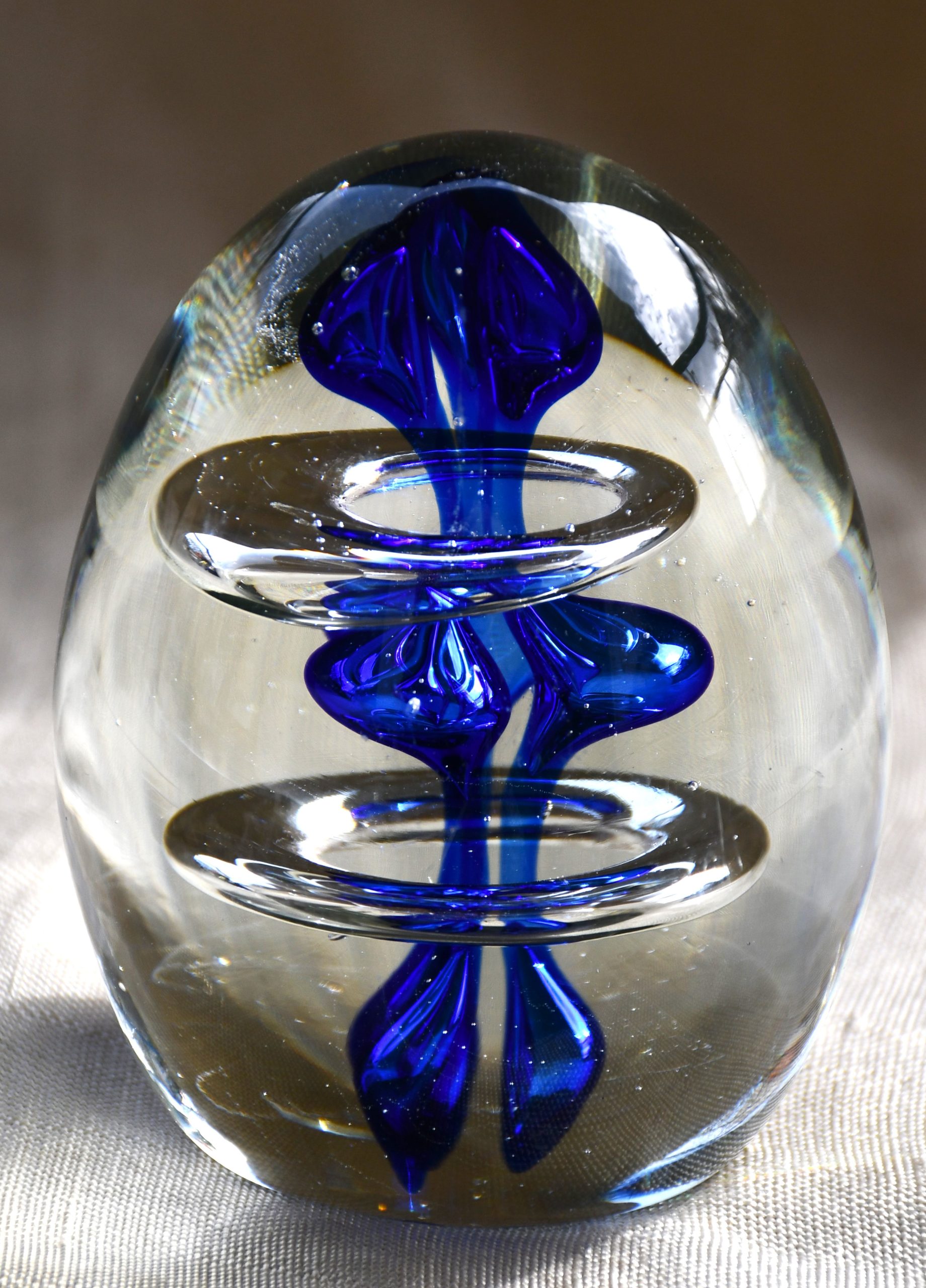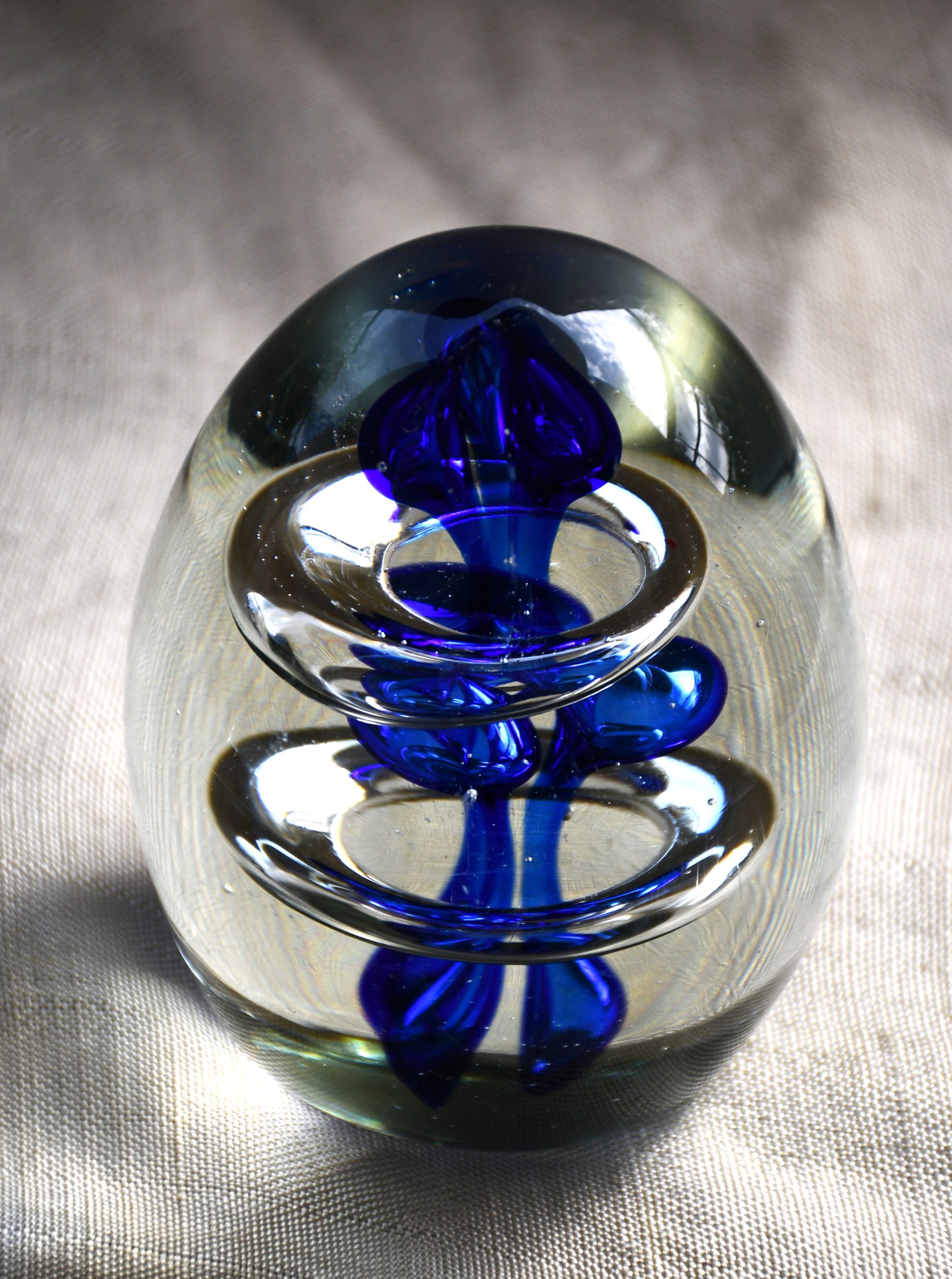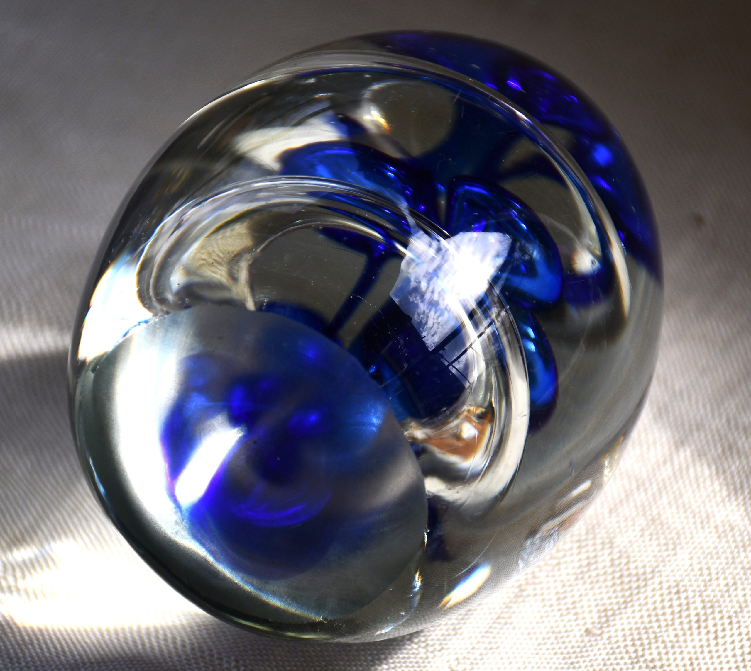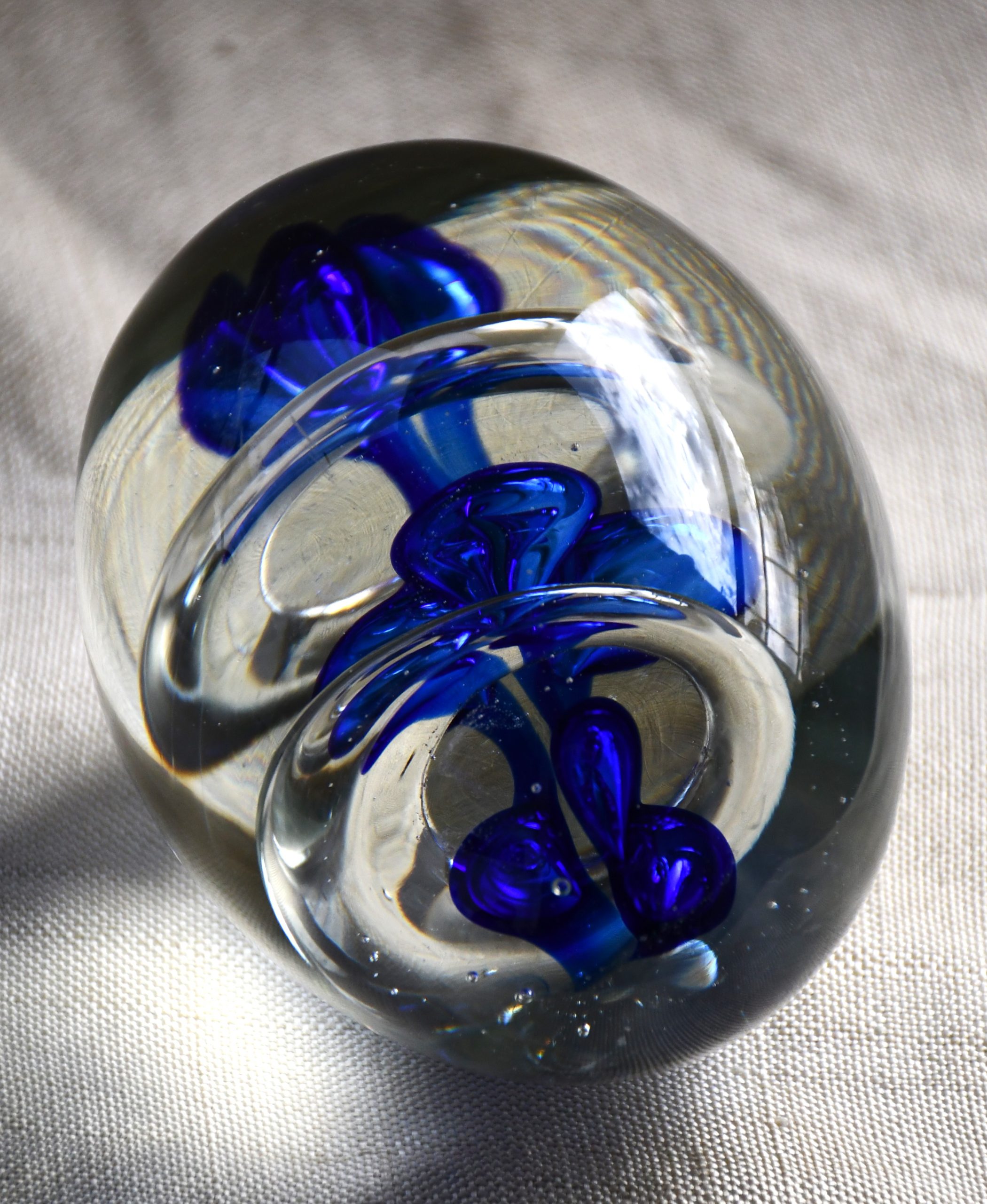 Оригинално преспапие от арт стъкло. Двуцветно – прозрачно и кобалт. С форма на голямо яйце. Интернет предлага поне 10 различни идеи за производител, но според мен е от Бохемия.