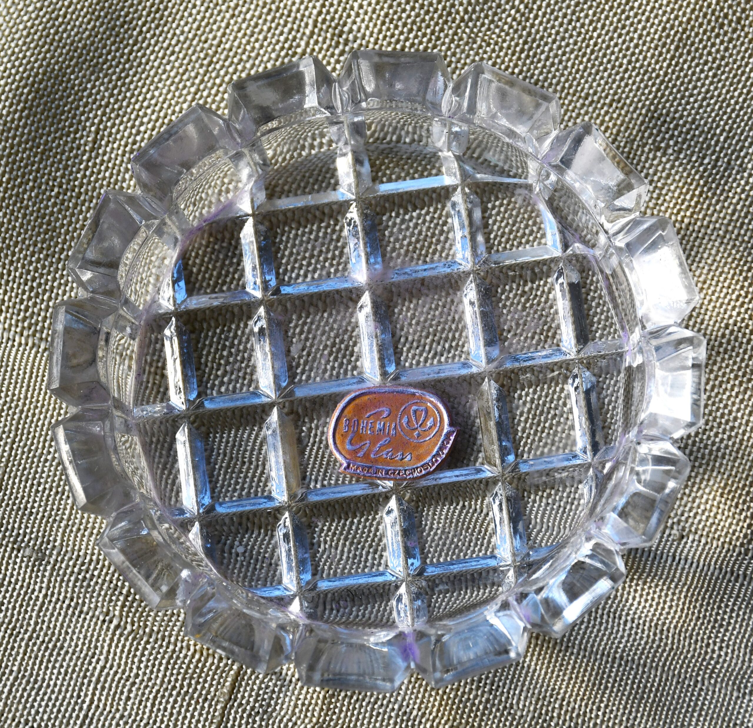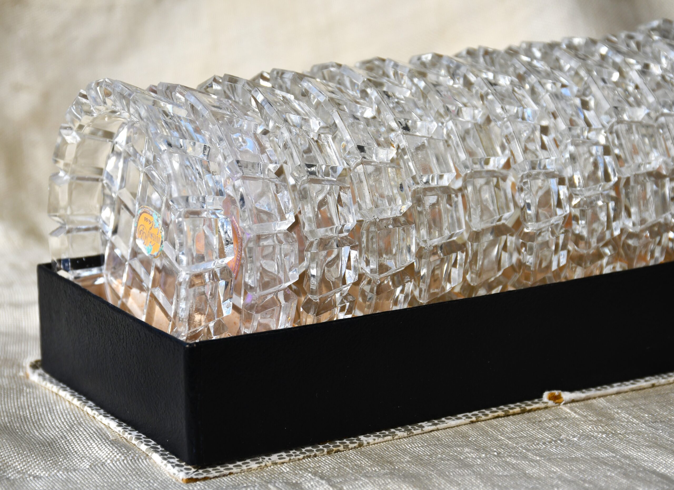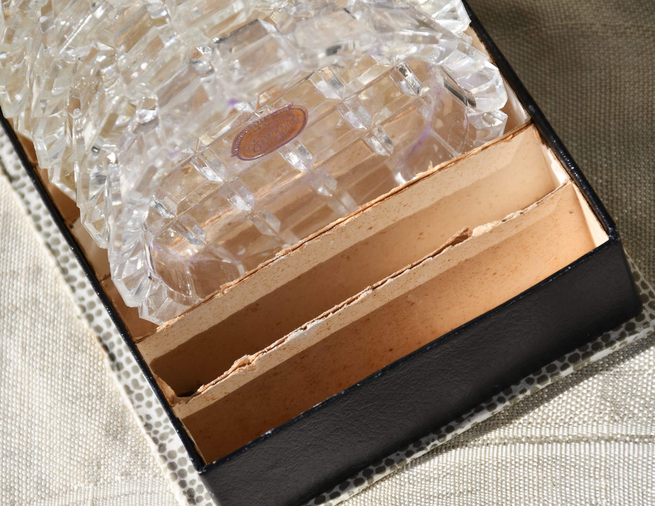 Eлегантен винтидж сет от подложки за чаши на Bohemia. Състои се от 12 бр. в оригиналната кутия. Ръчно гравирани с дълбок срез. От прозрачно кристално стъкло, декорирани с геометрични мотиви. Датировка – началото на 60-те от XXв.