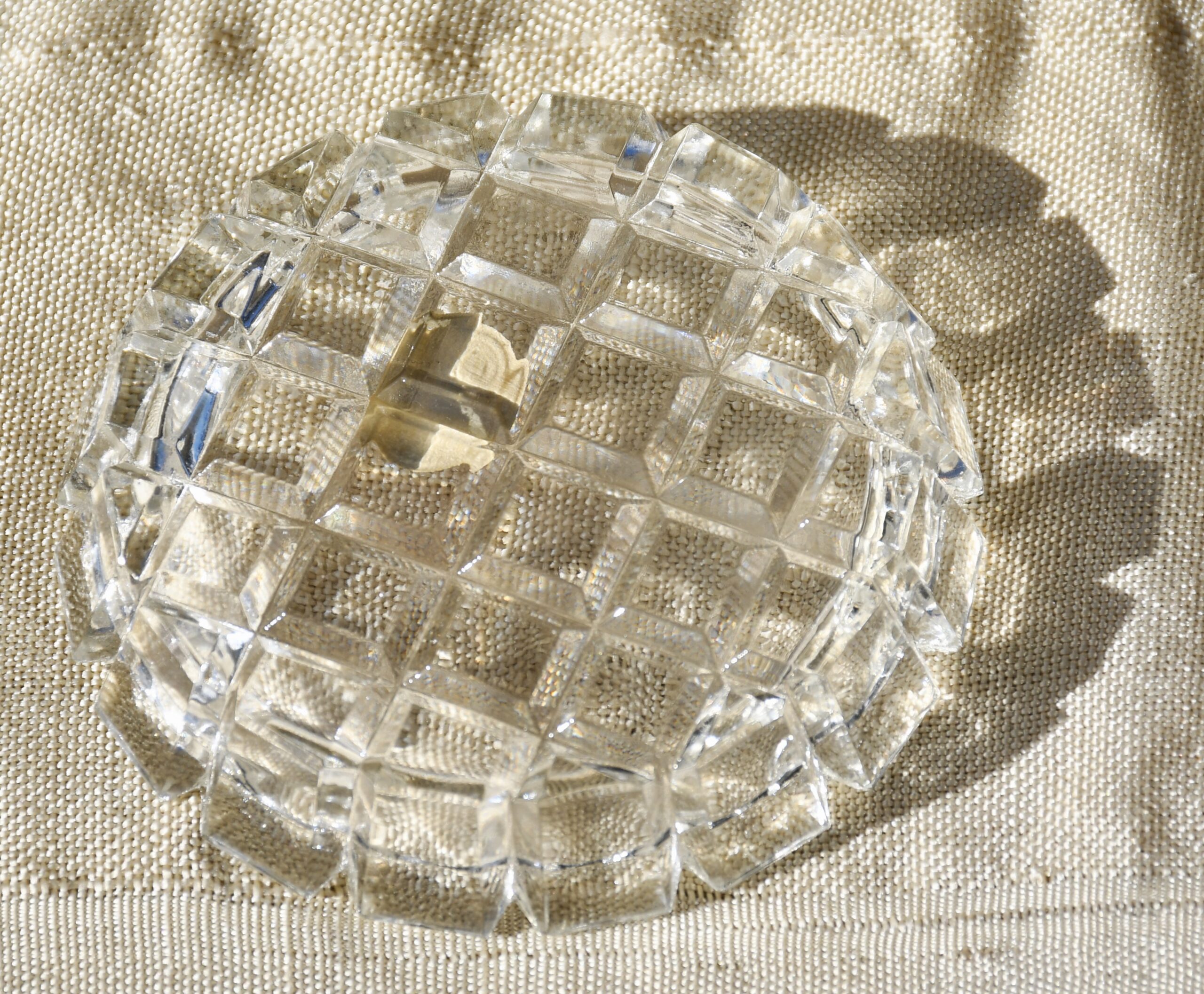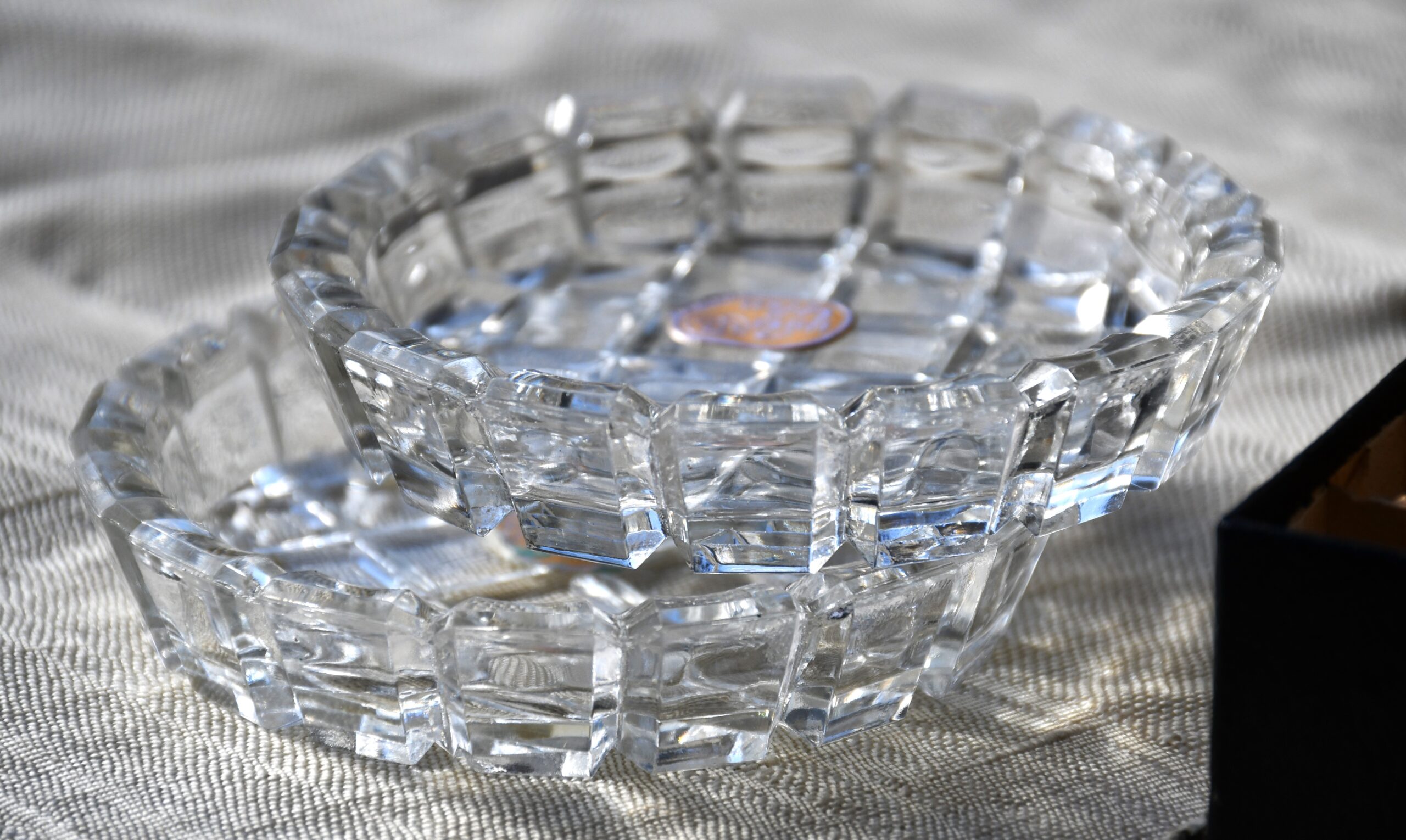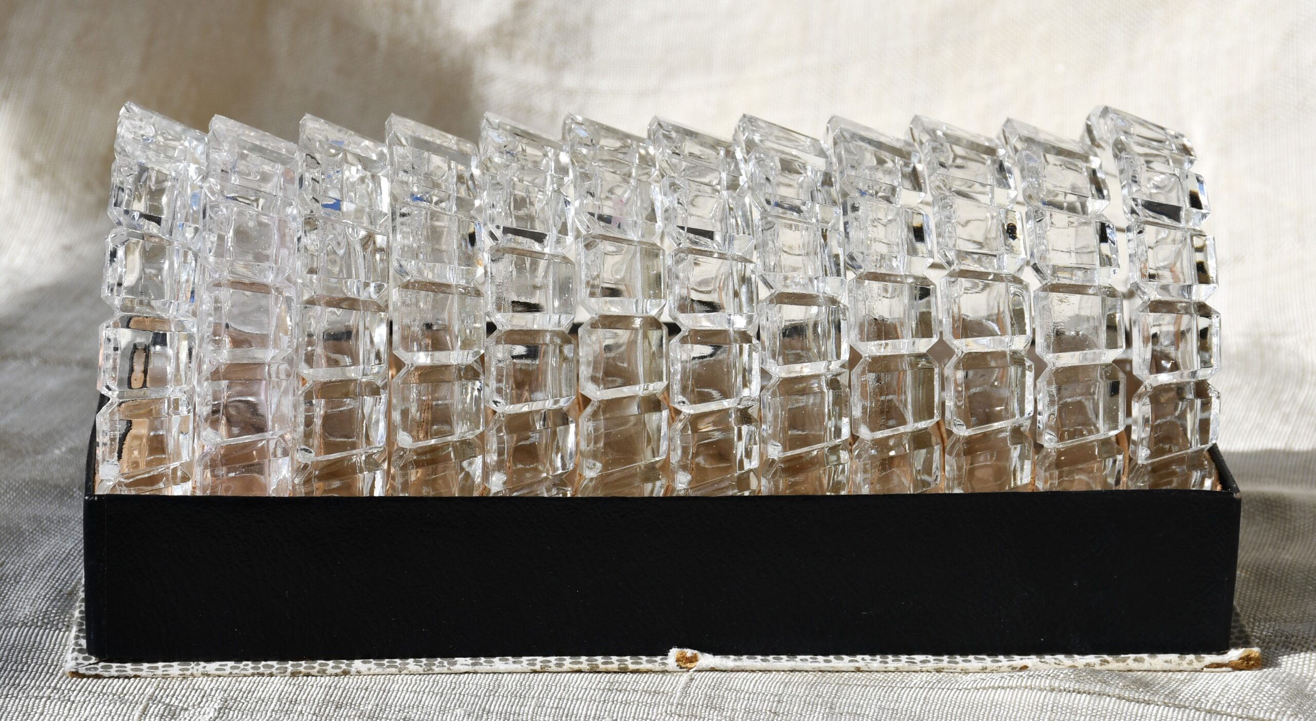 Eлегантен винтидж сет от подложки за чаши на Bohemia. Състои се от 12 бр. в оригиналната кутия. Ръчно гравирани с дълбок срез. От прозрачно кристално стъкло, декорирани с геометрични мотиви. Датировка – началото на 60-те от XXв.