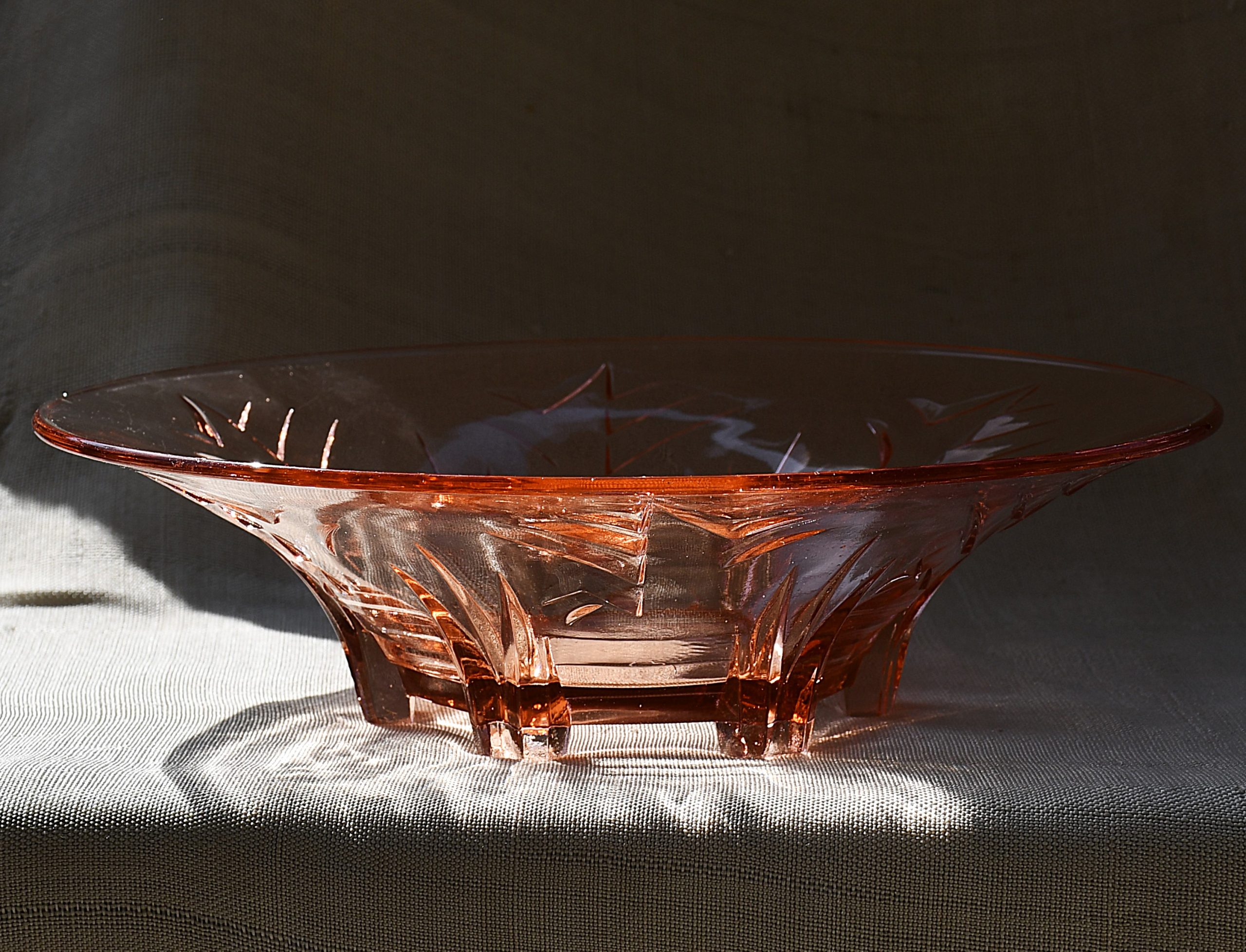 Пресовано стъкло в цвят розалин. С арт деко релефи върху стените, върху 6 (здрави!) крачета.