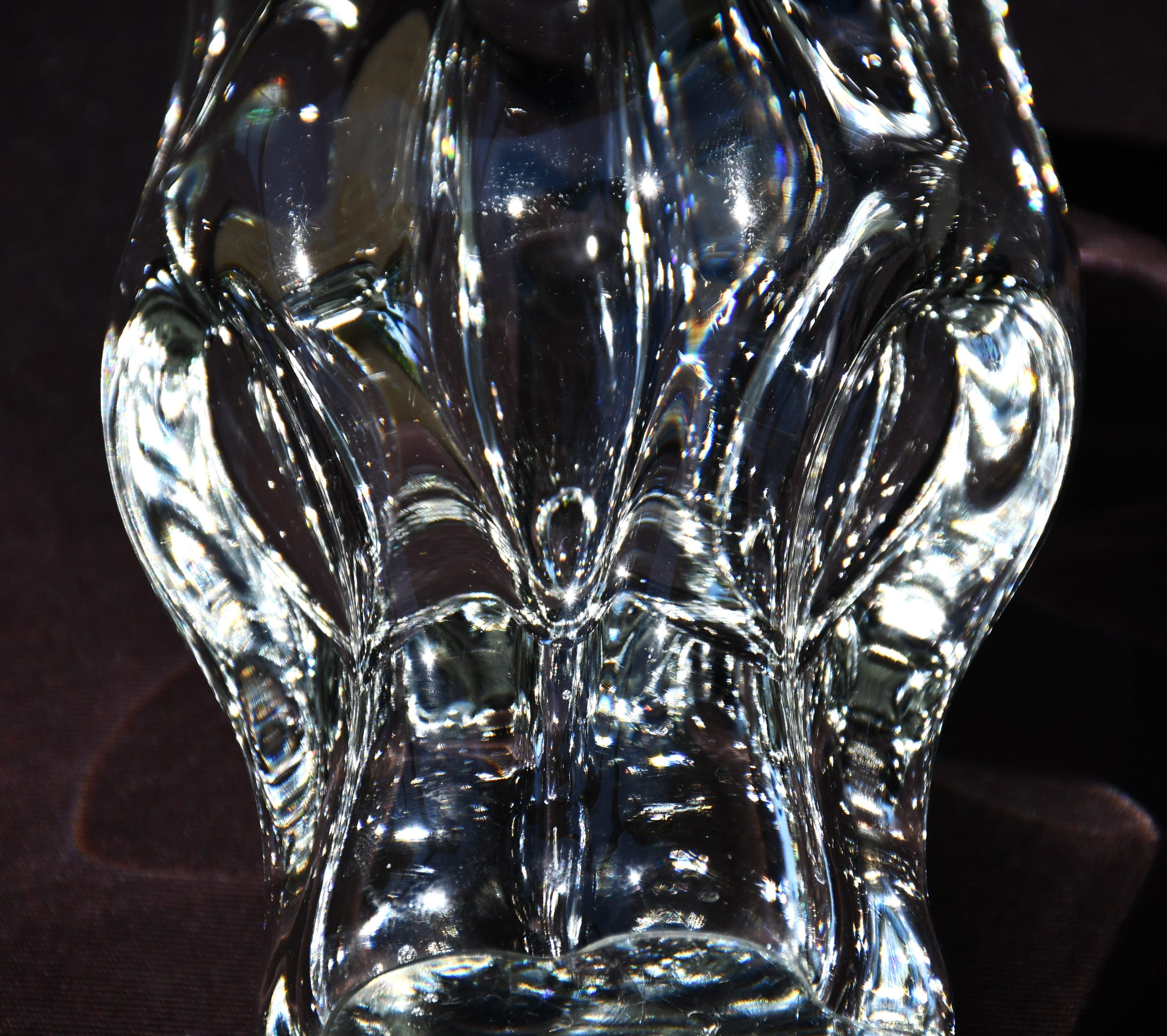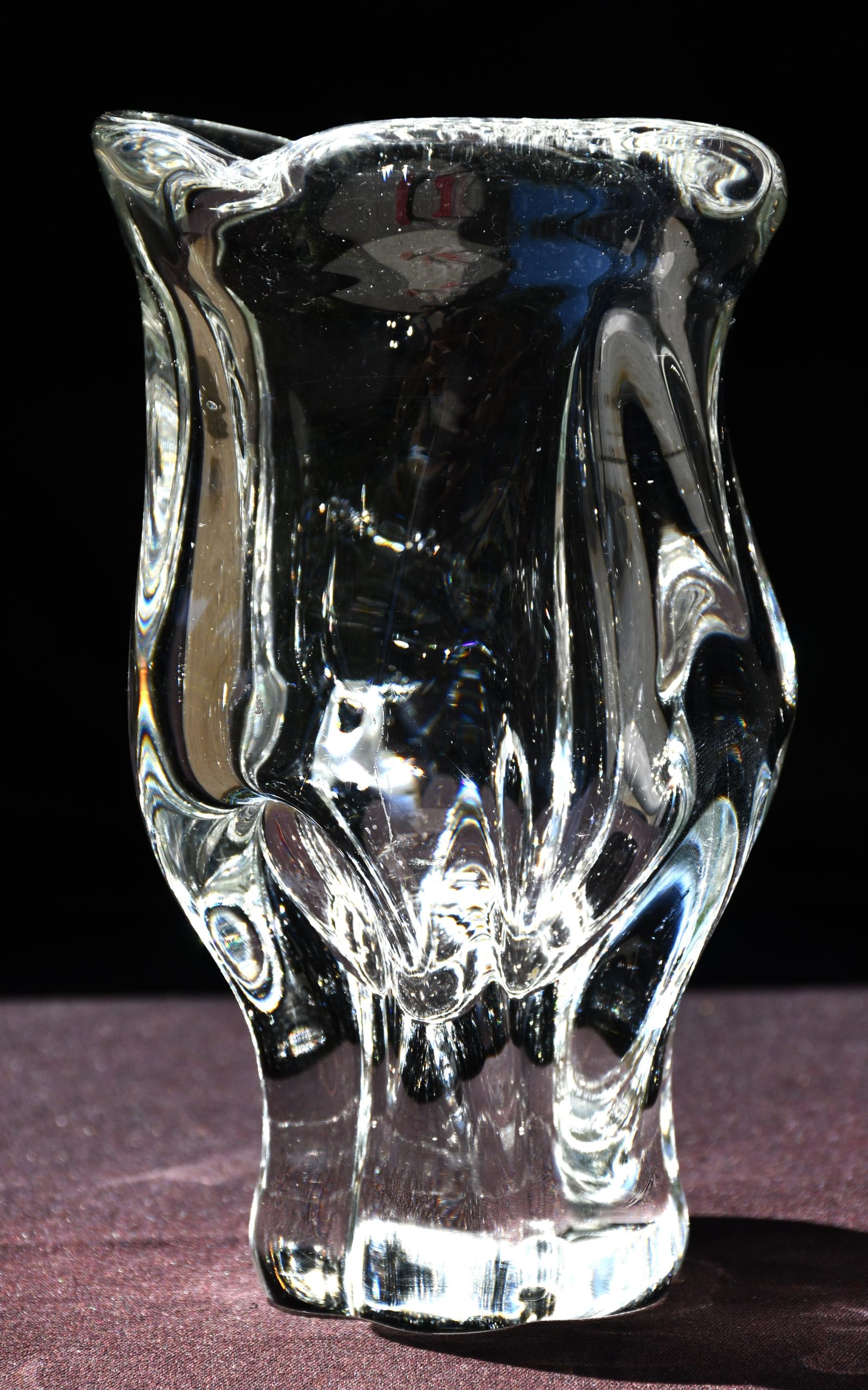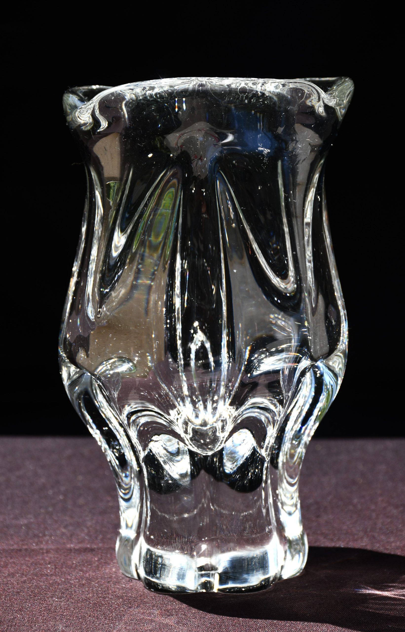 Много красива скулптурална ваза от прозрачно кристално стъкло. Midcentury-modern дизайн. Датировка 1960-те. Ръчно духано стъкло с ръчна шлифовка на дъното. Авторска работа на Йозеф Хосподка, един от най-значимите чешки артисти в стъклото за 20-и век.