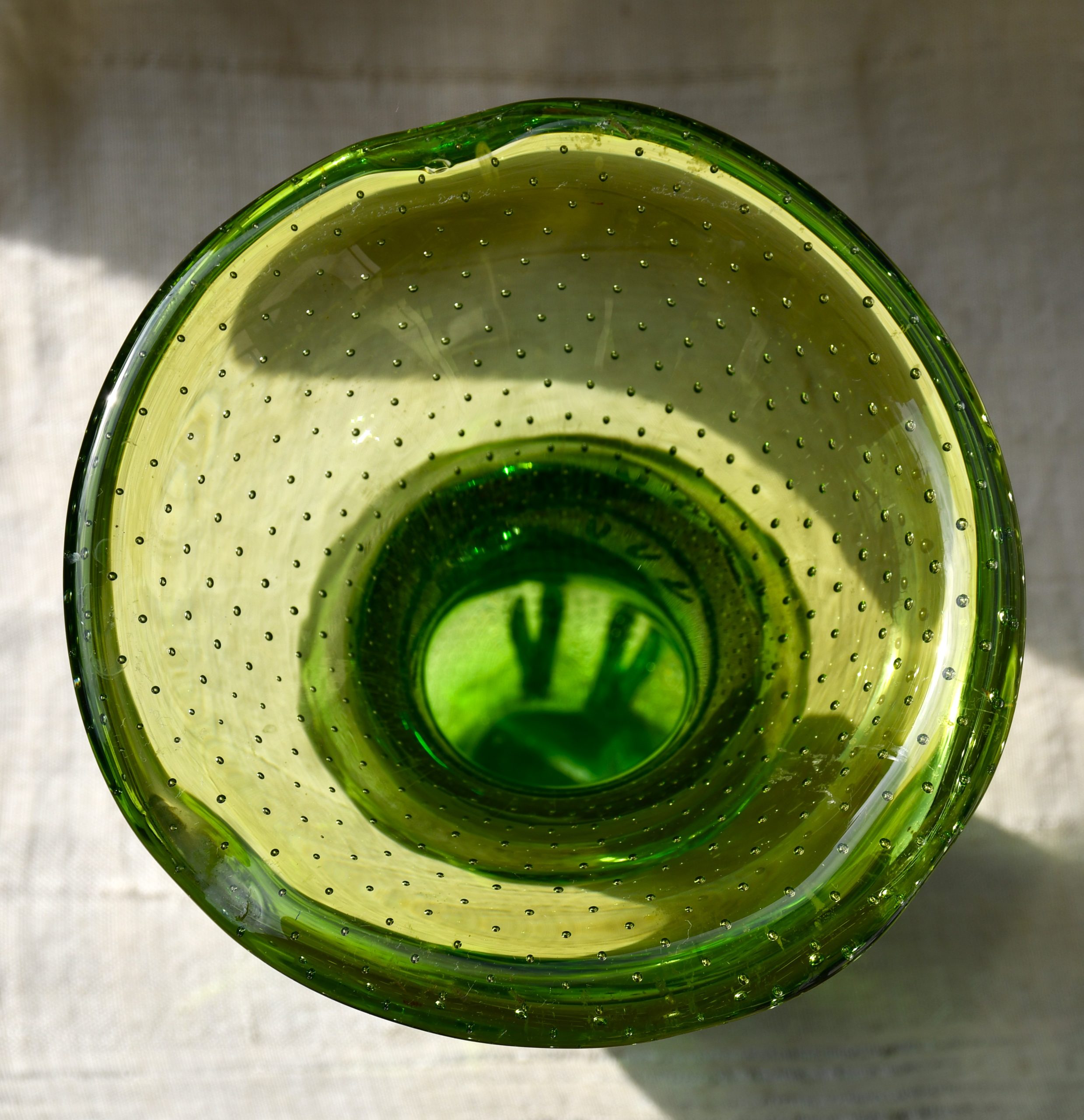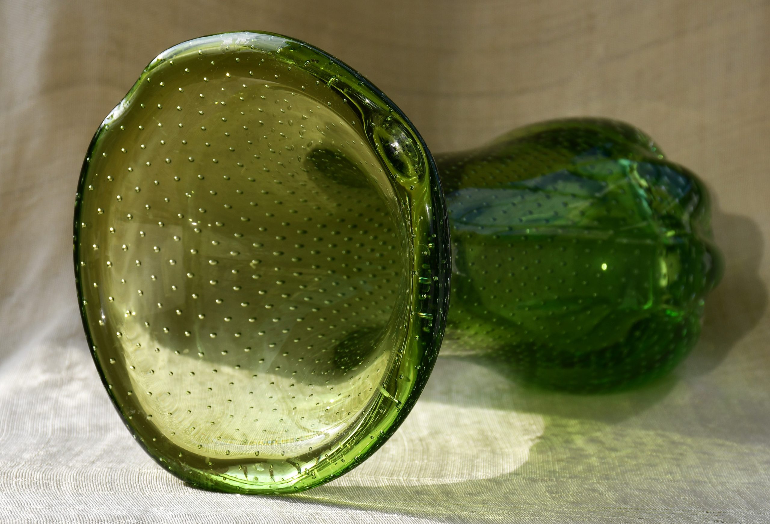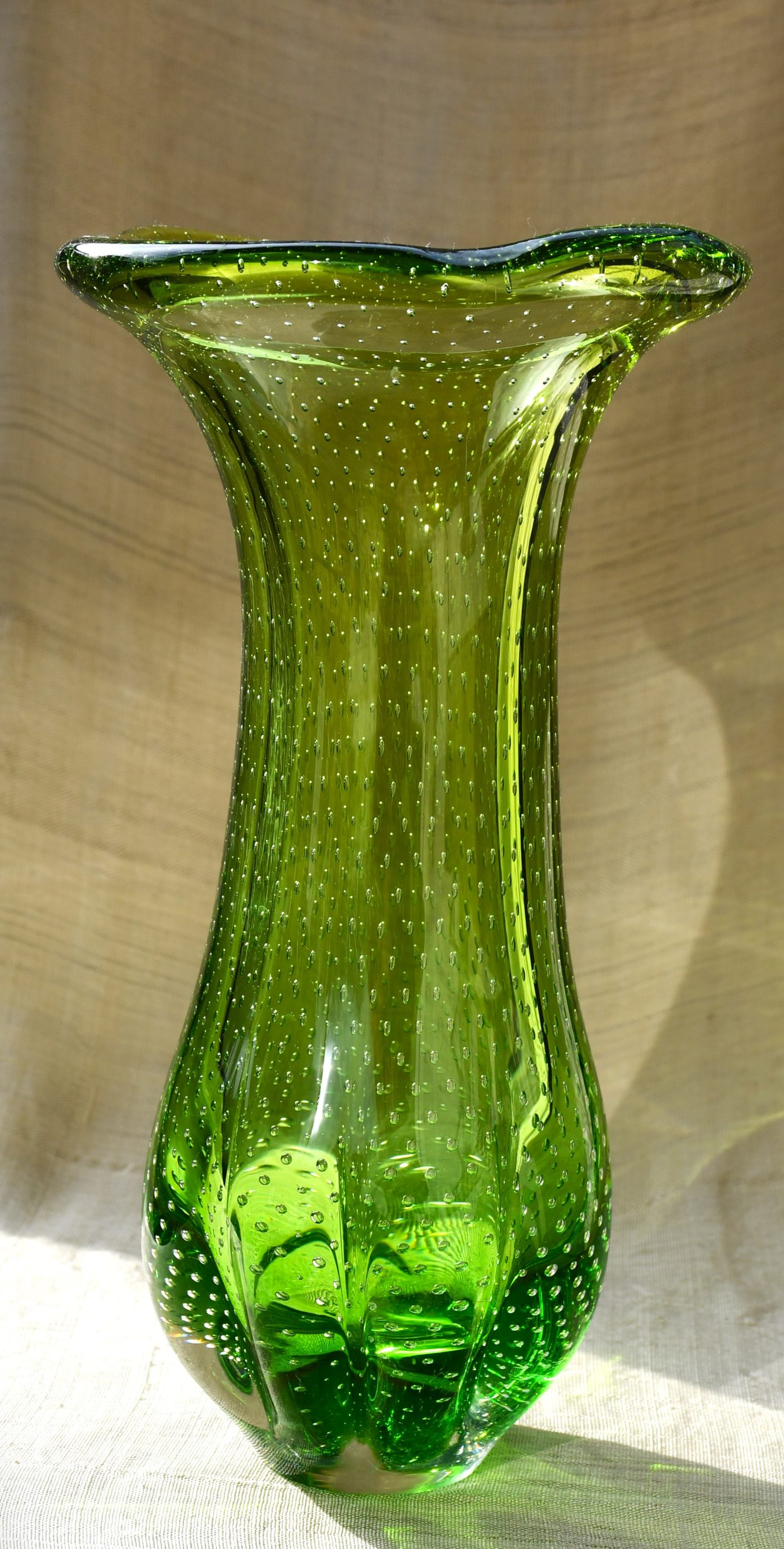 Тази ваза е извънредно специална. Едновременно се използват две техники от висшия пилотаж на занаята – sommerso и bullicante! Мека органична форма с неустоим цвят. В момент на дълбока тишина човек сякаш може да долови звука от капките на зеления пролетен дъжд… Много декоративна, с внушително присъствие в пространството на стаята. Нова и неочаквана от всяка гледна точка.