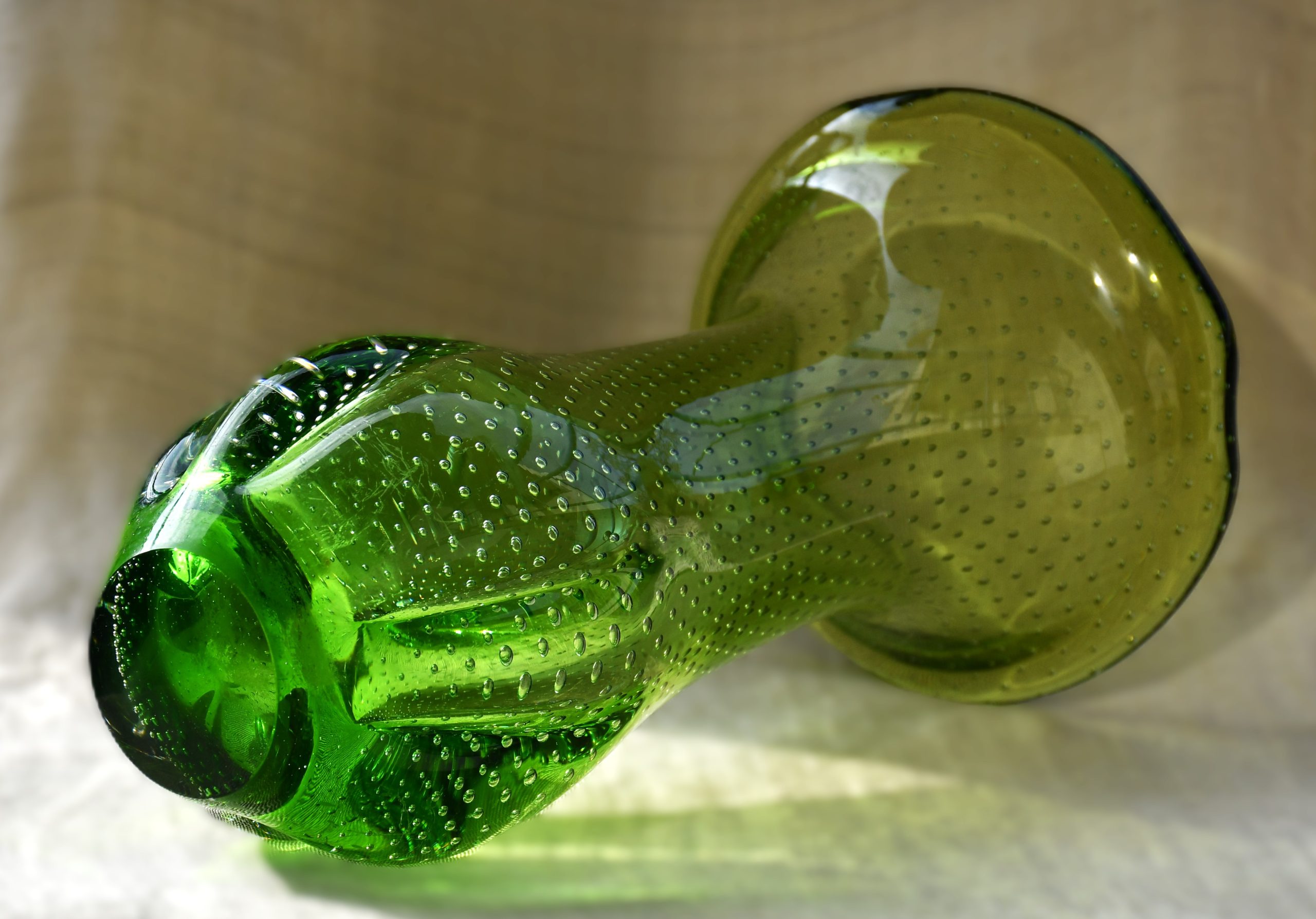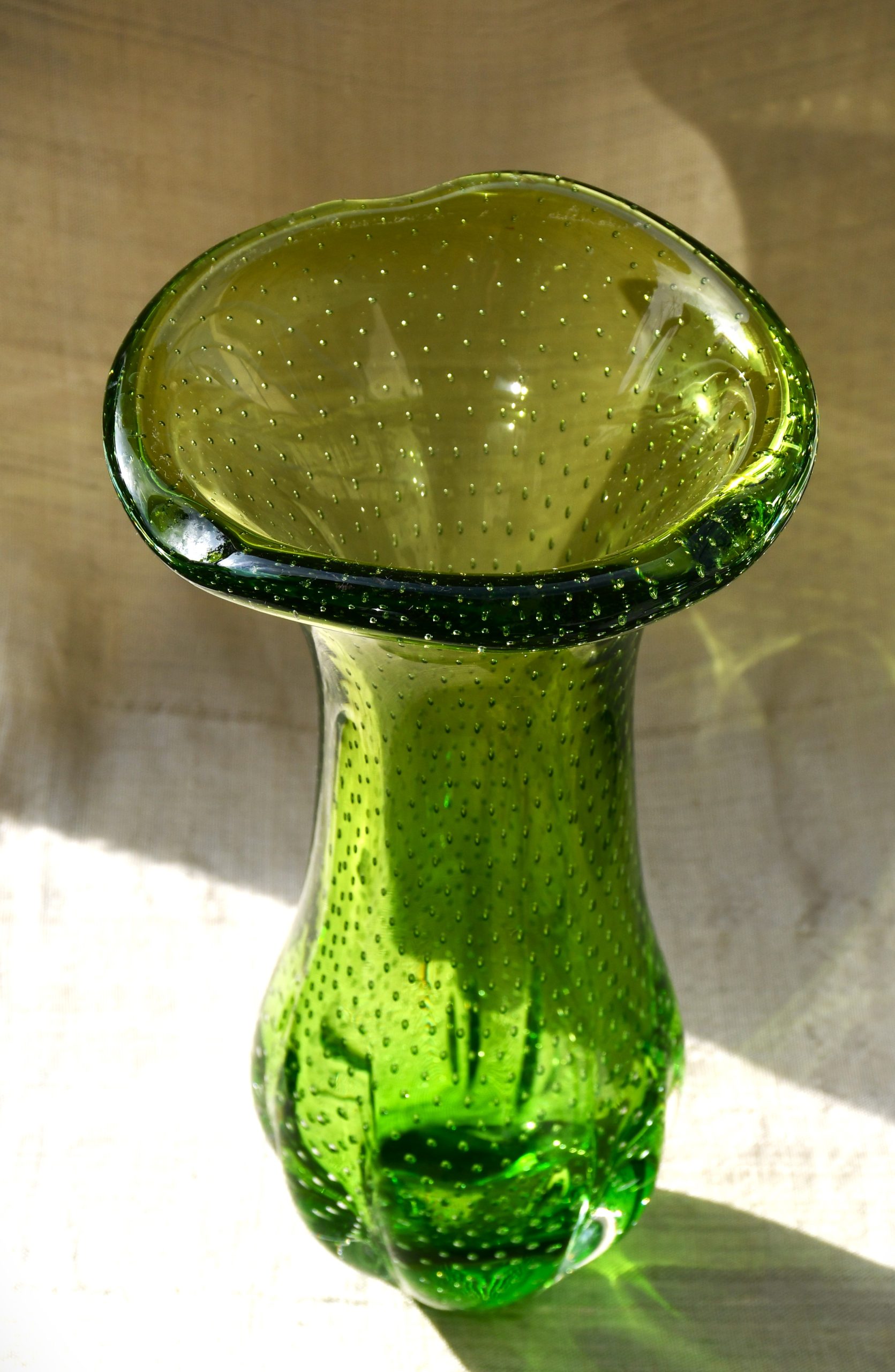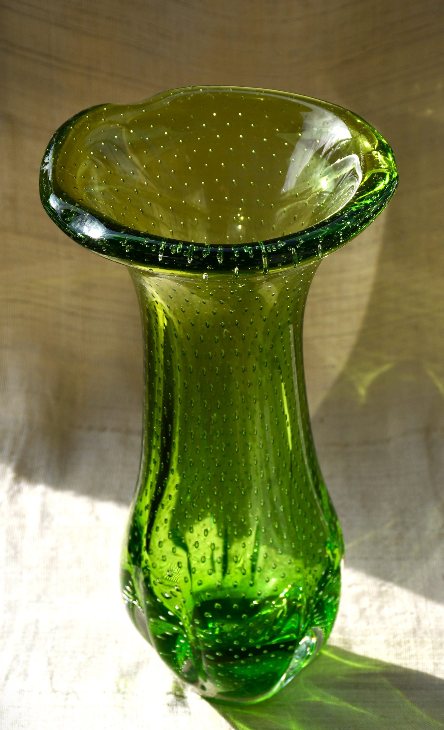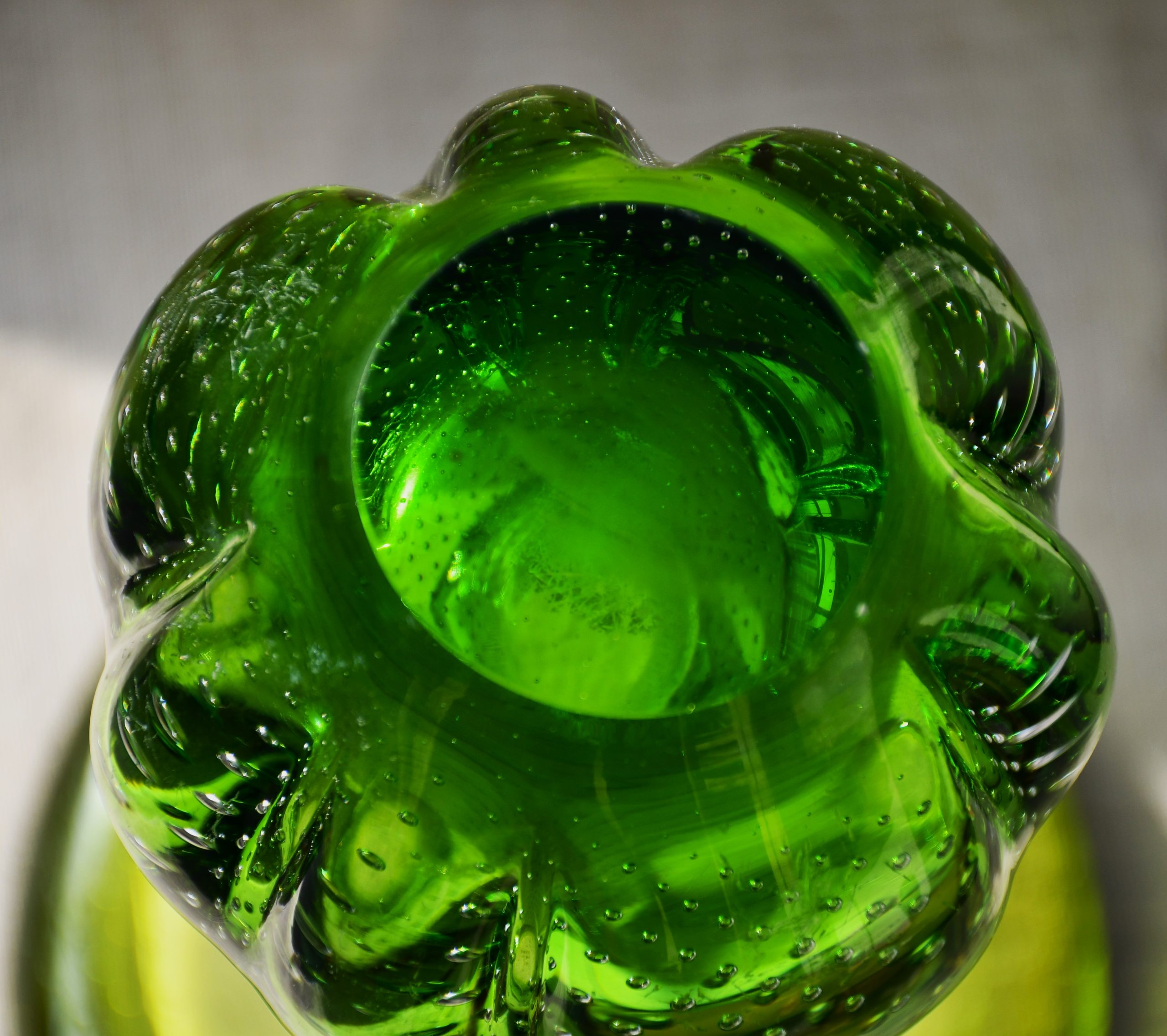 Тази ваза е извънредно специална. Едновременно се използват две техники от висшия пилотаж на занаята – sommerso и bullicante! Мека органична форма с неустоим цвят. В момент на дълбока тишина човек сякаш може да долови звука от капките на зеления пролетен дъжд… Много декоративна, с внушително присъствие в пространството на стаята. Нова и неочаквана от всяка гледна точка.