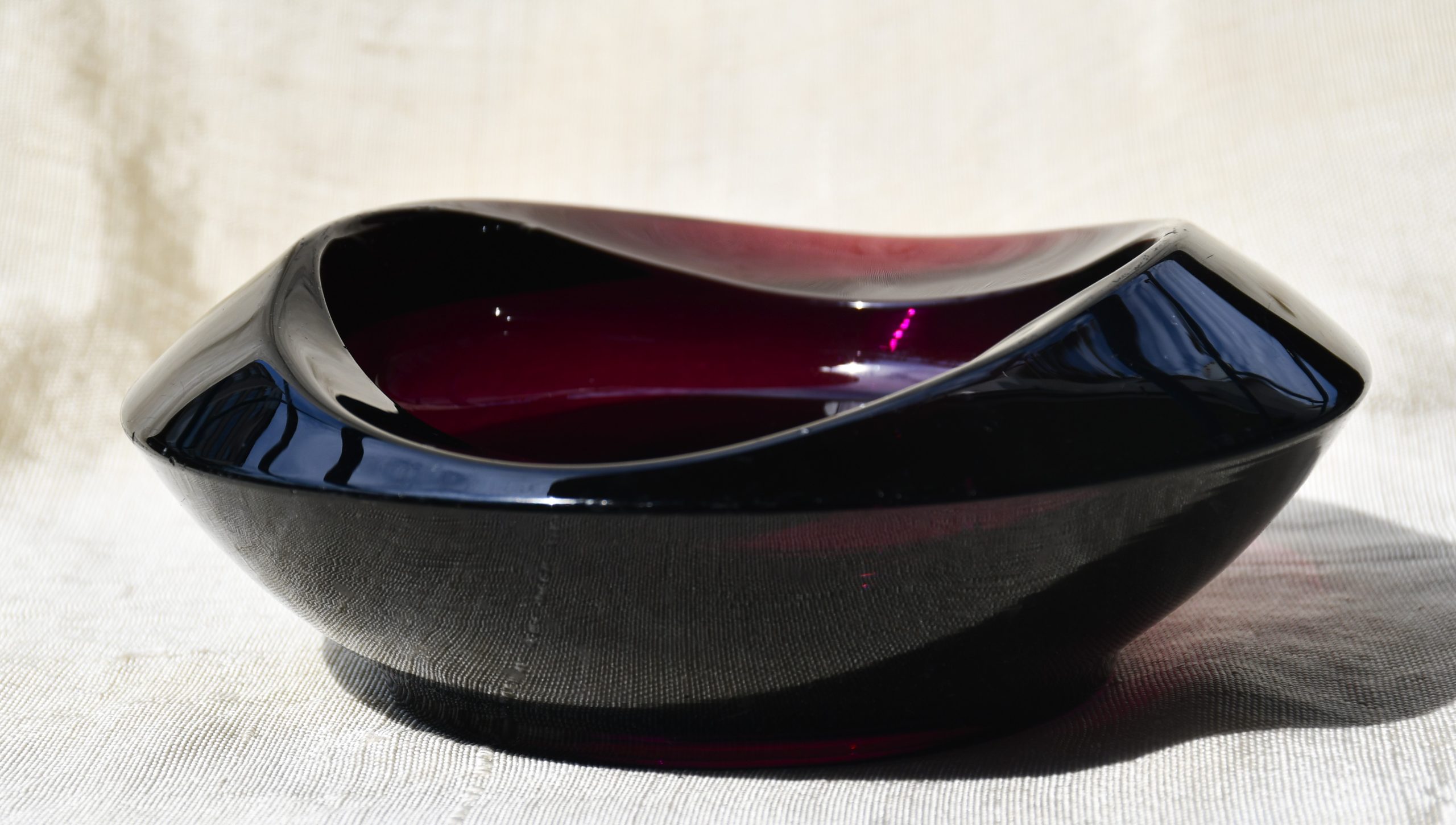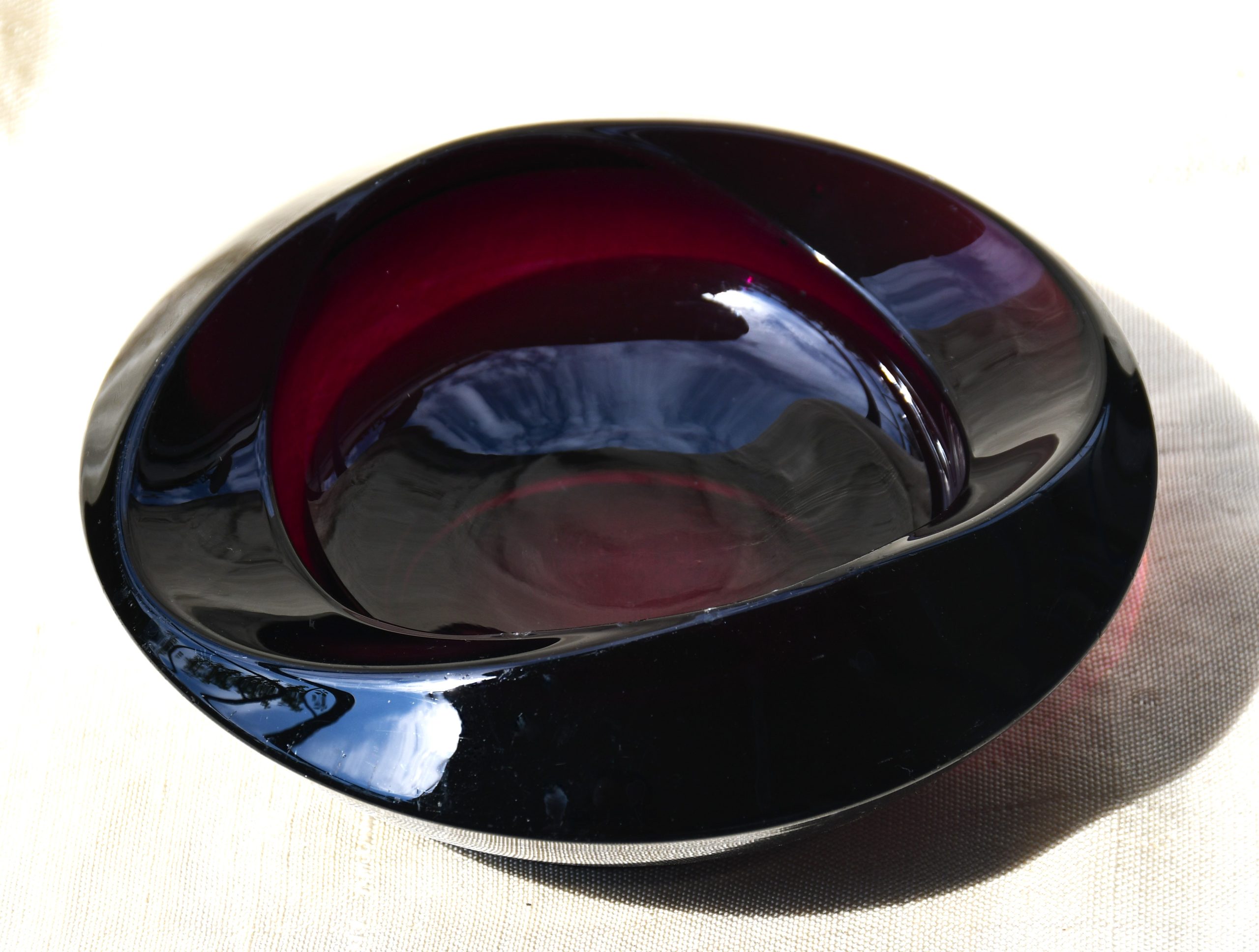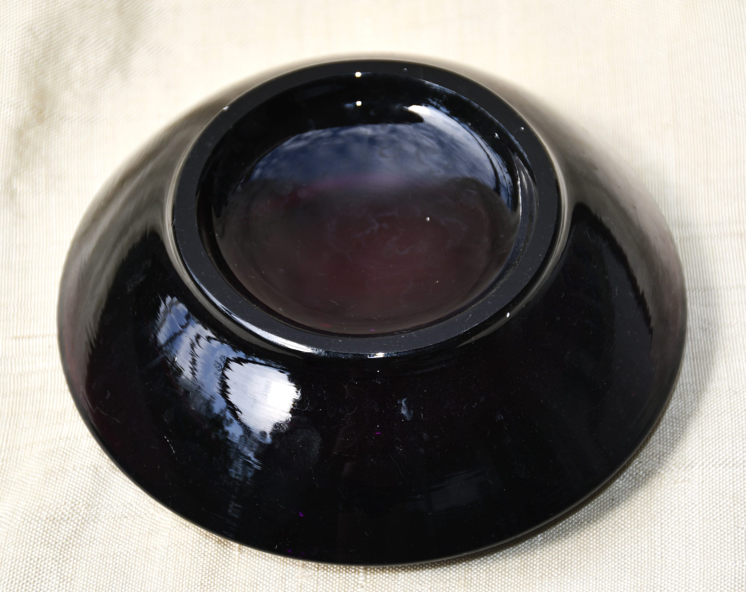 Пресовано стъкло с ръчно полирано дъно. В едри MCM форми, вълнуващ цвят на тъмно виолетов аметист и безупречно владеене на занаята. Тежък и солиден.