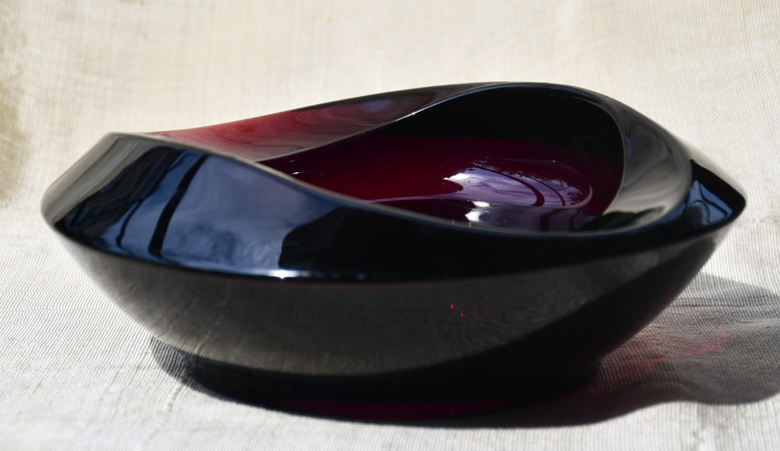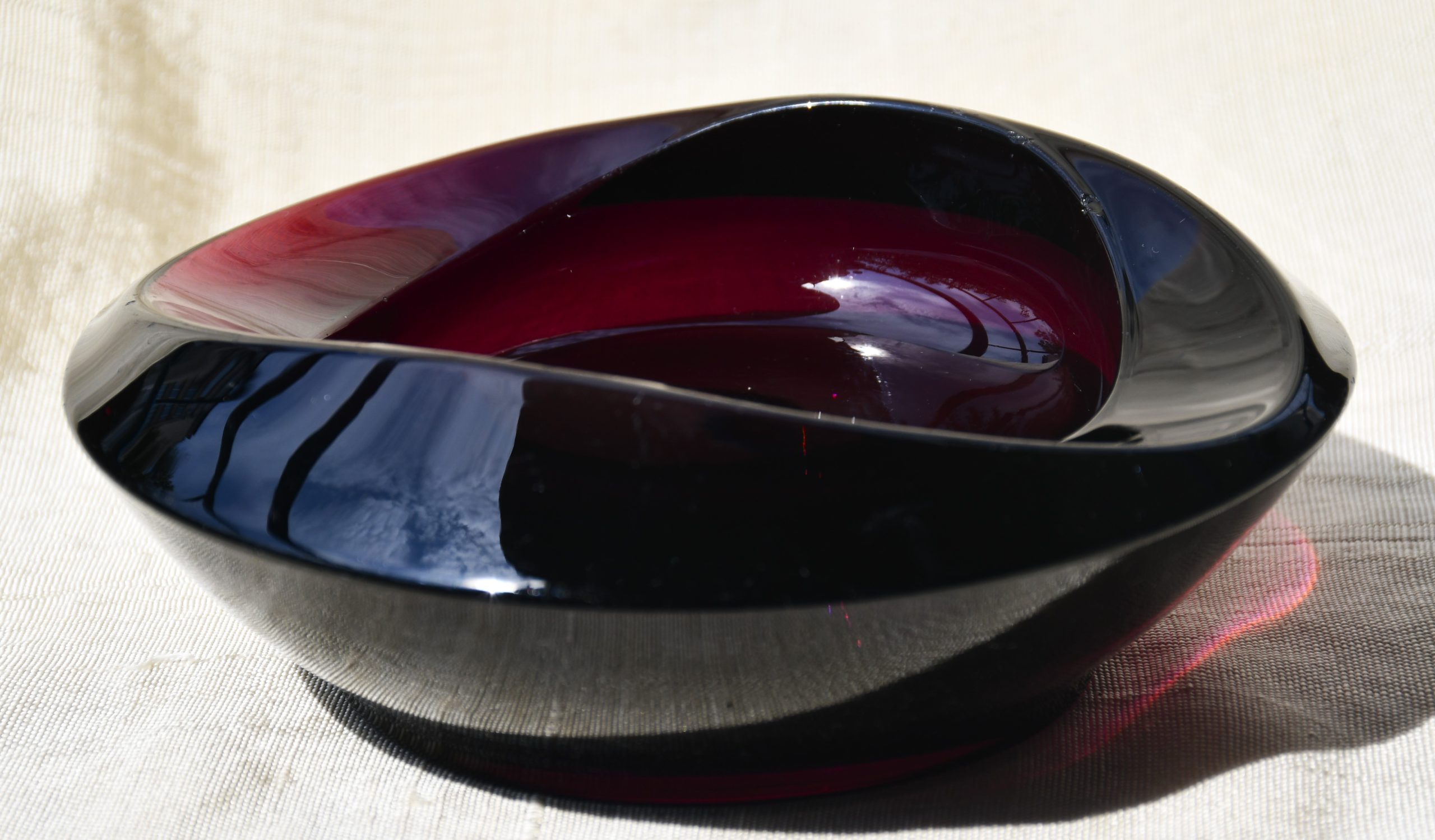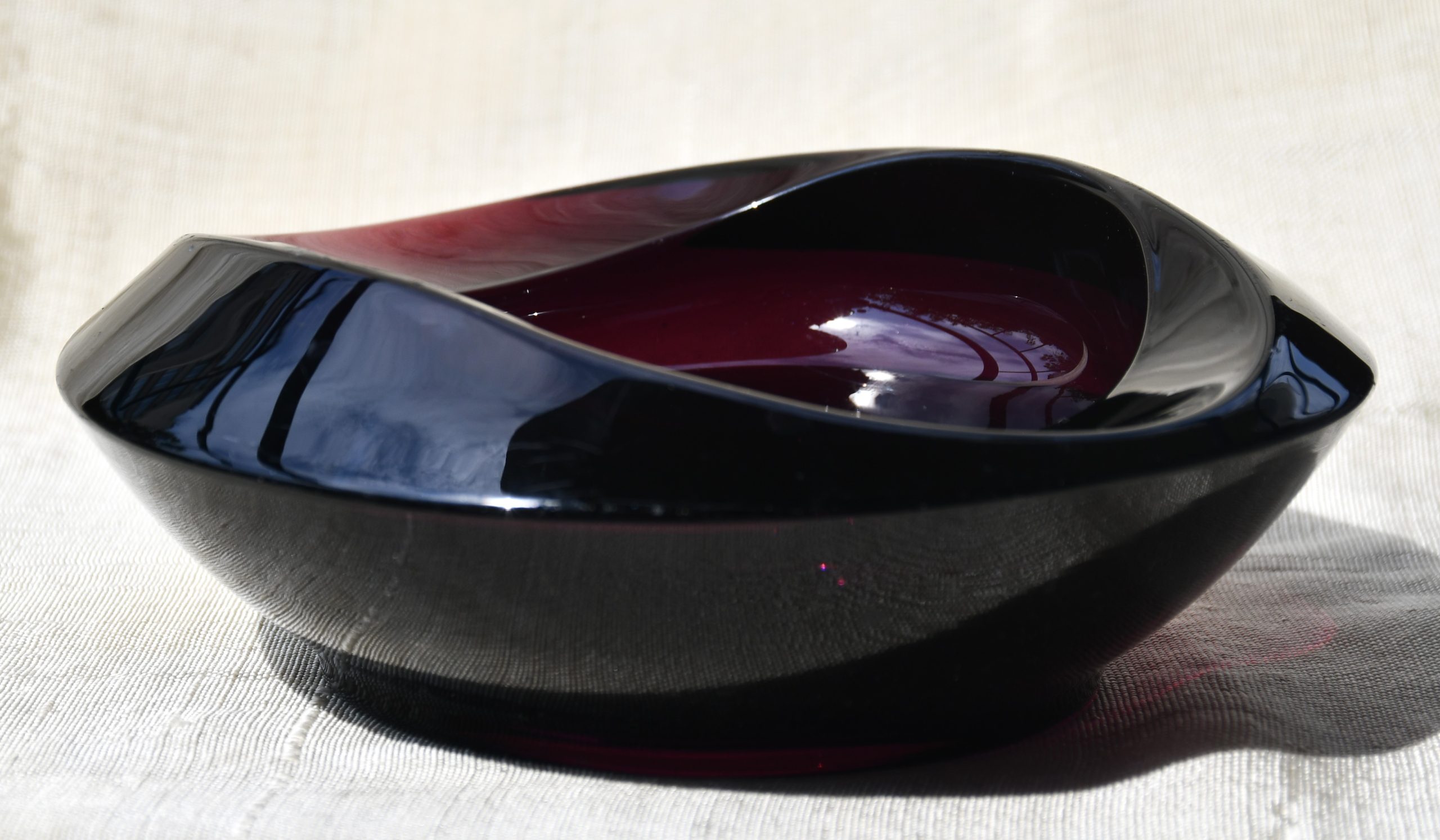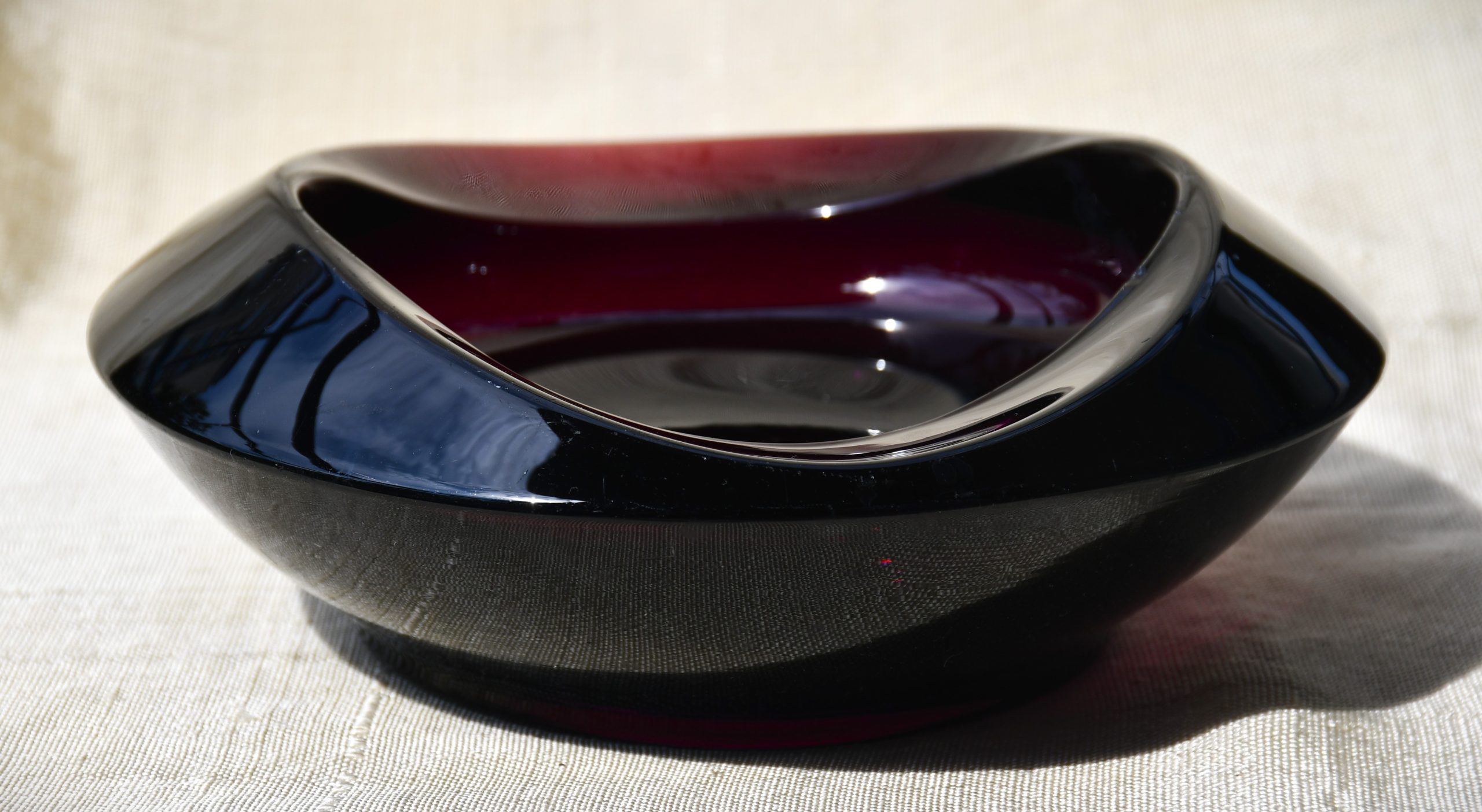 Пресовано стъкло с ръчно полирано дъно. В едри MCM форми, вълнуващ цвят на тъмно виолетов аметист и безупречно владеене на занаята. Тежък и солиден.