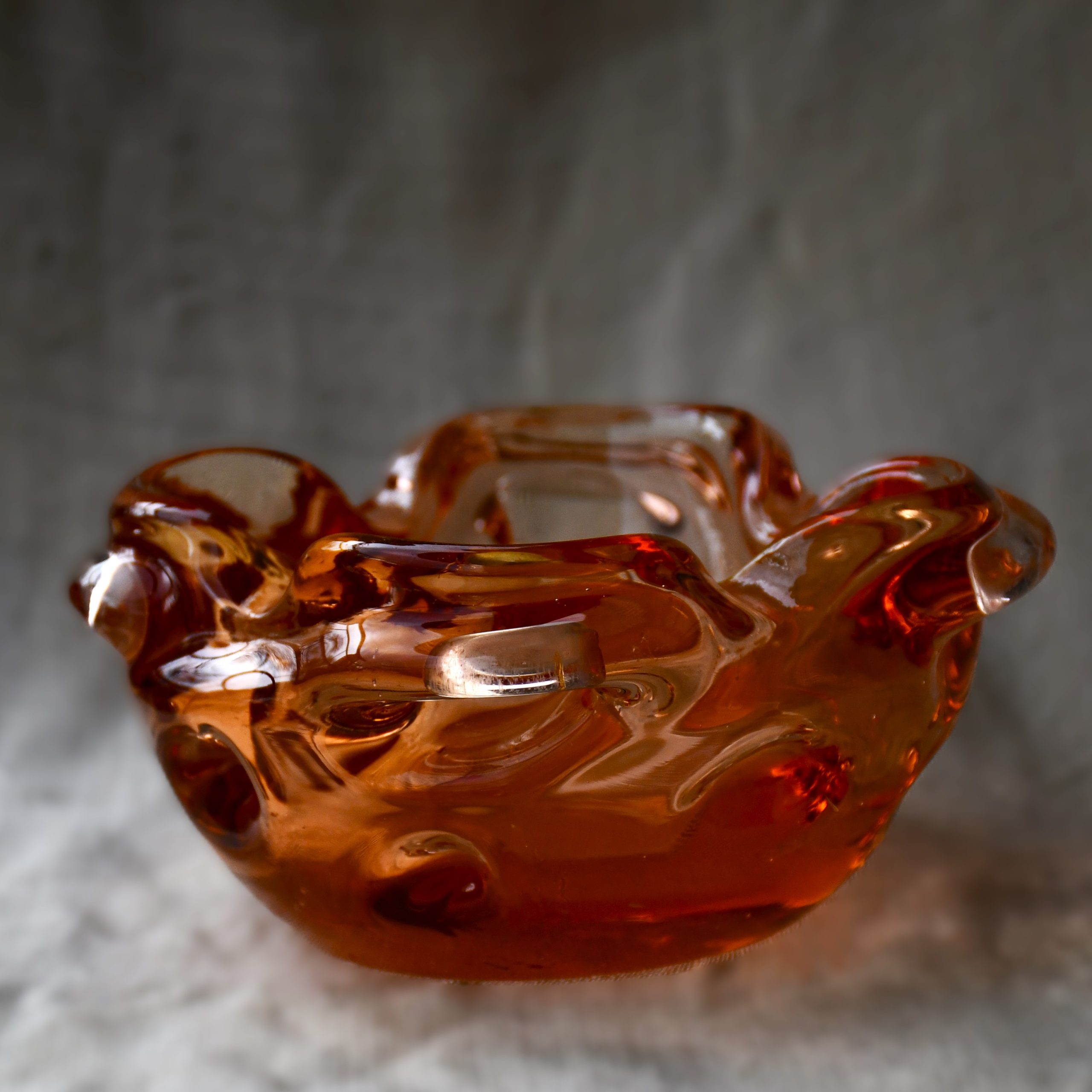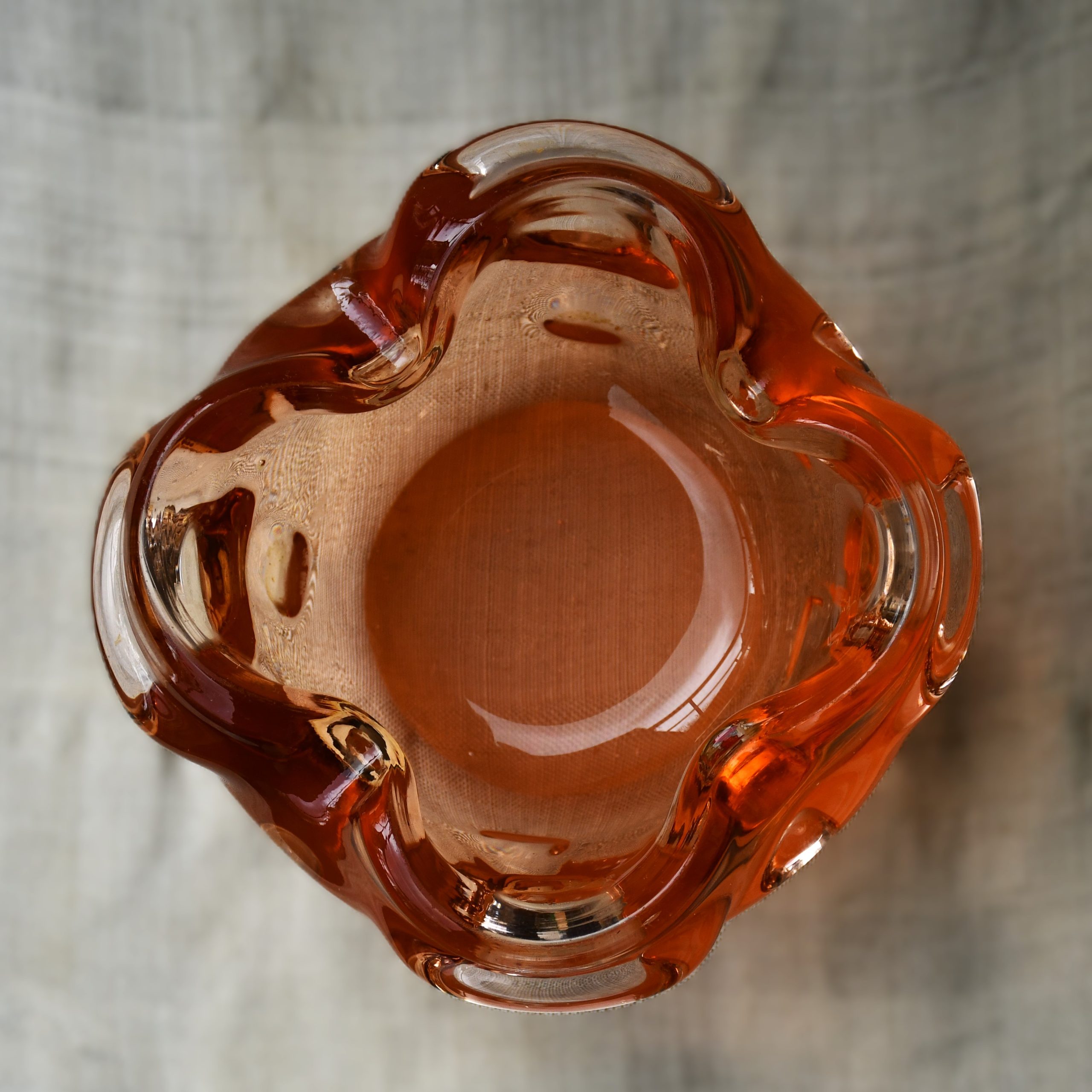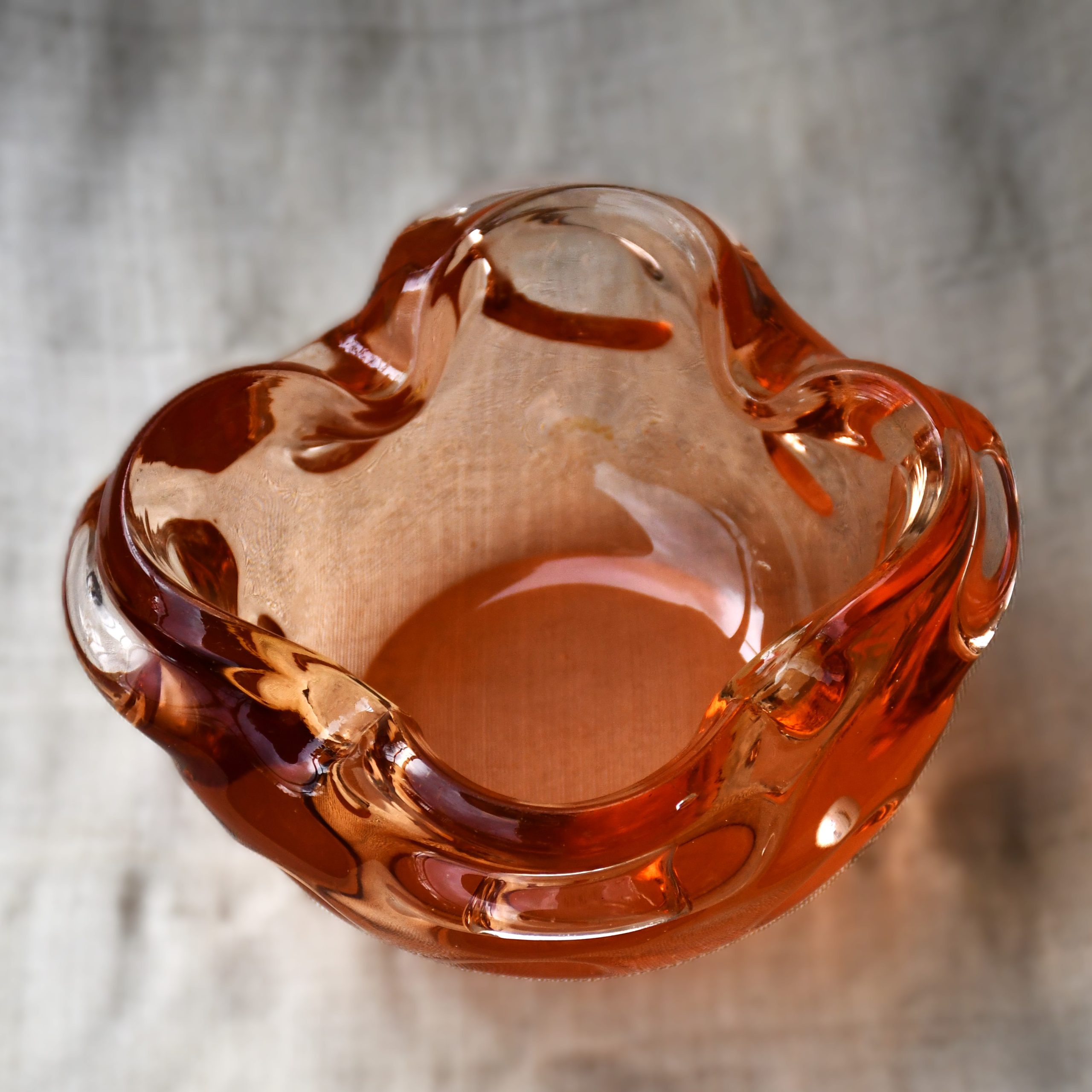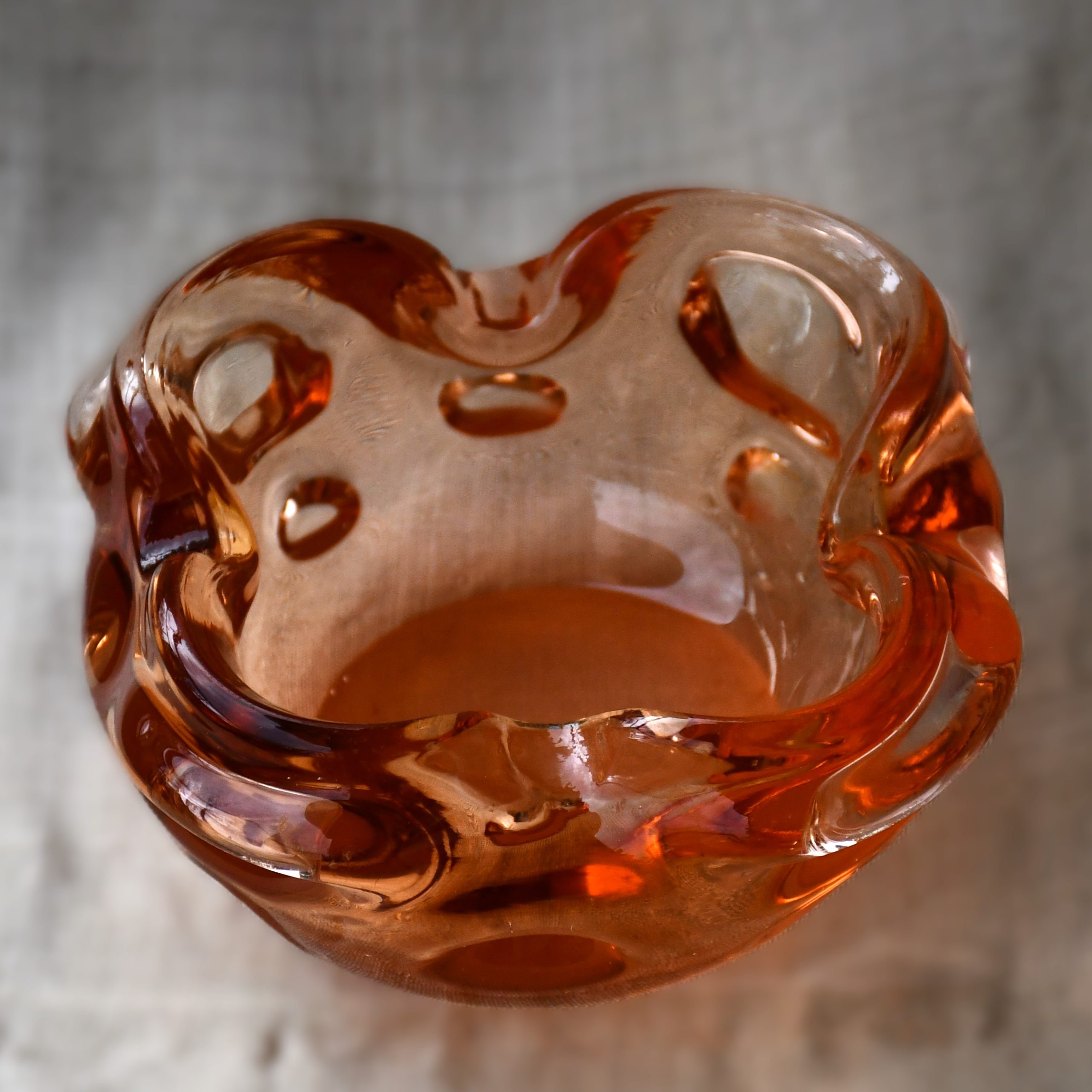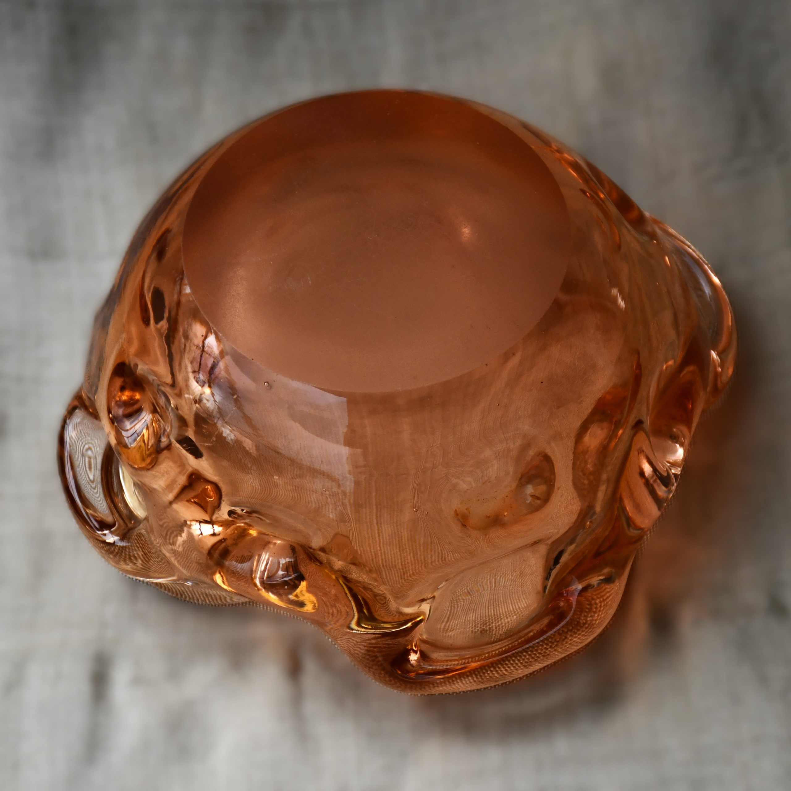 Много красив пепелник/centrepiece от светло карамелено стъкло. Голям размер. Midcentury-modern дизайн. Датировка 1960-те. Ръчно работено стъкло с ръчна шлифовка на дъното. Авторска работа на Jan Beranek, един от най-значимите чешки артисти в стъклото за 20-и век.