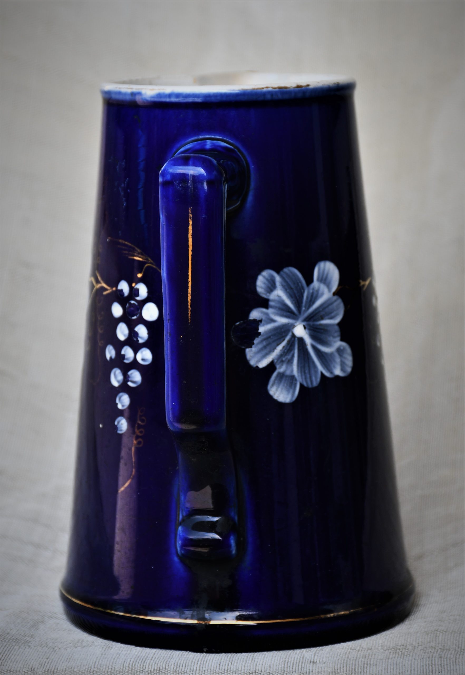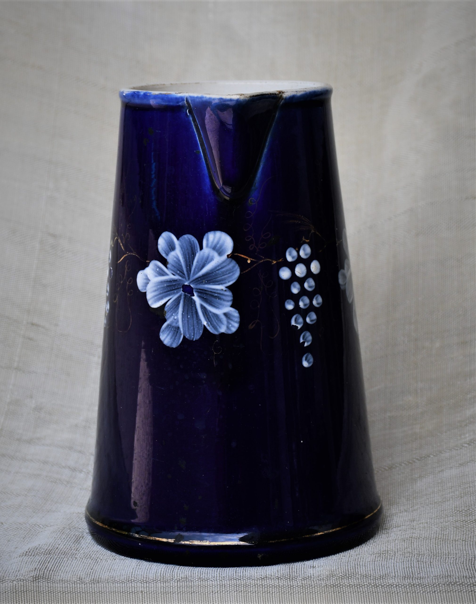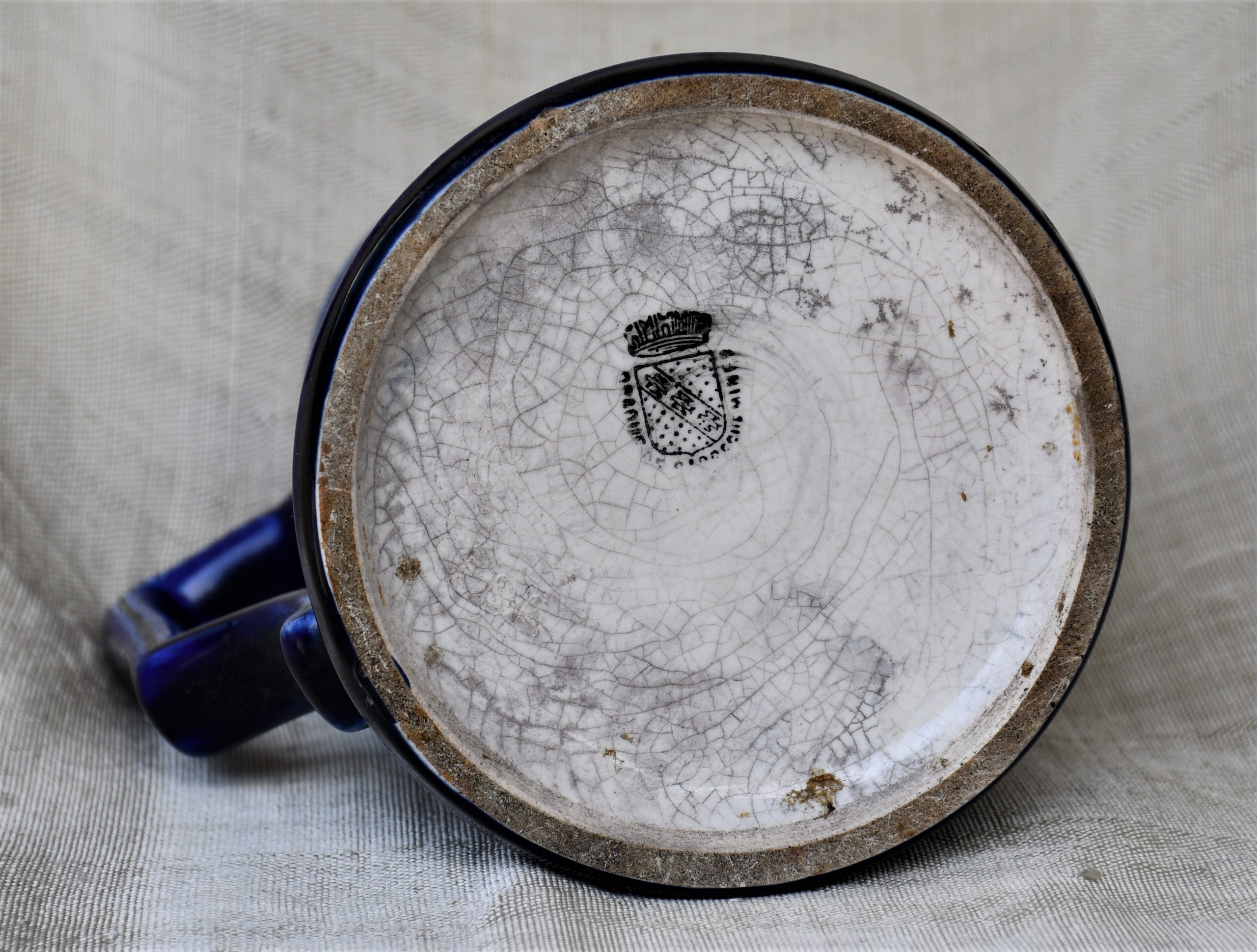 Датировка: късен 19-и век, Франция. Материал: фаянс с глазура. Кобалтов финиш отвън с флорална декорация. Вътре и дъното – бяло, което вече не е съвсем бяло.