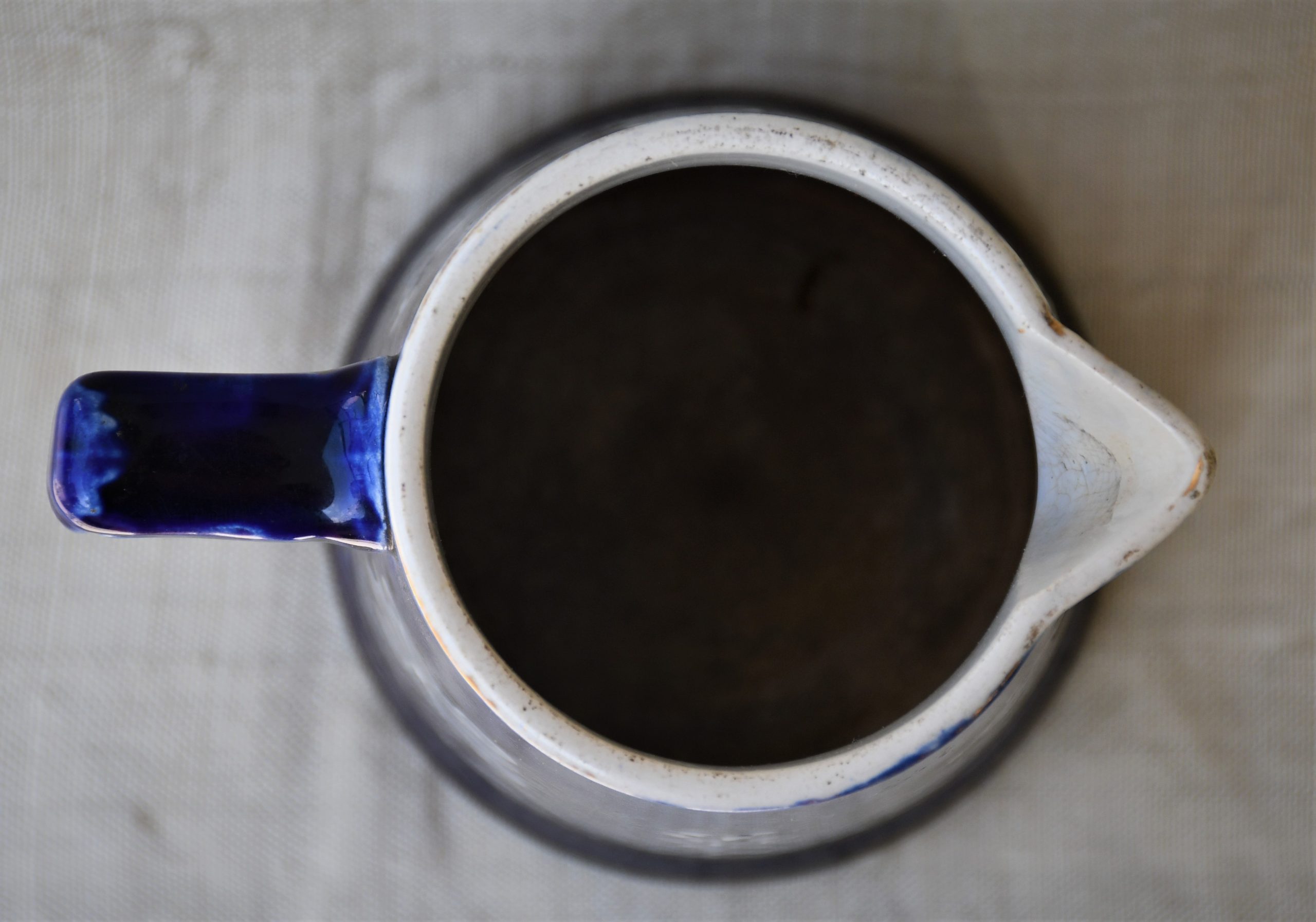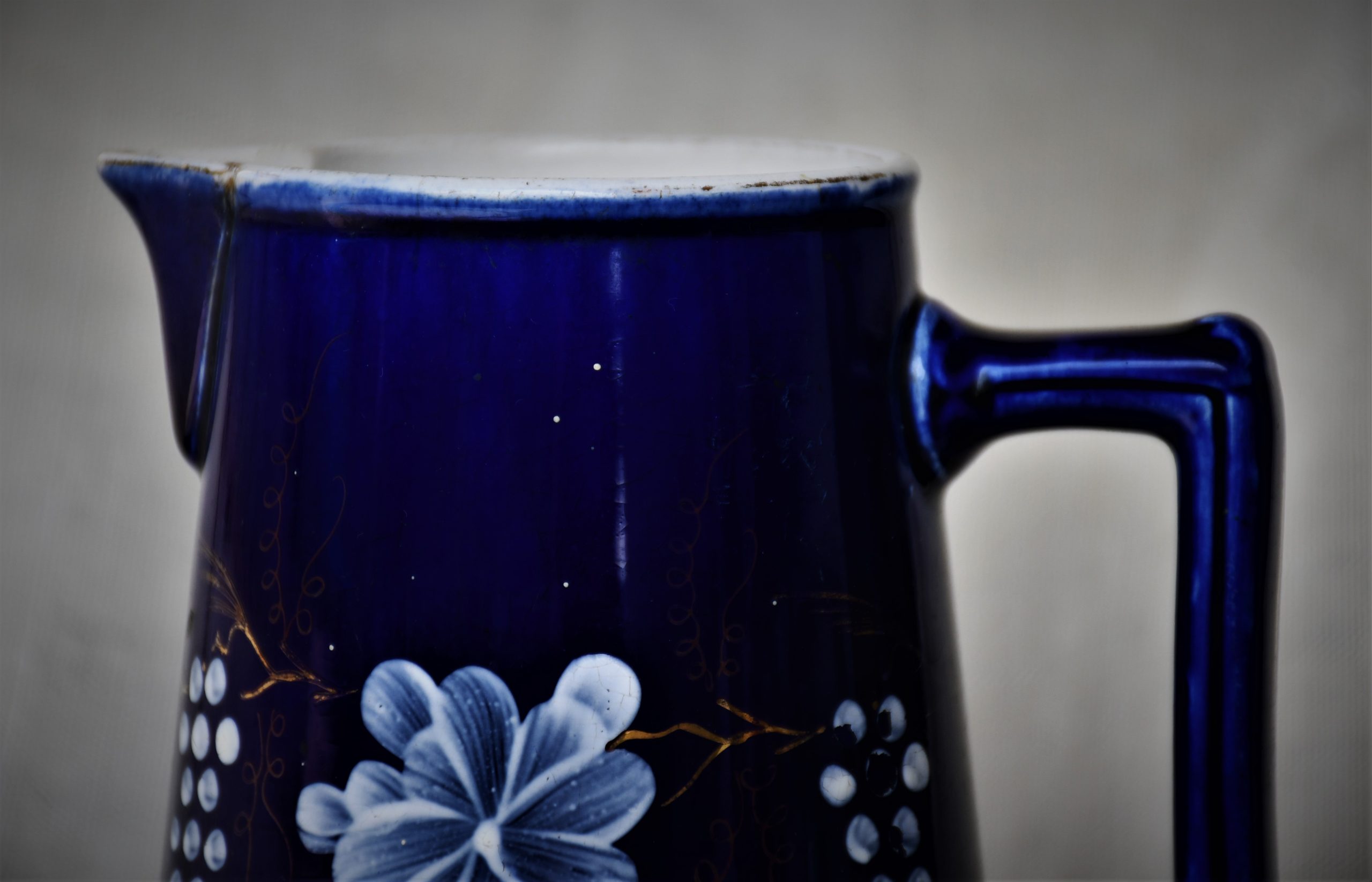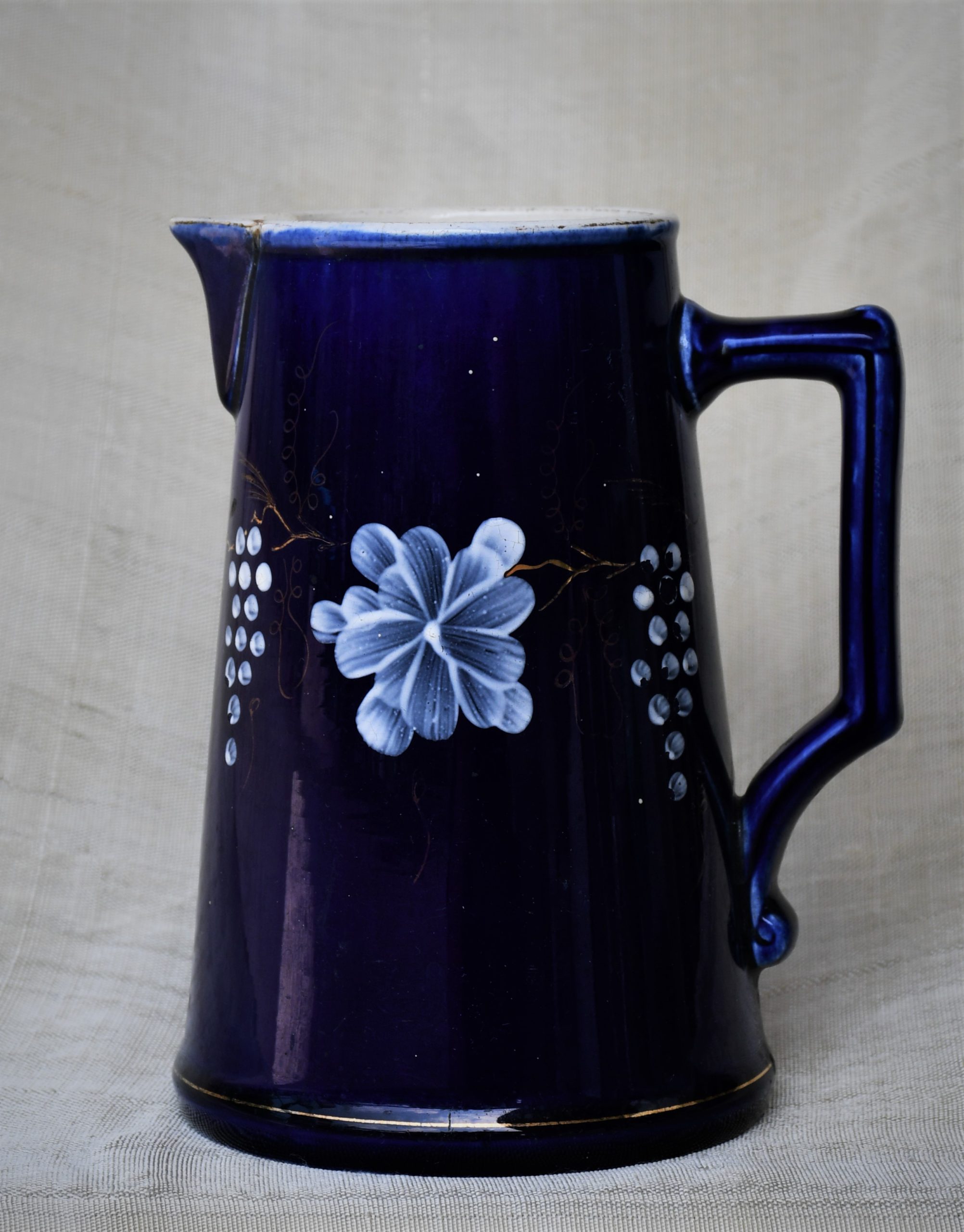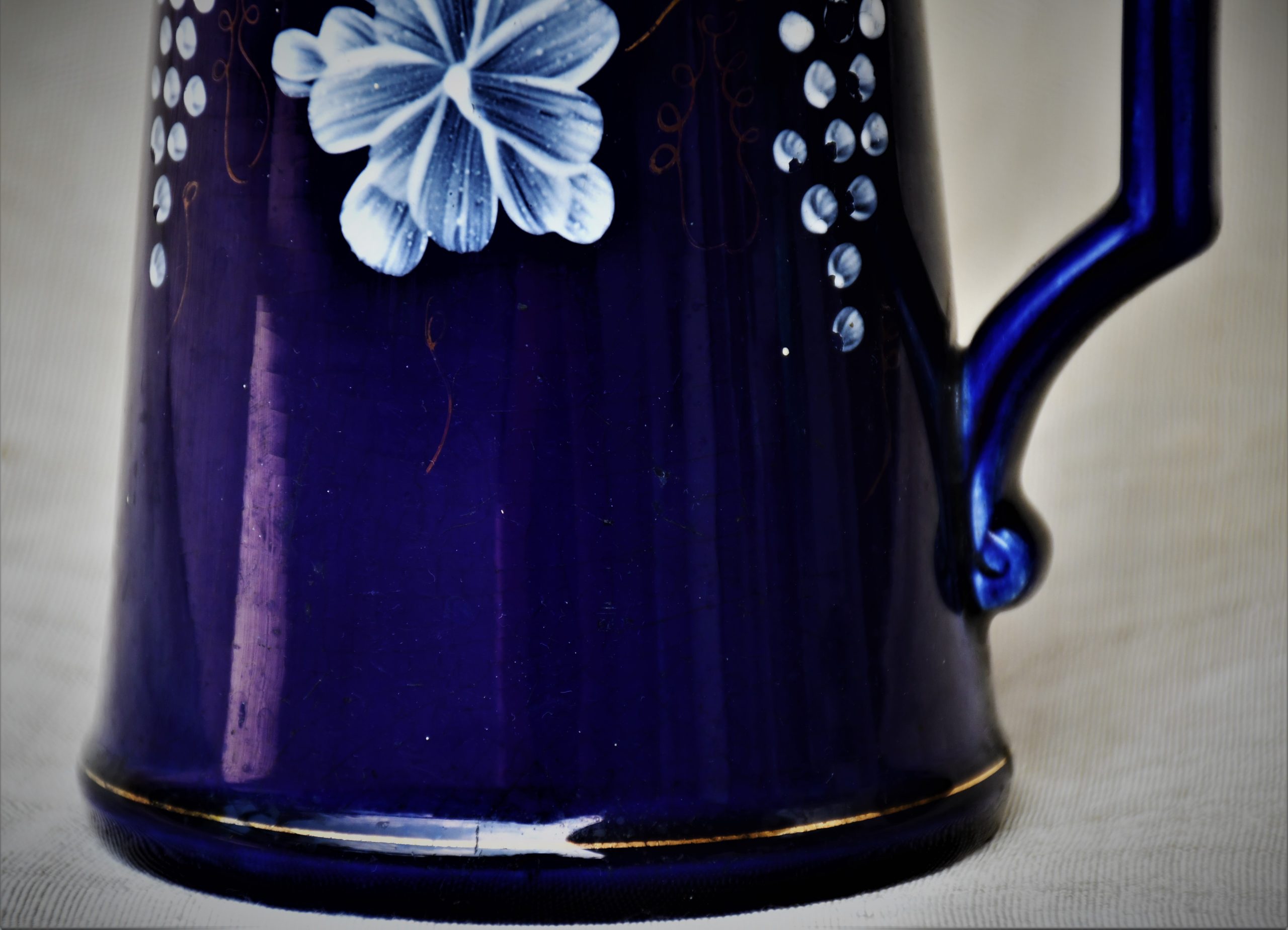 Датировка: късен 19-и век, Франция. Материал: фаянс с глазура. Кобалтов финиш отвън с флорална декорация. Вътре и дъното – бяло, което вече не е съвсем бяло.
