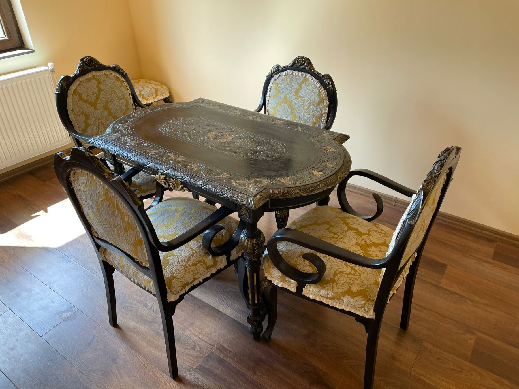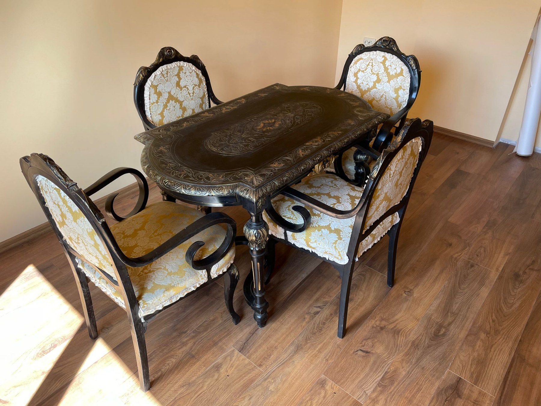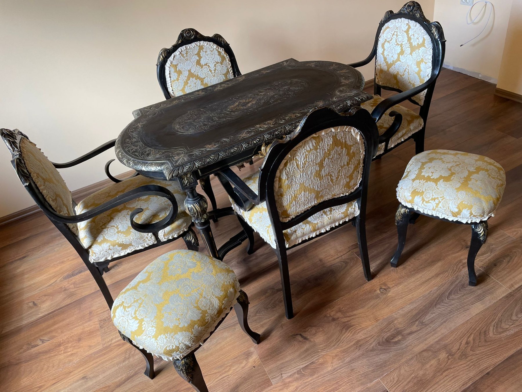Комплектът се състои от маса, 4 стола и 2 табуретки. Изцяло ръчна работа с много резба. Дамаската е сменена с нова.