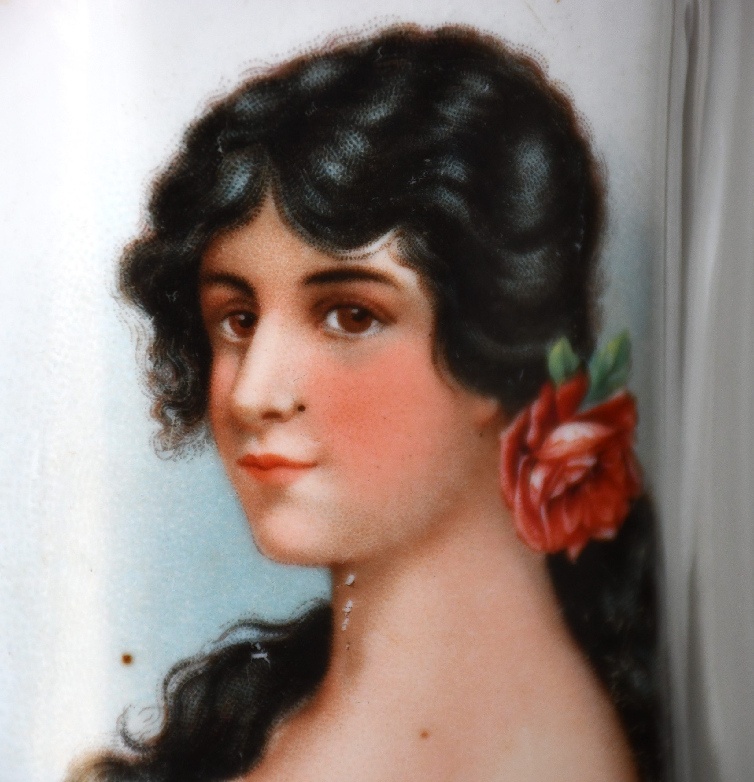 Богата украса, в чийто център е портретът на млада и атрактивна жена. Релефни елементи в горната и долната част.