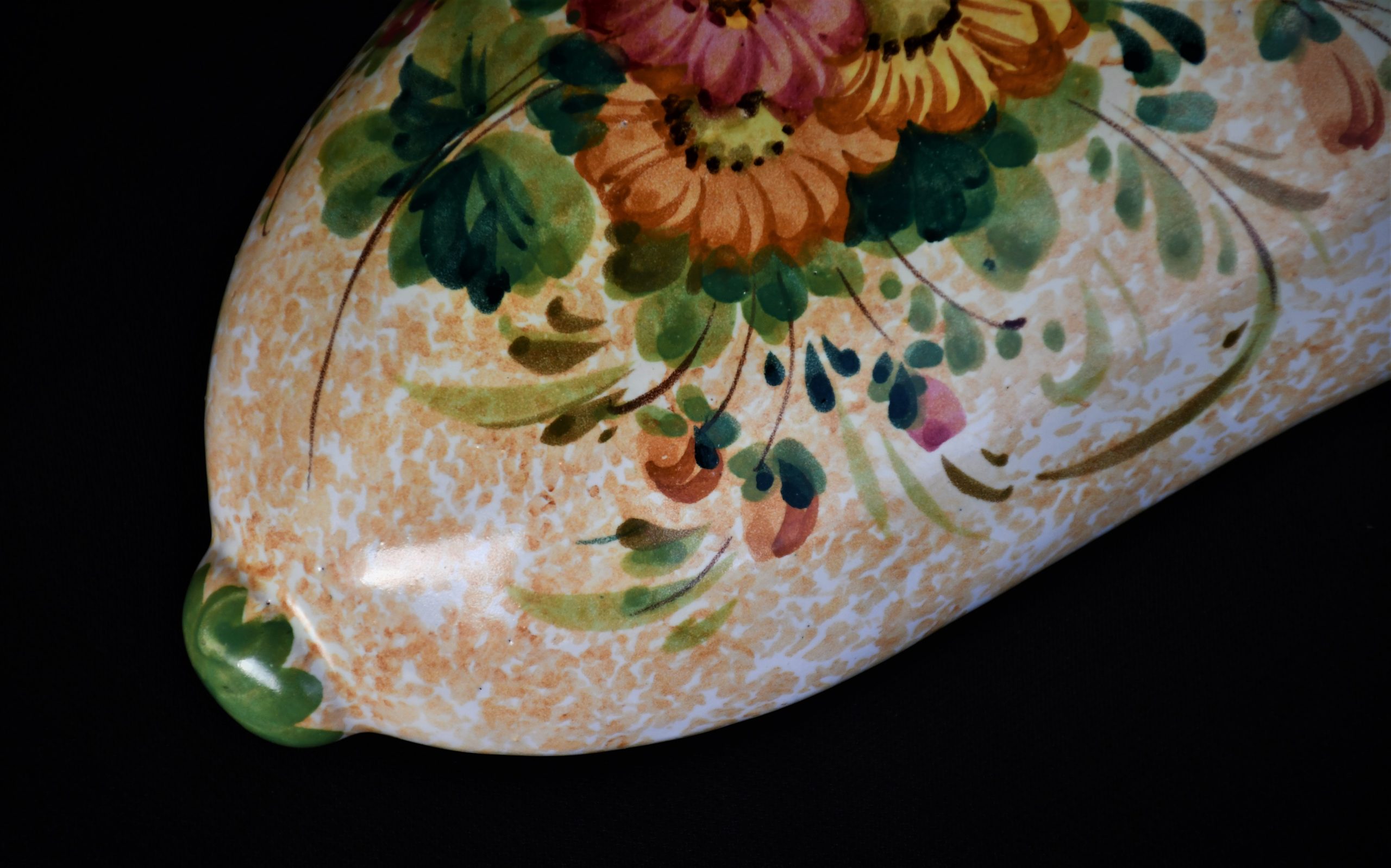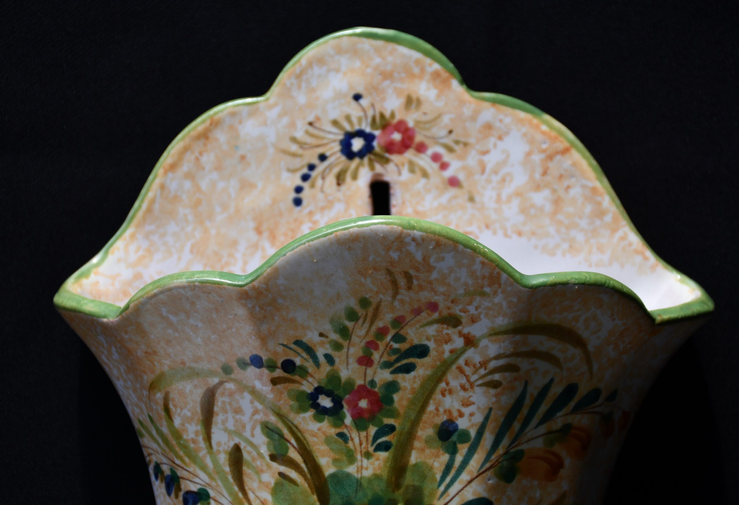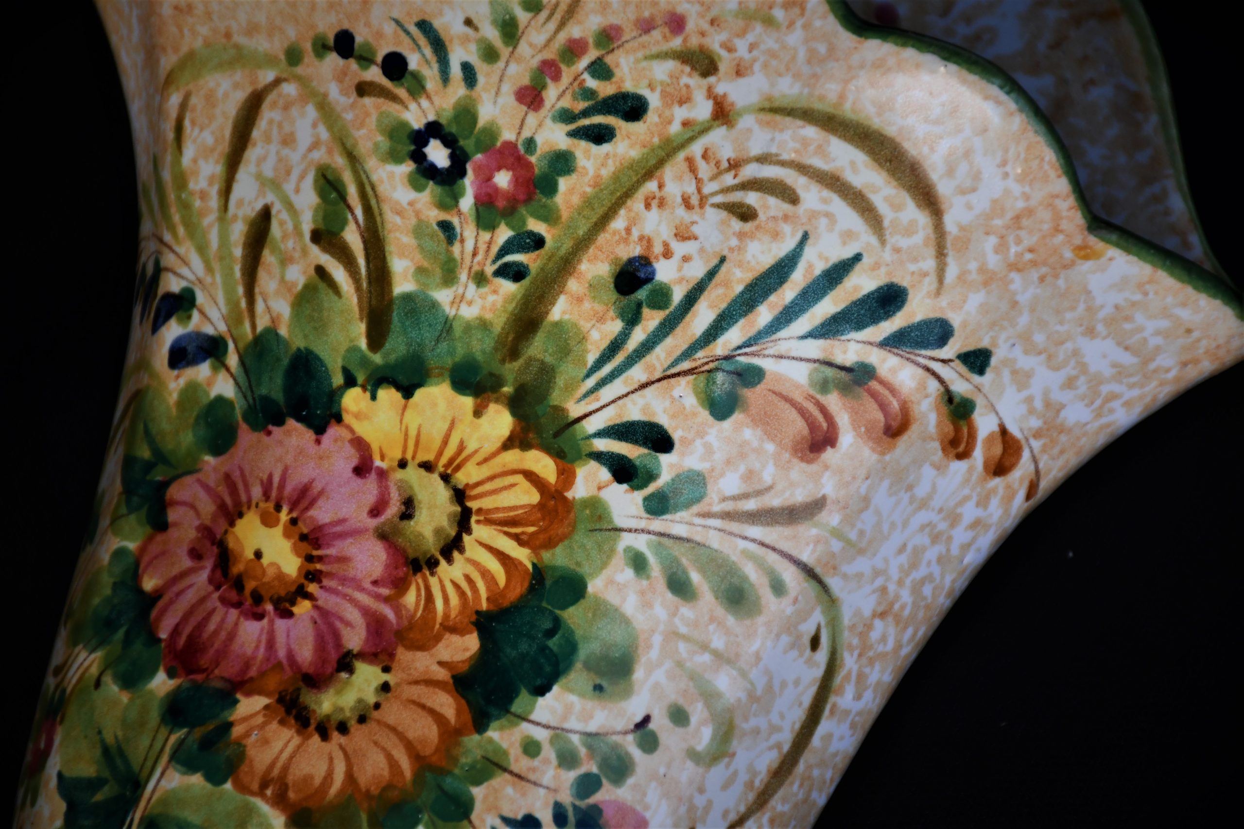 Превъзходна и изключително декоративна стенна ваза. Глазирана керамика в традиционния тоскански стил. Богато украсена с изображения на цветя. Рядка находка.