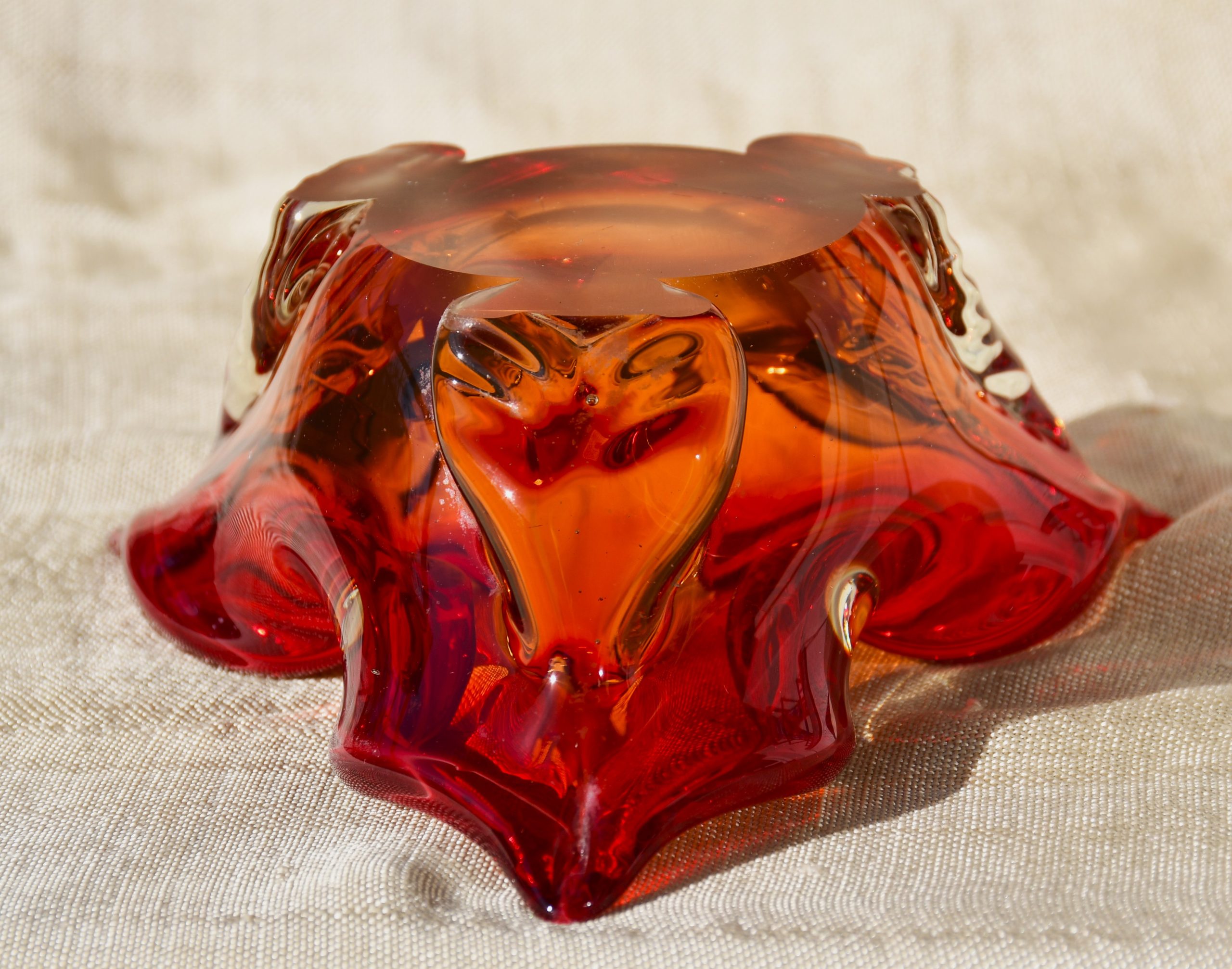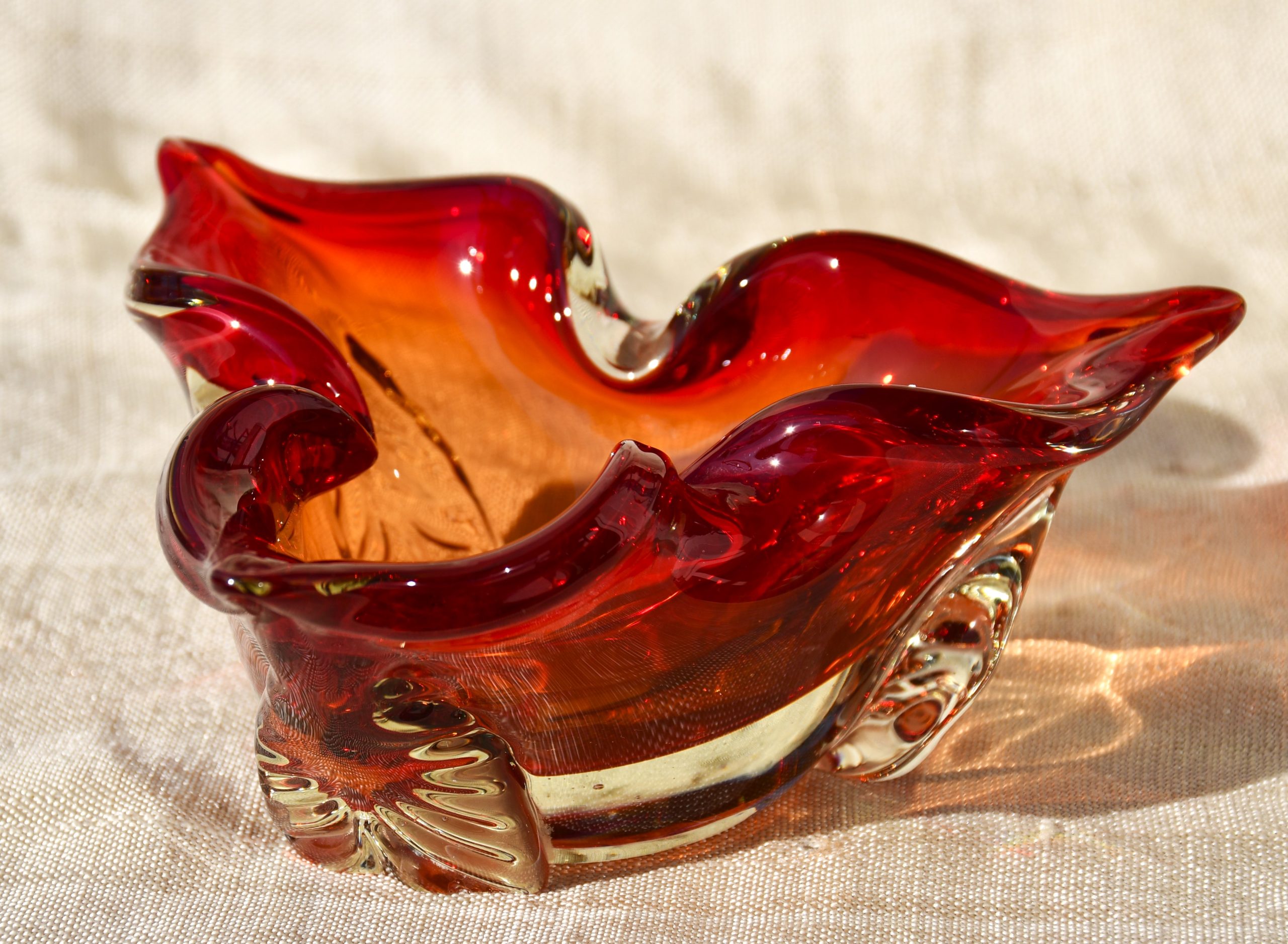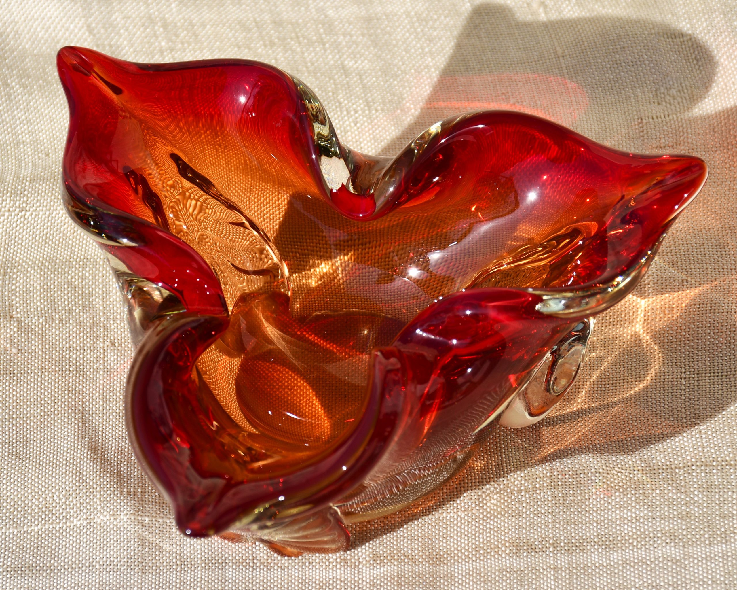 Много красив стъклен пепелник от средата на 20 в., художествено стъкло. Предполагаемо – Мурано, Италия.