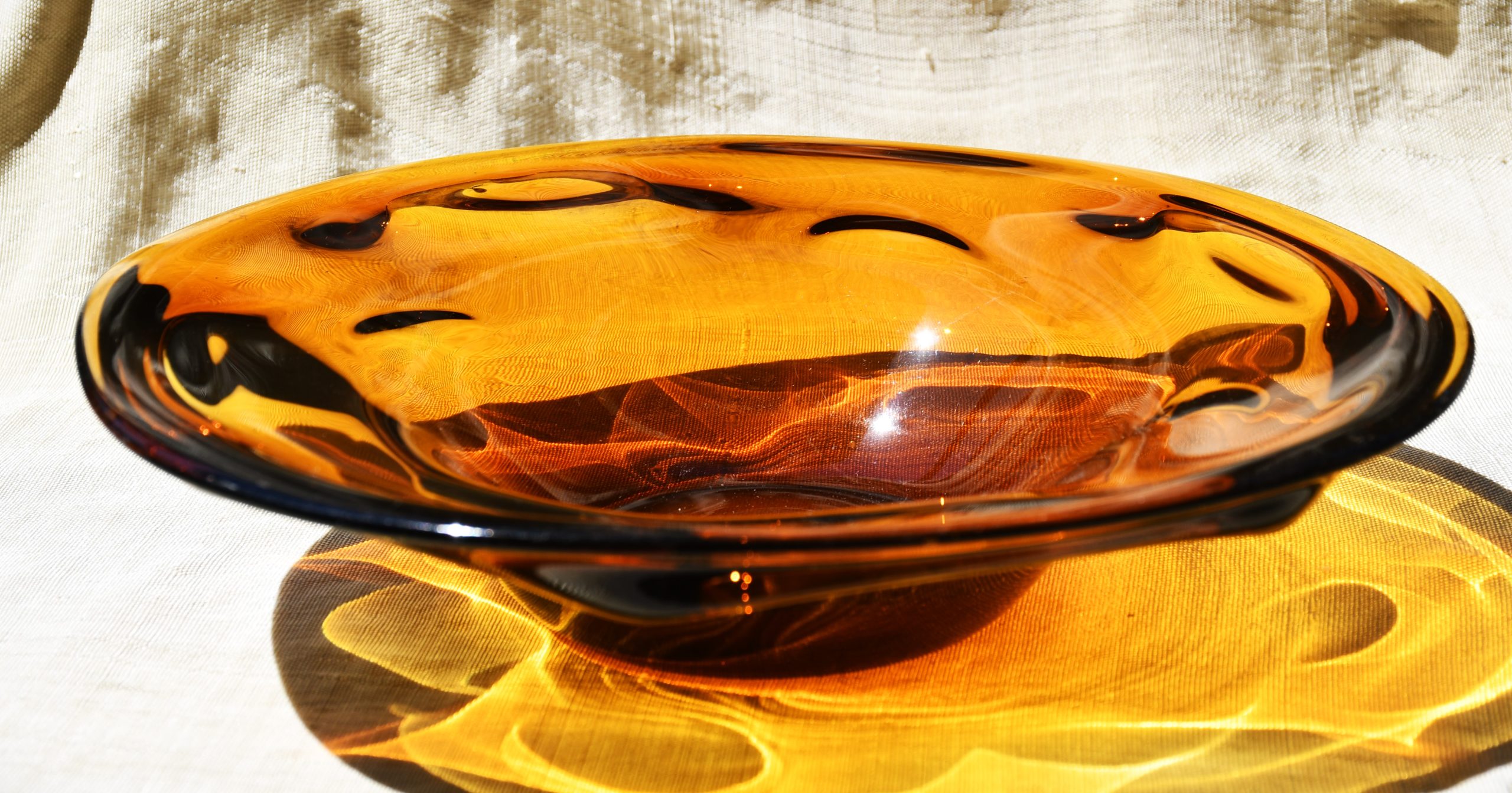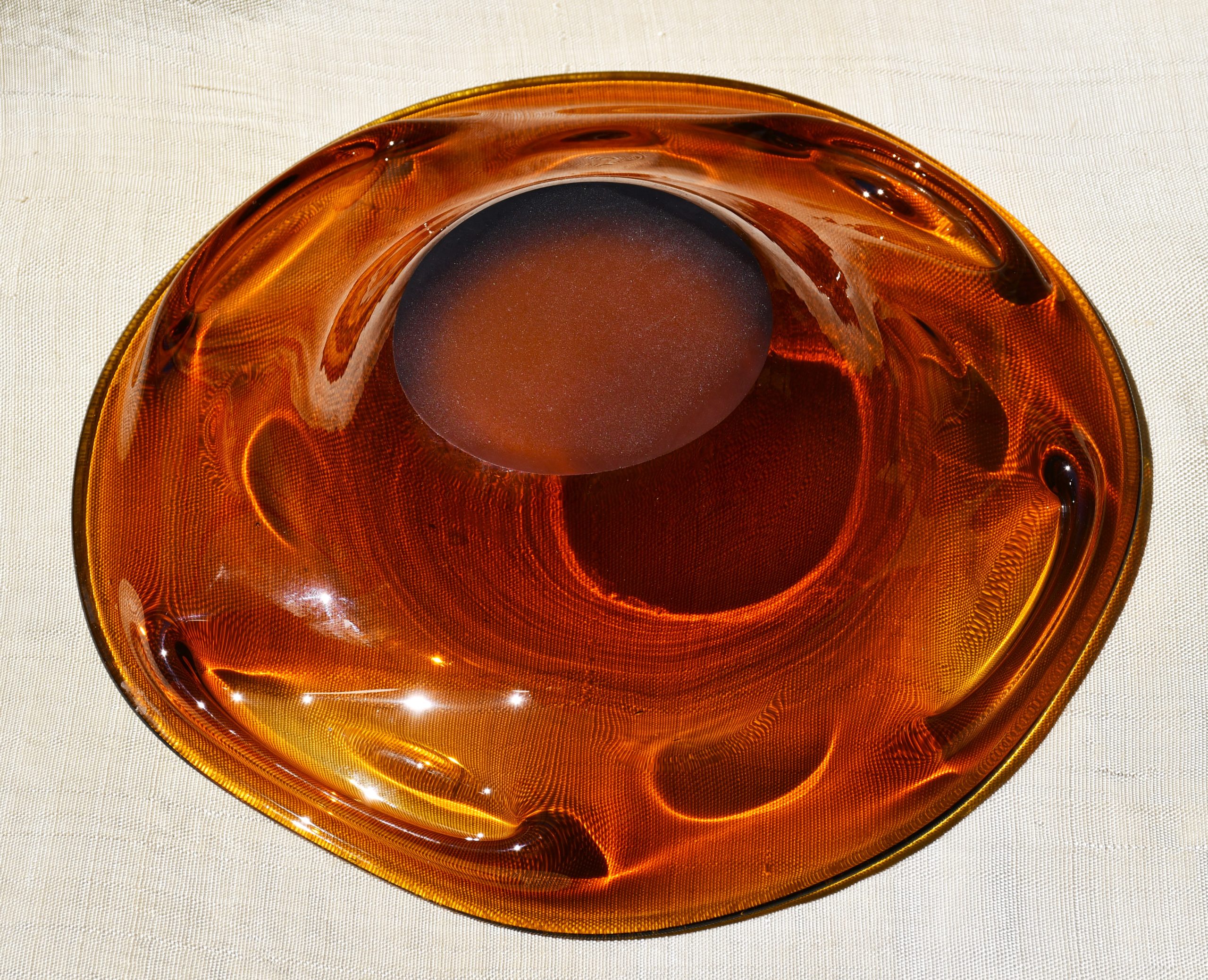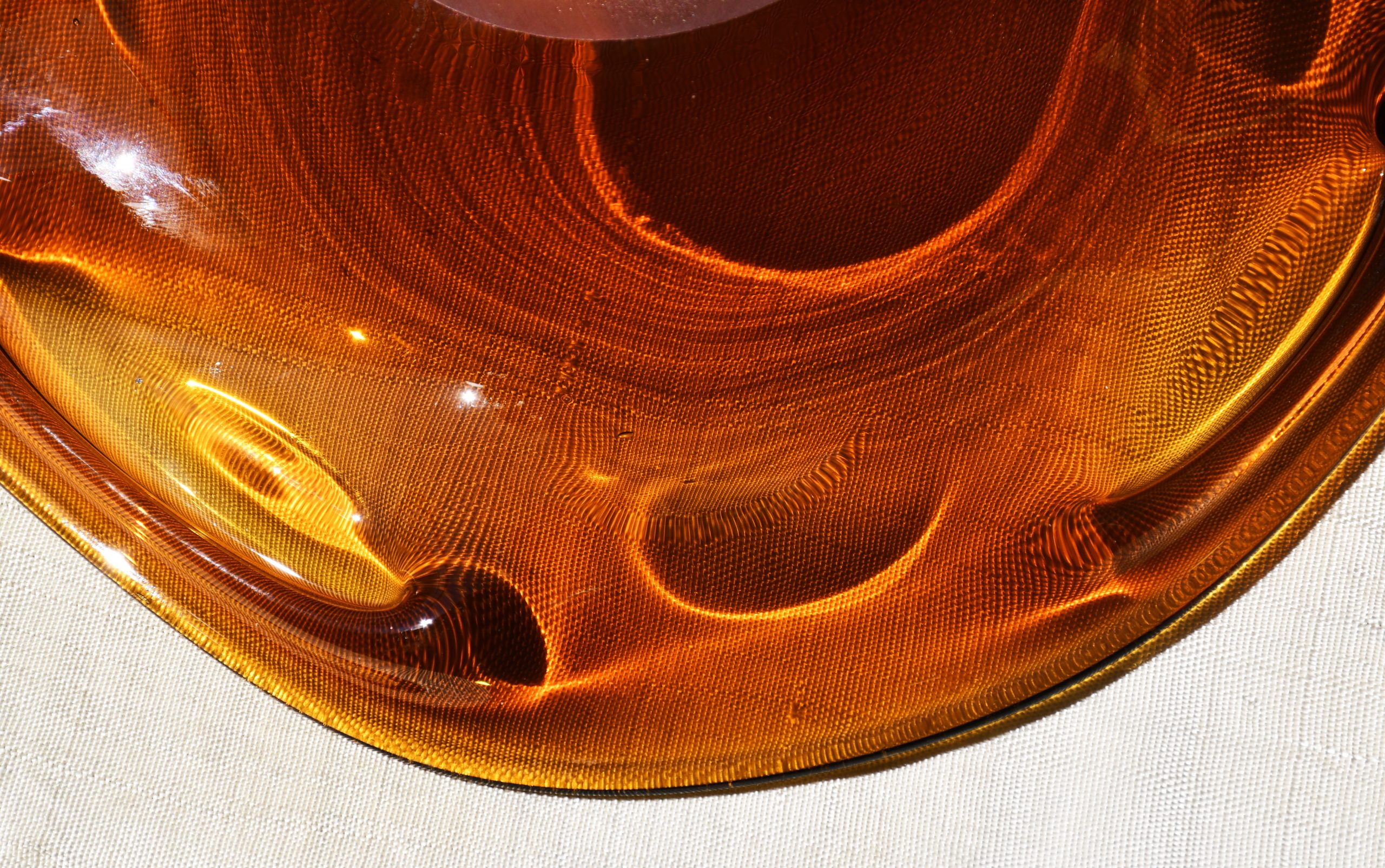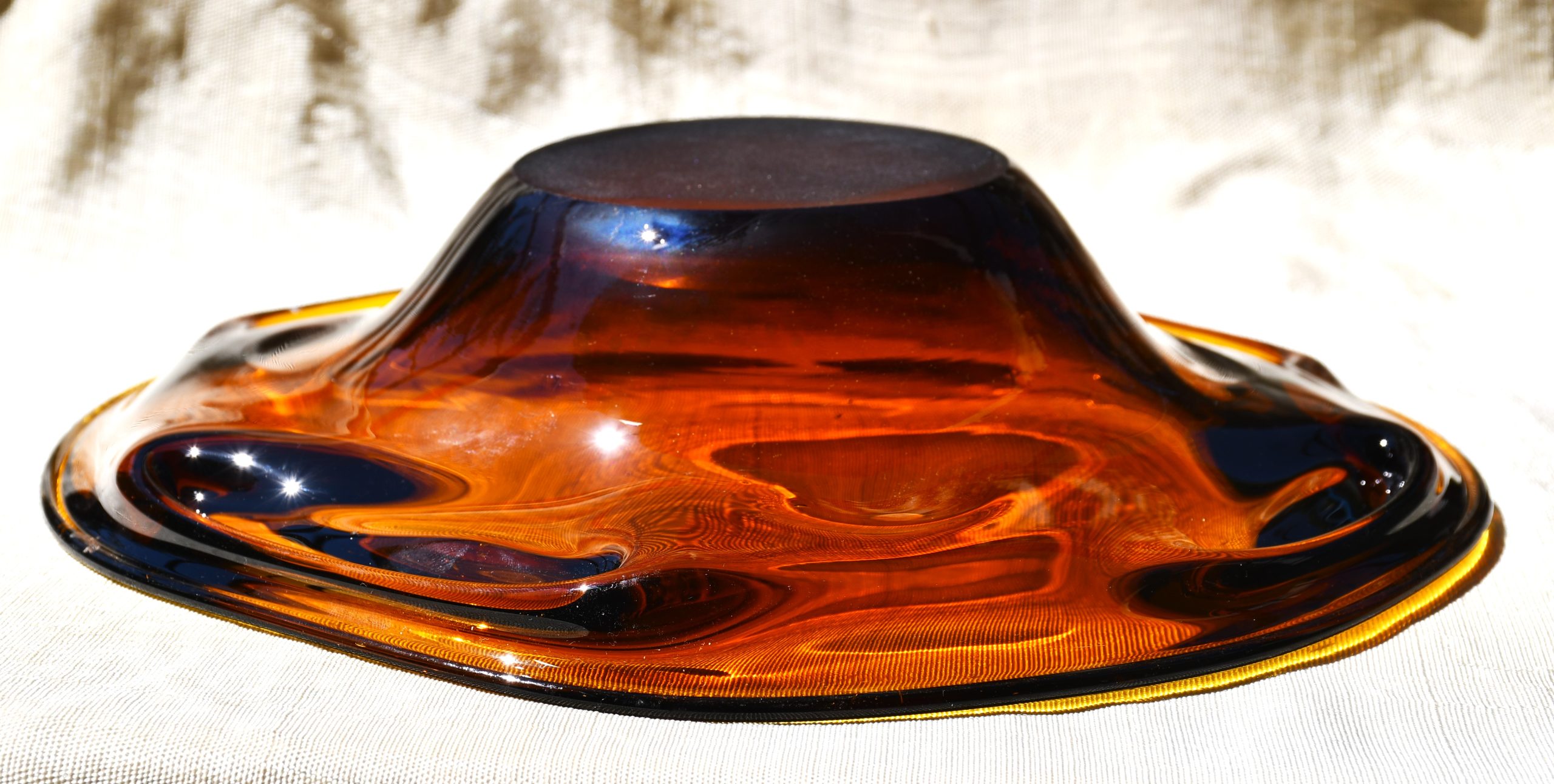 Заоблена органична форма, изработена с техниката на Ян Беранек, много декоративна и стилна. Стъкло с невероятен кехлибарен цвят, чудесни оптични ефекти при промяна в светлината. Тежък и солиден предмет. Полирано дъно. Перфектен екземпляр на mid century стила.