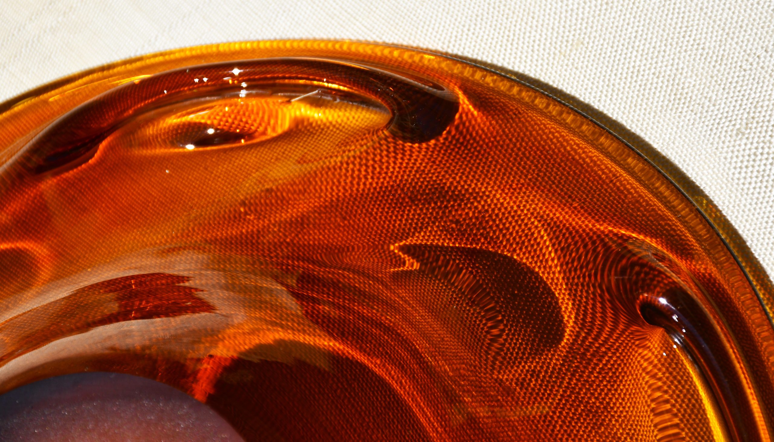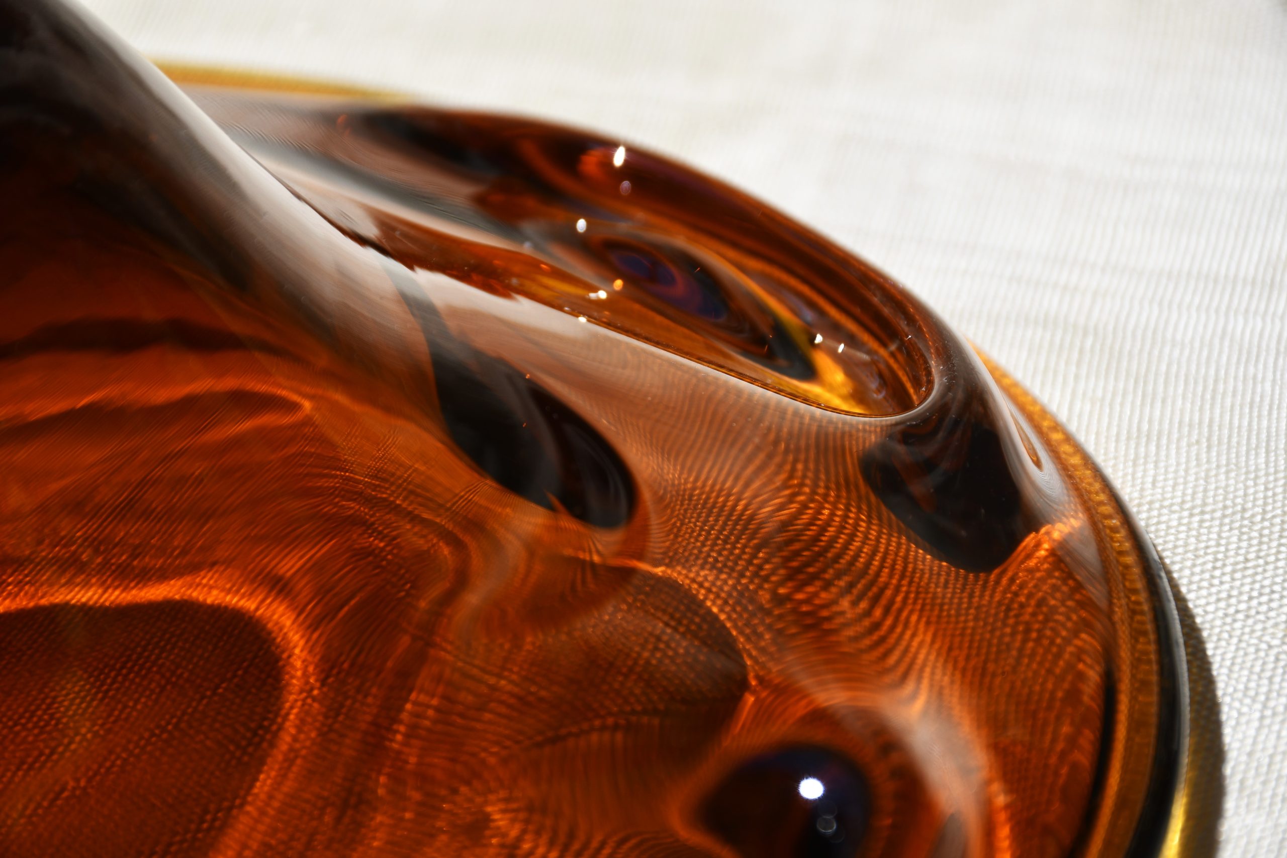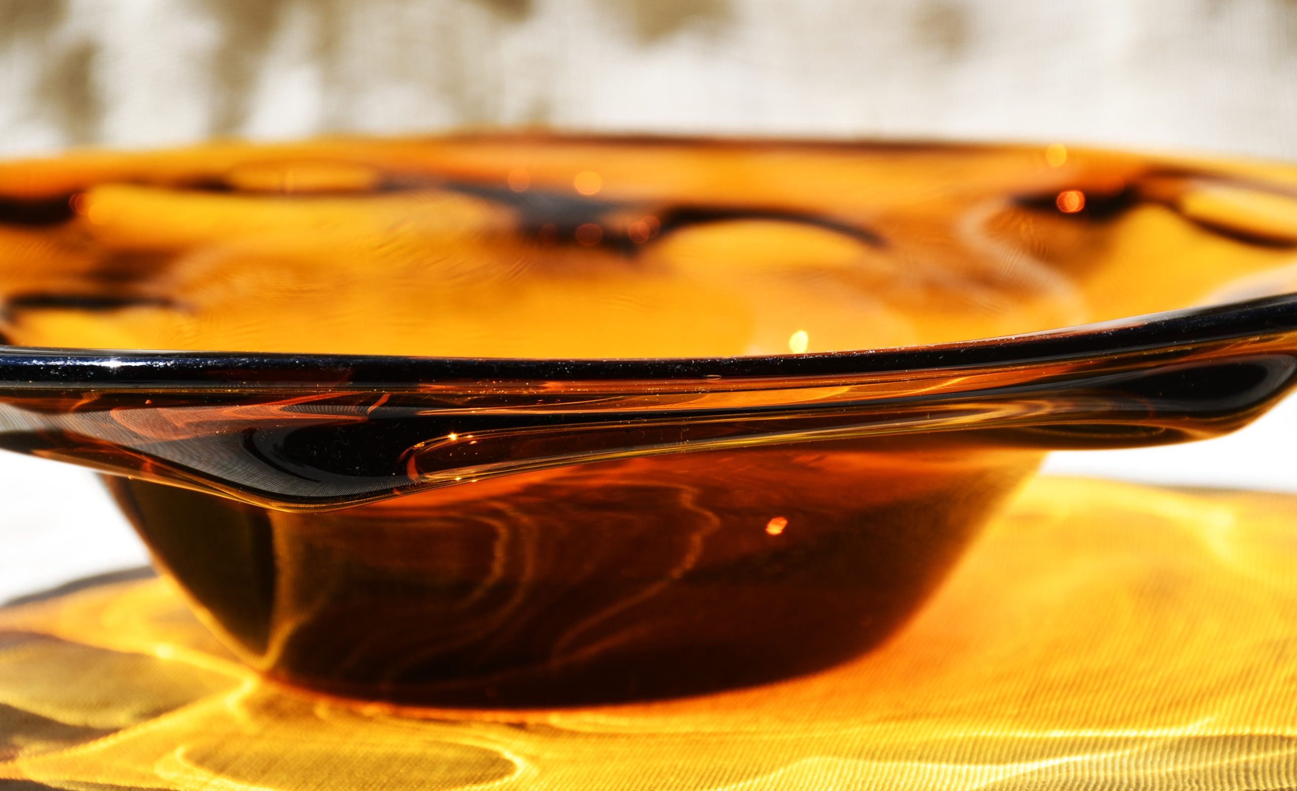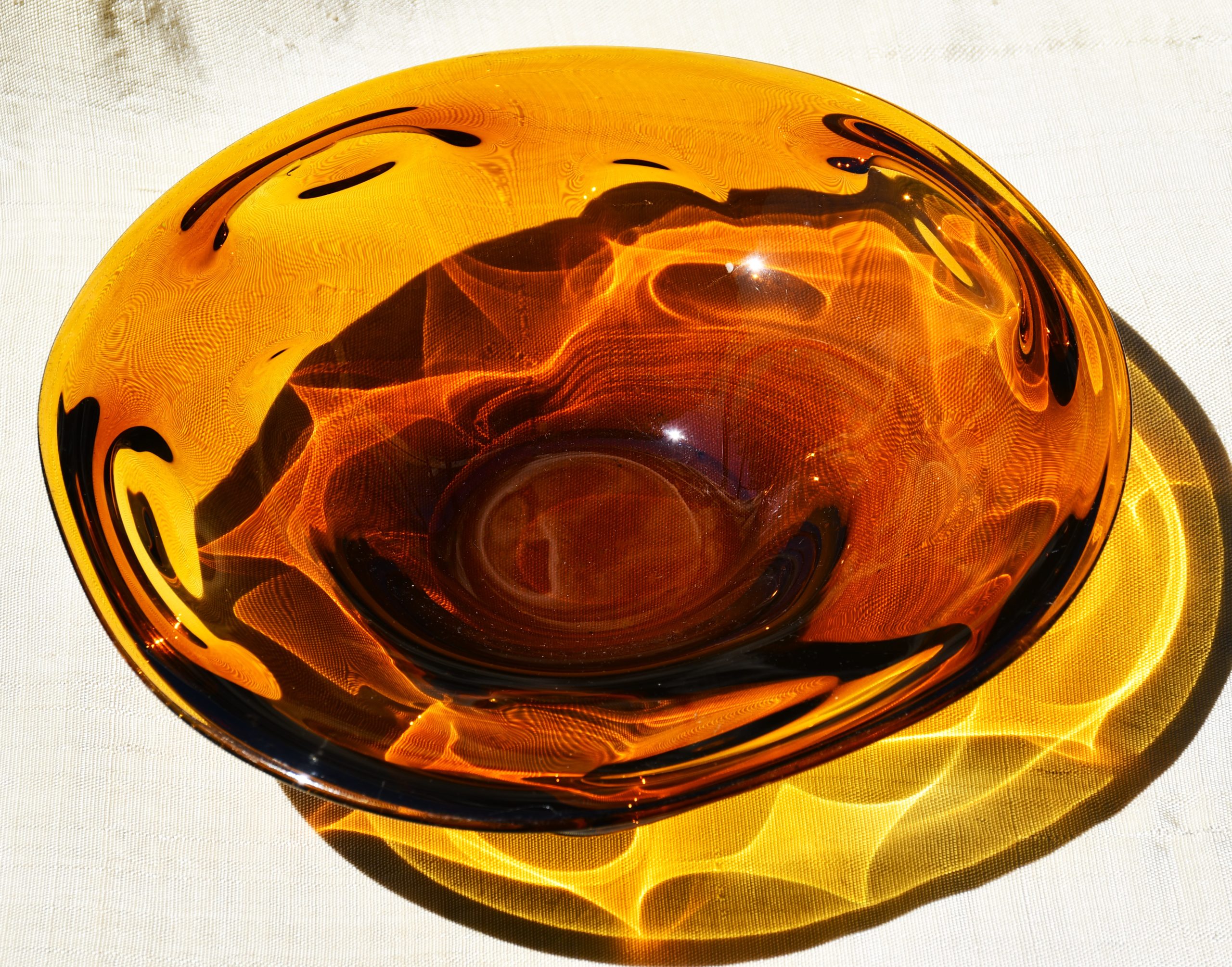Заоблена органична форма, изработена с техниката на Ян Беранек, много декоративна и стилна. Стъкло с невероятен кехлибарен цвят, чудесни оптични ефекти при промяна в светлината. Тежък и солиден предмет. Полирано дъно. Перфектен екземпляр на mid century стила.