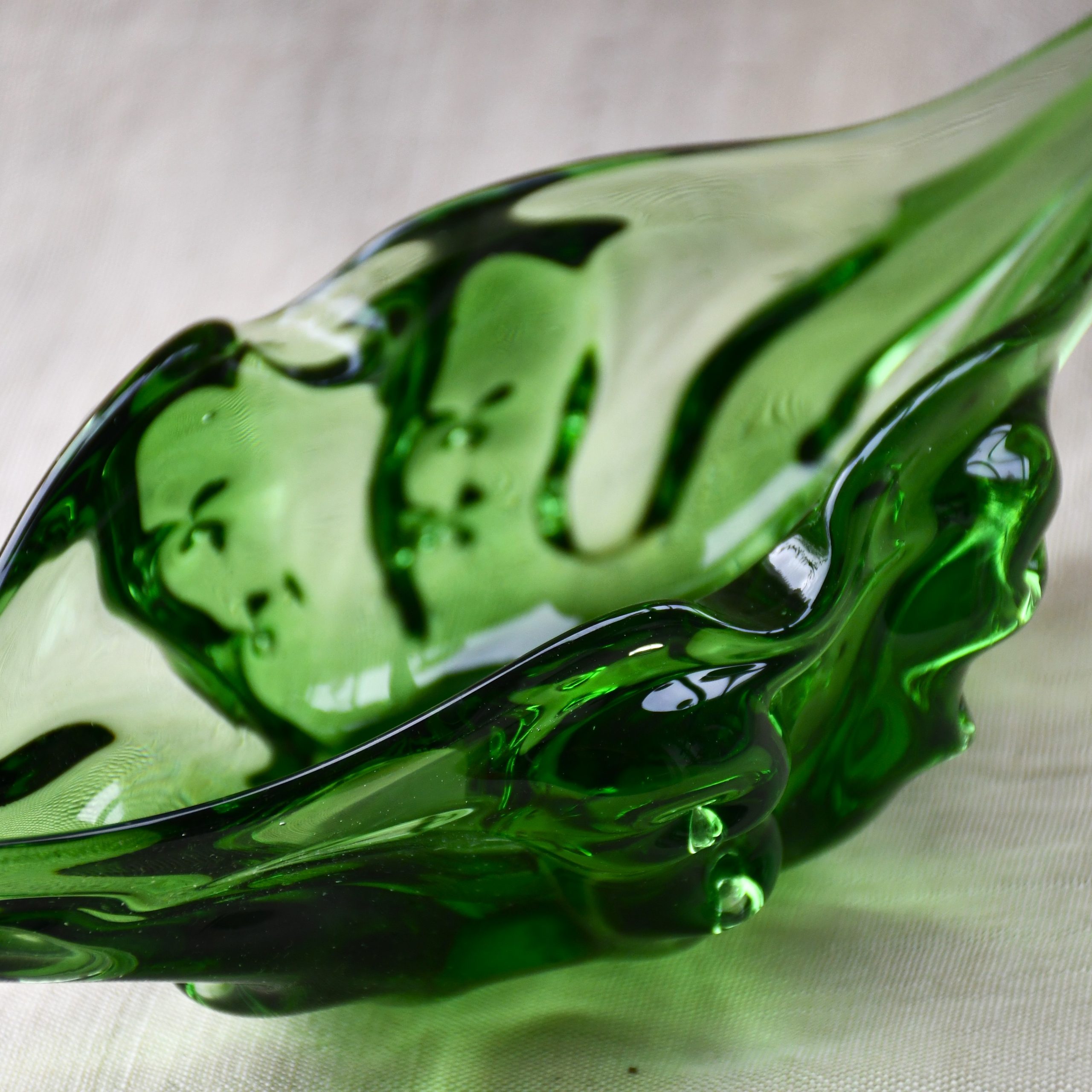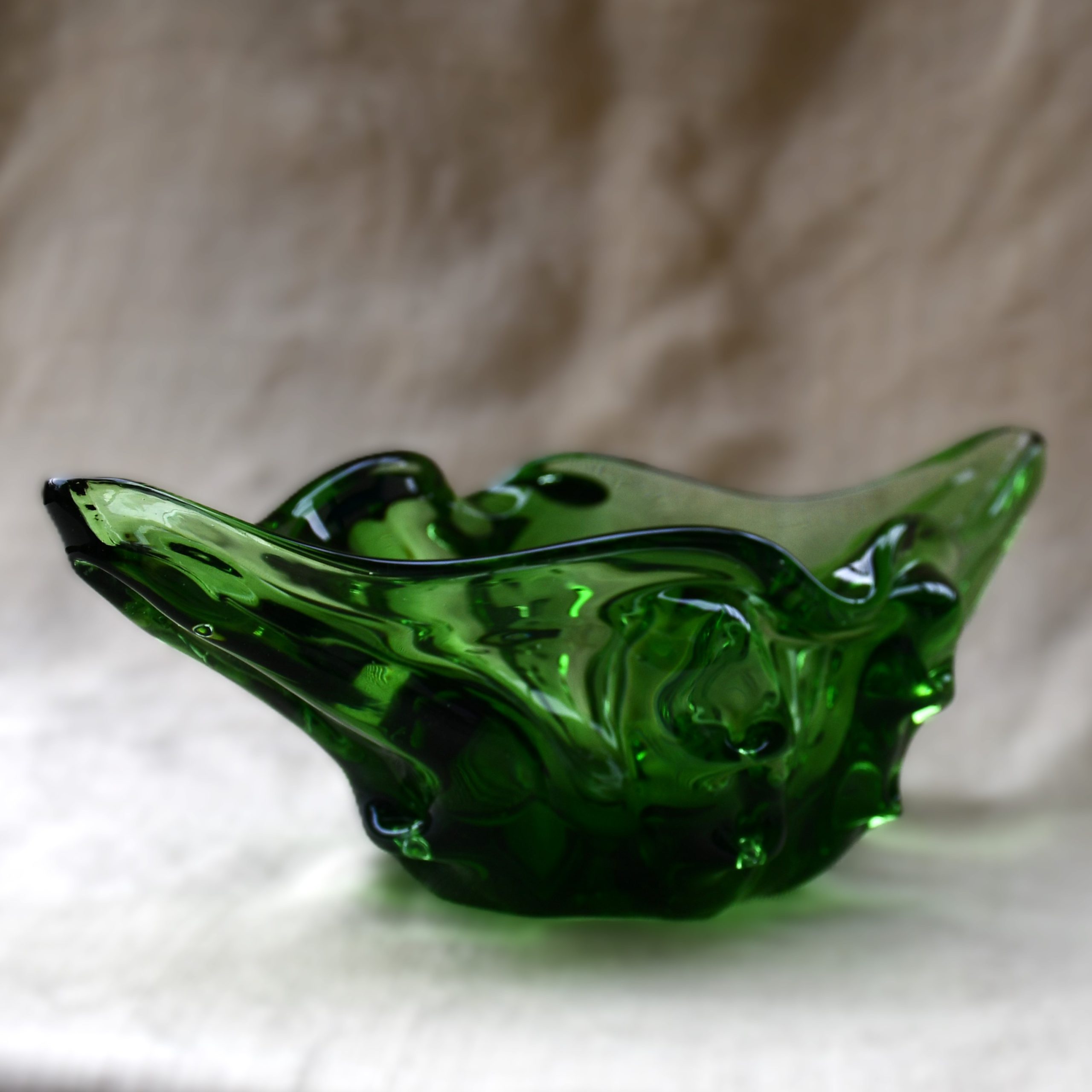 Необичайна и елегантна стъклена скулптура или centerpiece или пепелник или trinket bowl… Ръчна работа. Датировка: 60-те на XX в. Маркирана с оригиналния етикет. Именно той ми подсказа истинския производител – Румъния! А бях почти сигурен, че е от следвоенното Мурано… (Ах, как не се уважаваме един-друг ние на Балканите!)