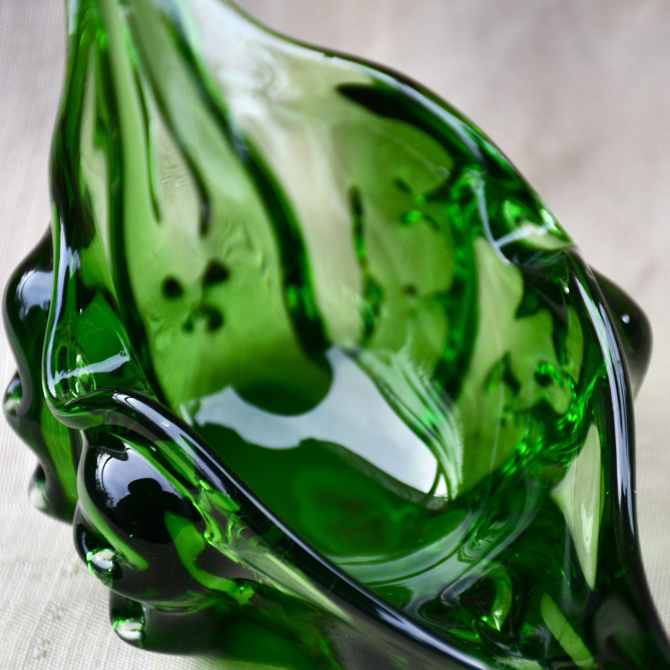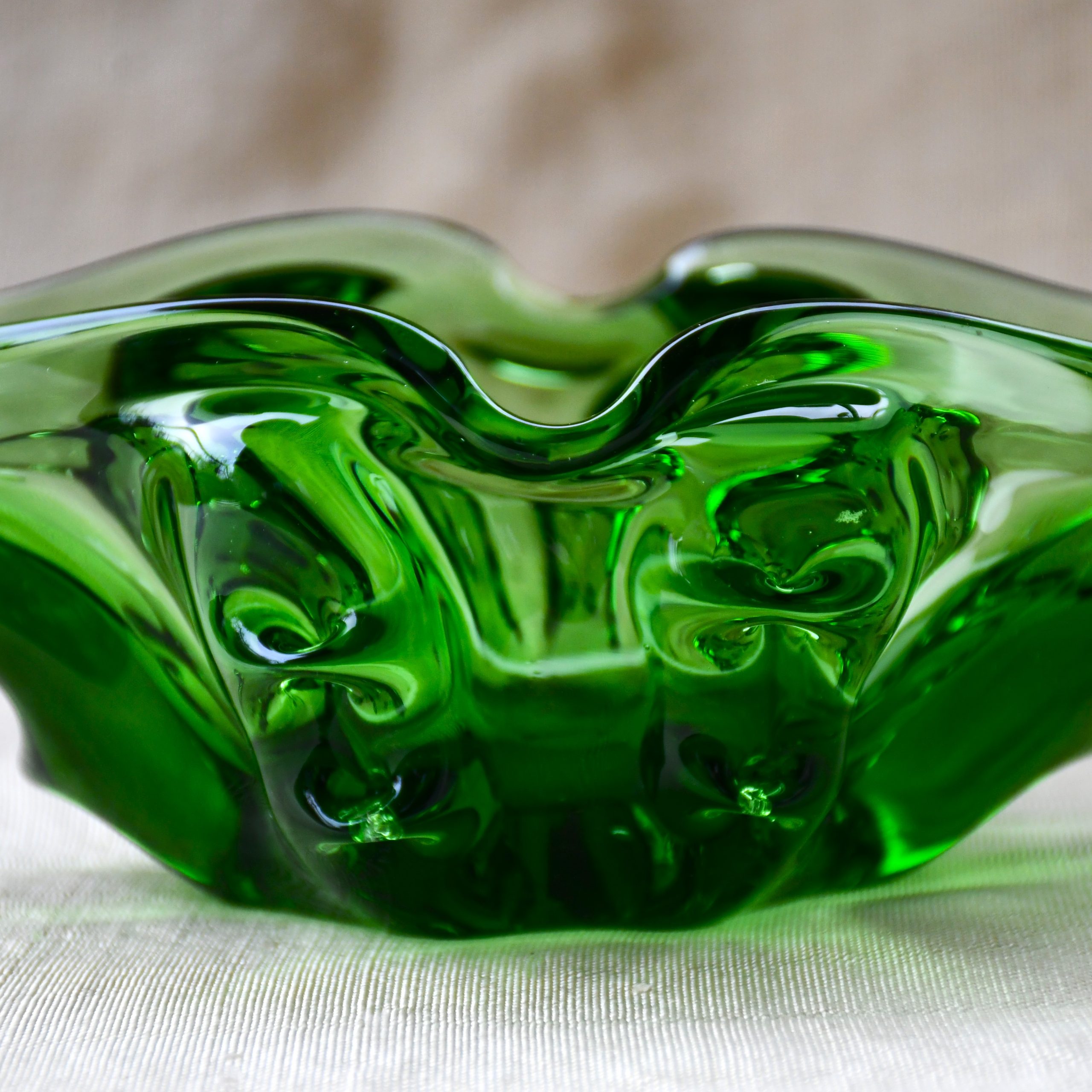 В класическа MCM форма, като изригващи от земята бивни или разтварящо се цвете – според индивидуалността на фантазията. Богат нюанс на зелена морска вода. Изработена с превъзходно майсторство. Ръчно полирано дъно. Забелязващо се присъствие на масата, различна от всеки ъгъл или от промяната на светлината. Би могла да се използва за какво ли не – нищо не може да снижи красотата й.