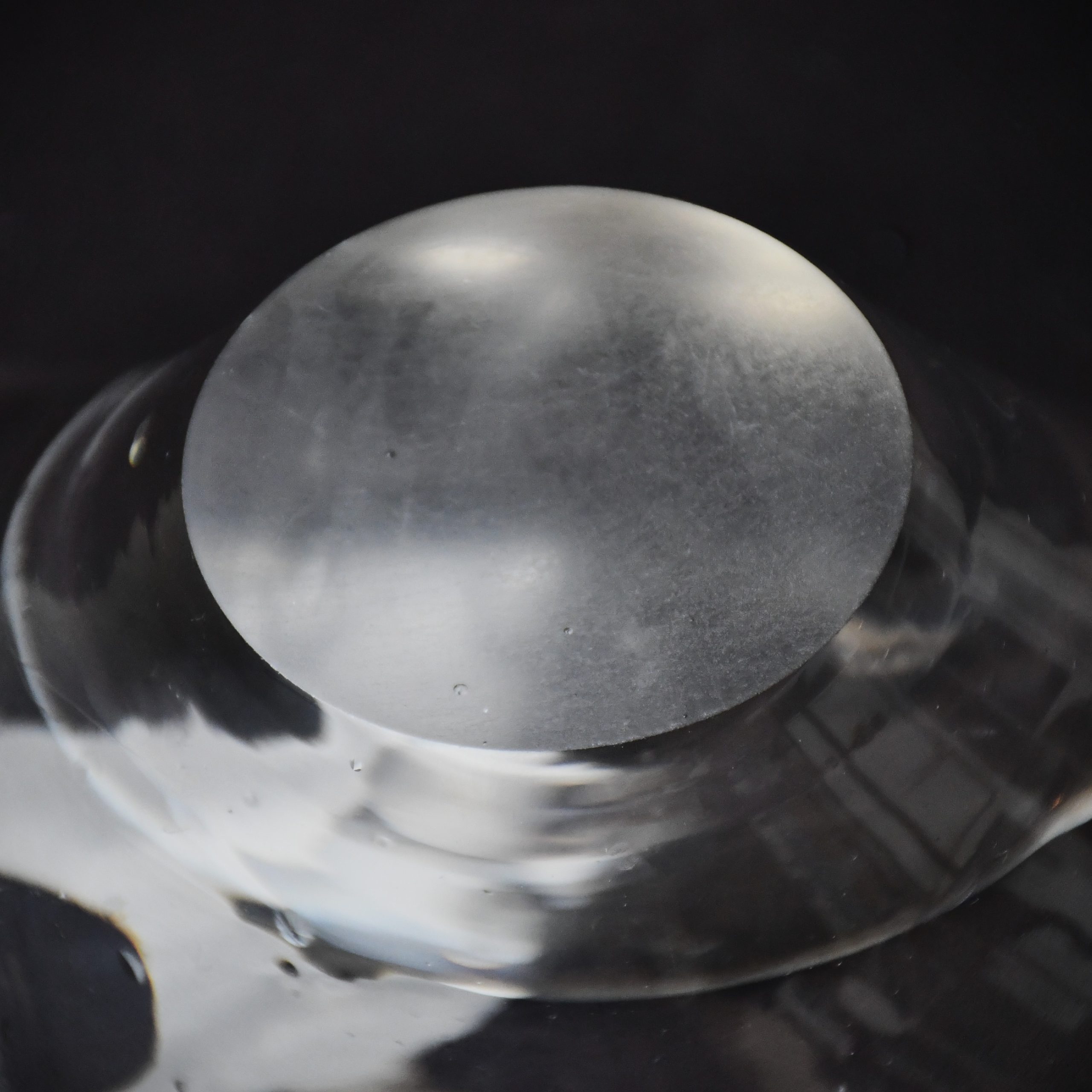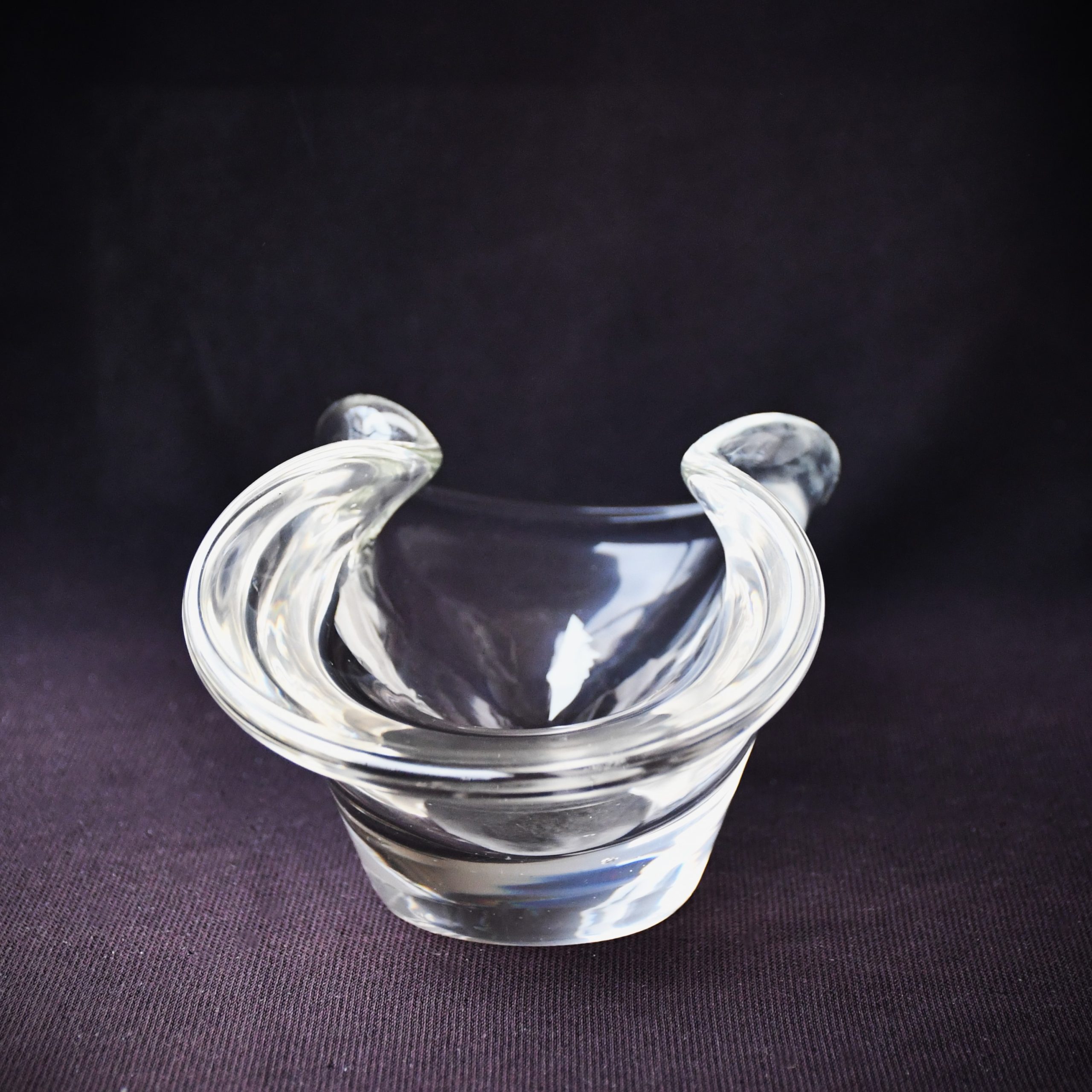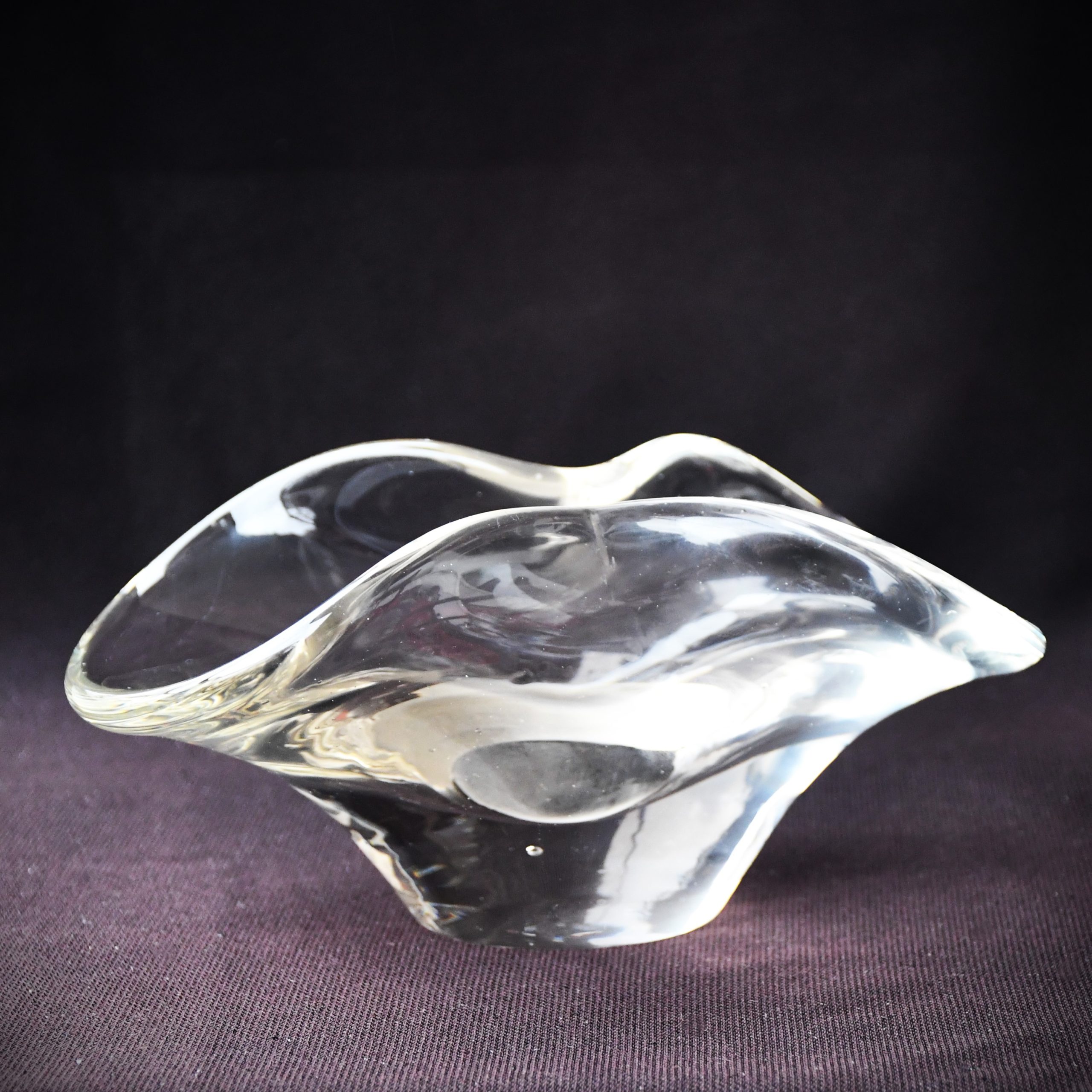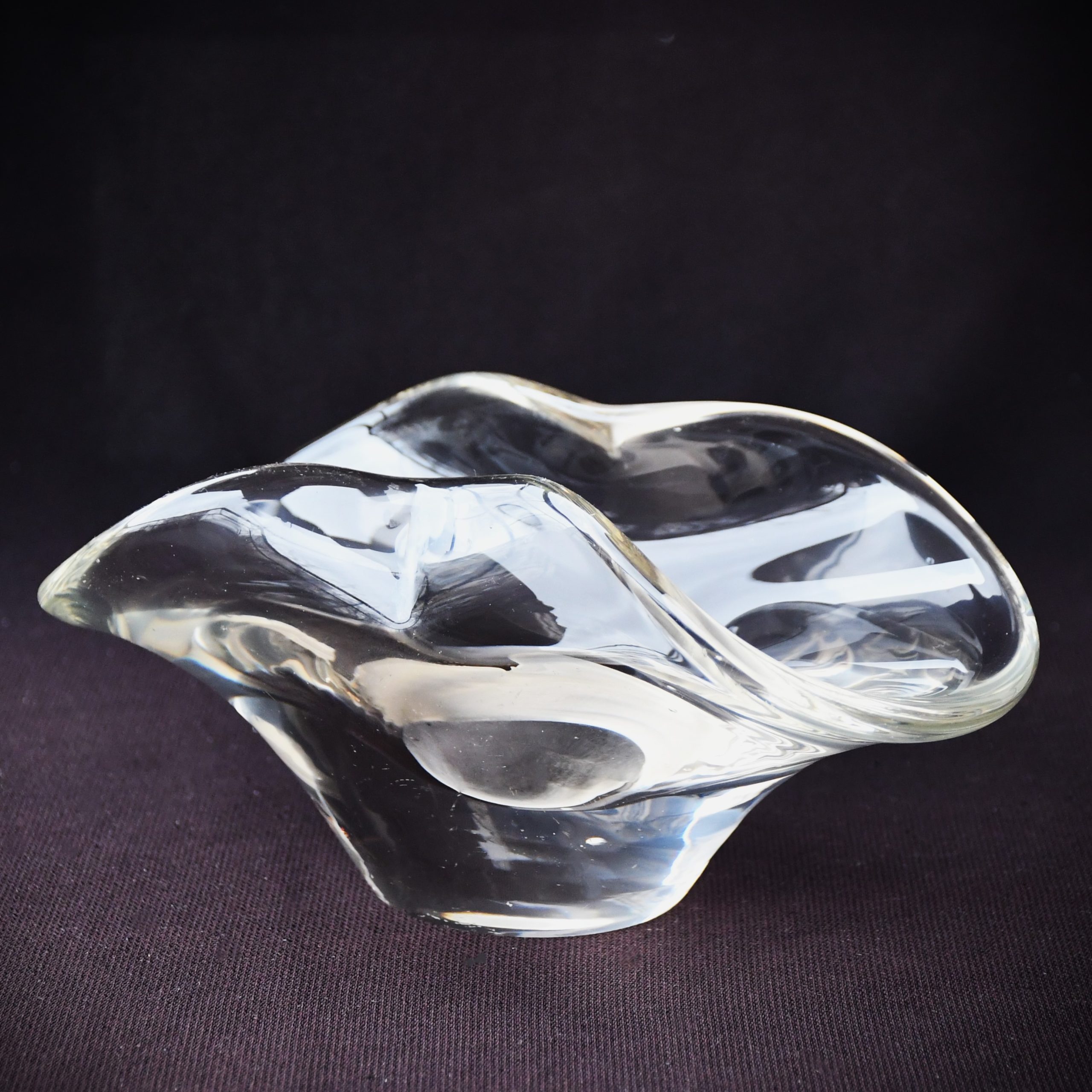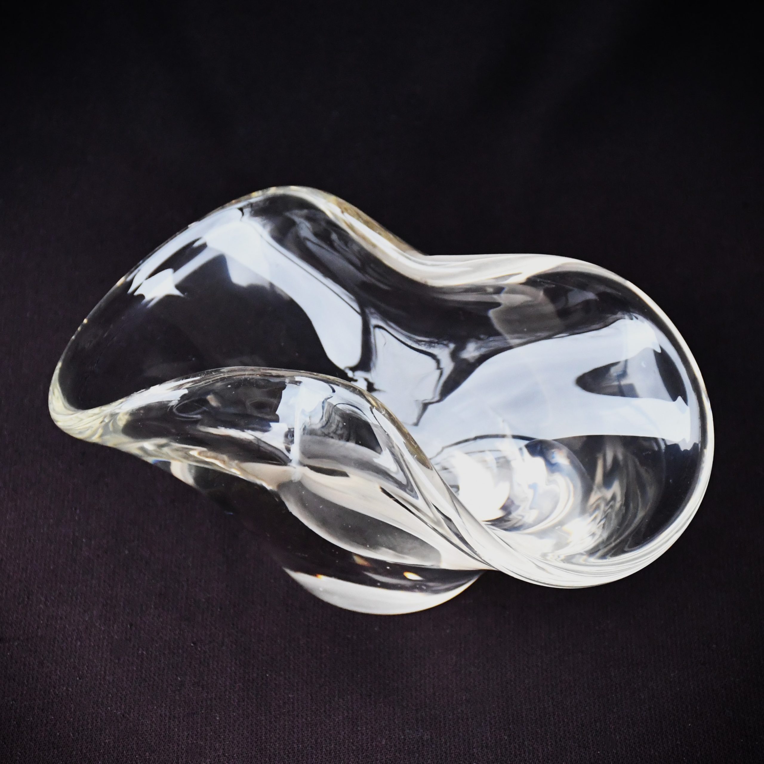 Прекрасно произведение на стъкларското изкуство. С органична форма. Изработен от безцветно стъкло. Стабилни стени, тежка основа. Ръчна полировка на дъното.