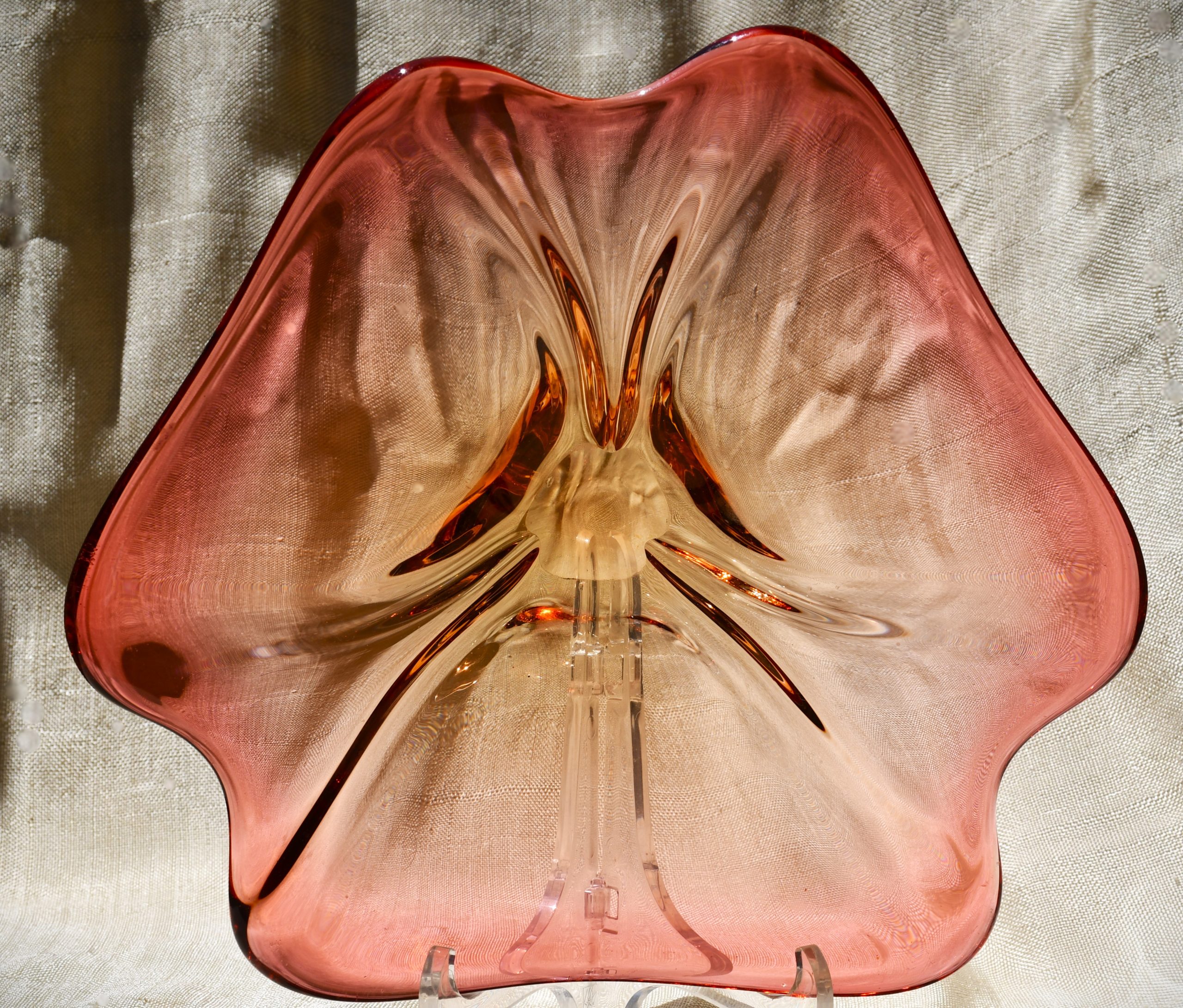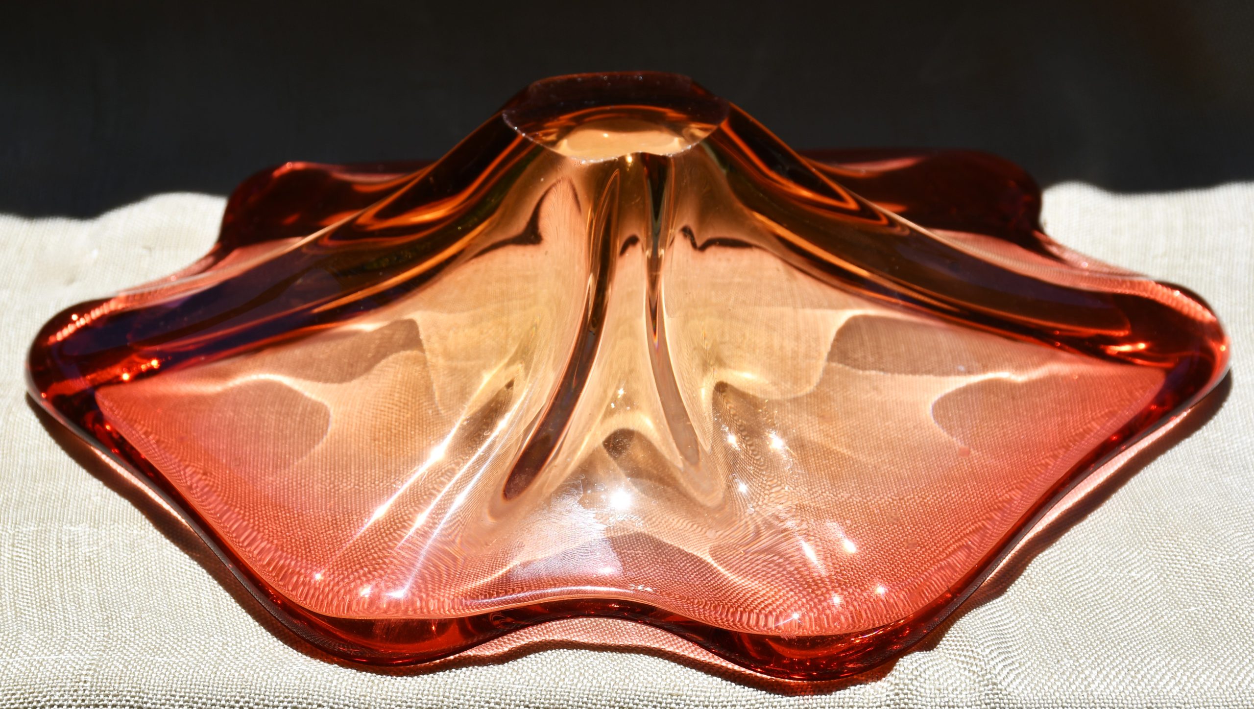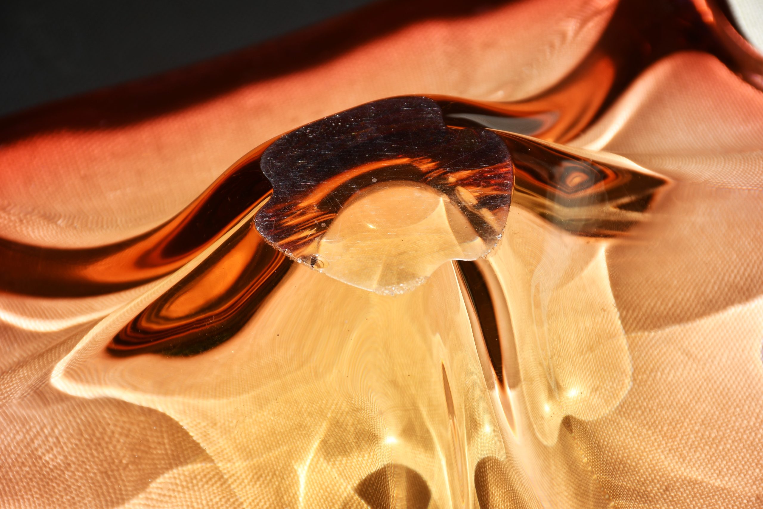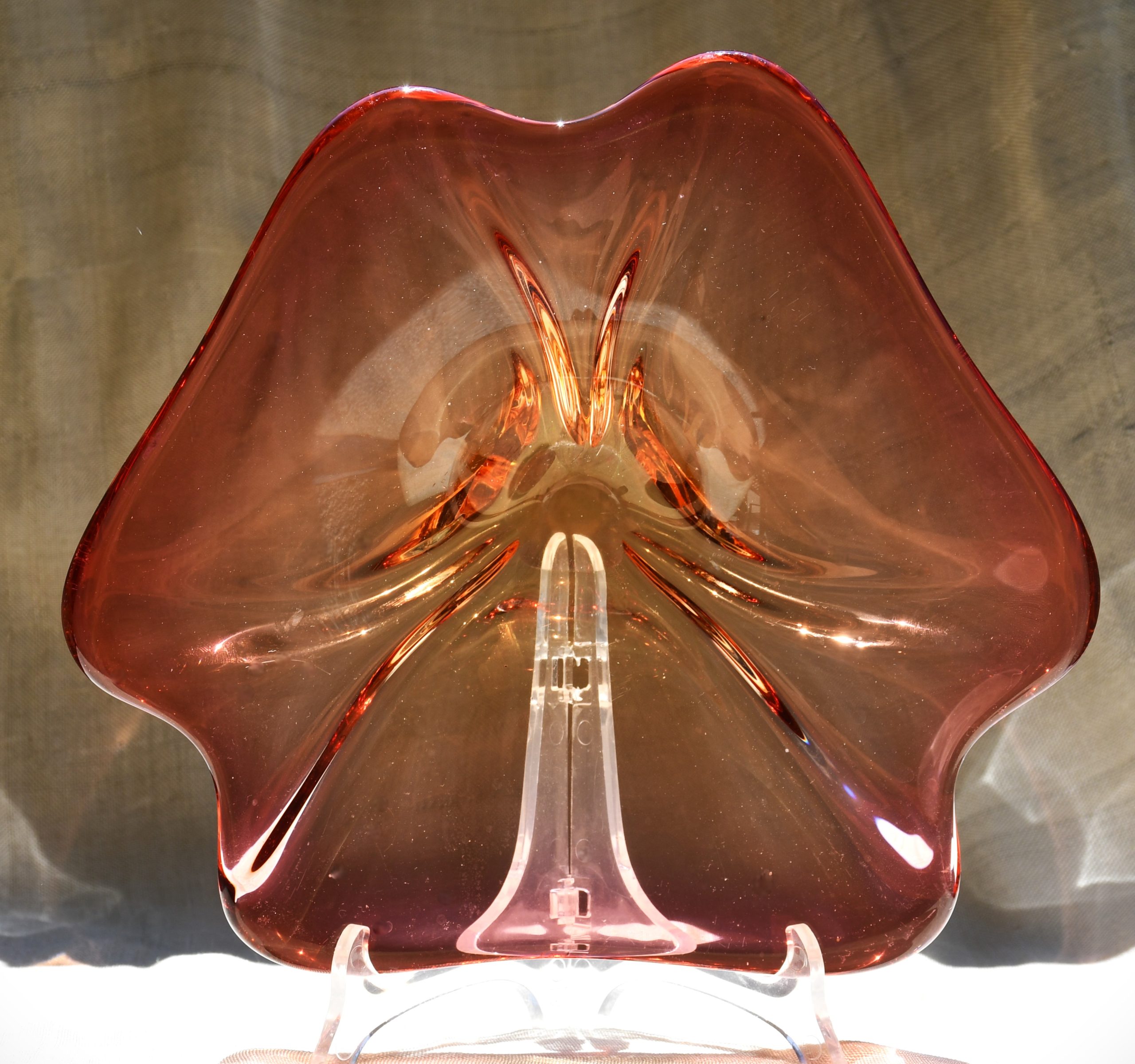 Заоблена органична форма, стилизирано-флорална, много декоративна и стилна. Цветно стъкло с много нюанси. Полирано дъно. Перфектен екземпляр на mid century стила.