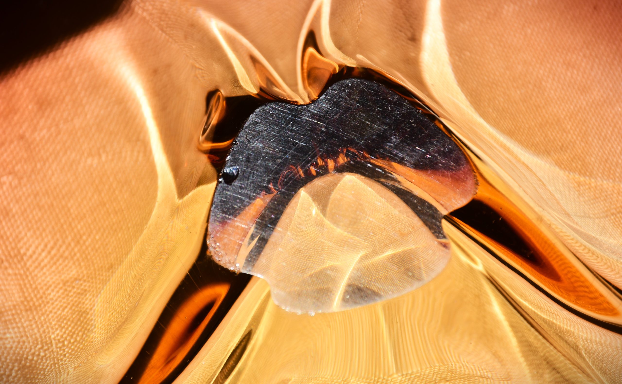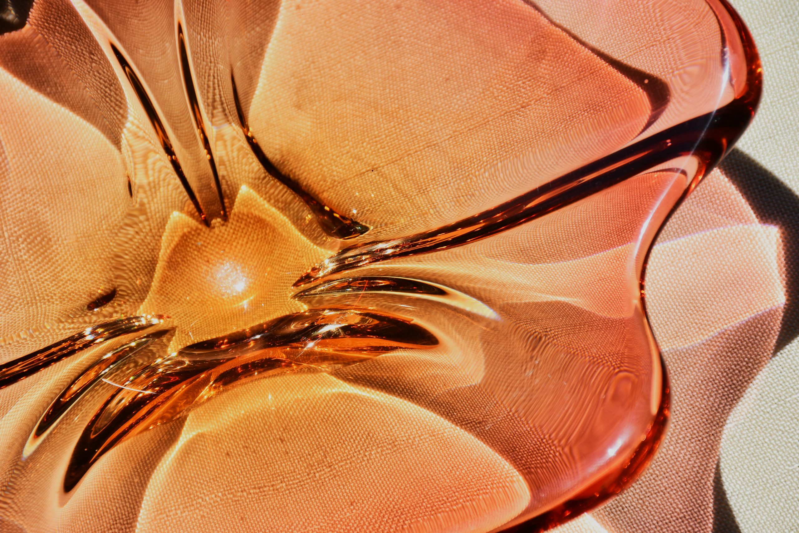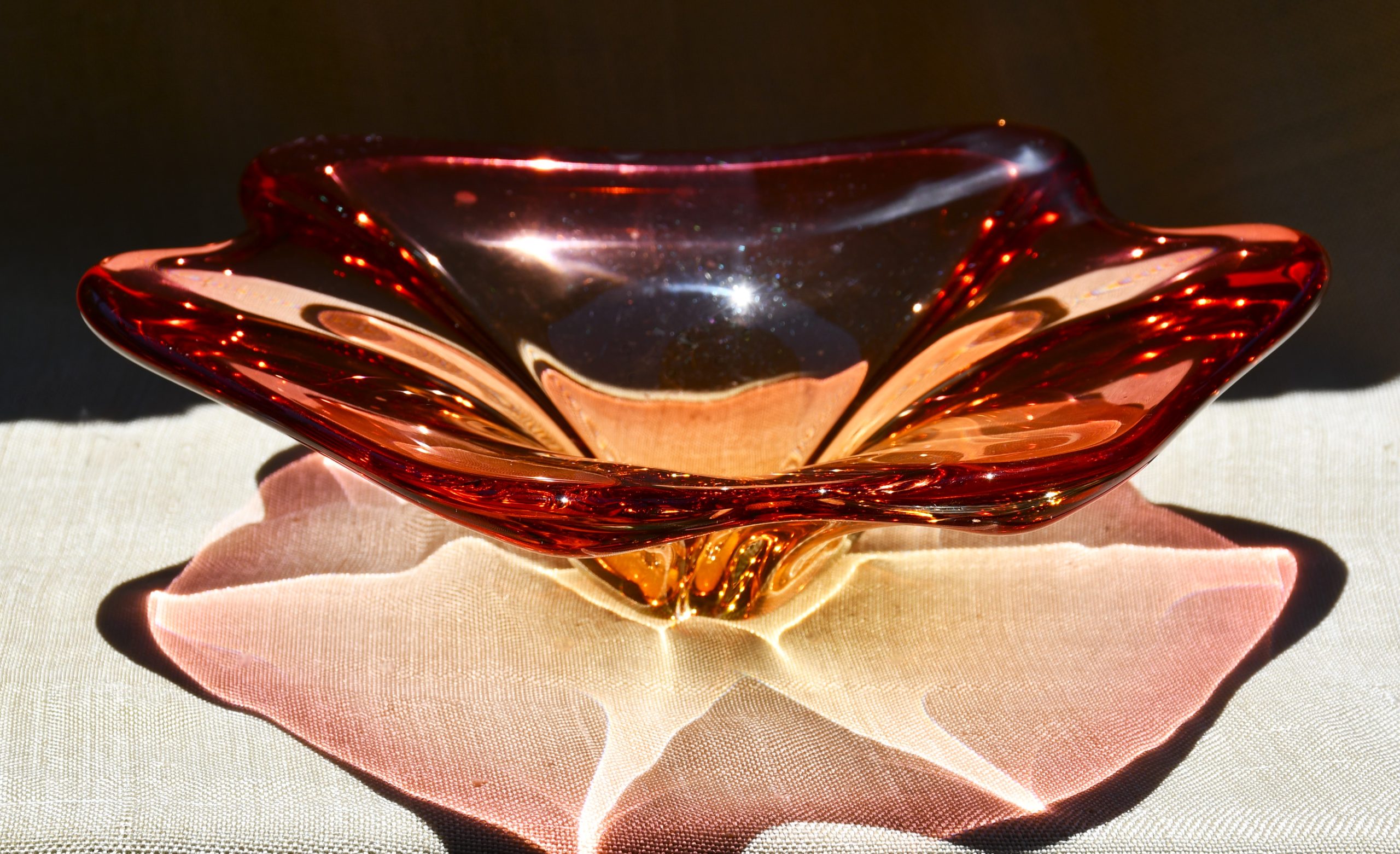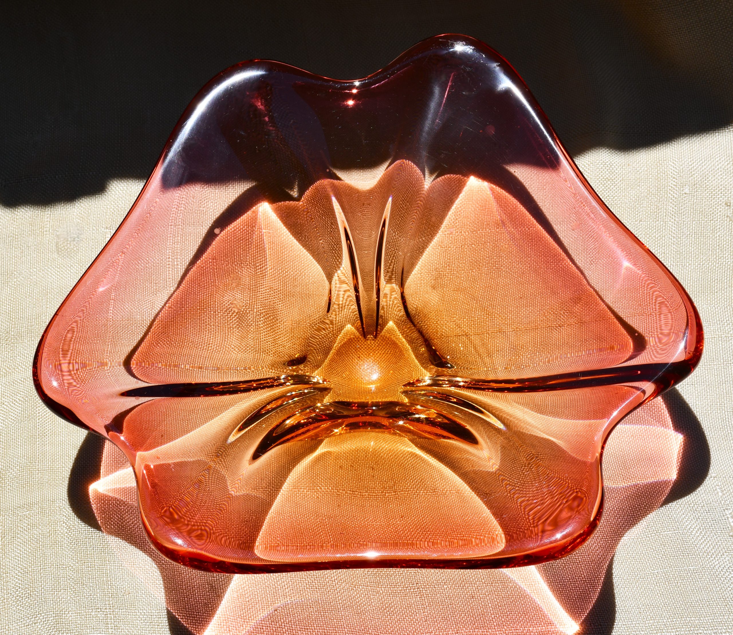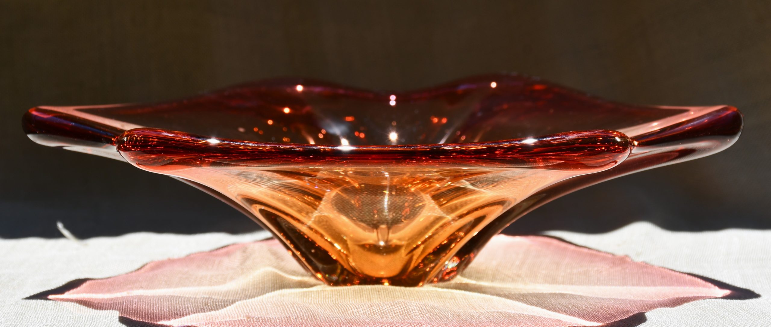 Заоблена органична форма, стилизирано-флорална, много декоративна и стилна. Цветно стъкло с много нюанси. Полирано дъно. Перфектен екземпляр на mid century стила.