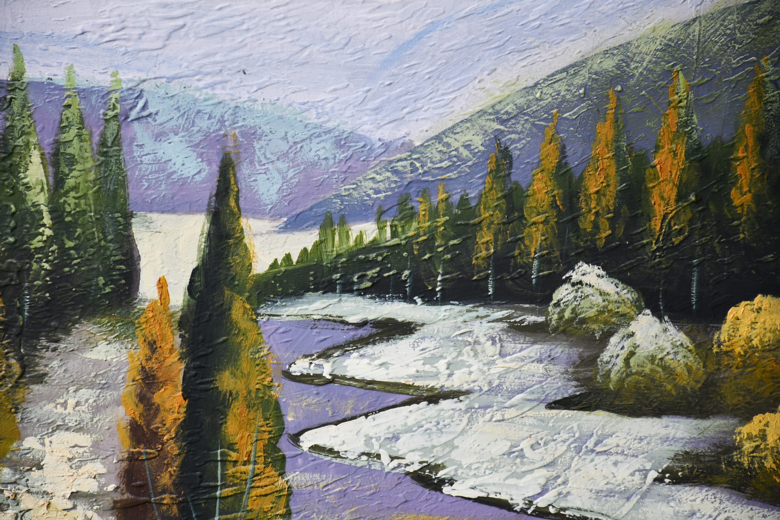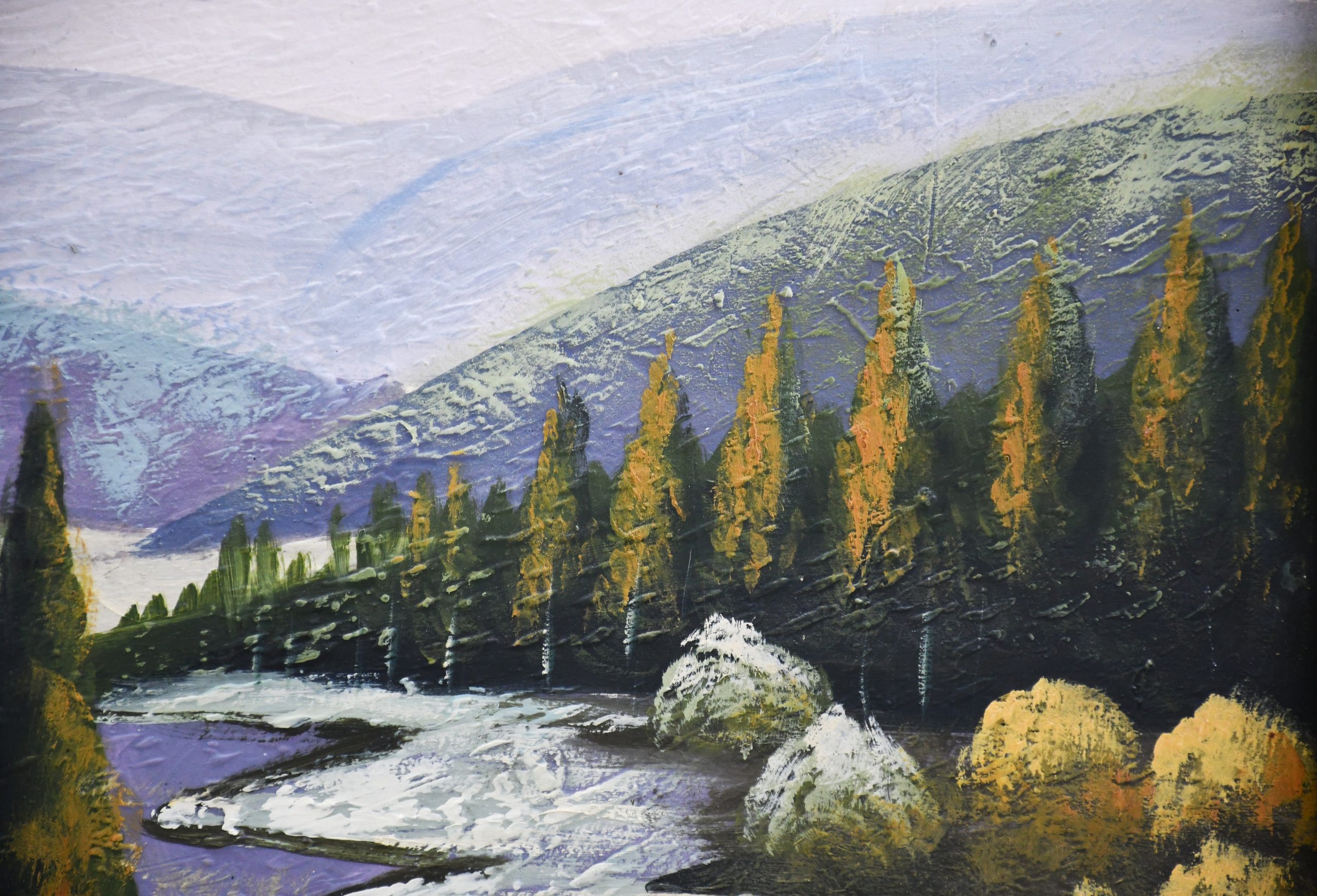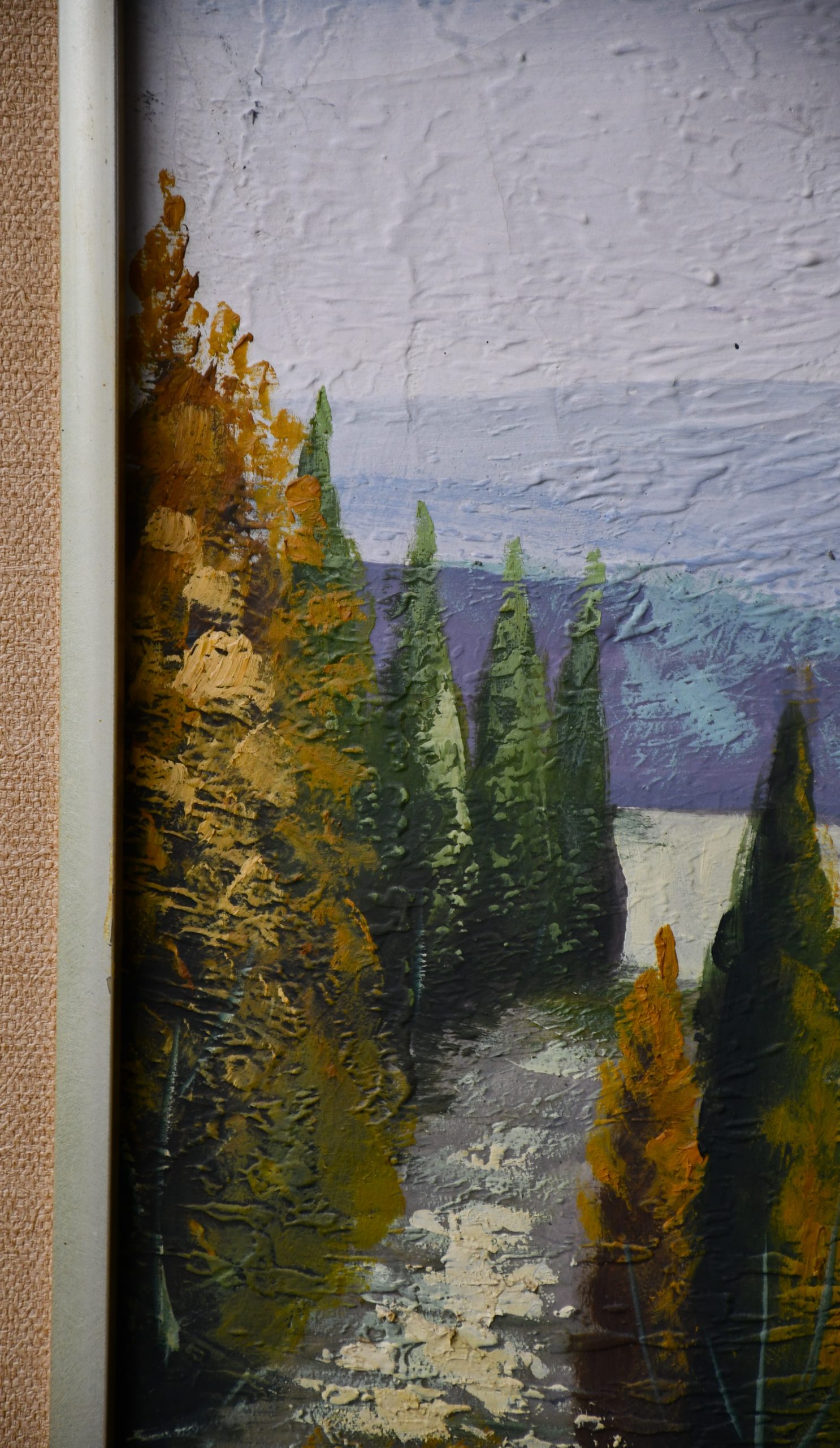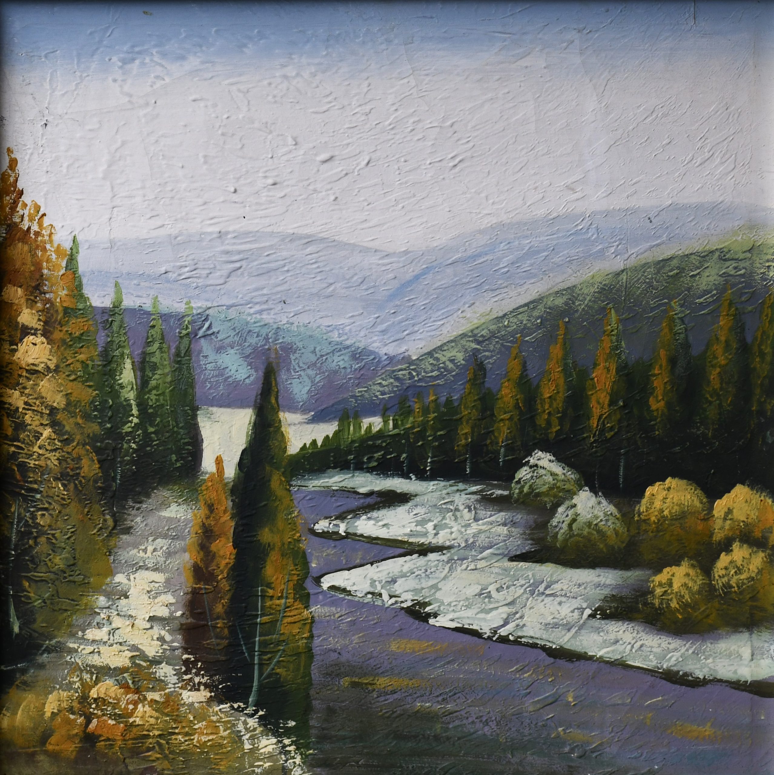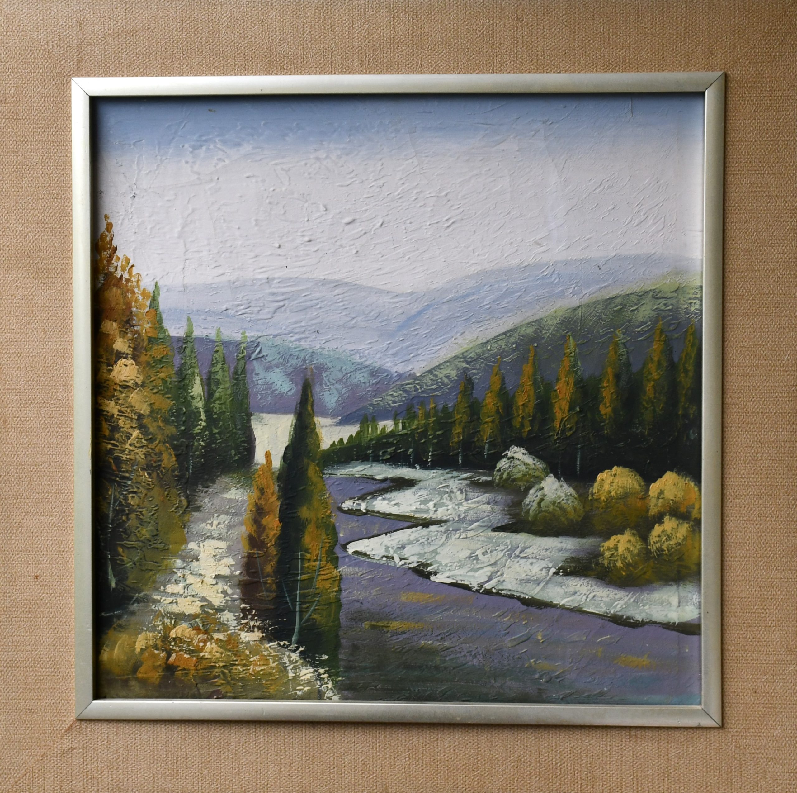 Българска школа (70те) – „Пейзаж с река“, маслени бои върху платно, не е подписана.