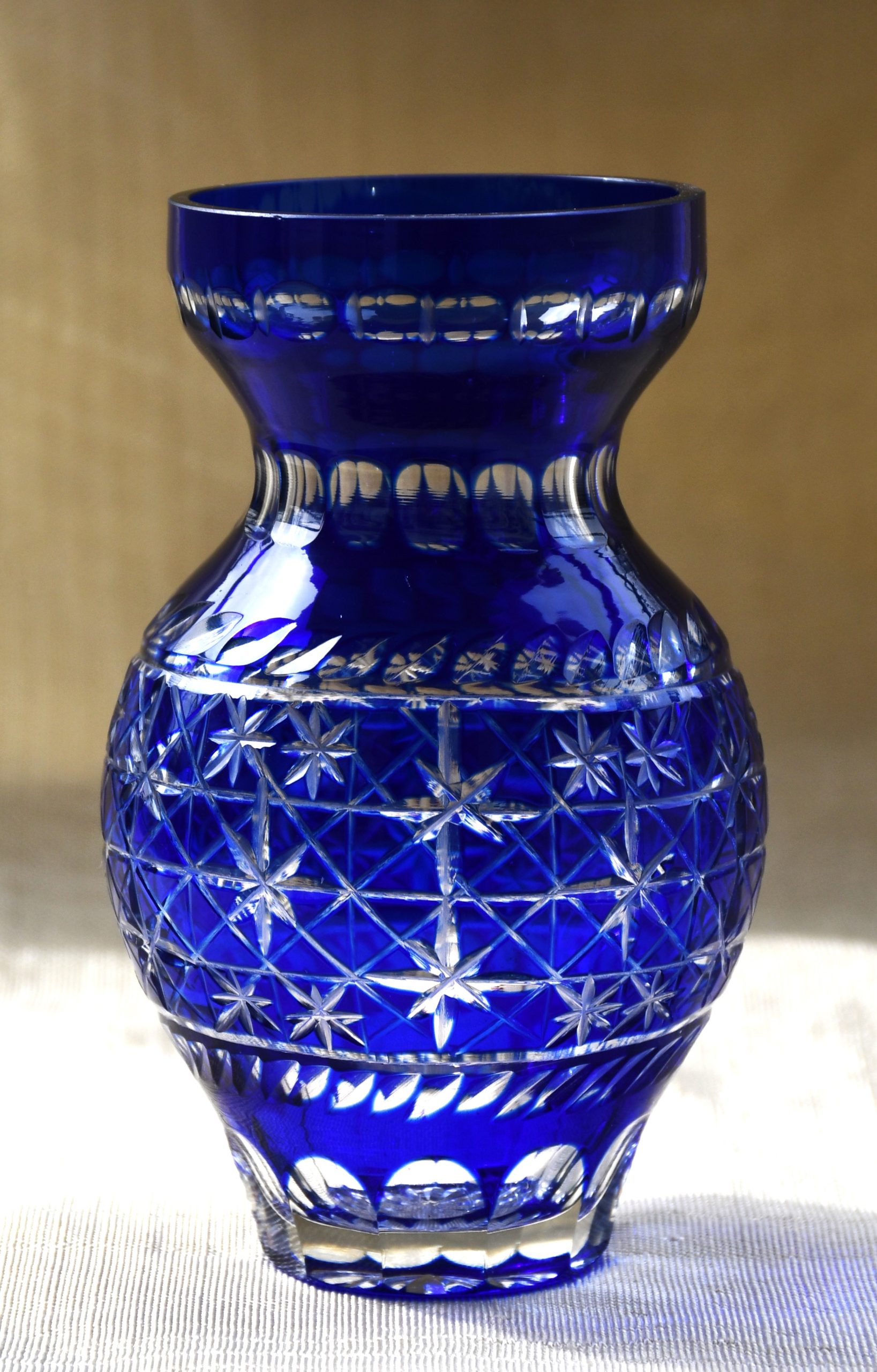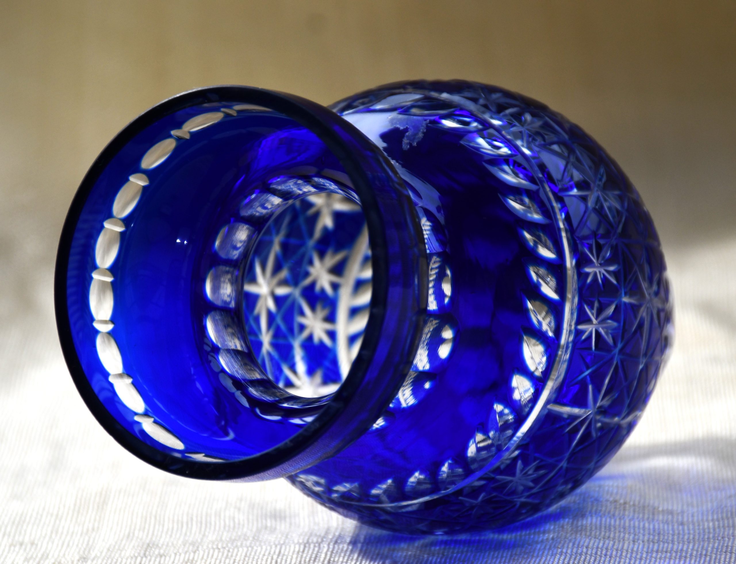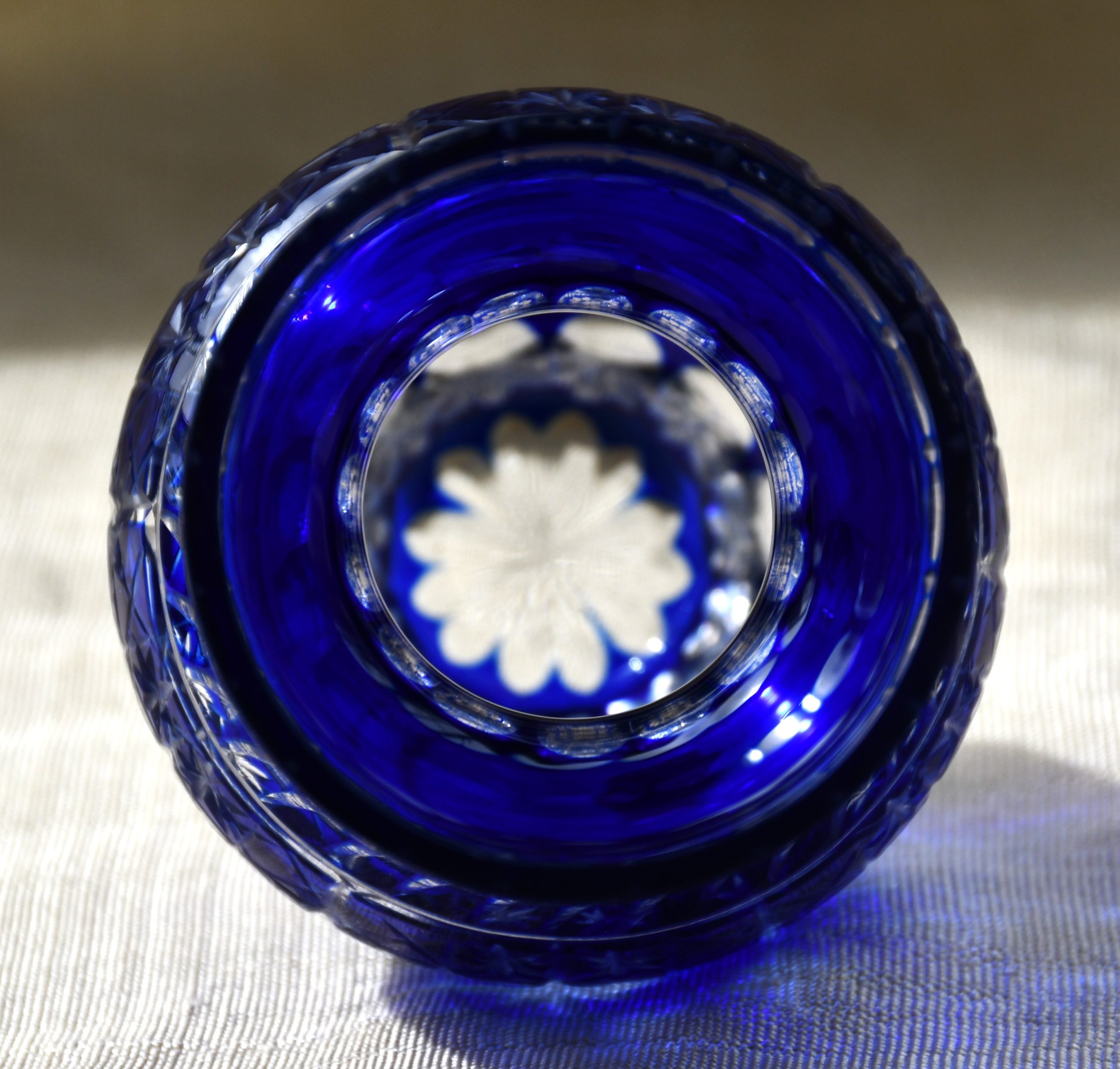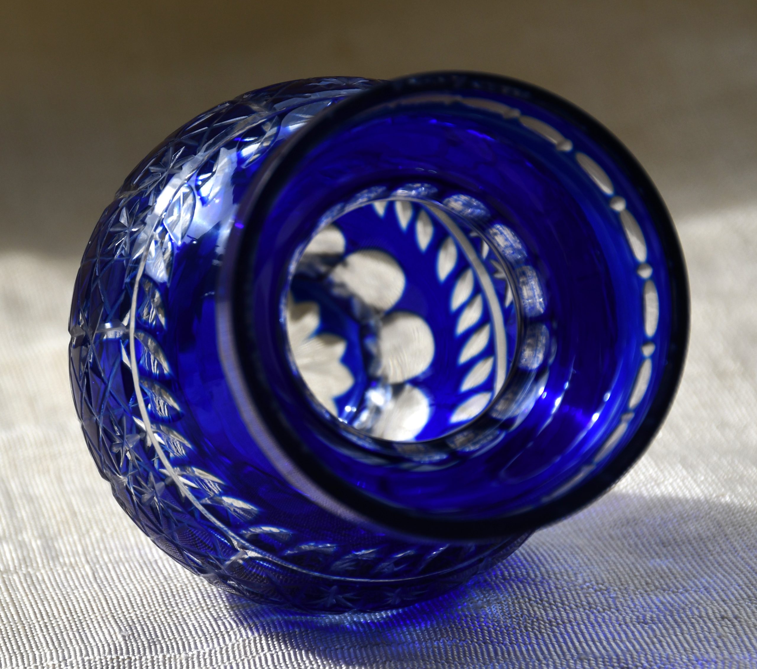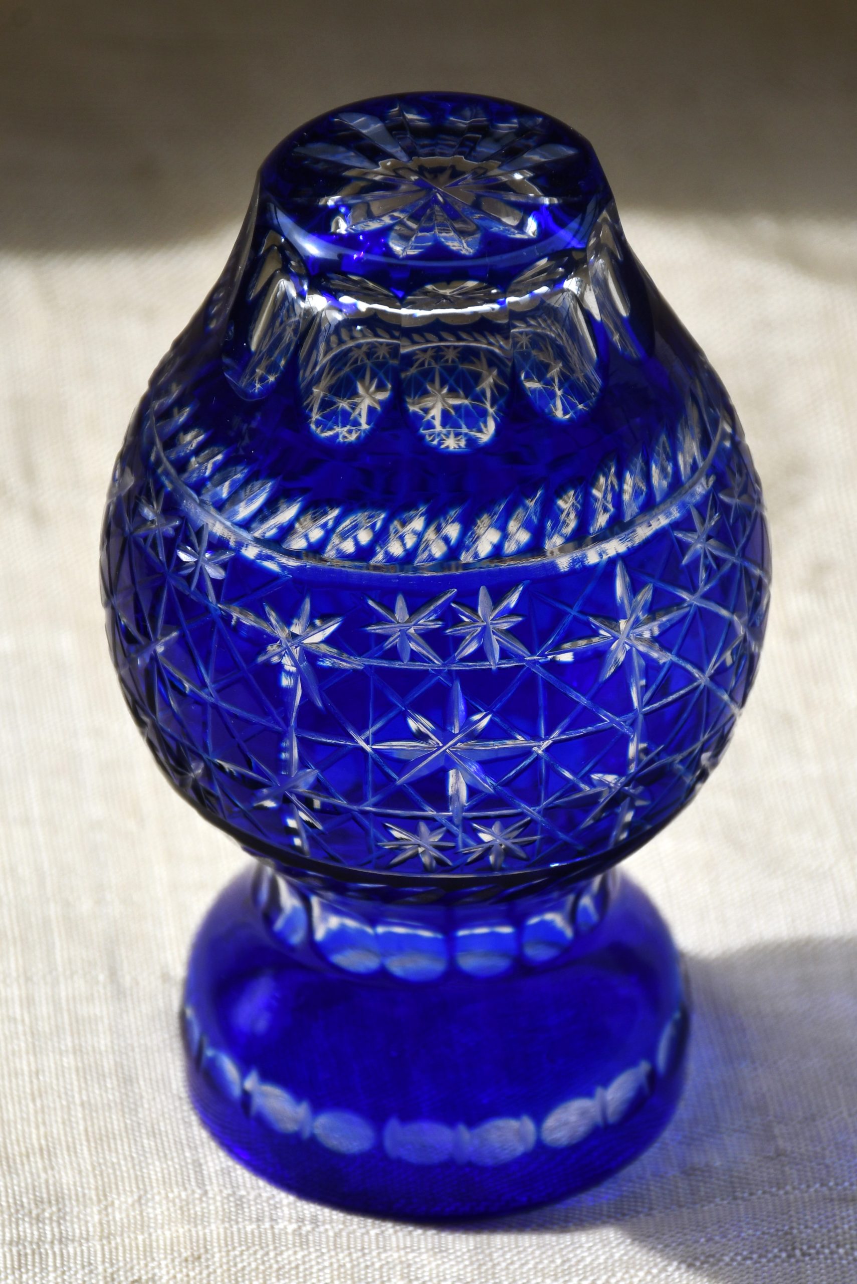 Голямо качество в малък формат! Трепетно красива ваза от двуслоен кристал, кобалтово и безцветно, датирана 60’те, ръчно стъкло, ръчна гравировка. Производство на Бохемия, Чехословакия.