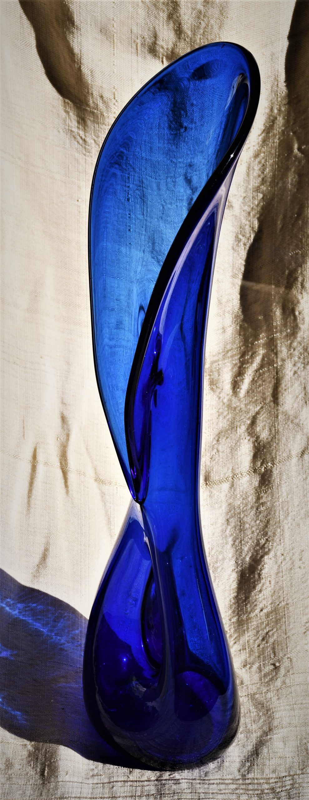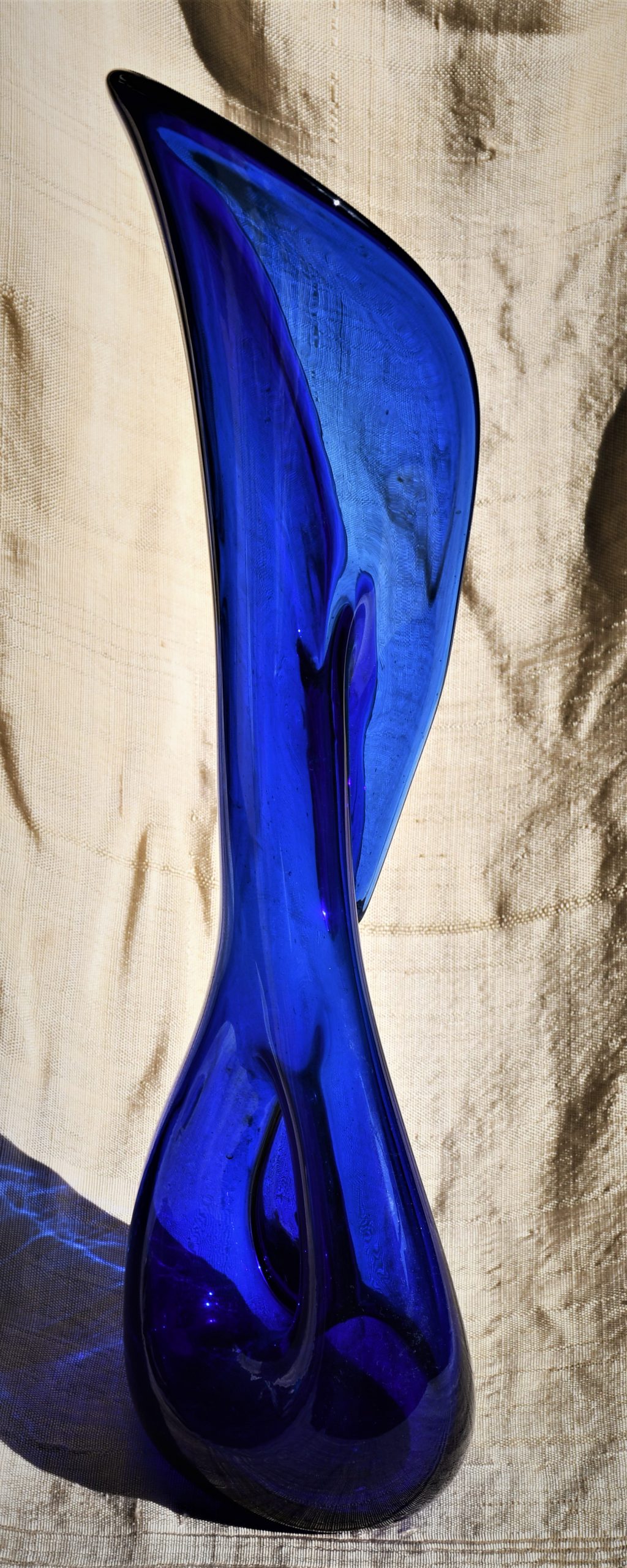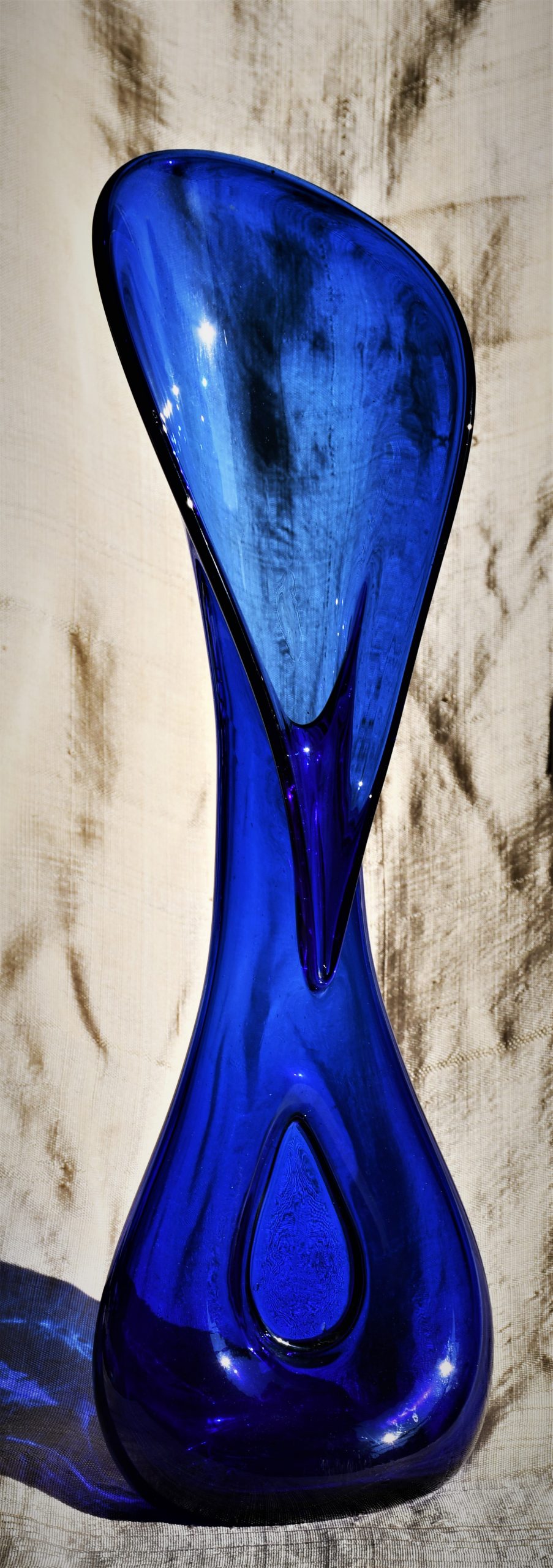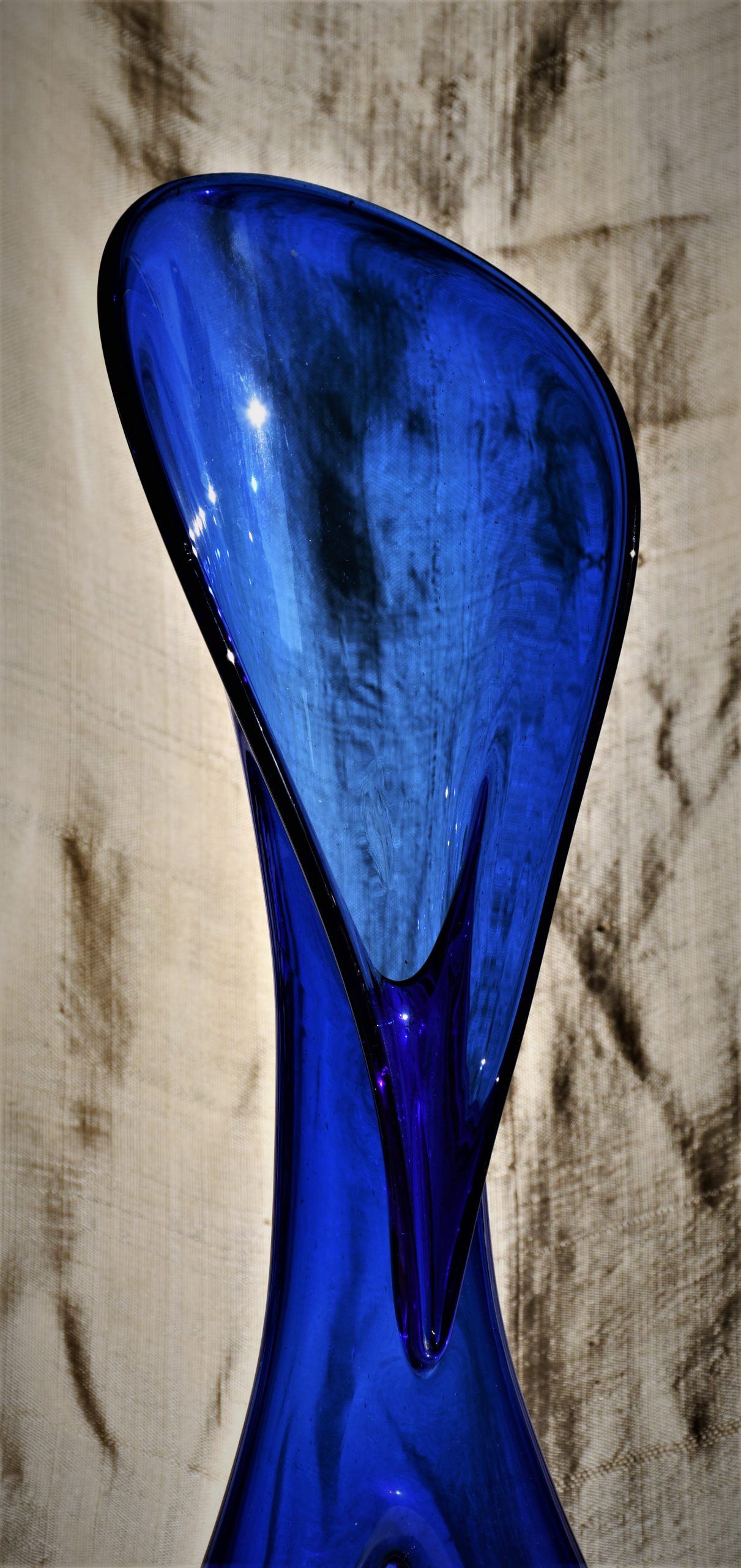Стилна арт-глас ваза от кобалтово стъкло. Ръчна изработка. Голям размер – височина 43 см.