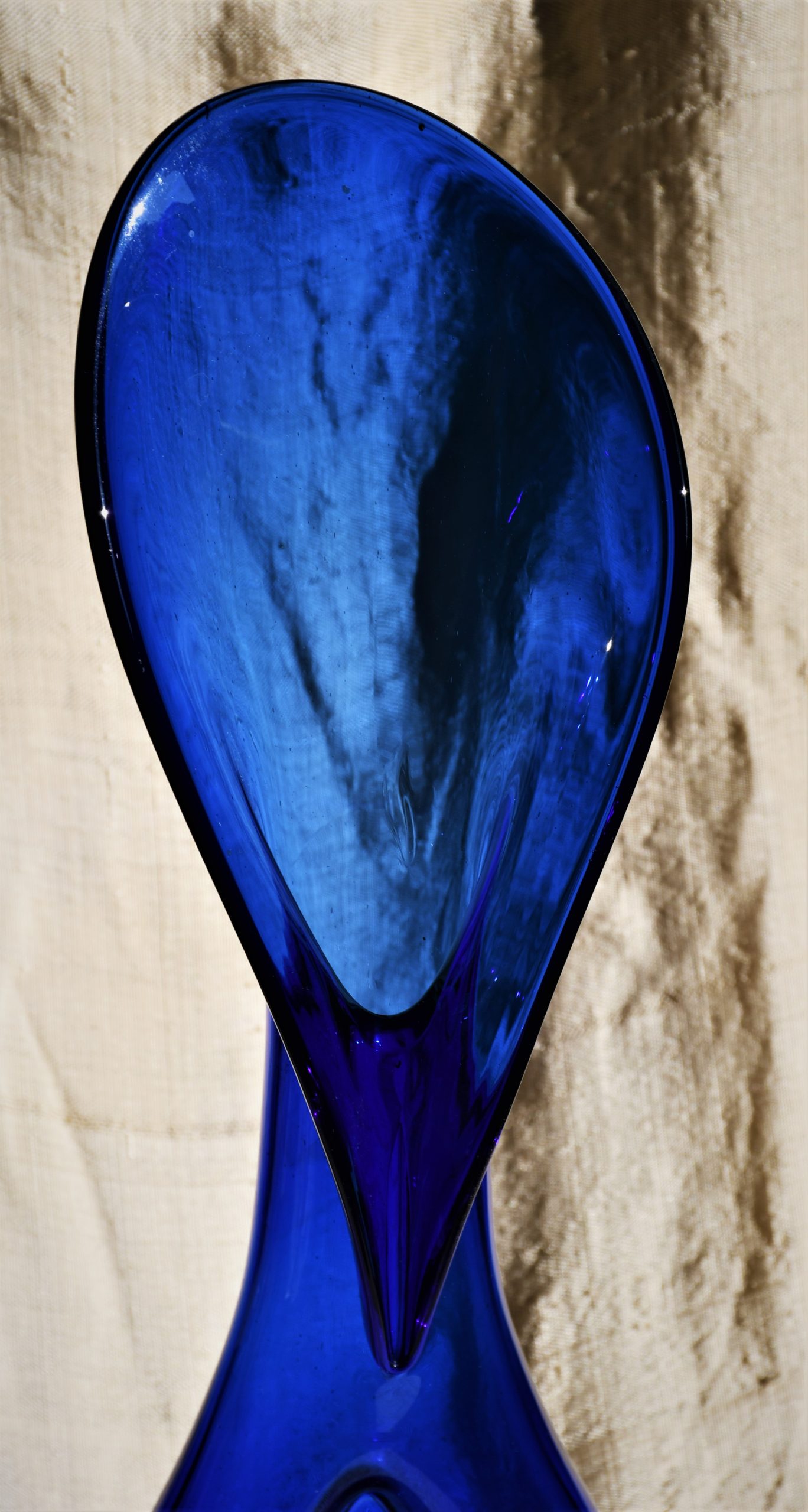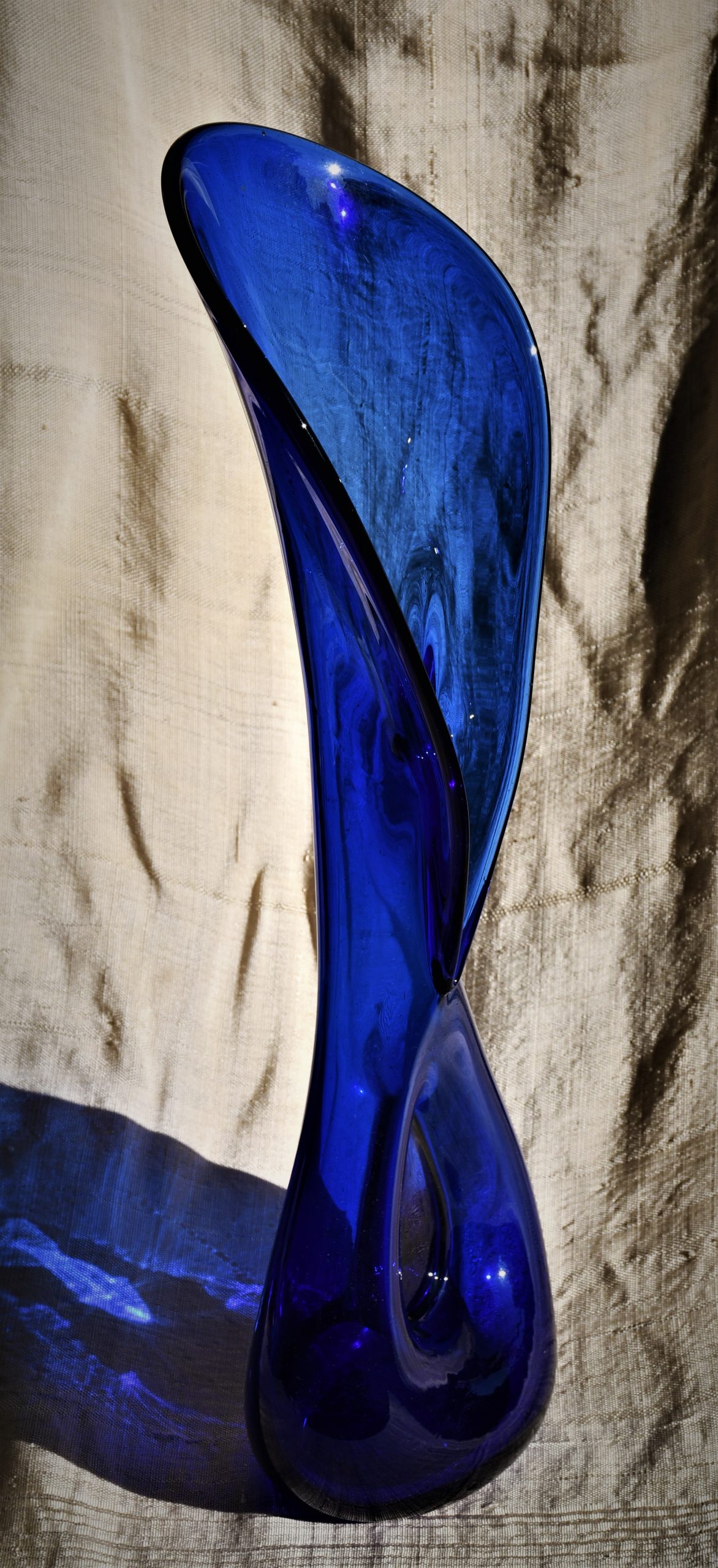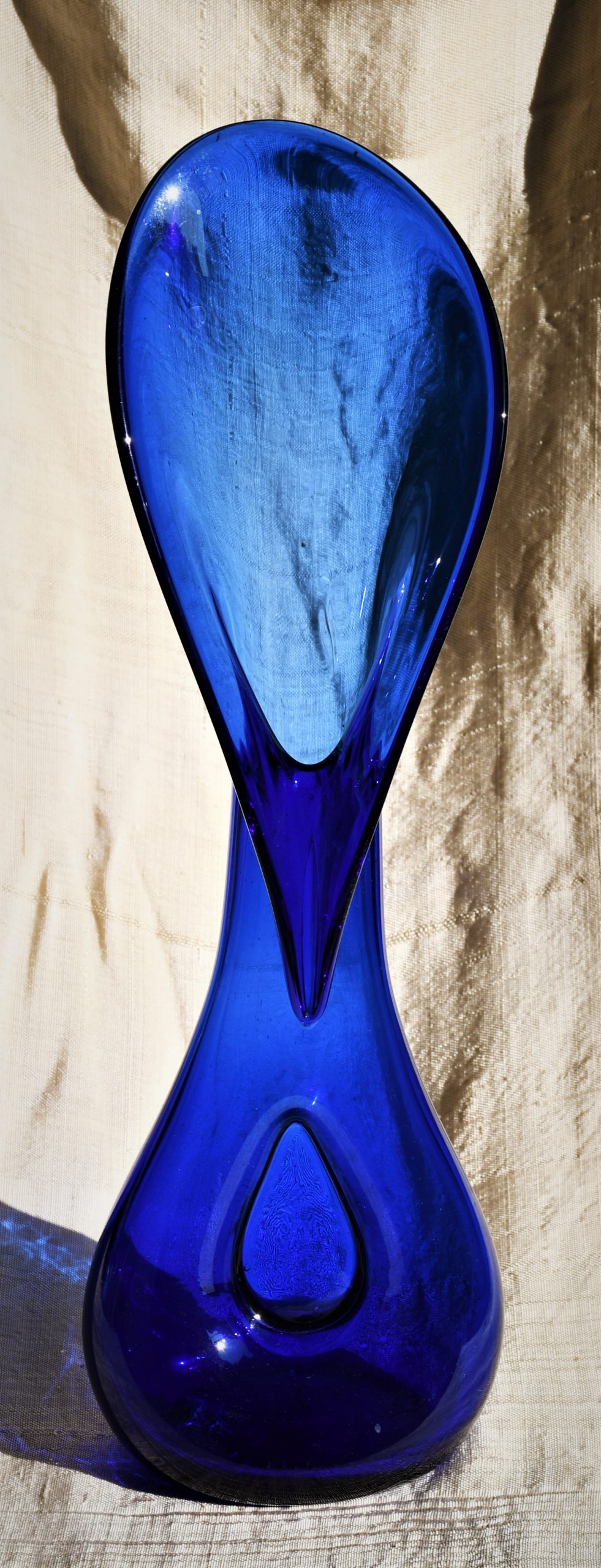 Стилна арт-глас ваза от кобалтово стъкло. Ръчна изработка. Голям размер – височина 43 см.
