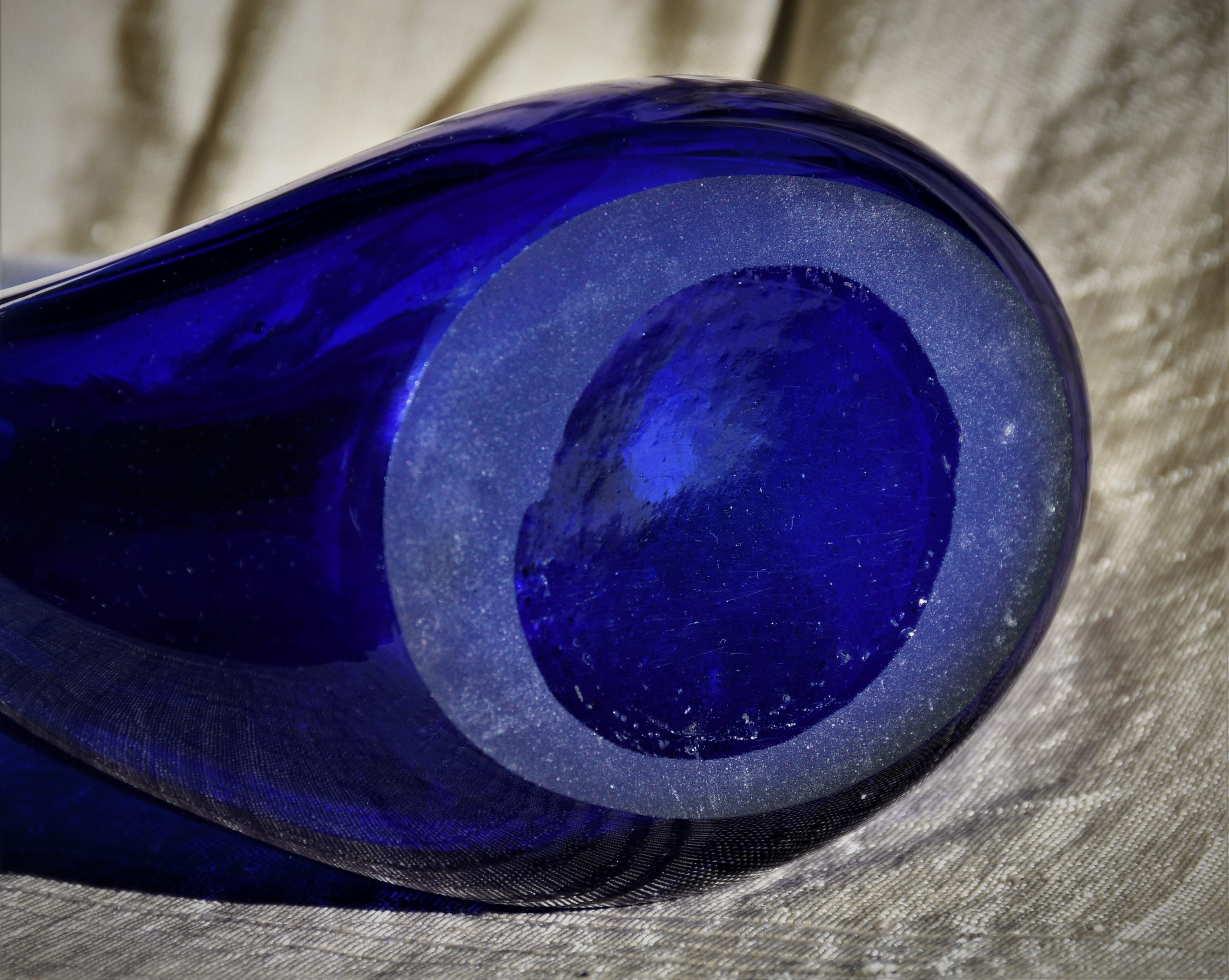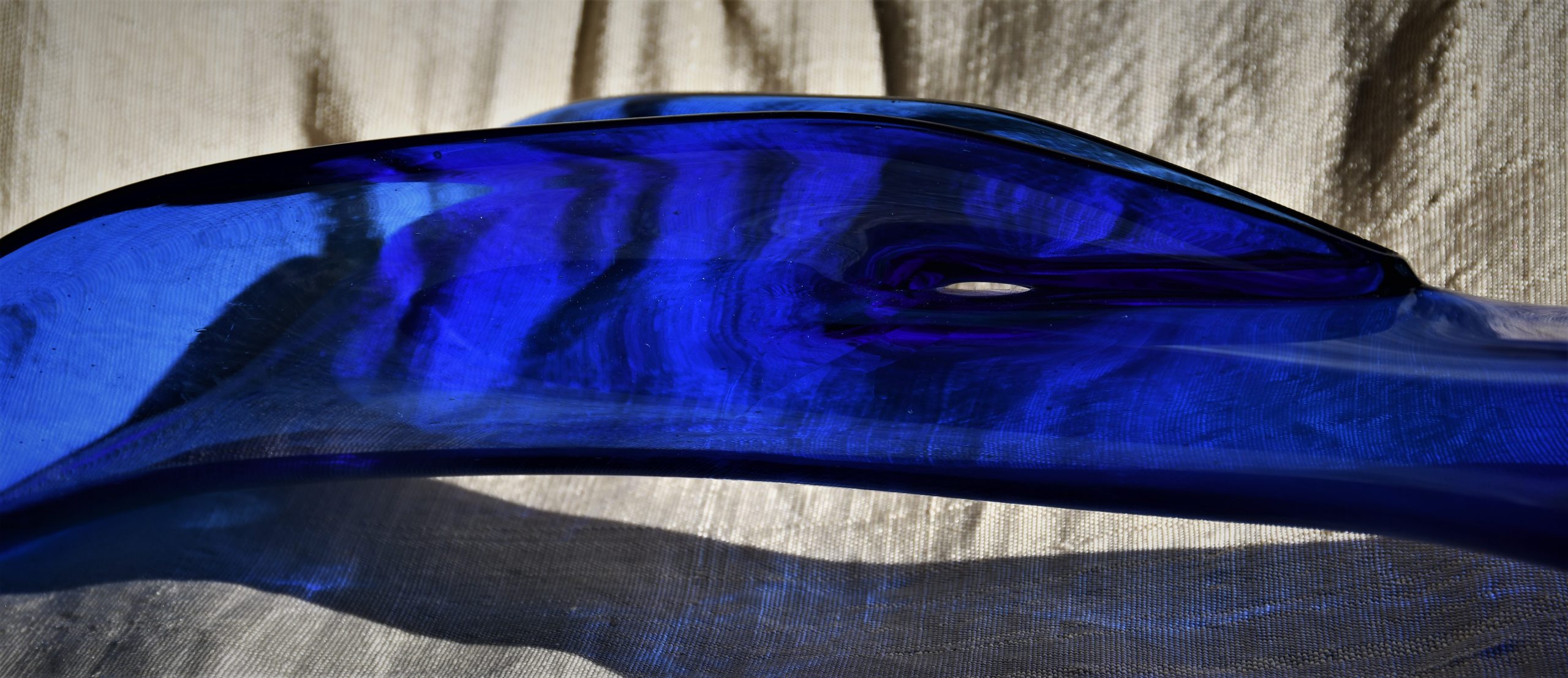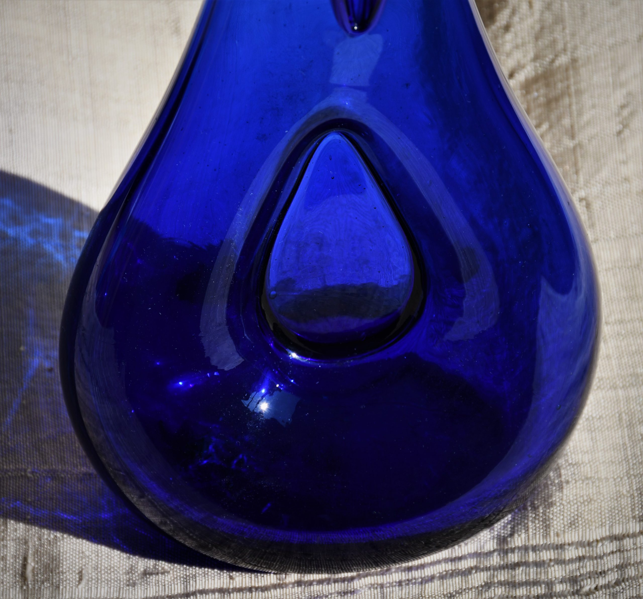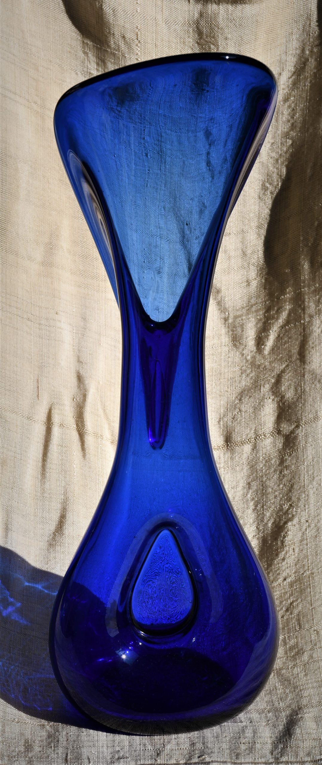 Стилна арт-глас ваза от кобалтово стъкло. Ръчна изработка. Голям размер – височина 43 см.