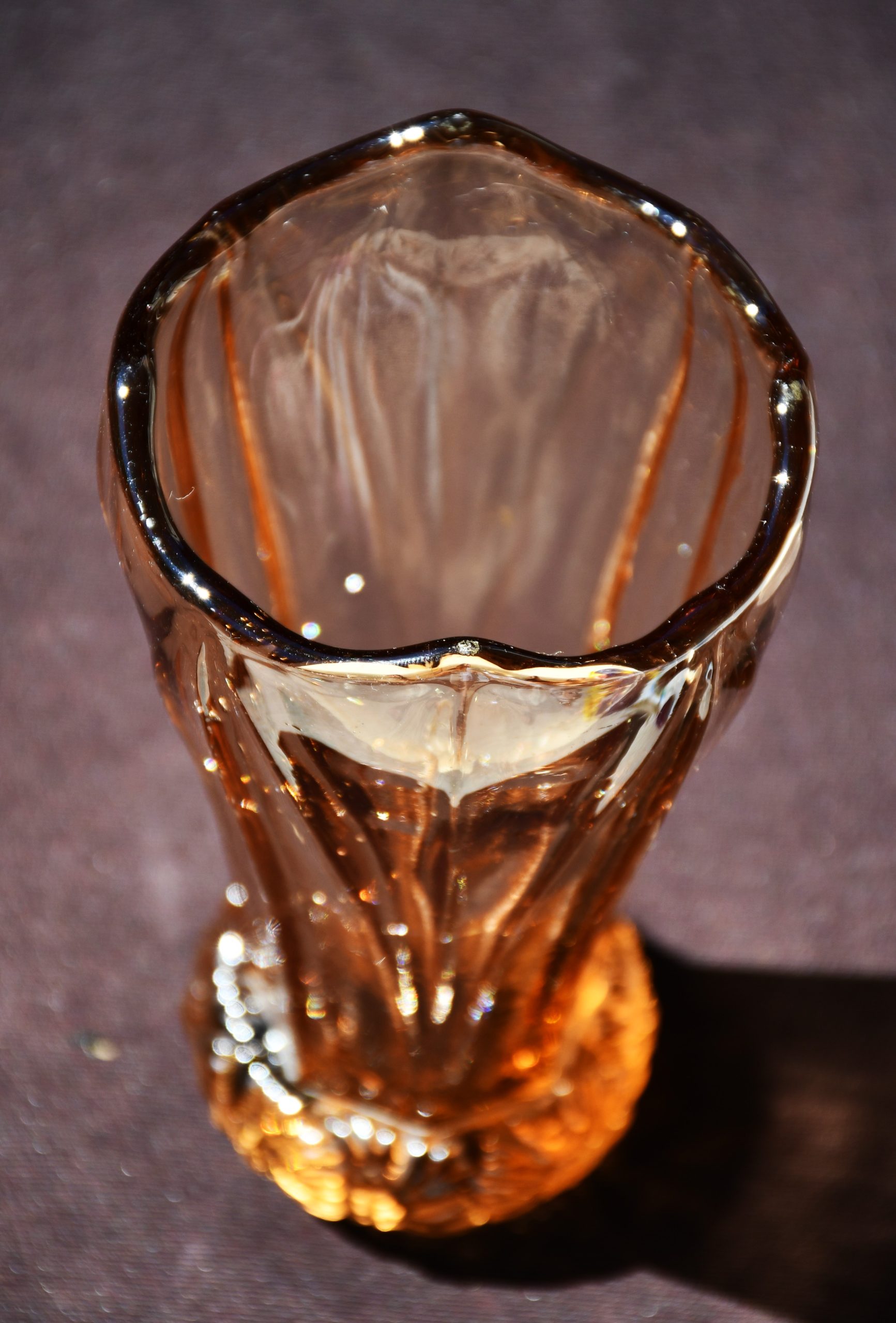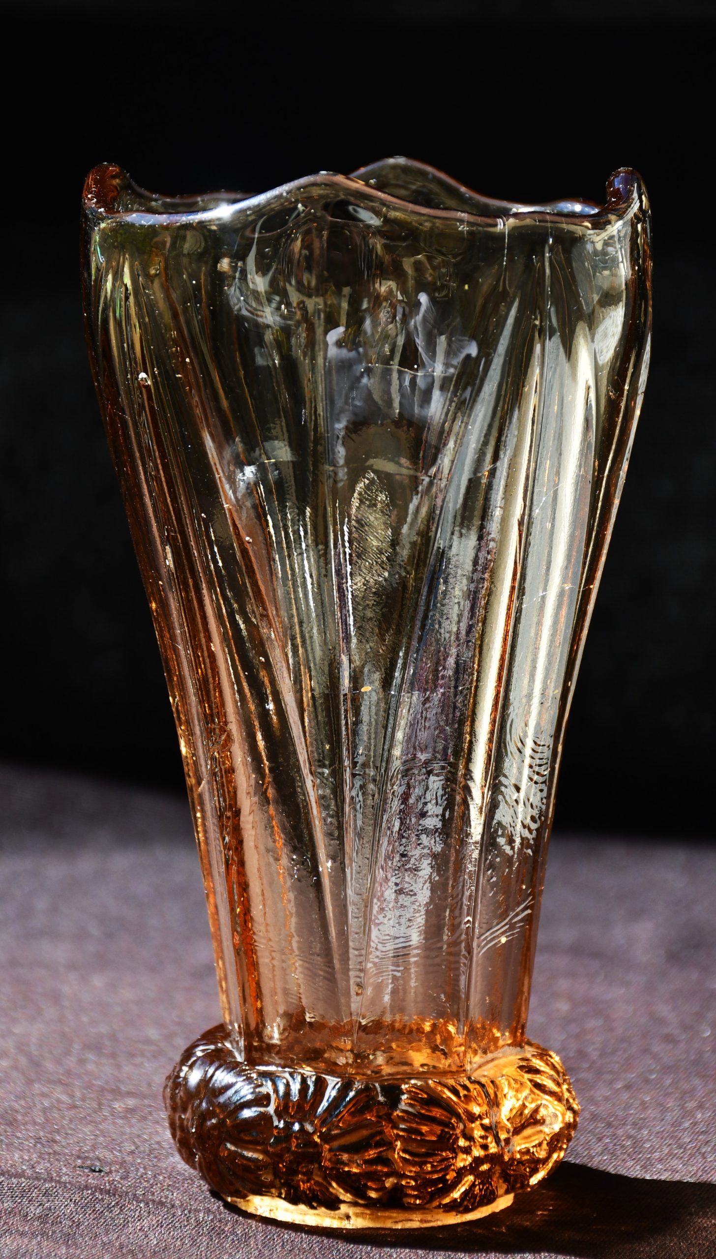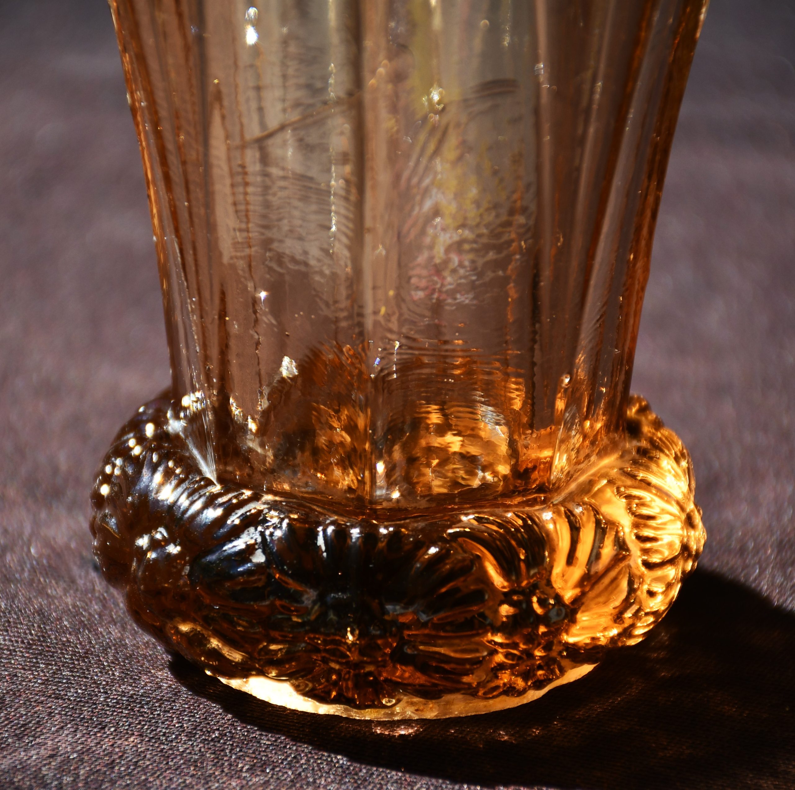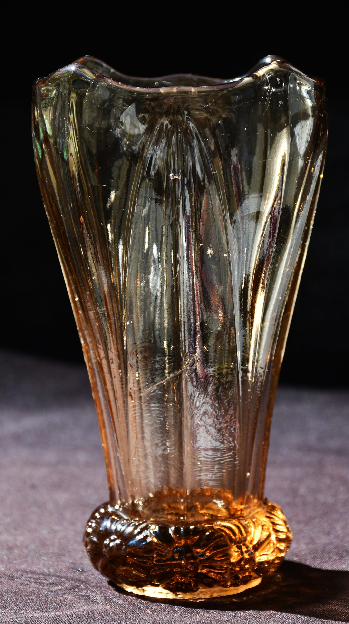 „Bohemia“ – Vintage ваза Art Deco в стила на Kurt Schlevogt – пресовано стъкло. Цвят amber/rosaline.
