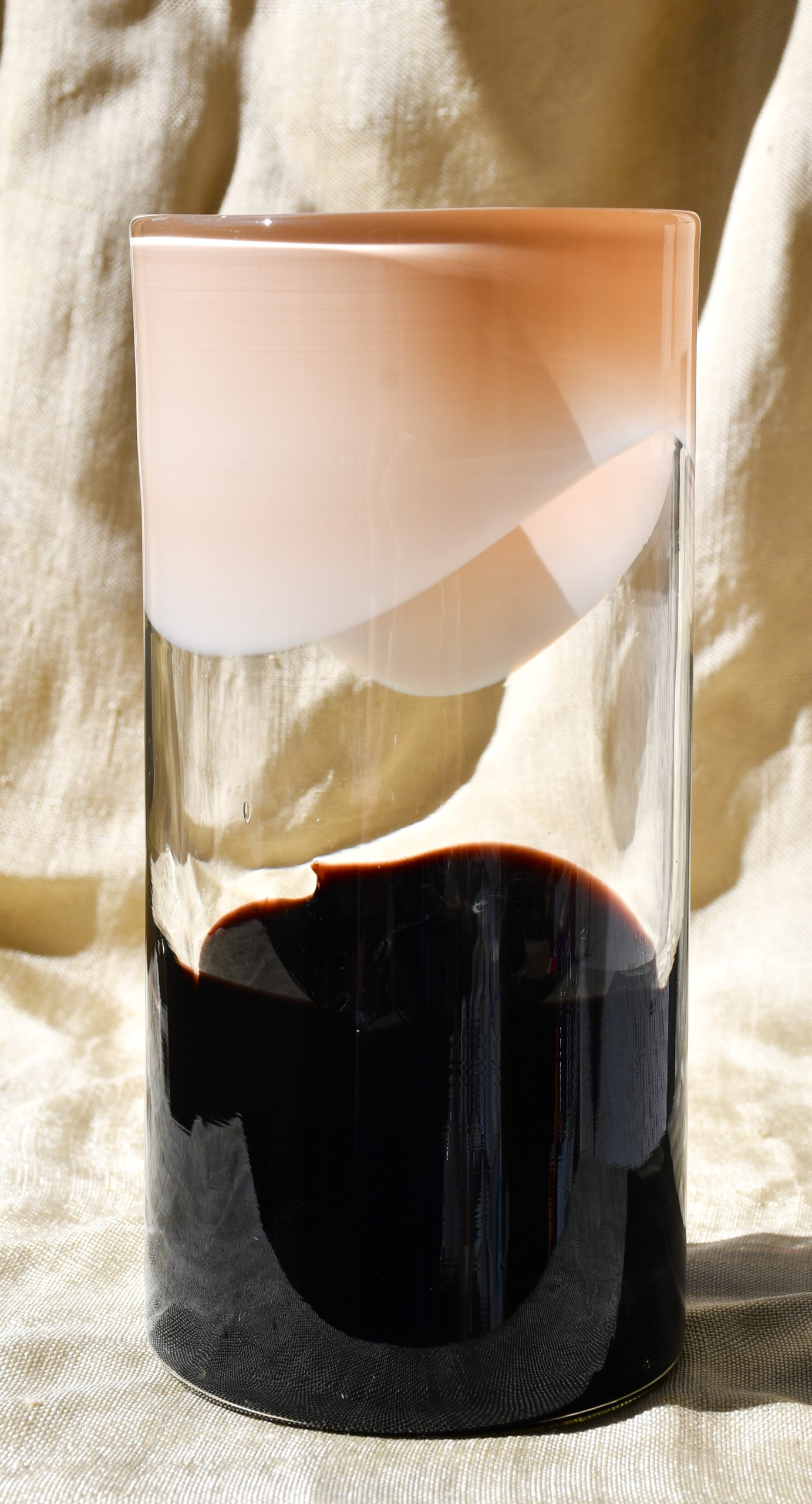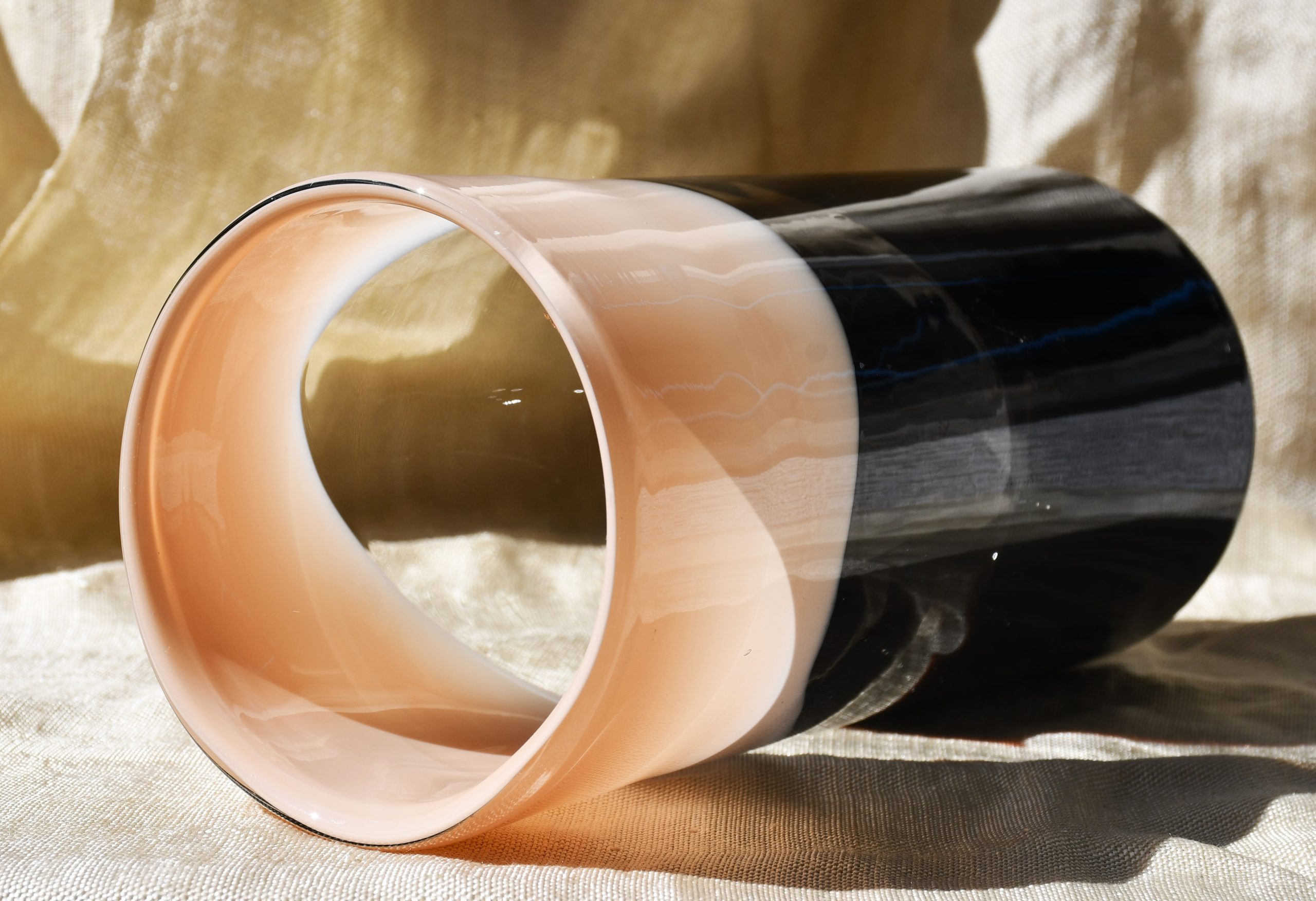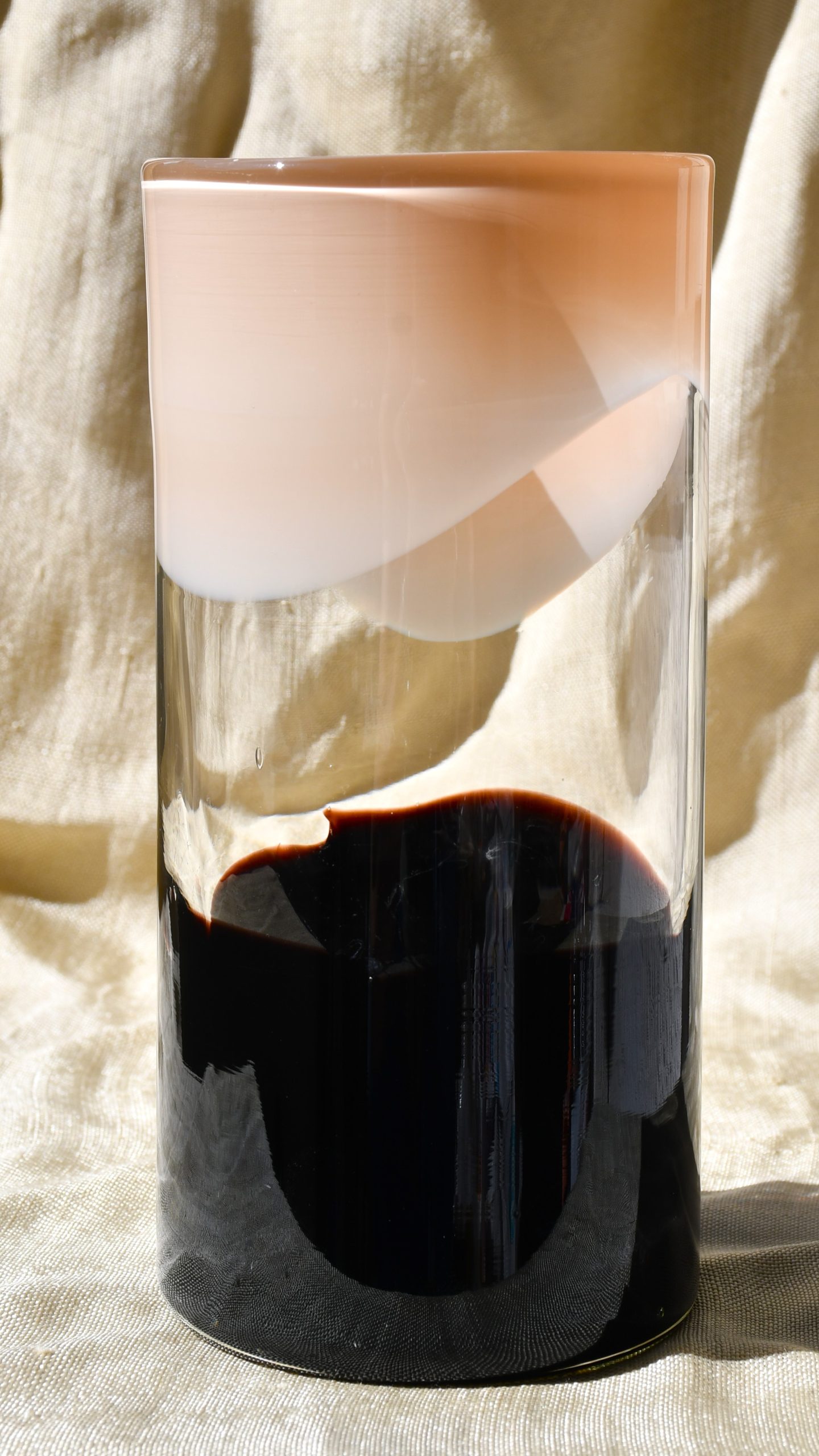 Цилиндрична форма.Три редуващи се цвята в свободни граници – шоколад, прозрачно и капучино. Ръчно полирано дъно – в стил „лупа“. Много впечатляващ и запомнящ се предмет.