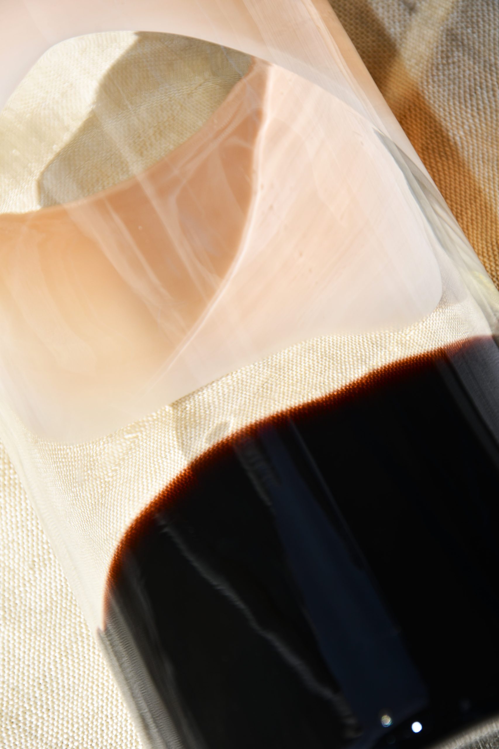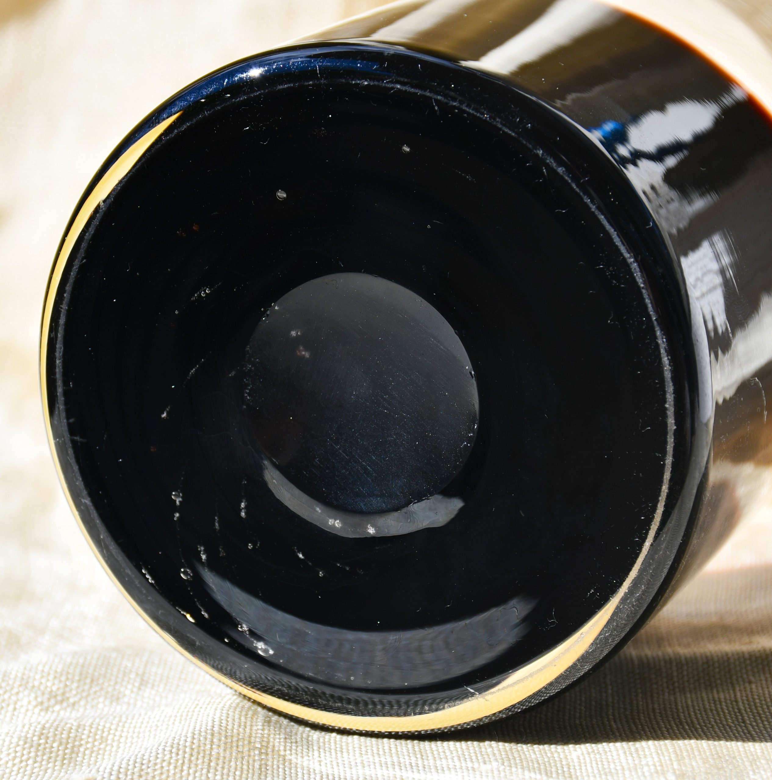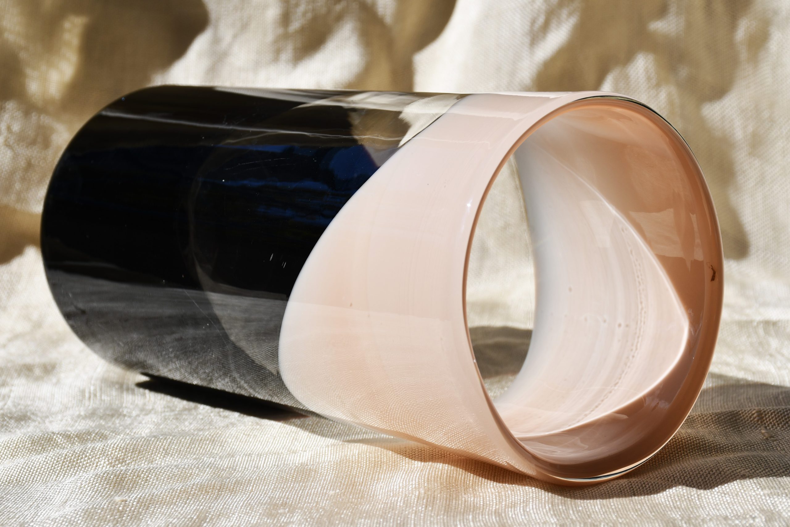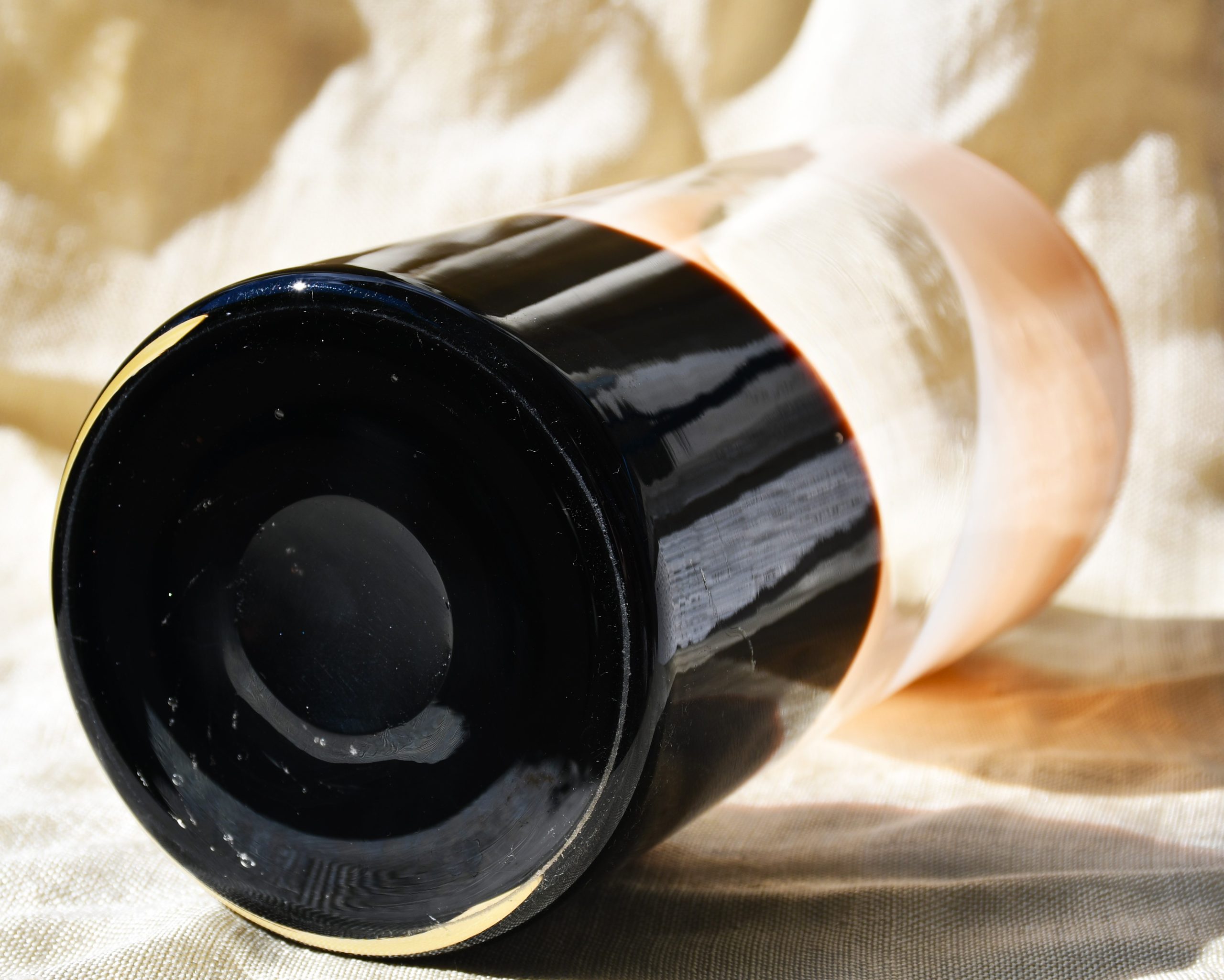 Цилиндрична форма.Три редуващи се цвята в свободни граници – шоколад, прозрачно и капучино. Ръчно полирано дъно – в стил „лупа“. Много впечатляващ и запомнящ се предмет.