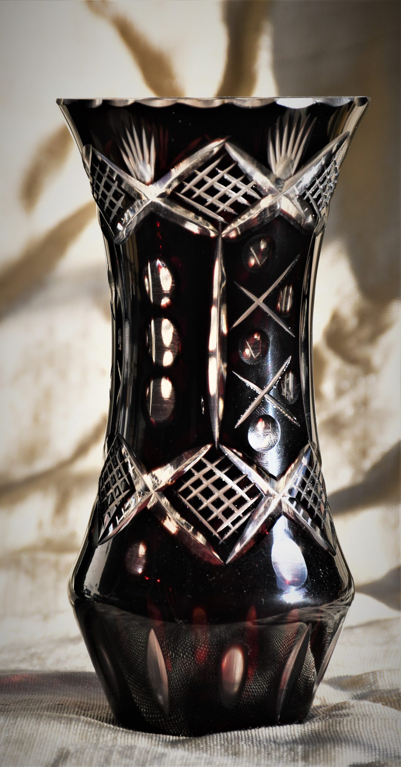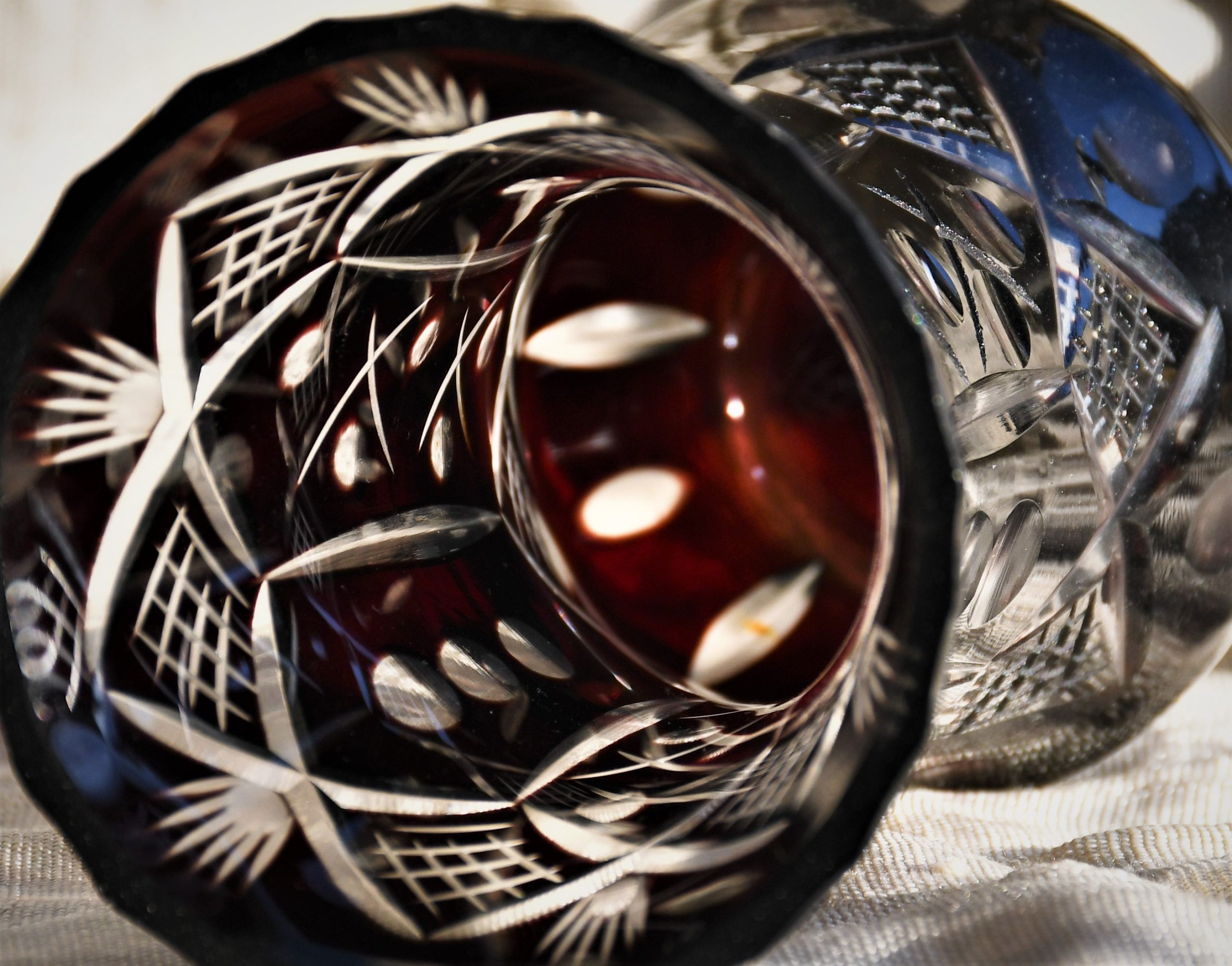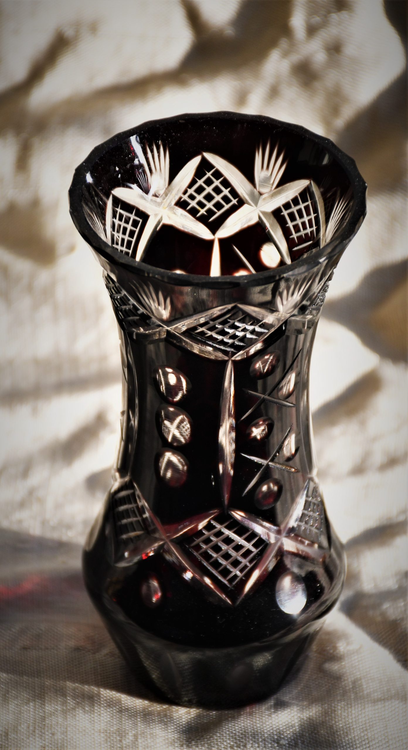 Малка, но очарователна винтидж ваза, произведена от Perla Lux, Румъния през 1960-те. Двуслоен кристал. Ръчна гравировка по технологията ruby-to-clear.