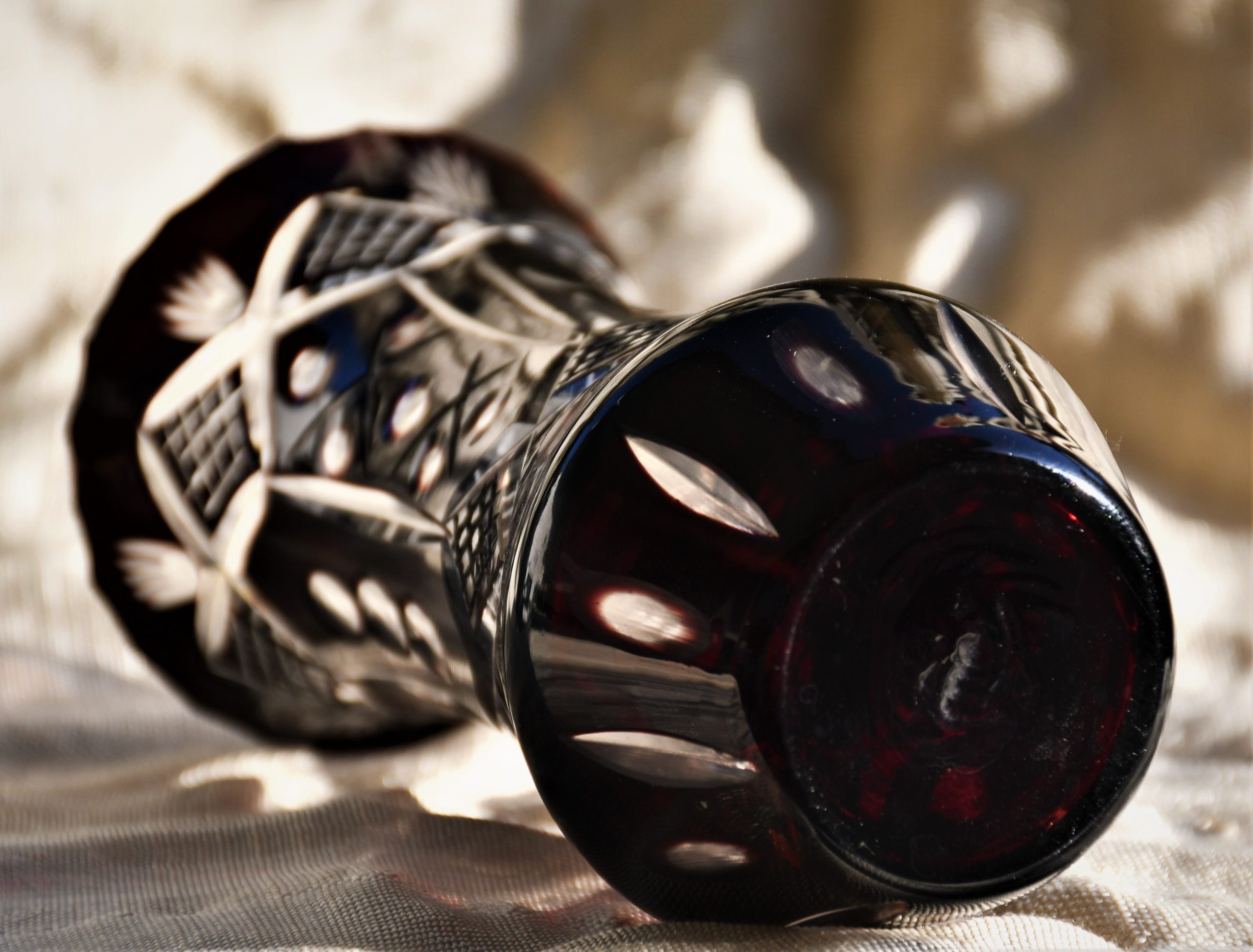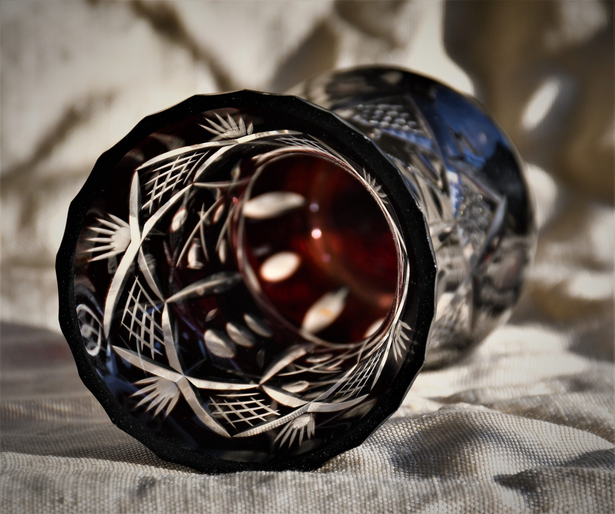 Наситено тъмно червено, клонящо към сливово. Рязък контраст с прозрачните участъци от гравировката. Чудесни светлинни ефекти при промяна на осветлението.