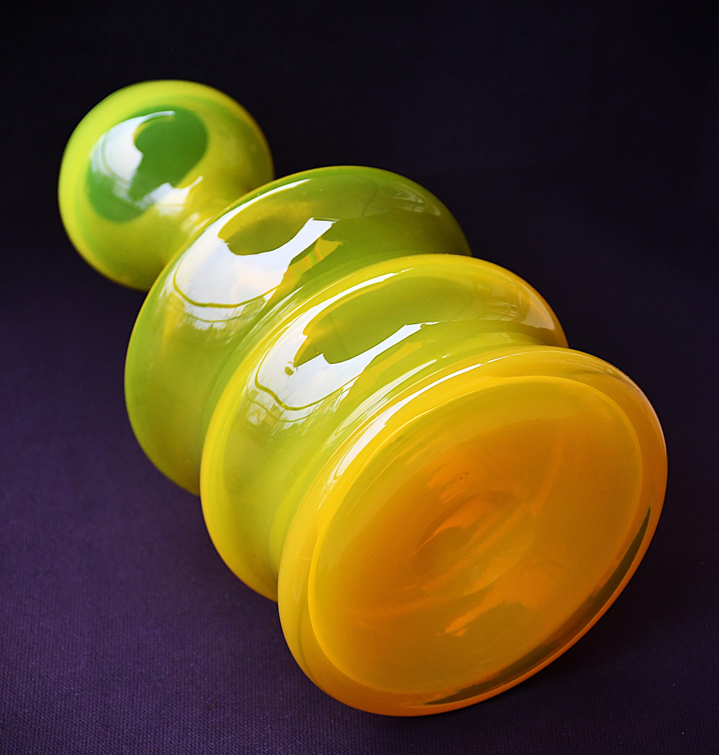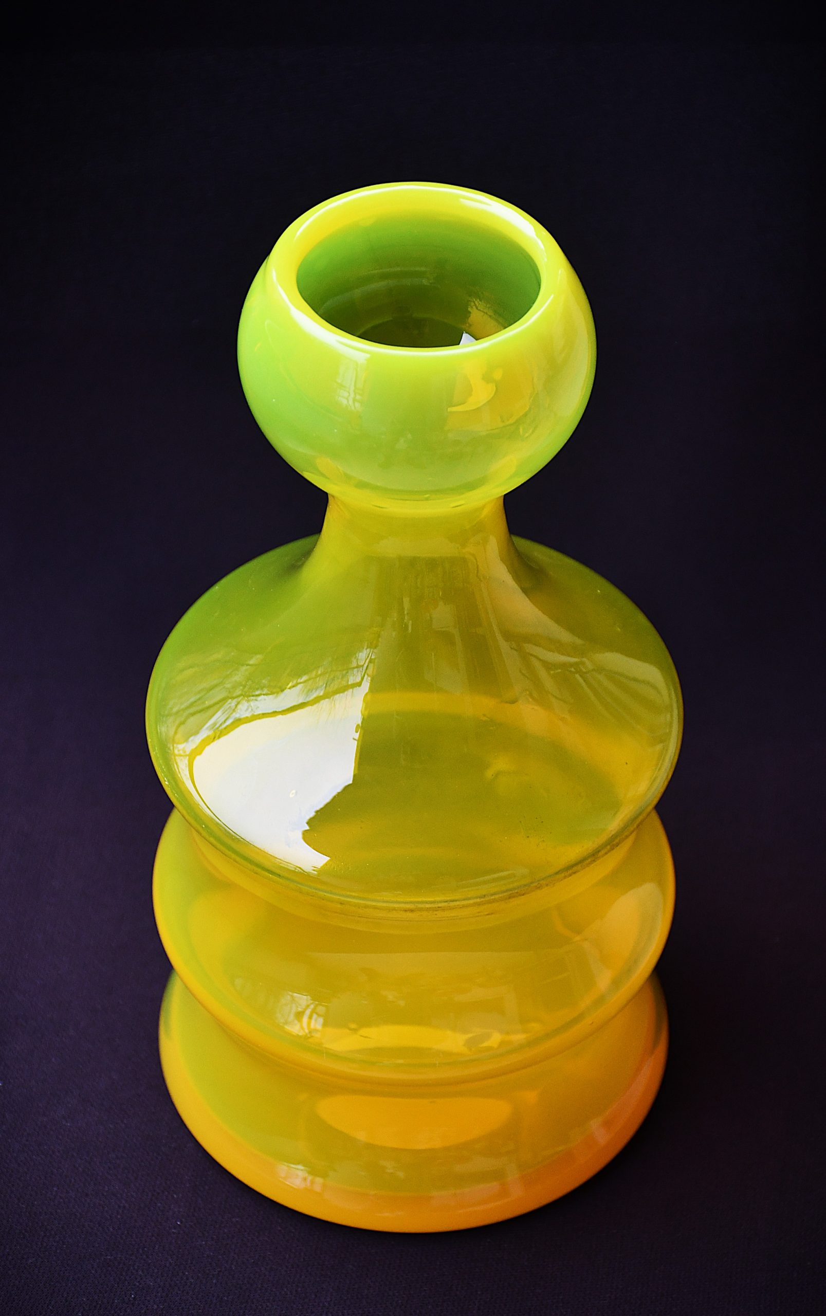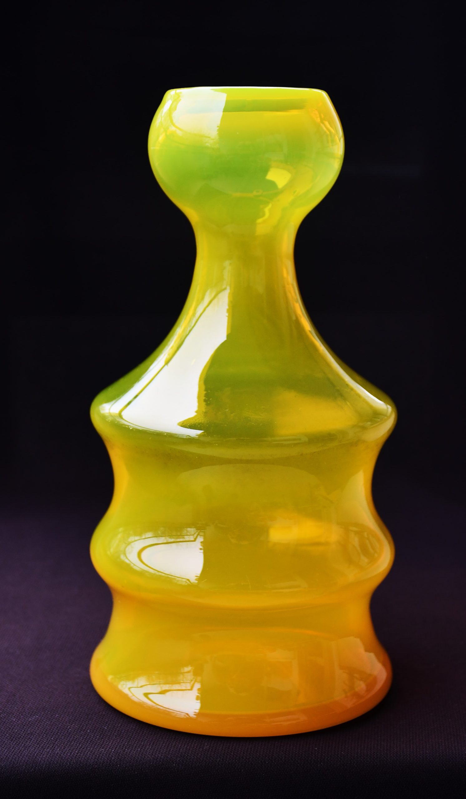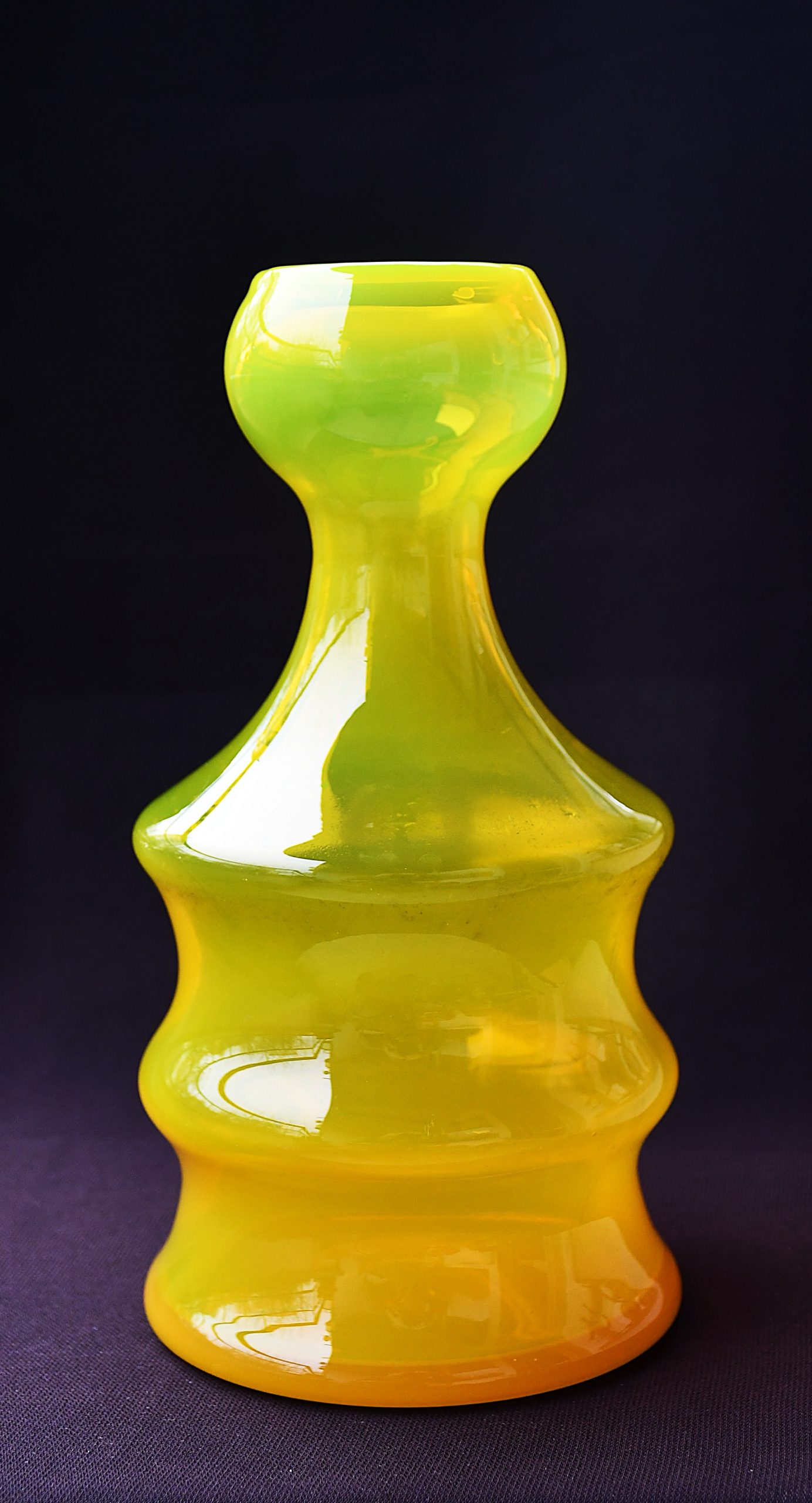 Превъзходен Mid-century modern предмет. Дизайн и ръчна изработка на едно от най-известните имена в полското арт-стъкло на XXв. – Kazimierz Krawczyk. Модел „Żyrafa“ (Жираф). В характерна MCM форма, тай наречения „шведски стил“ – върхът на сладоледа в художественото стъкло за периода. Изработена в студио Huta Barbara, филиал на Sudety Glassworks за експериментални и артистични производства.