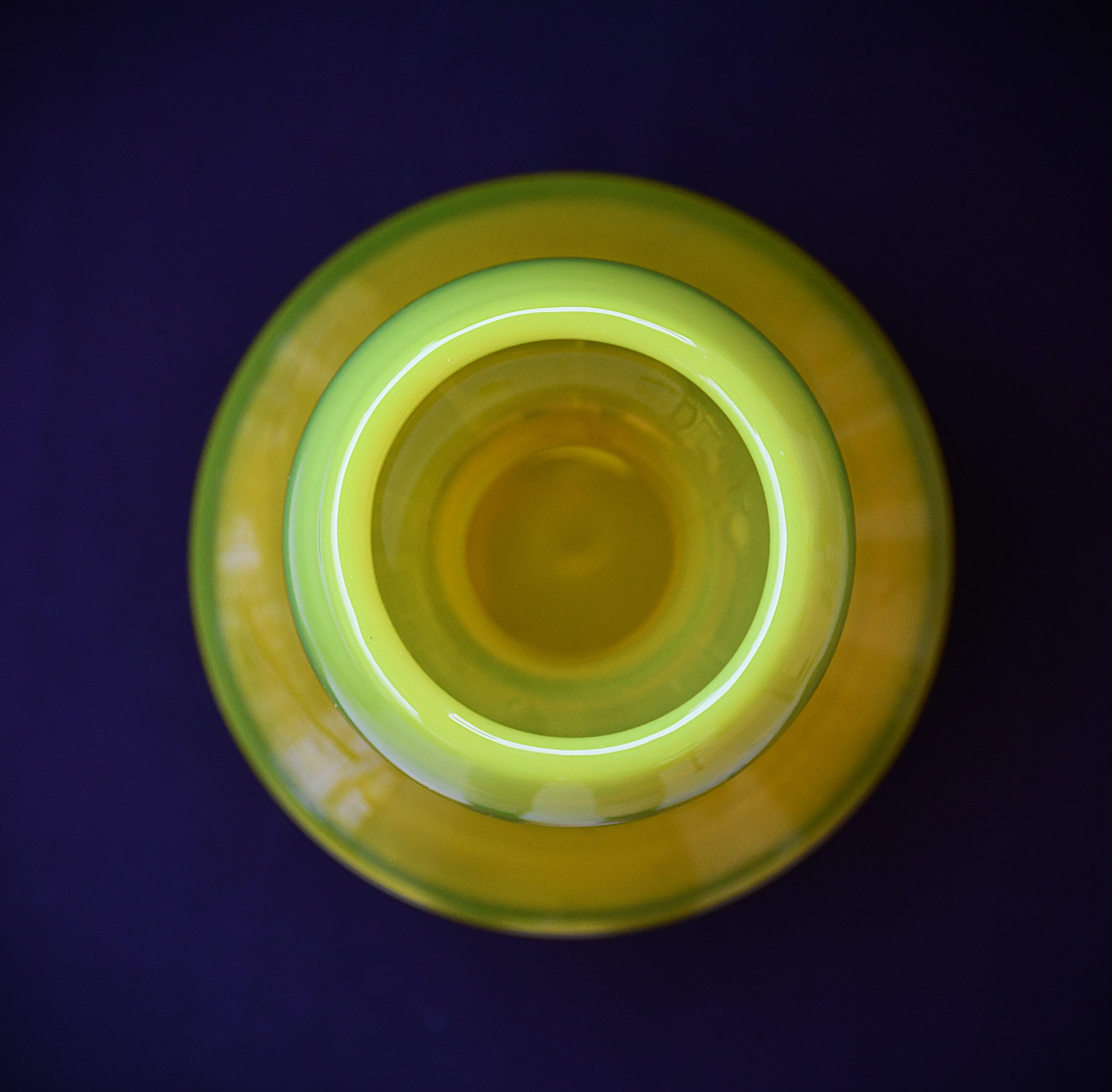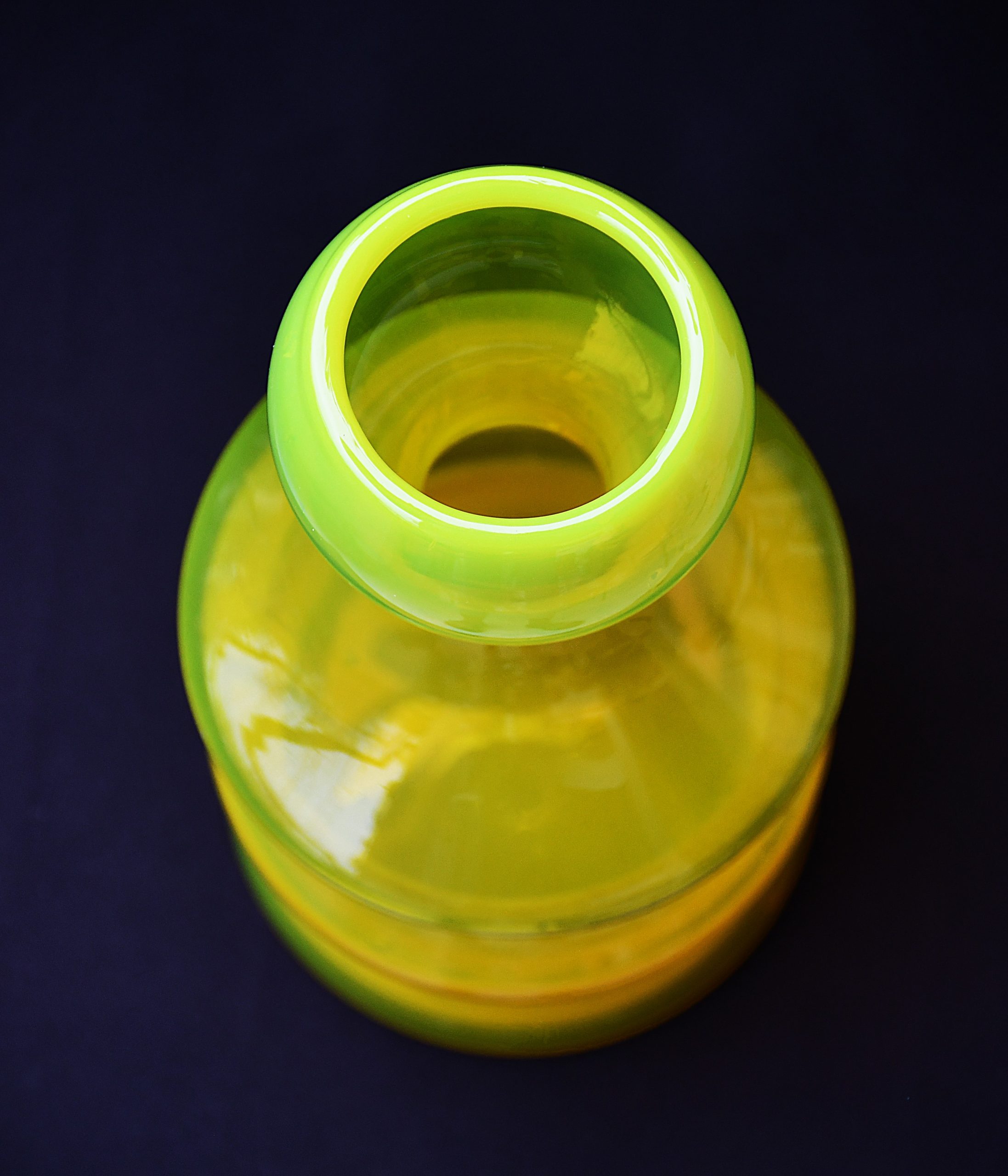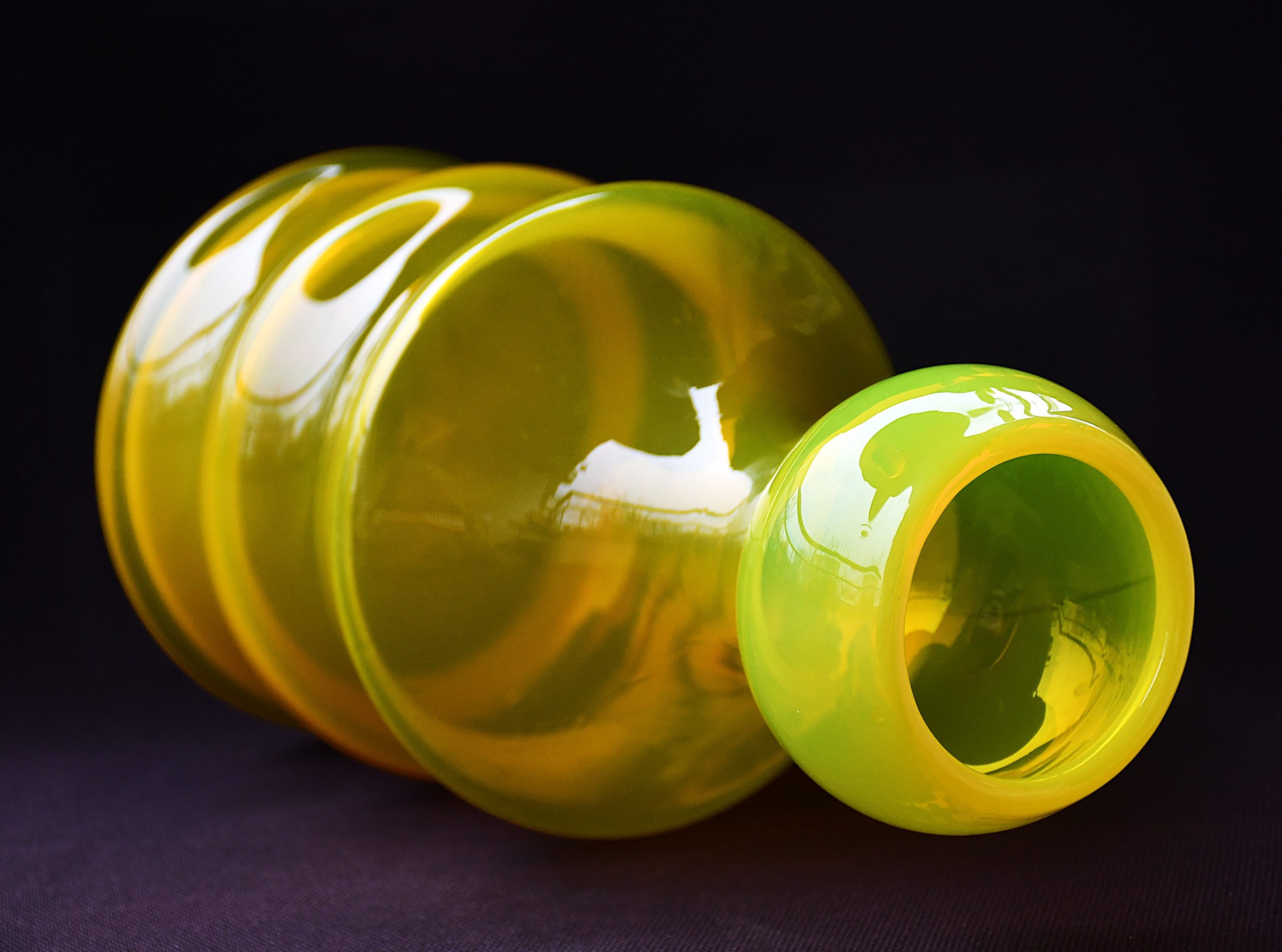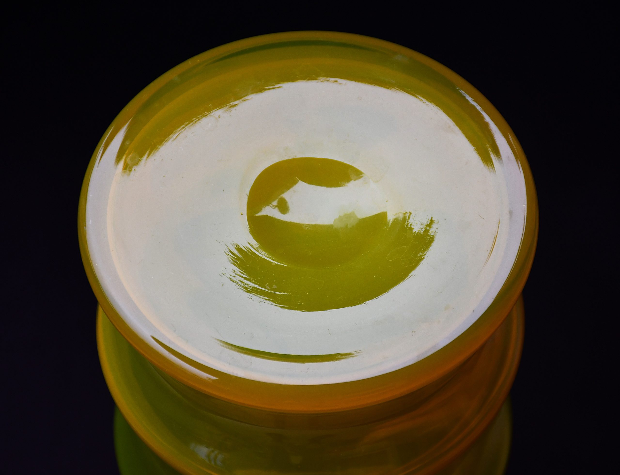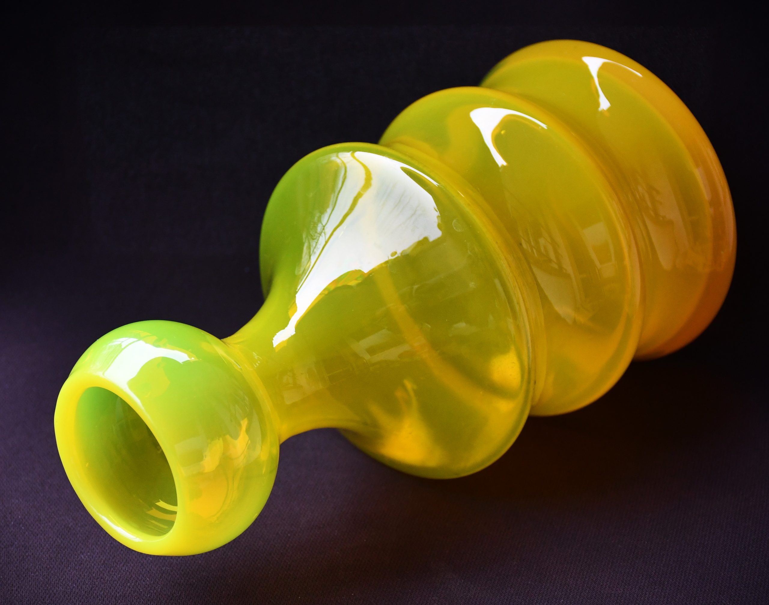 Превъзходен Mid-century modern предмет. Дизайн и ръчна изработка на едно от най-известните имена в полското арт-стъкло на XXв. – Kazimierz Krawczyk. Модел „Żyrafa“ (Жираф). В характерна MCM форма, тай наречения „шведски стил“ – върхът на сладоледа в художественото стъкло за периода. Изработена в студио Huta Barbara, филиал на Sudety Glassworks за експериментални и артистични производства.