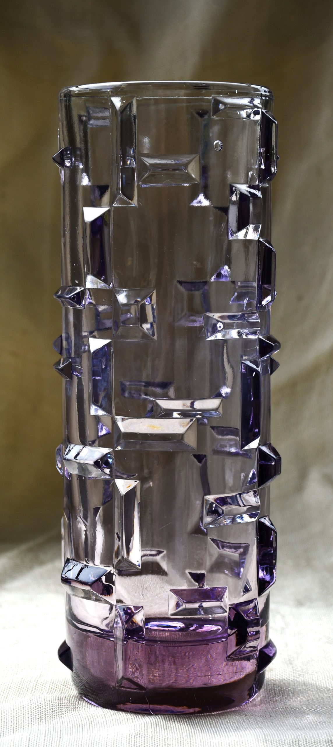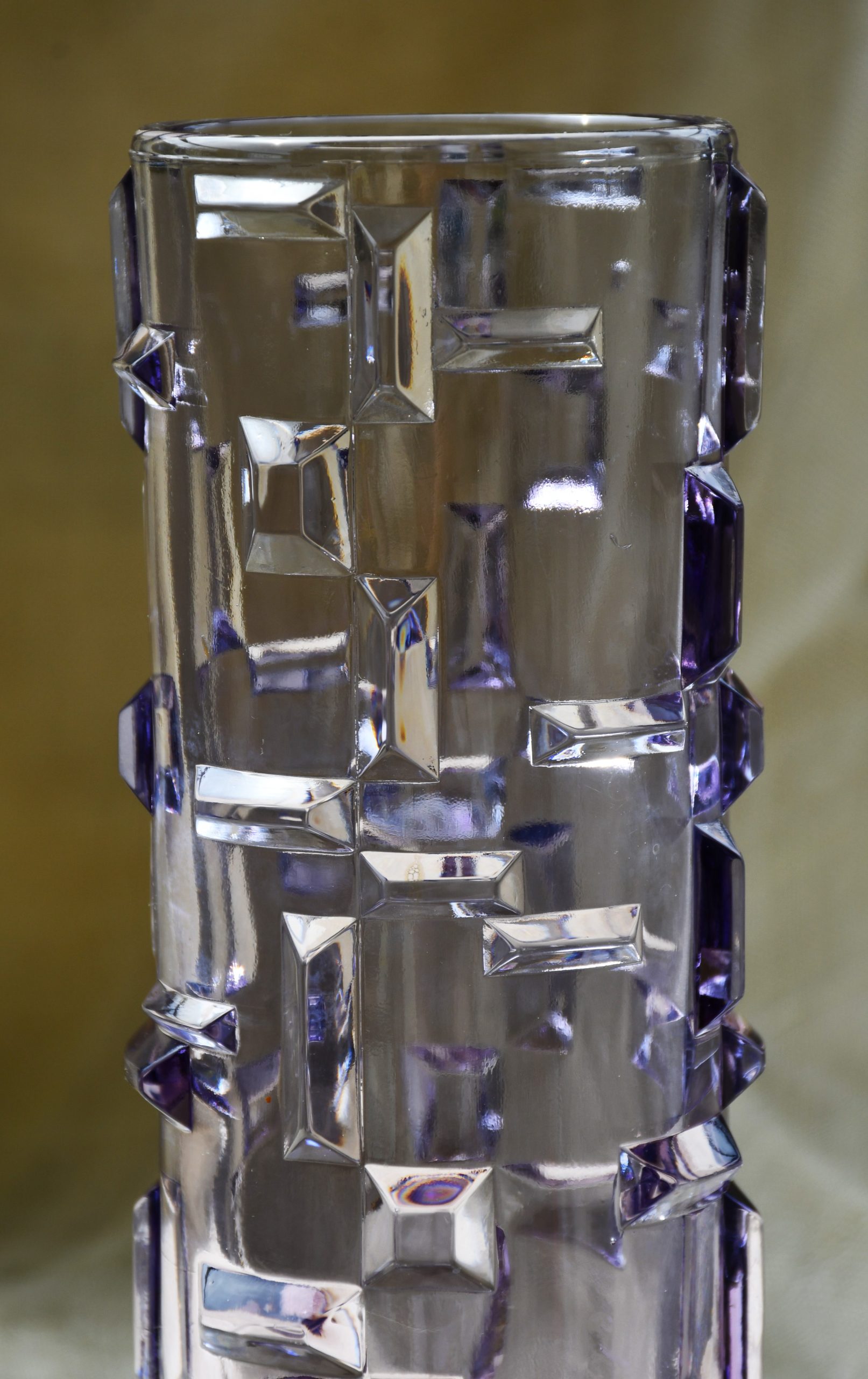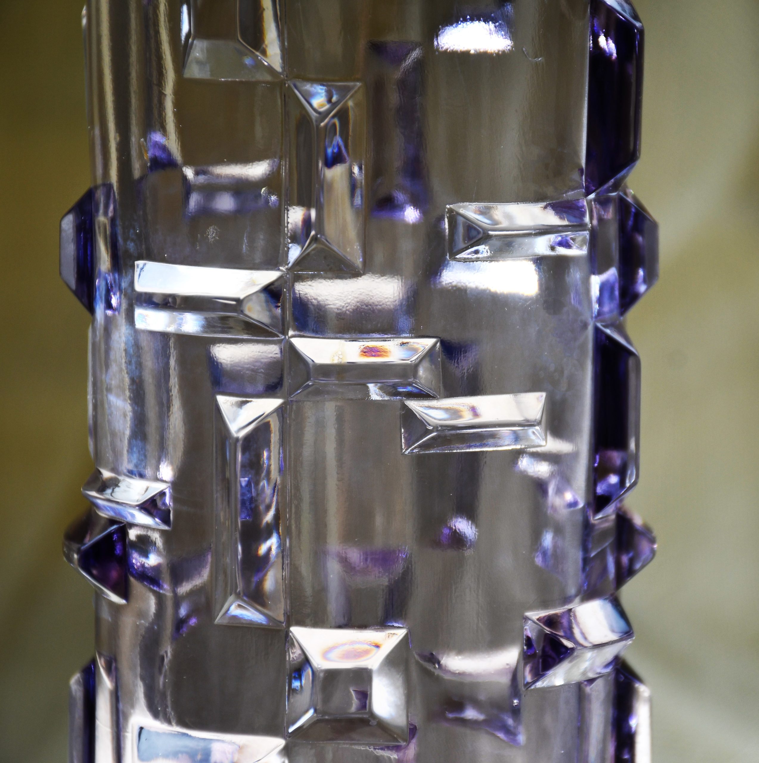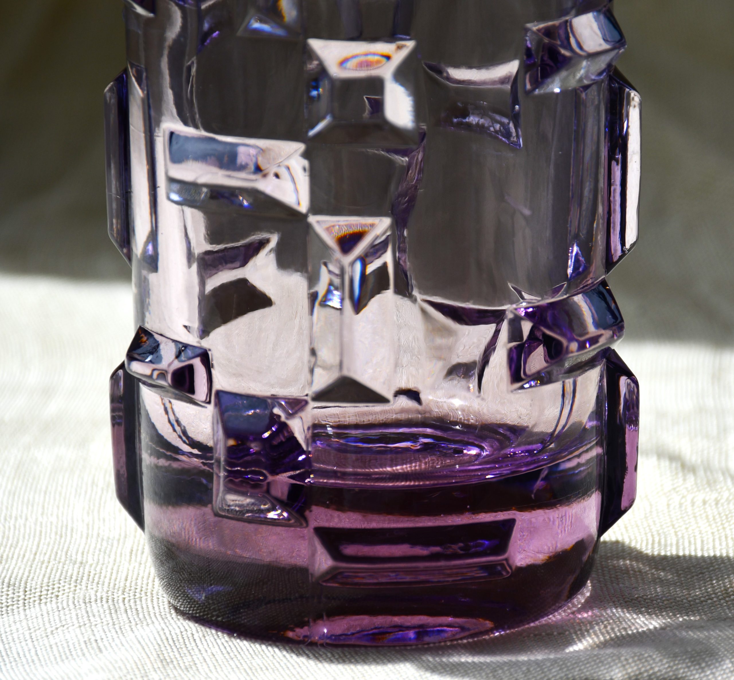Пресовано „александрит“ стъкло. Нарича се още неодимиево стъкло и е характерно с това, че променя цвета си при различни източници на светлина. Голям хит през 60те и 70те години.