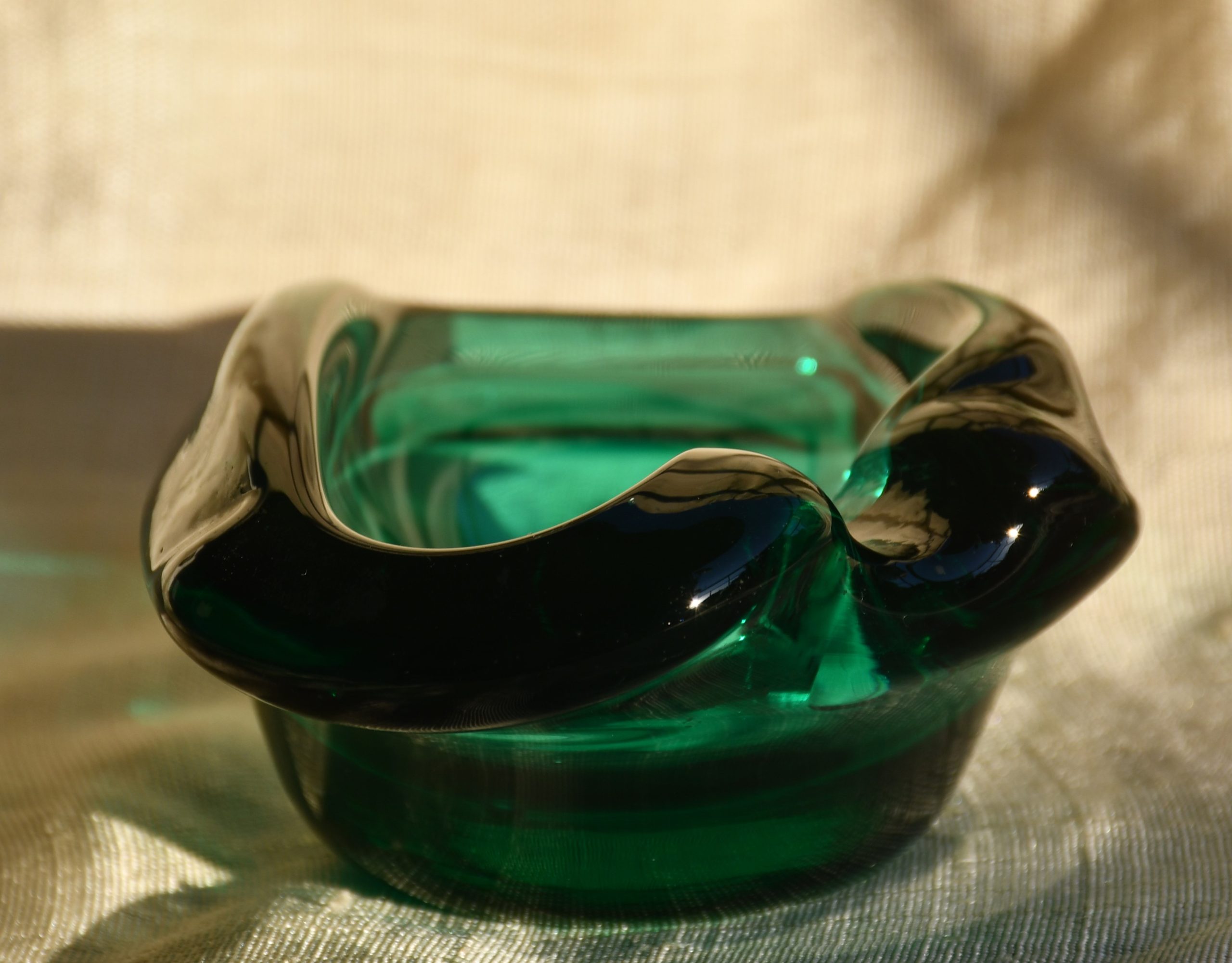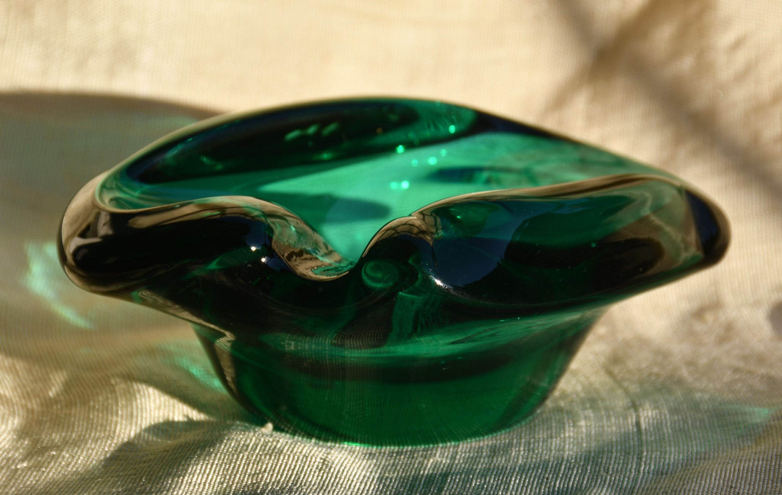 Красив пепелник от цветно стъкло. Midcentury-modern дизайн. Датировка 1960-те. Ръчно духано стъкло с ръчна шлифовка на дъното.