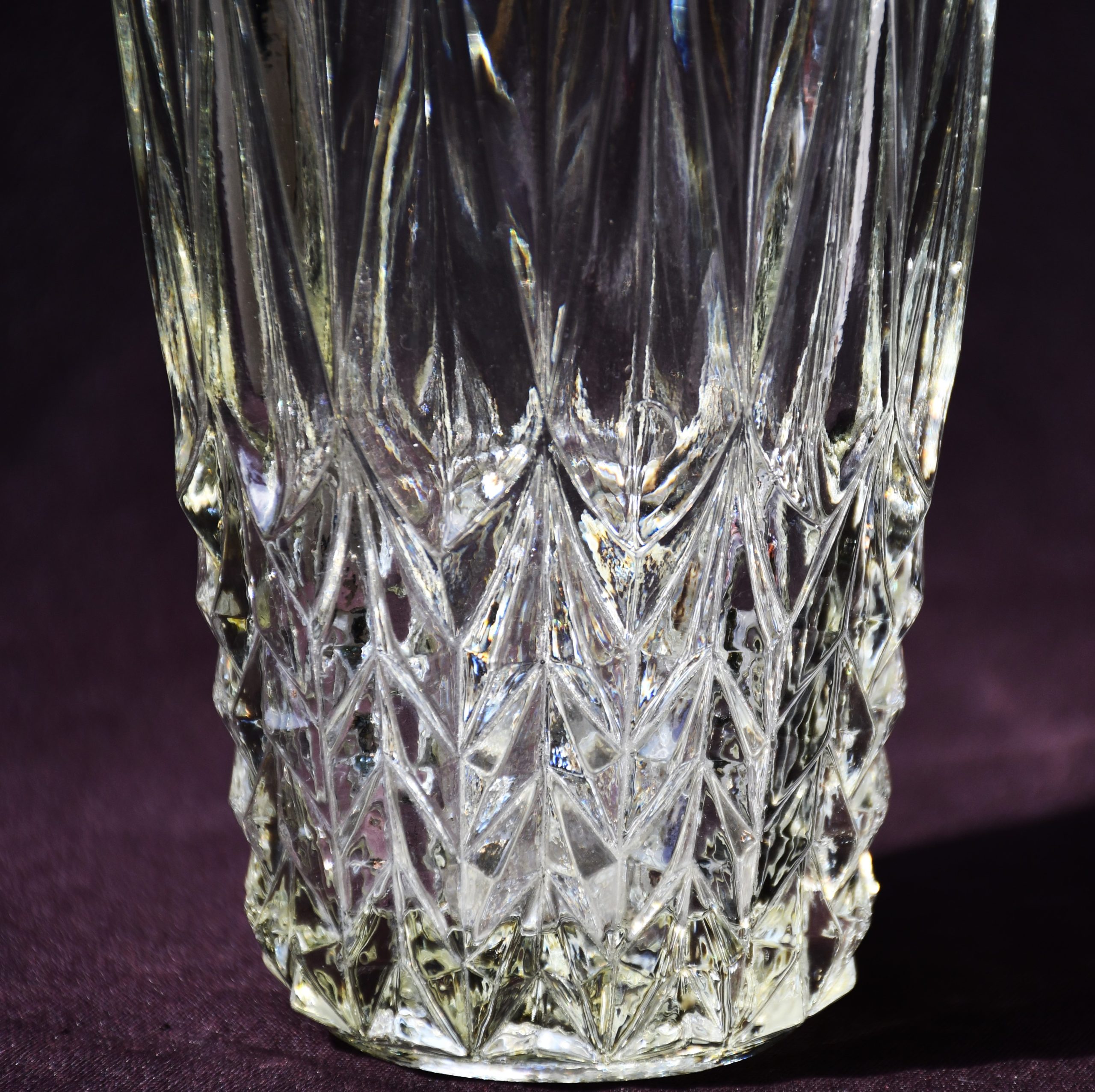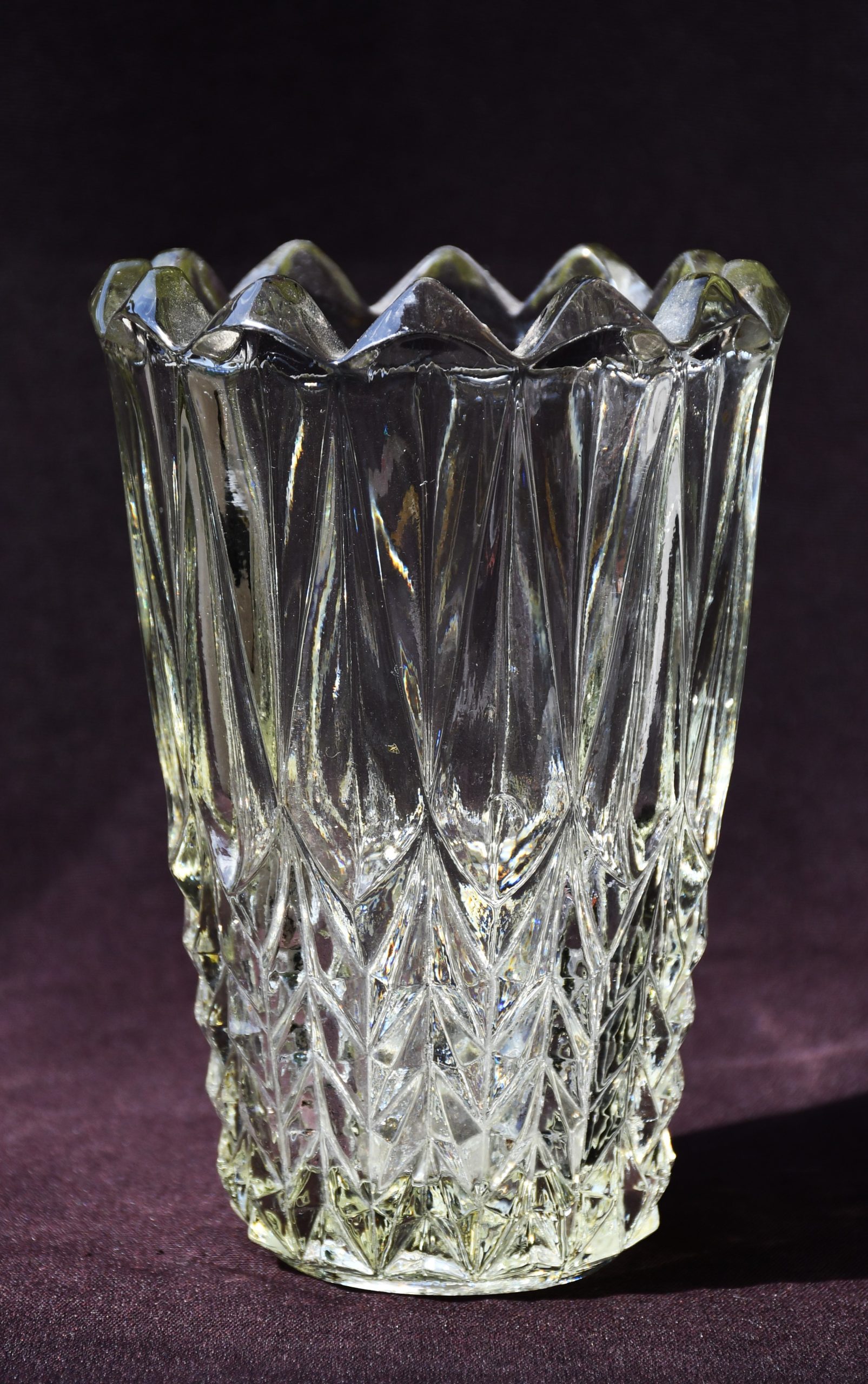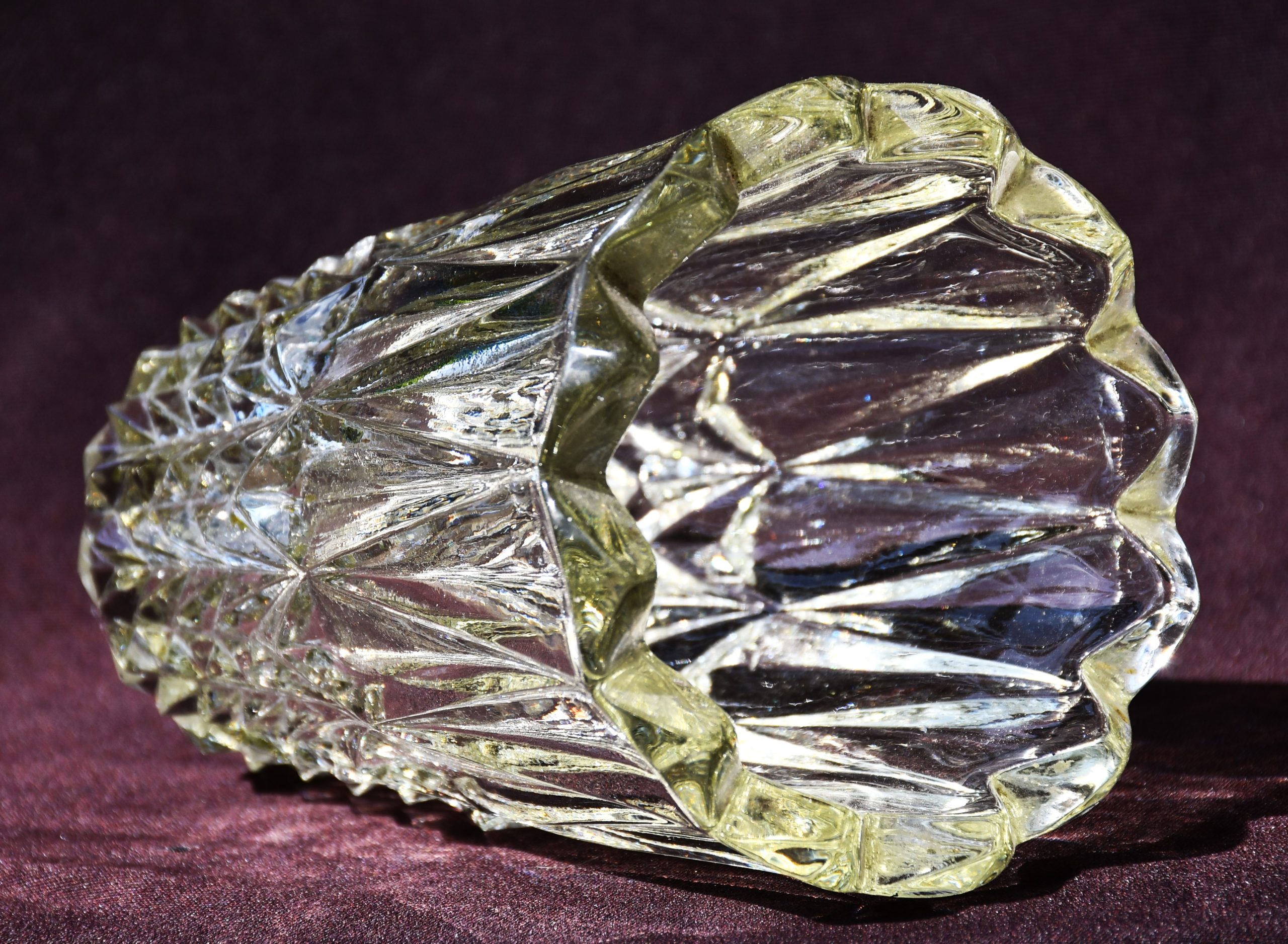 Форма, силно повлияна от традициите на Арт Деко, но с предчувствие на новото време, което вече наричаме Mid-century modern. С дебели и масивни стени, стабилен предмет. Пресовано стъкло с ръчно полирано дъно. Прозрачна, с лек цитринов нюанс. Великолепно дъпълнение и към модерен, и към класически дом.