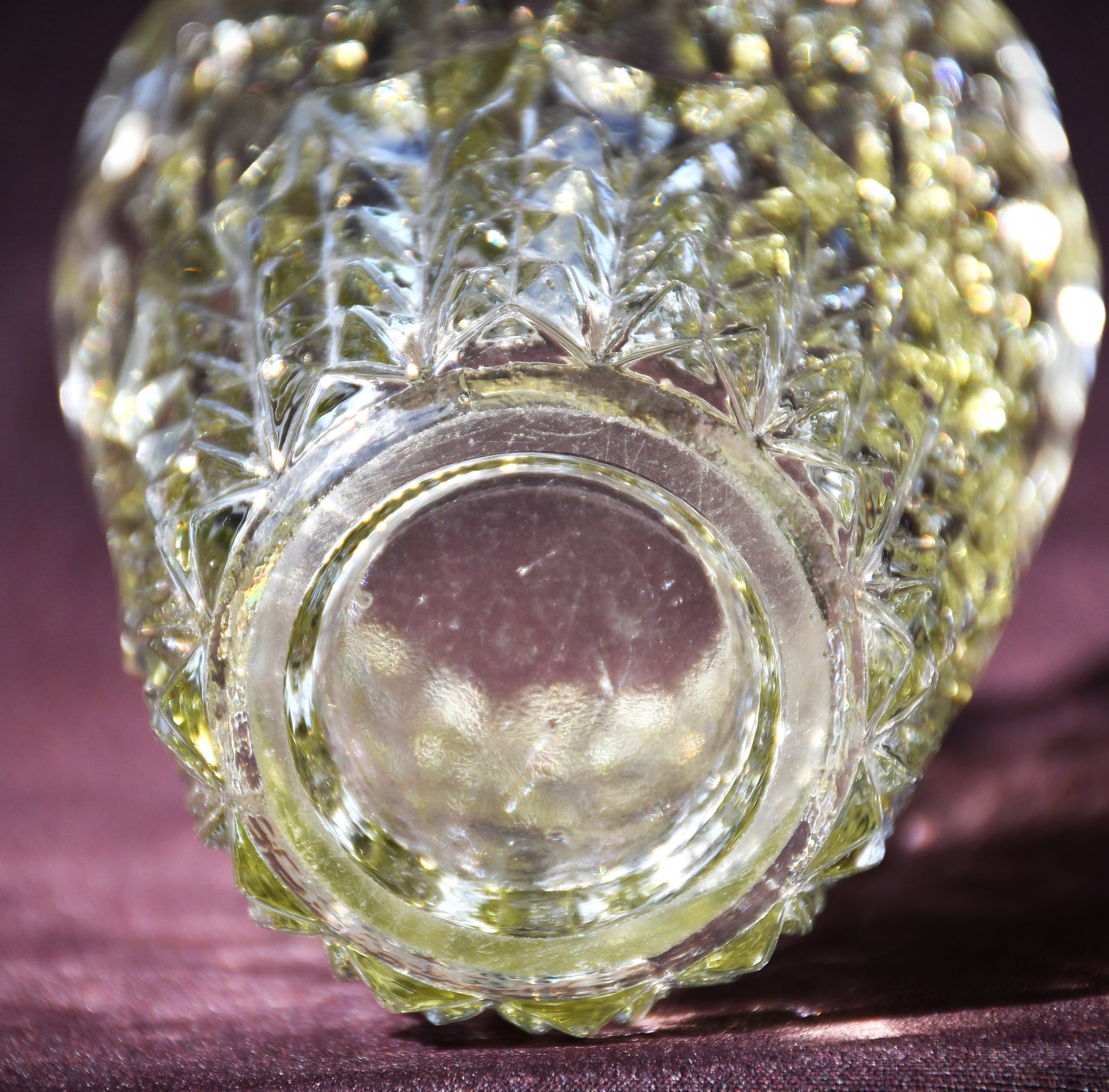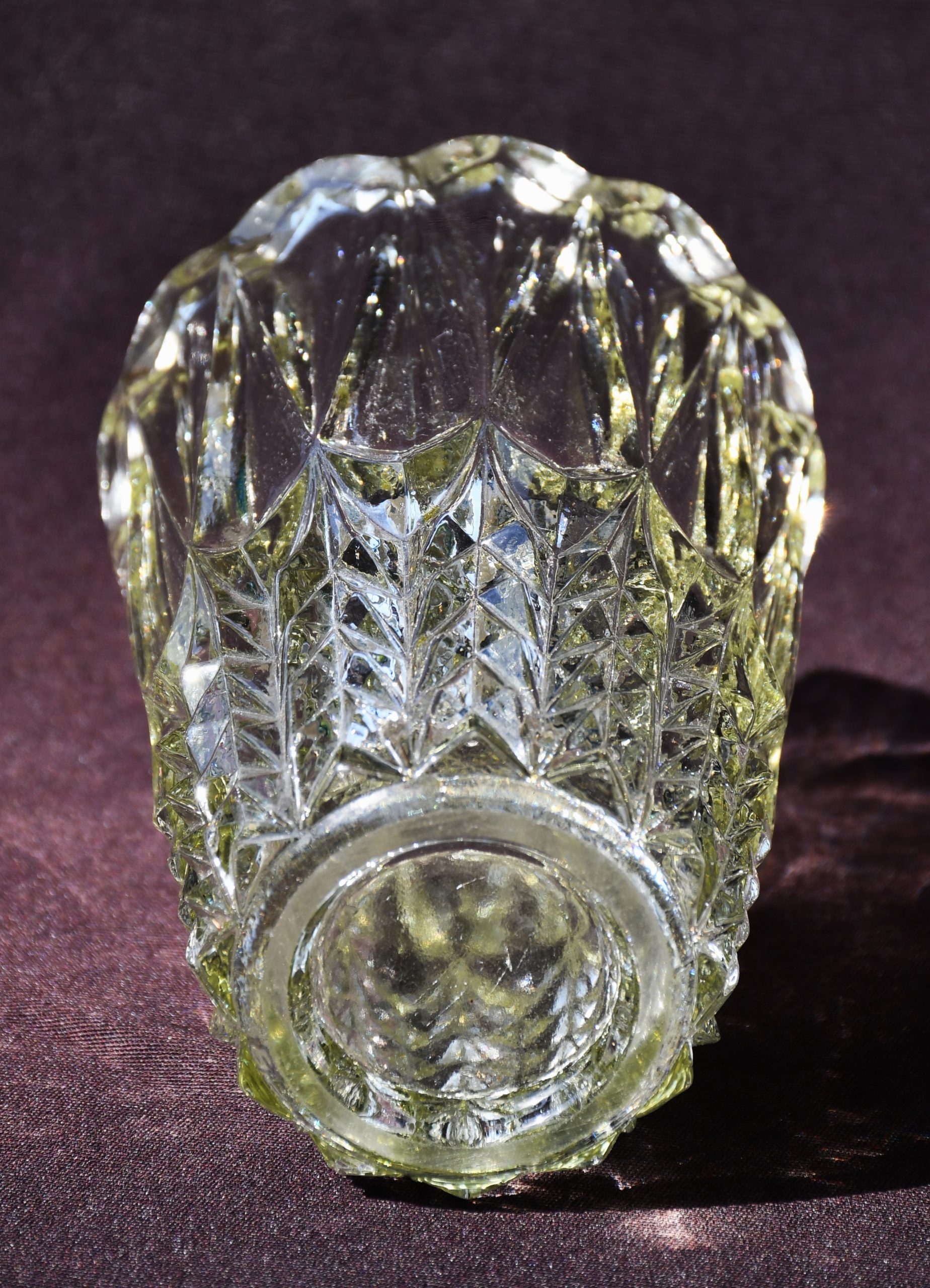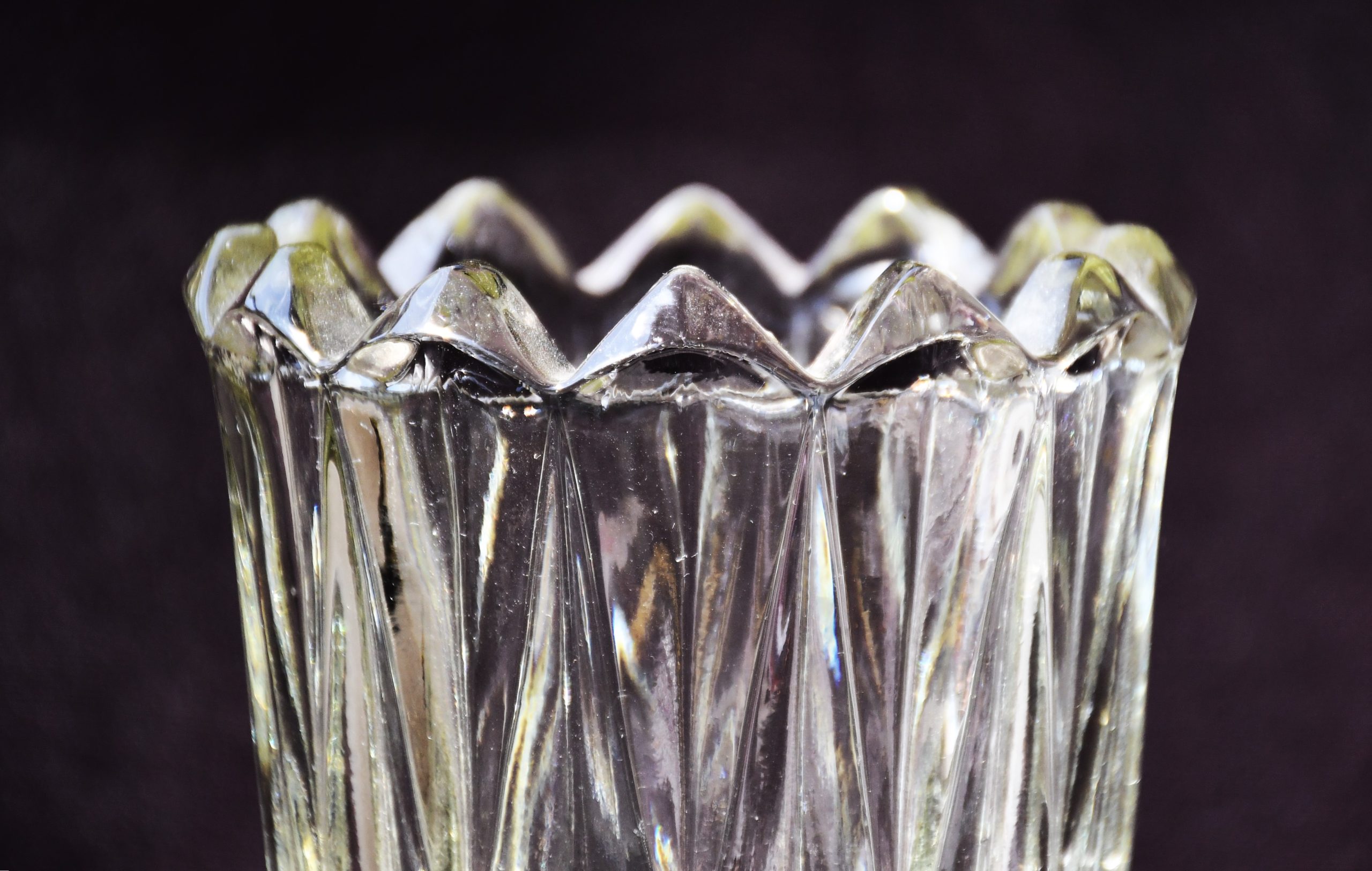 Форма, силно повлияна от традициите на Арт Деко, но с предчувствие на новото време, което вече наричаме Mid-century modern. С дебели и масивни стени, стабилен предмет. Пресовано стъкло с ръчно полирано дъно. Прозрачна, с лек цитринов нюанс. Великолепно дъпълнение и към модерен, и към класически дом.