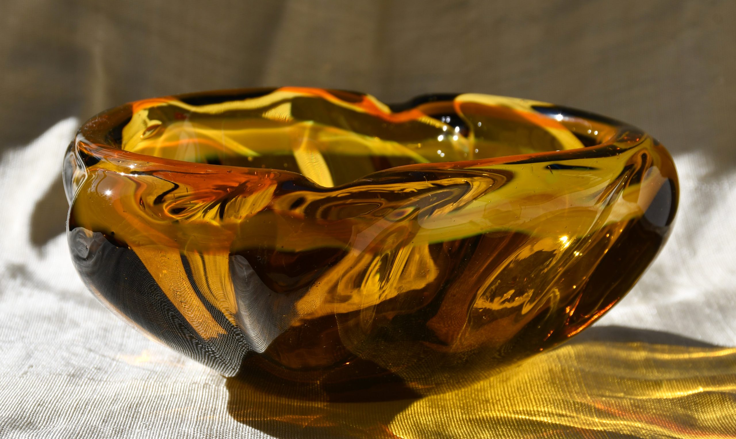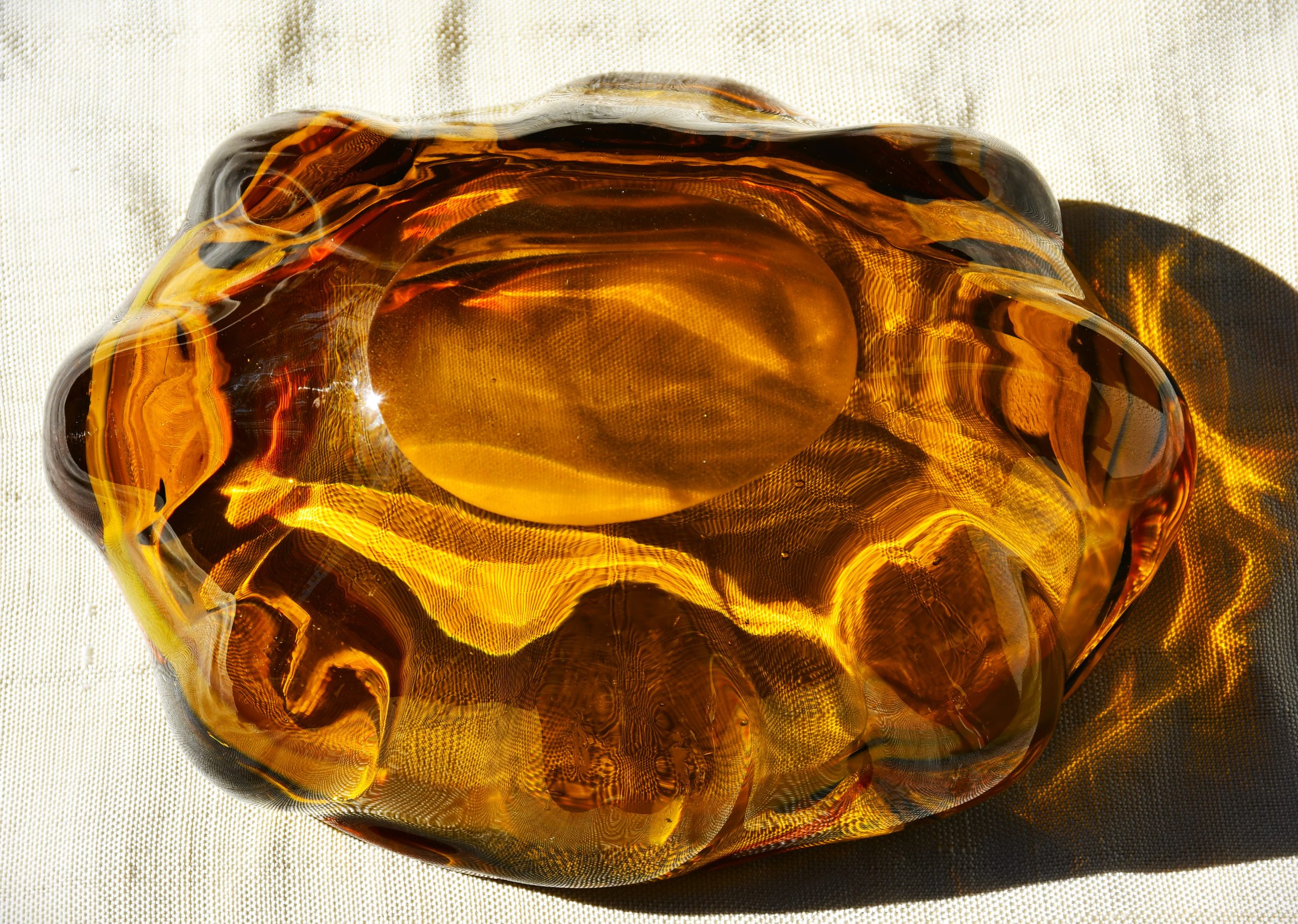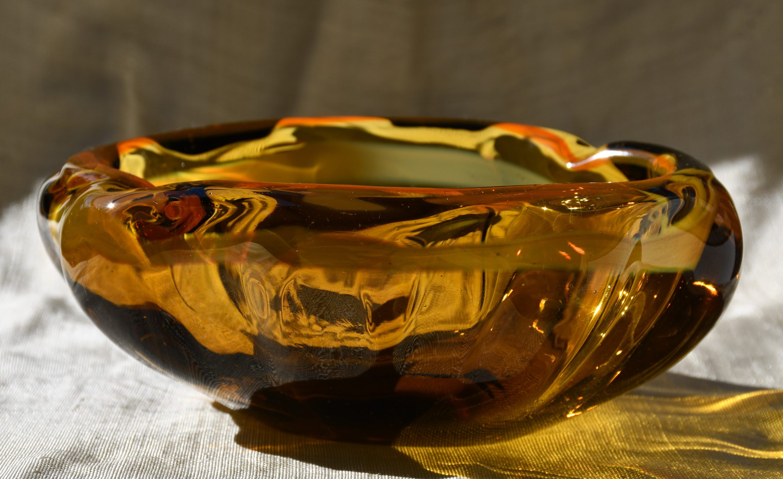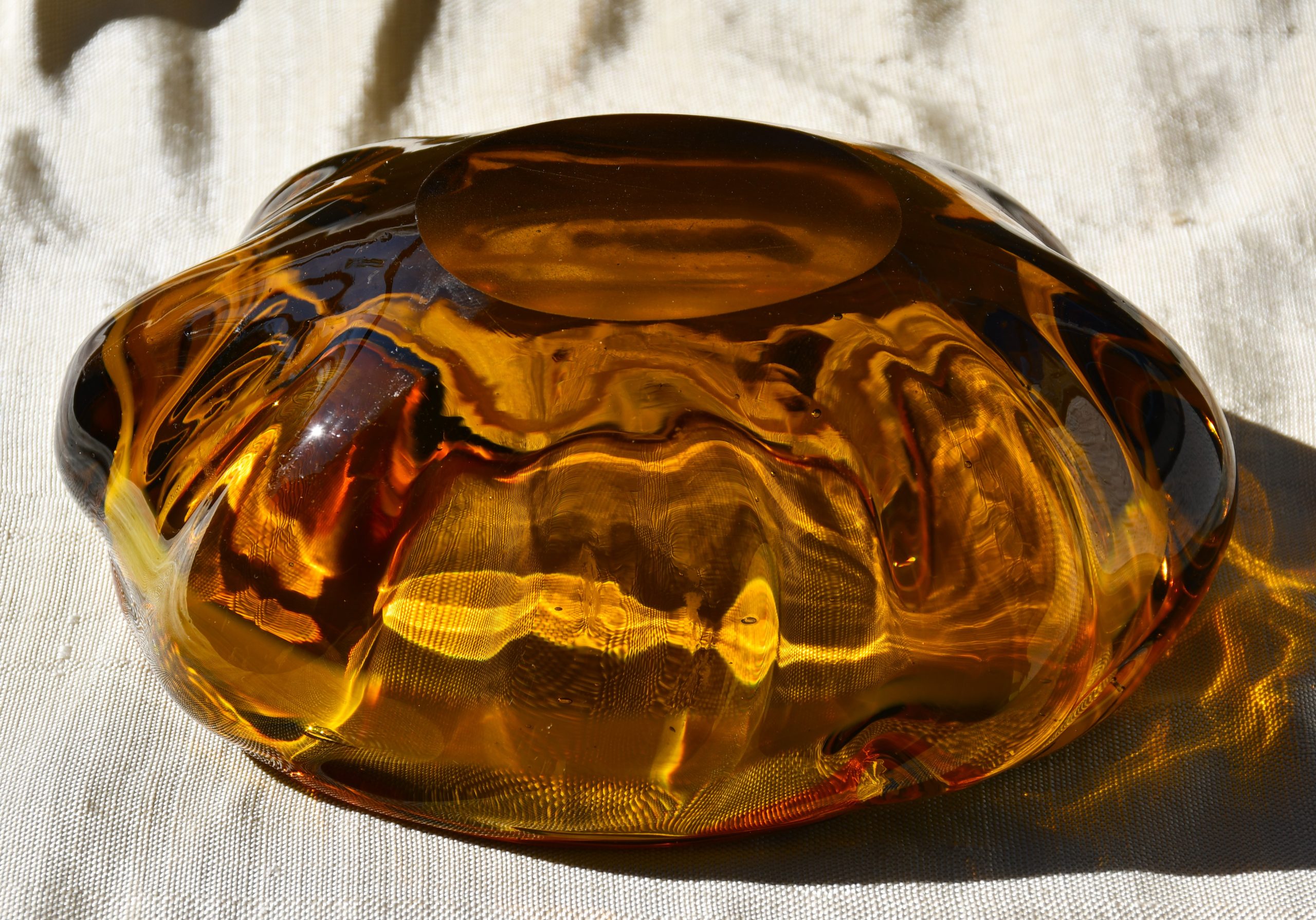 Много впечатляващ стъклен артефакт. Ръчно изработен от едноцветно стъкло с ръчно полирано дъно. Основният нюанс е тютюнев/кехлибарен. Двуцветен кордон от вътрешната страна на ръба.