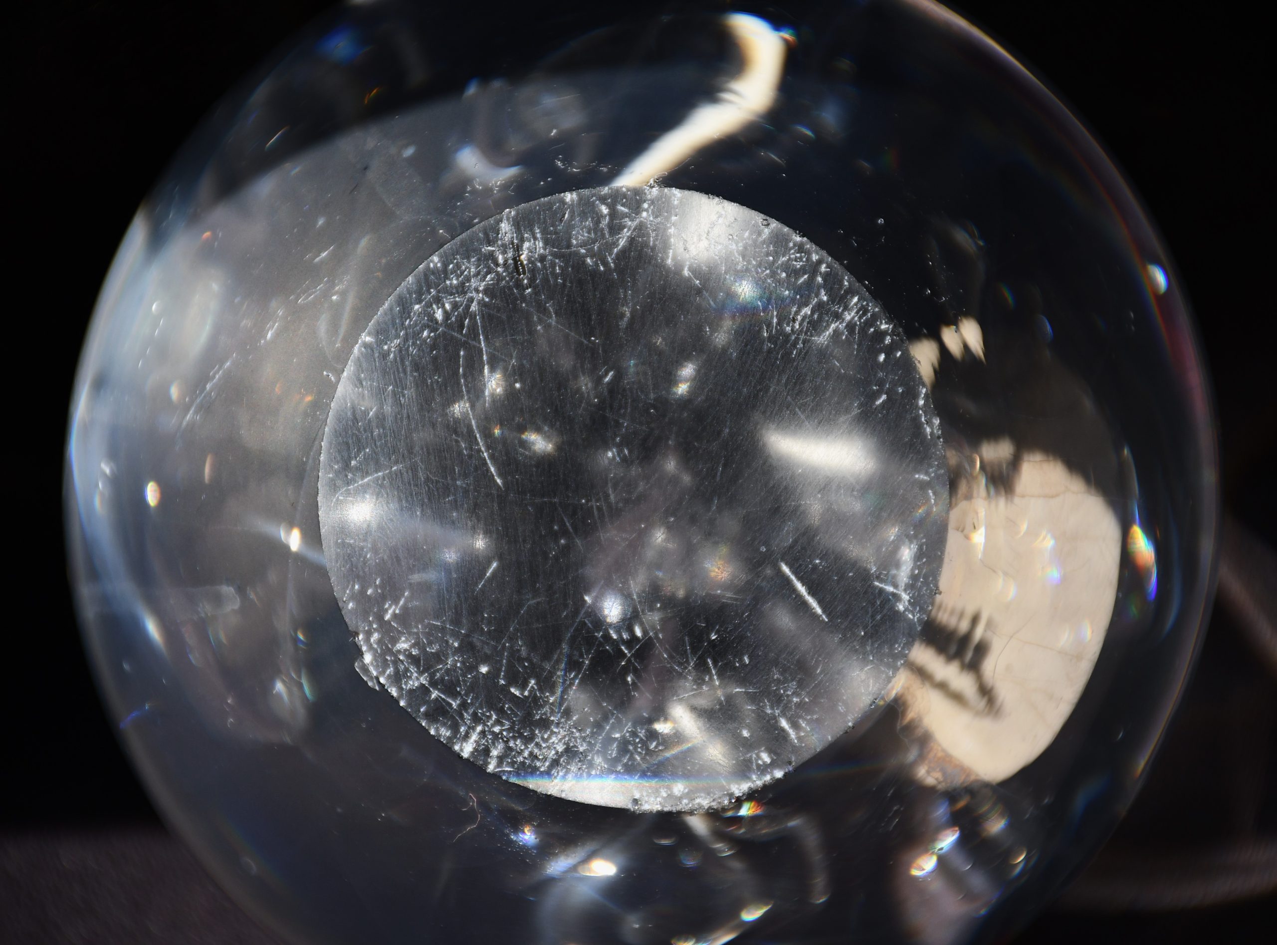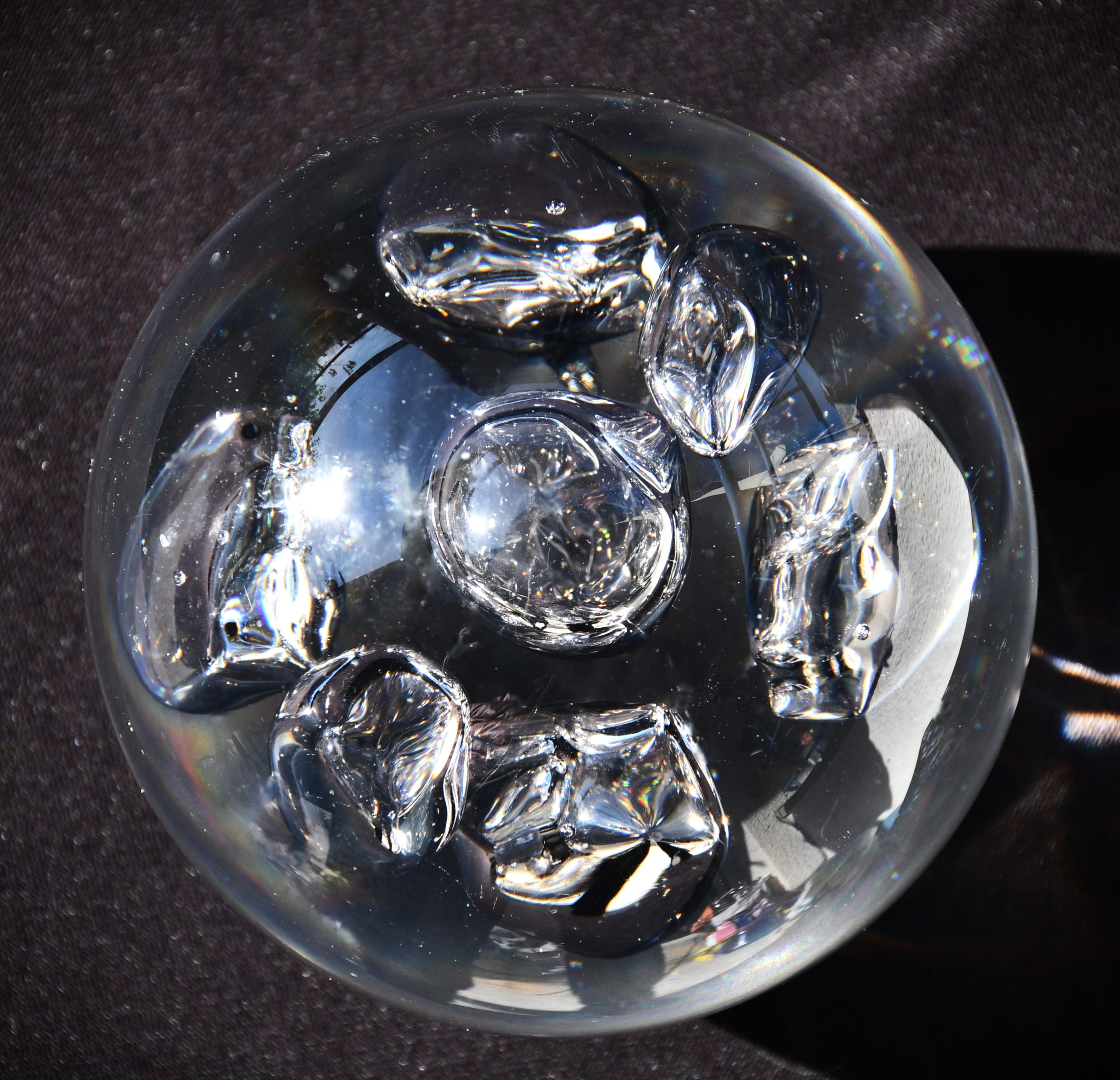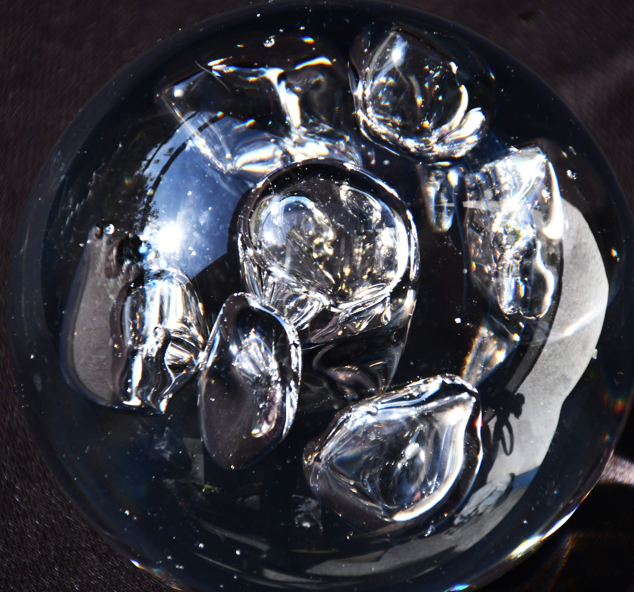 Много впечатляващ стъклен артефакт. Ръчно изработено едноцветно стъкло с ръчно полирано дъно. Включвания на големи въздушни обеми с неконтролирана форма. Много солидно и тежко. Безкрайни оптични ефекти при промяна на светлината и позицията.