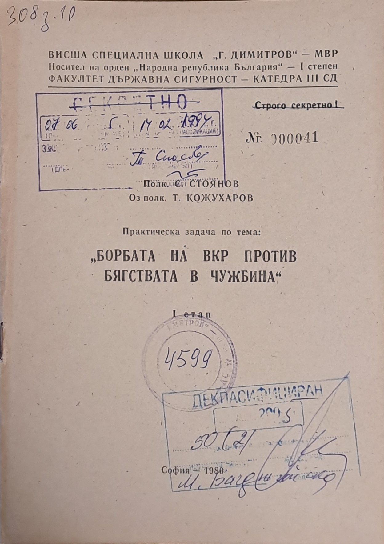ВСШ „Г. Димитров“-МВР. Задача по тема: „Борбата на ВКР против бягствата в чужбина“, І етап